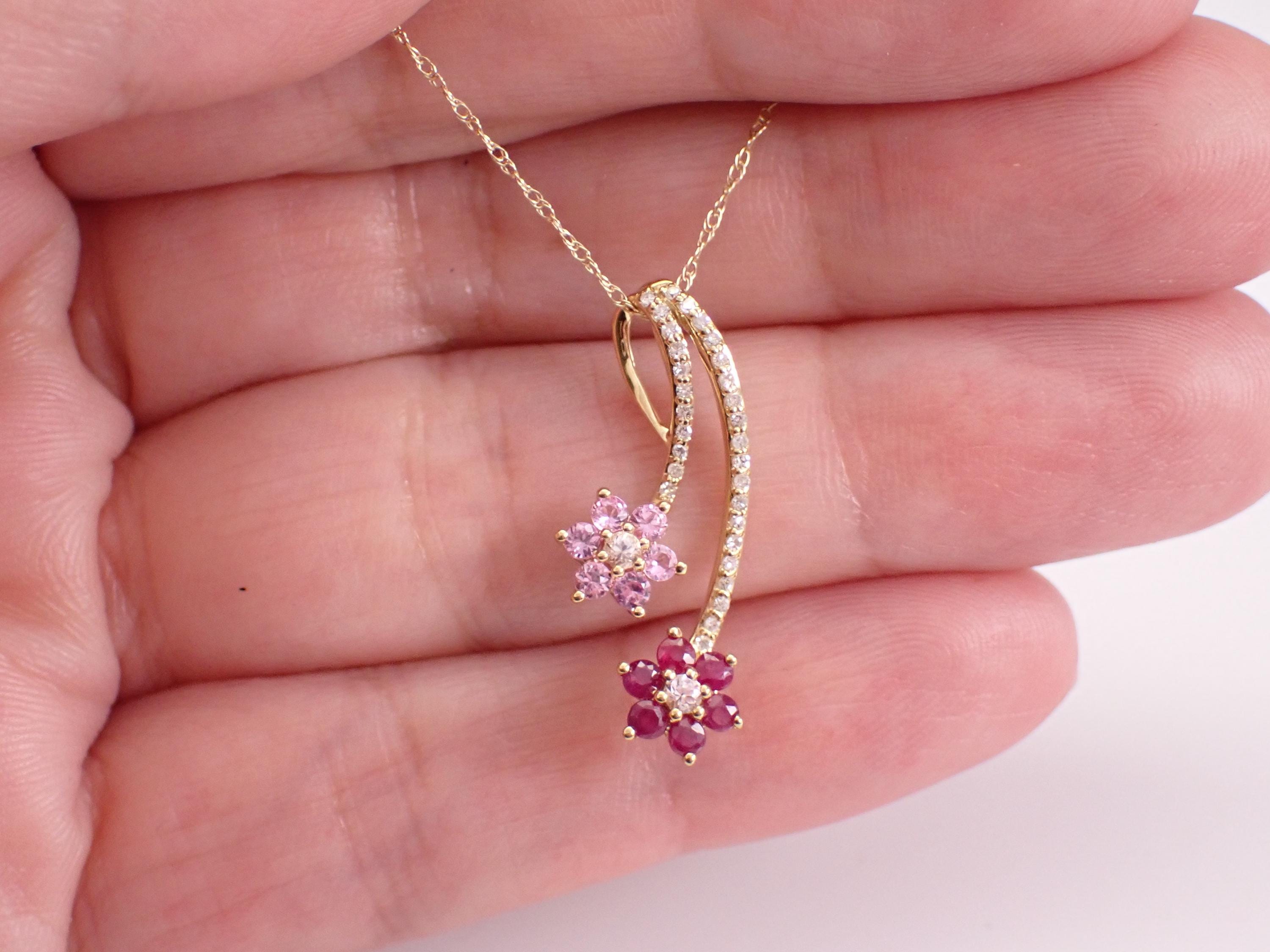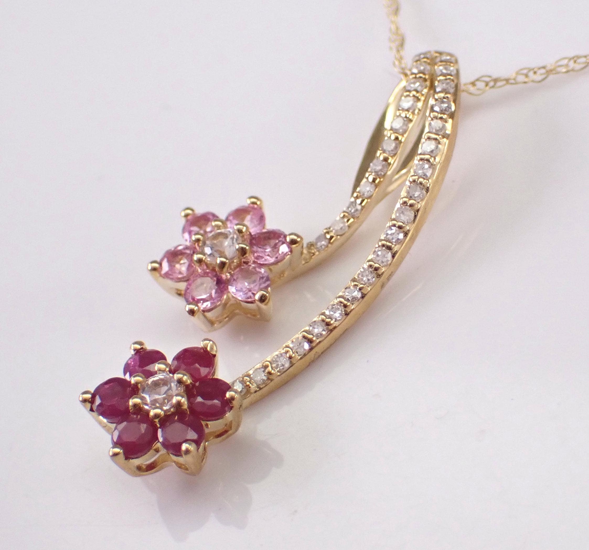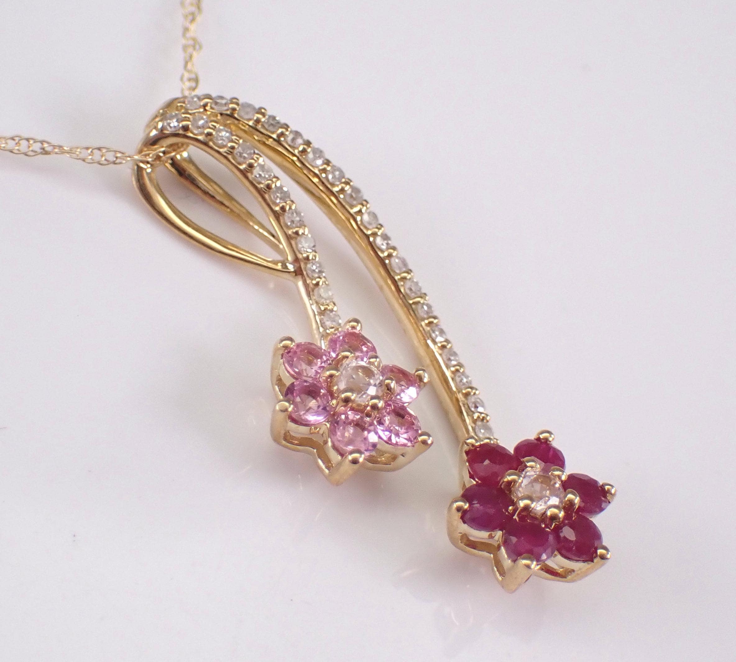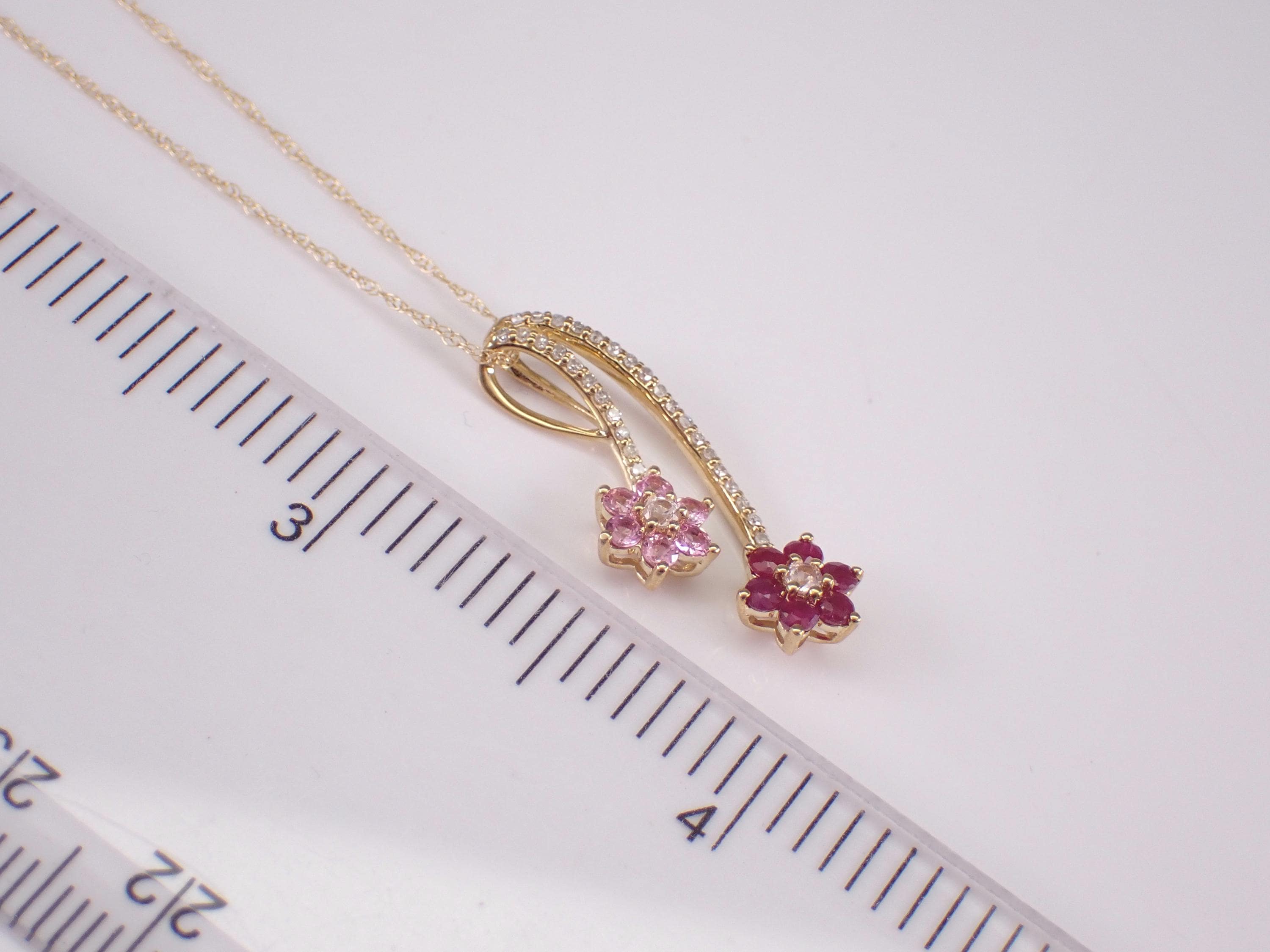 Yellow Gold Diamond, Ruby, Pink Sapphire and White Sapphire Flower Pendant with Chain. This pendant is set with six Round Rubies, six Round Pink Sapphires, two Round White Sapphires and thirty genuine Round Brilliant Diamonds. These diamonds are H color, SI clarity and weigh a total of .10 carat. The gemstones in this pendant amount to a total weight of .40 carat. This pendant is 10KT Yellow Gold and comes with an 18" 10KT Yellow Gold chain. This necklace weighs 1.6 grams and the pendant measures 25 X 10 mm. This necklace will be accompanied by an appraisal written by a GIA Certified Diamond Grader with the retail replacement value of $1,495.00. I will ship this necklace promptly in a beautiful gift box.
