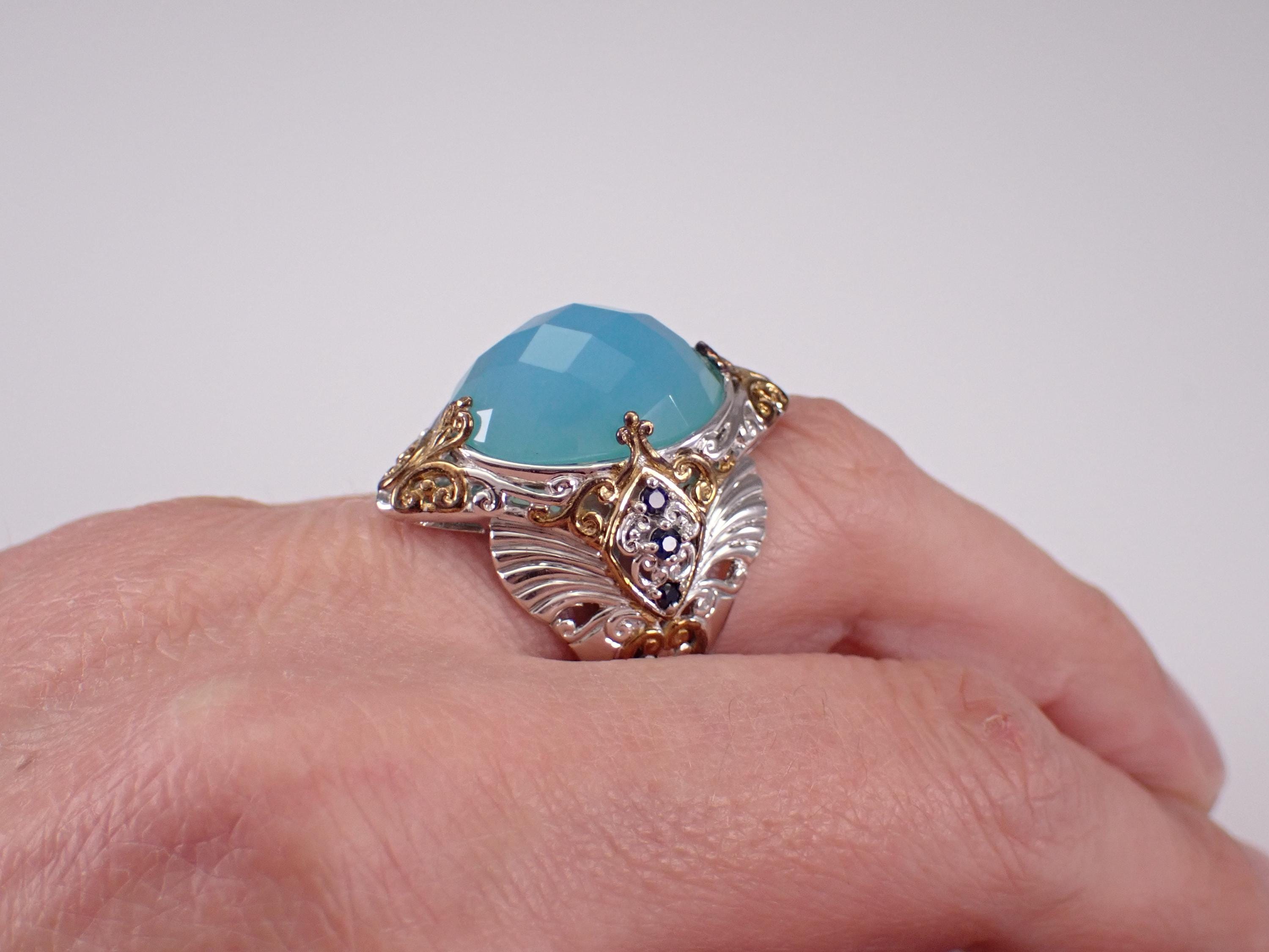 Vintage Sterling Silver Chalcedony and Sapphire ring. This ring is set with an Oval Cabochon Chalcedony Gemstone in the center and six genuine Round Sapphires. The center gem measures 18 X 13 mm. The sapphires weigh a total of .12 carat. This ring is sterling silver (925) with some gold toned accents. This ring is finger size 7 and weighs 10.9 grams. The top of this ring measures 30 mm along the finger. This ring will be shipped promptly in a gift pouch.