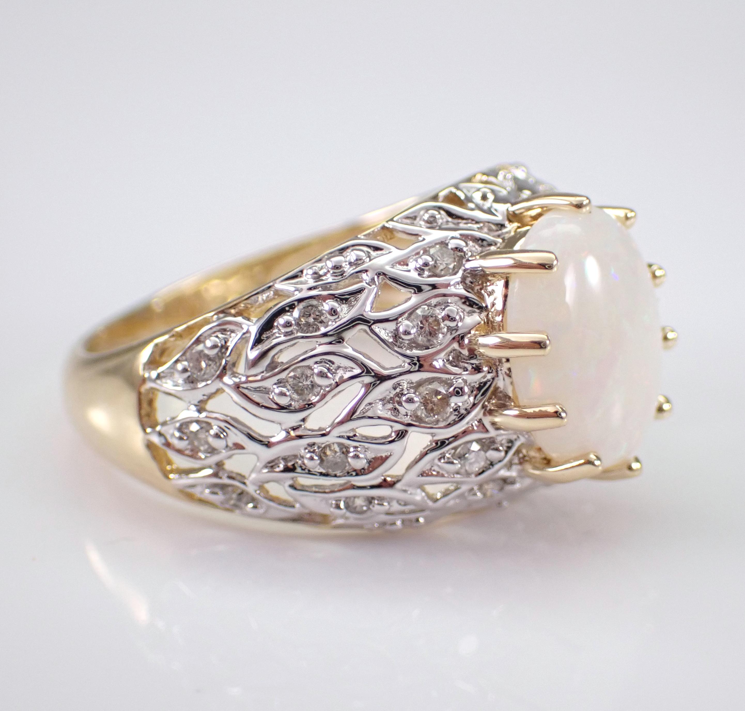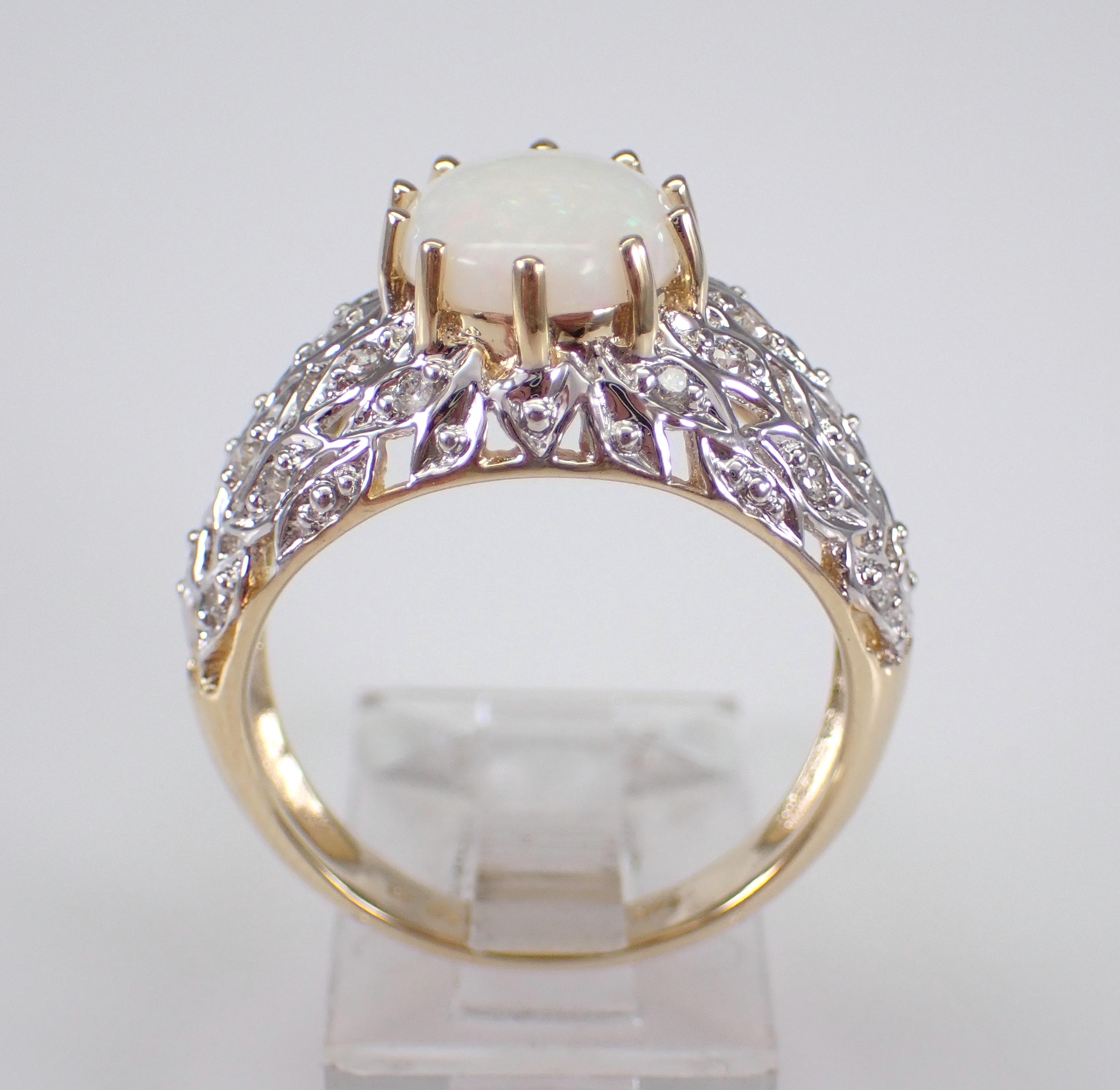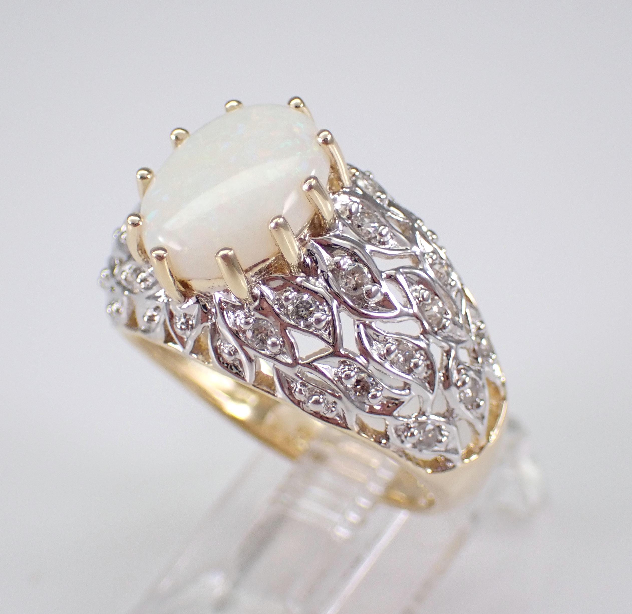 14K Yellow Gold Vintage Diamond and Opal Ring. There is one Oval Opal and twenty-four Round Diamonds set in this ring. This Opal measures 10 X 8 mm and weighs 1 1/2 carat. The diamond are H color, SI/I1 clarity and weigh a total of .30 carat. This ring is 14KT Yellow Gold, weighs 4.9 grams and is a finger size 7 1/4, which can be resized (please inquire about sizing with the finger size you need). This ring will be accompanied by an appraisal written by a GIA Certified Diamond Grader with the retail replacement value of $1,875.00. This ring dates back to Circa 1980's and will be shipped promptly in a gift box.