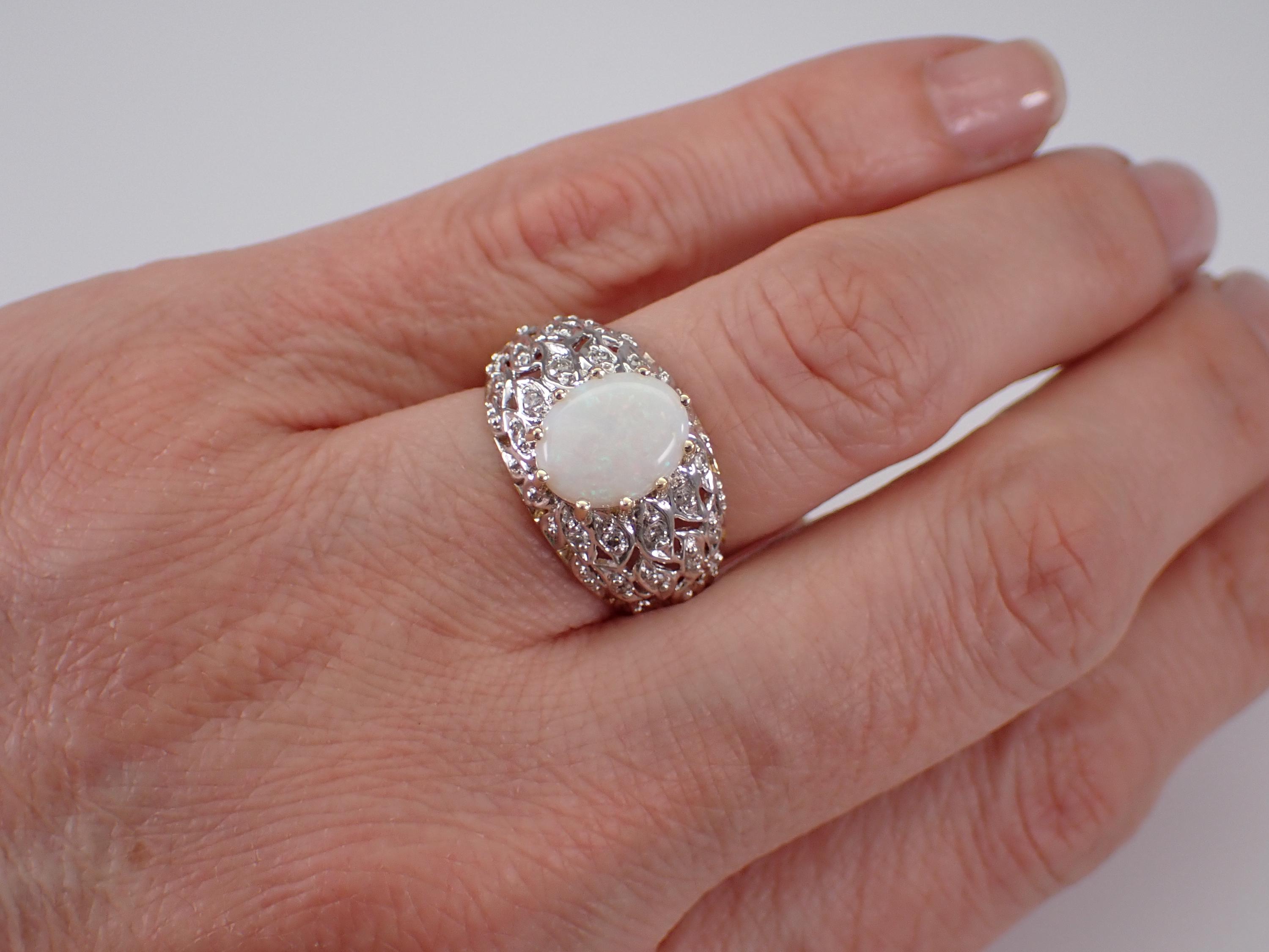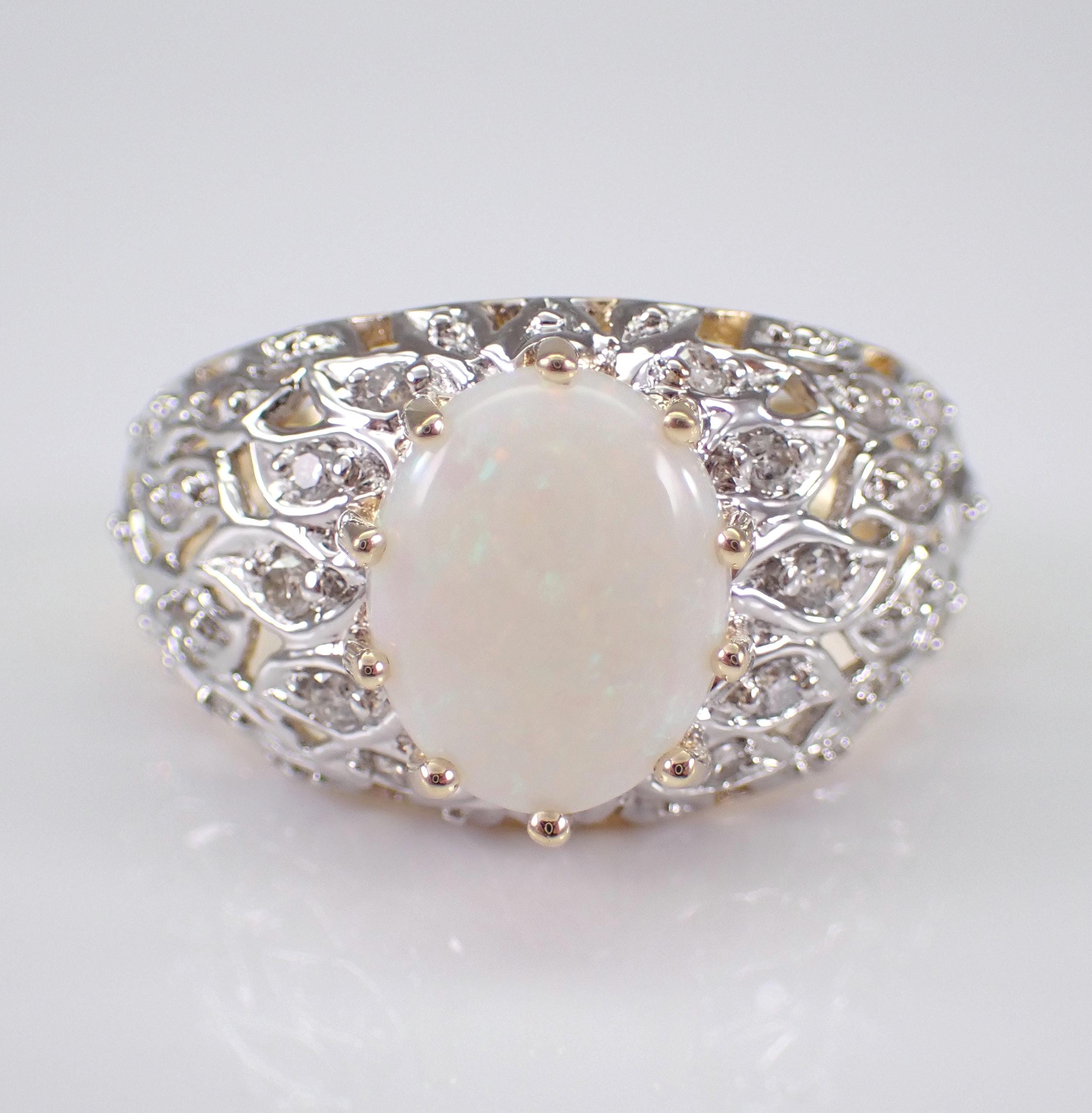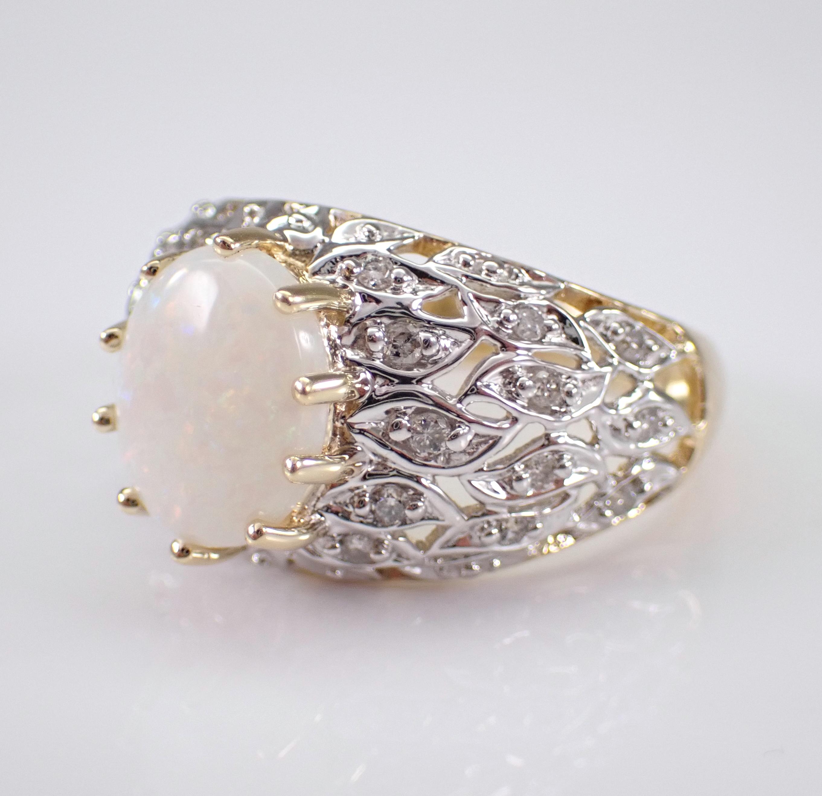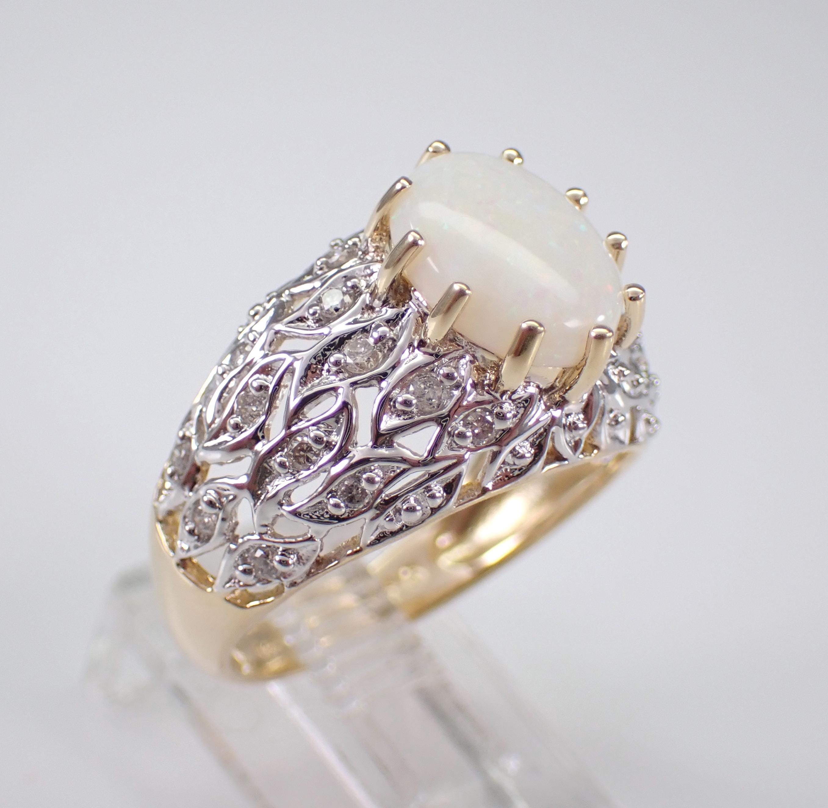 14K Yellow Gold Vintage Diamond and Opal Ring. There is one Oval Opal and twenty-four Round Diamonds set in this ring. This Opal measures 10 X 8 mm and weighs 1 1/2 carat. The diamond are H color, SI/I1 clarity and weigh a total of .30 carat. This ring is 14KT Yellow Gold, weighs 4.9 grams and is a finger size 7 1/4, which can be resized (please inquire about sizing with the finger size you need). This ring will be accompanied by an appraisal written by a GIA Certified Diamond Grader with the retail replacement value of $1,875.00. This ring dates back to Circa 1980's and will be shipped promptly in a gift box.