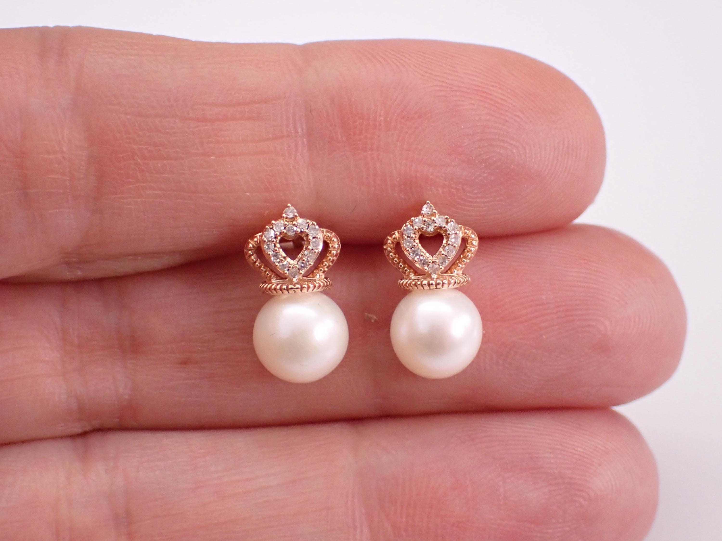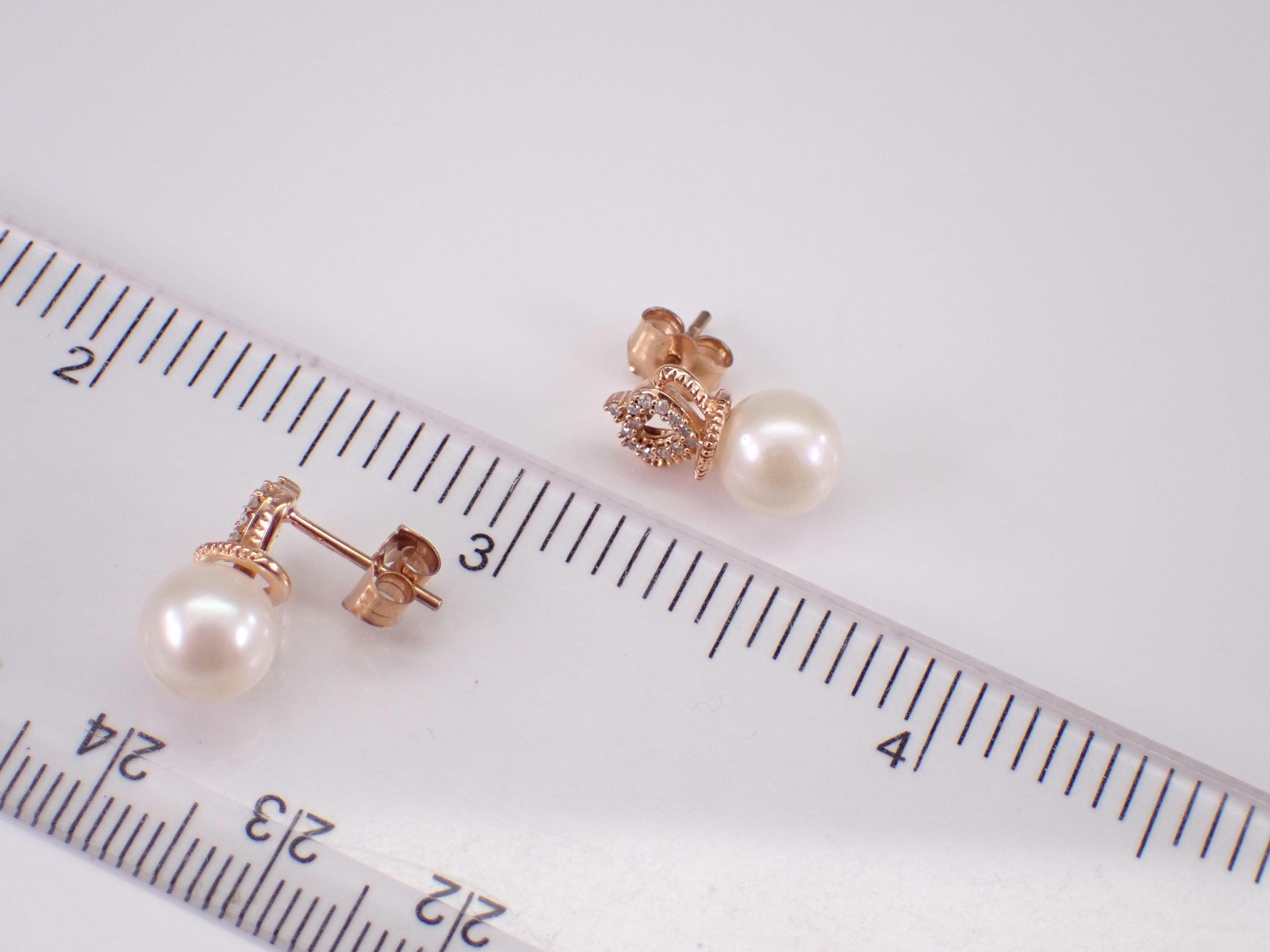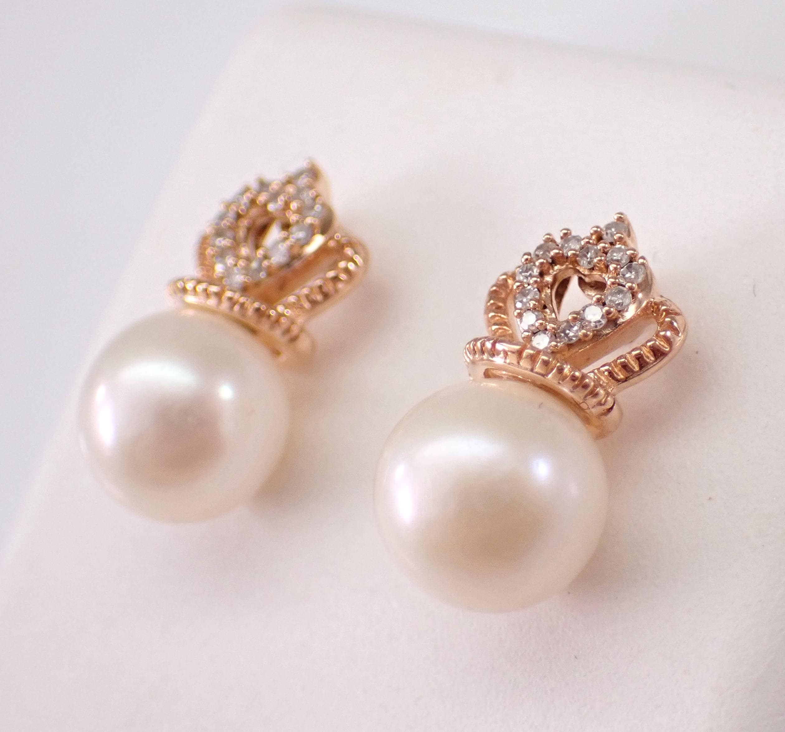 Rose Gold Pearl and Diamond Stud Earrings. There is one Pearl set in each earring. These Pearls measure 7 mm in diameter each. There are thirteen genuine Round Brilliant Diamonds set in EACH earring. These diamonds are H color, SI/I clarity and weigh a total of .08 carat. These earrings are 10KT Rose Gold and weigh a total of 2.2 grams. These earrings are for pierced ears, measure 13.5 X 7 mm and the earrings have friction post backs for pierced ears. These earrings will be accompanied by an appraisal written by a GIA Certified Diamond Grader with the retail replacement value of $1,095.00. I will ship these earrings promptly in a gift box.