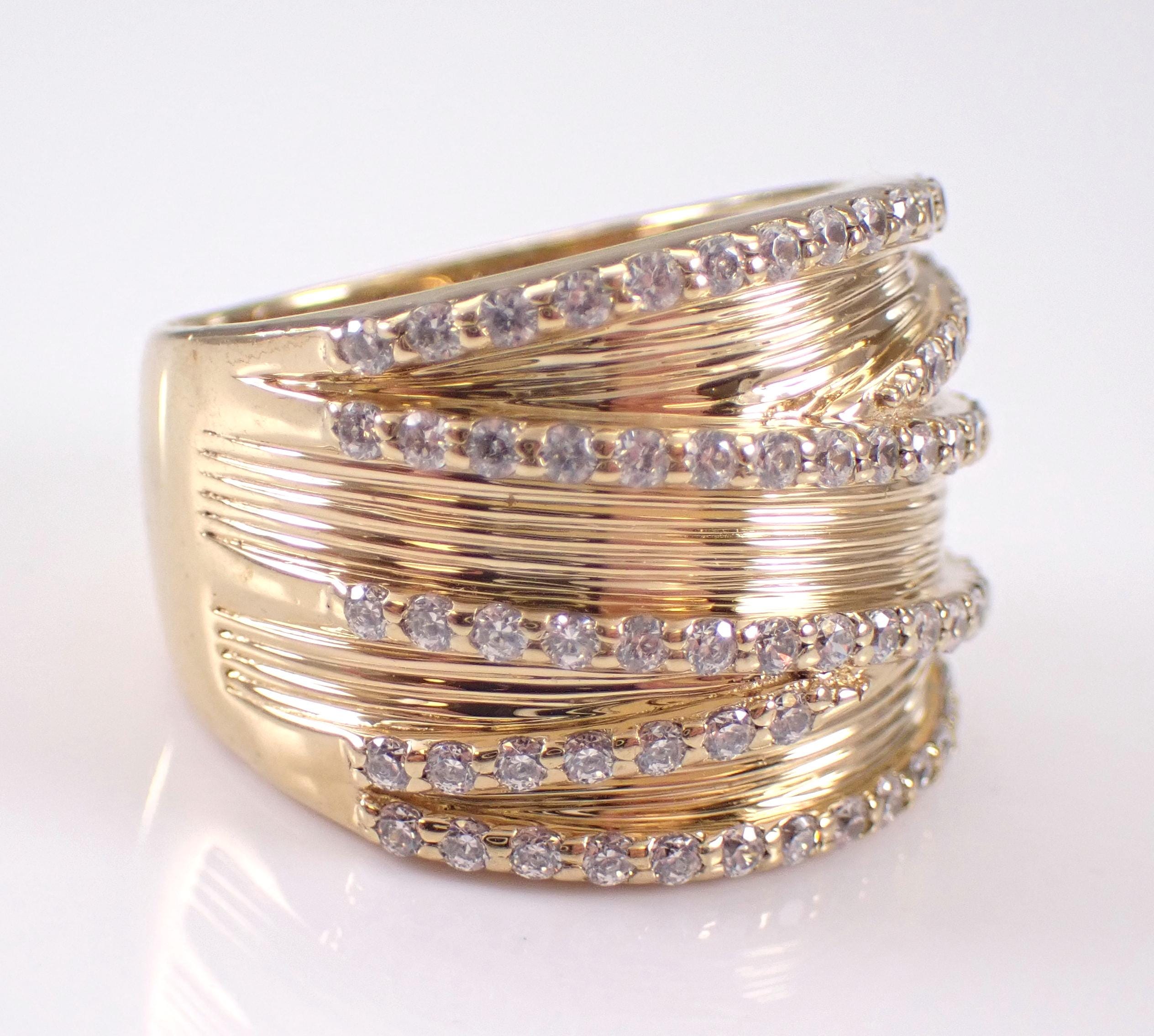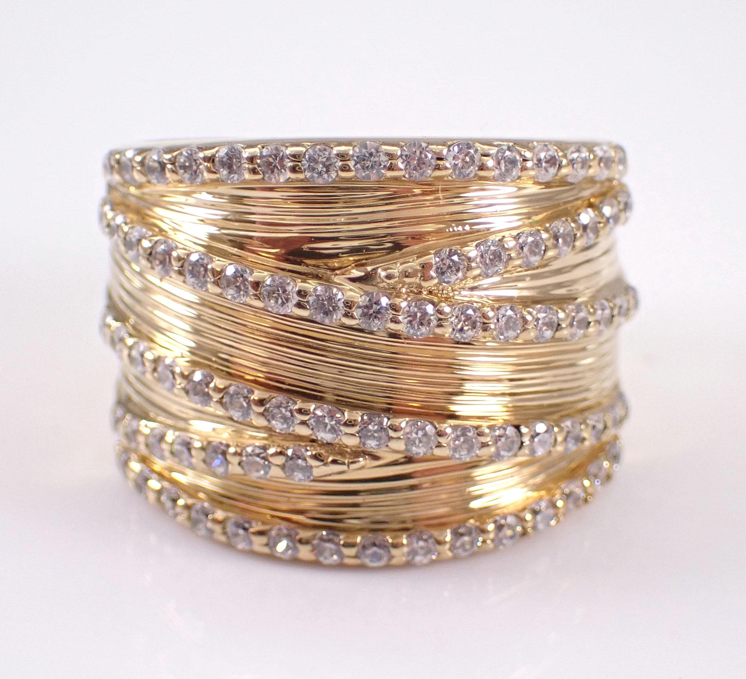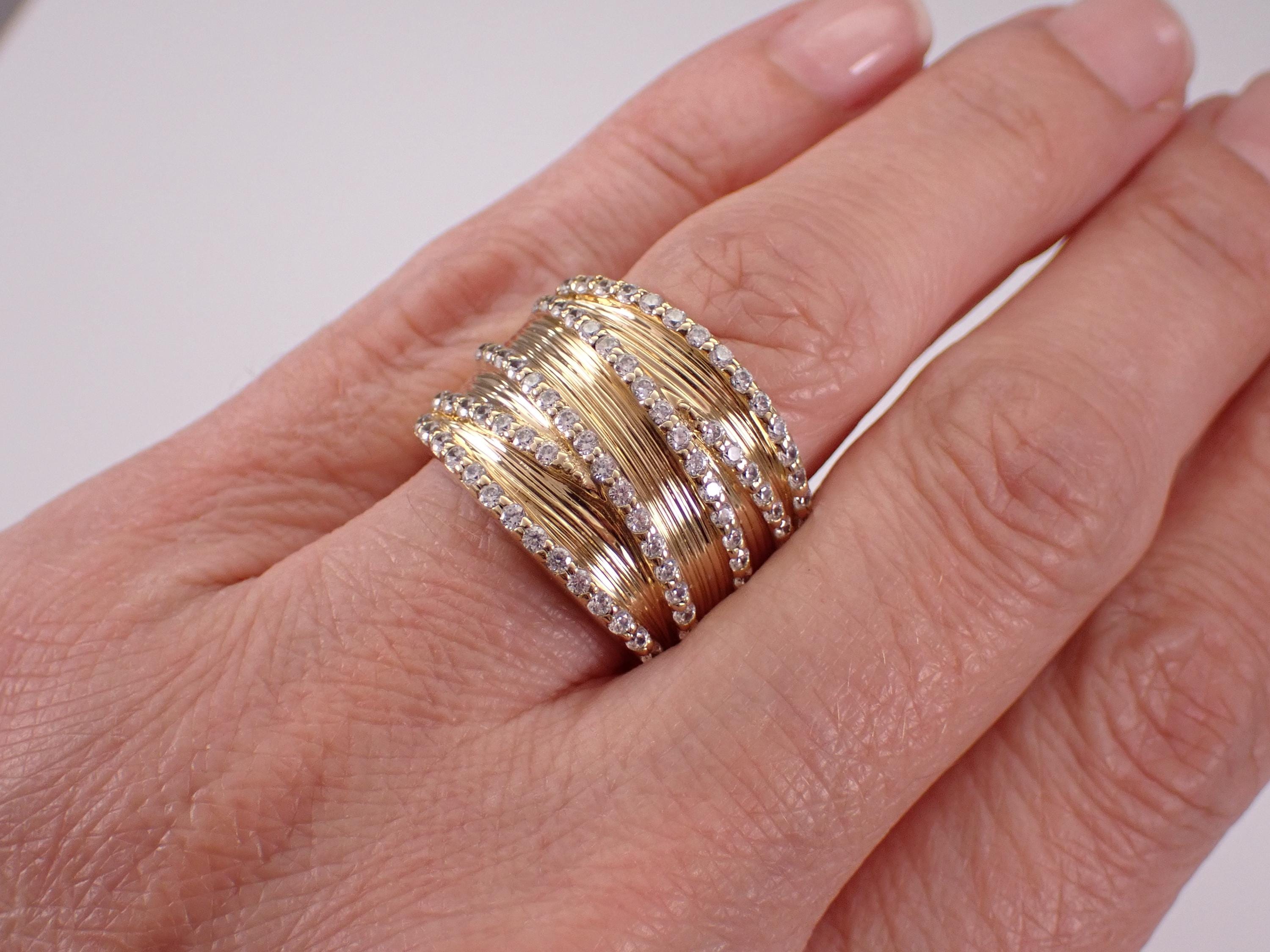 Vintage Sterling Silver (Gold Plated/Vermeil) Cubic Zirconia ring by Sonia B. This ring is set with 78 Round Cubic Zirconia. This ring is made of Sterling Silver and marked 925. This ring is in very good, excellent condition, is finger size 8, weighs 12.1 grams and measures 17.5 mm along the finger. This ring will be shipped promptly in a gift pouch, not the original Sonia B pouch.