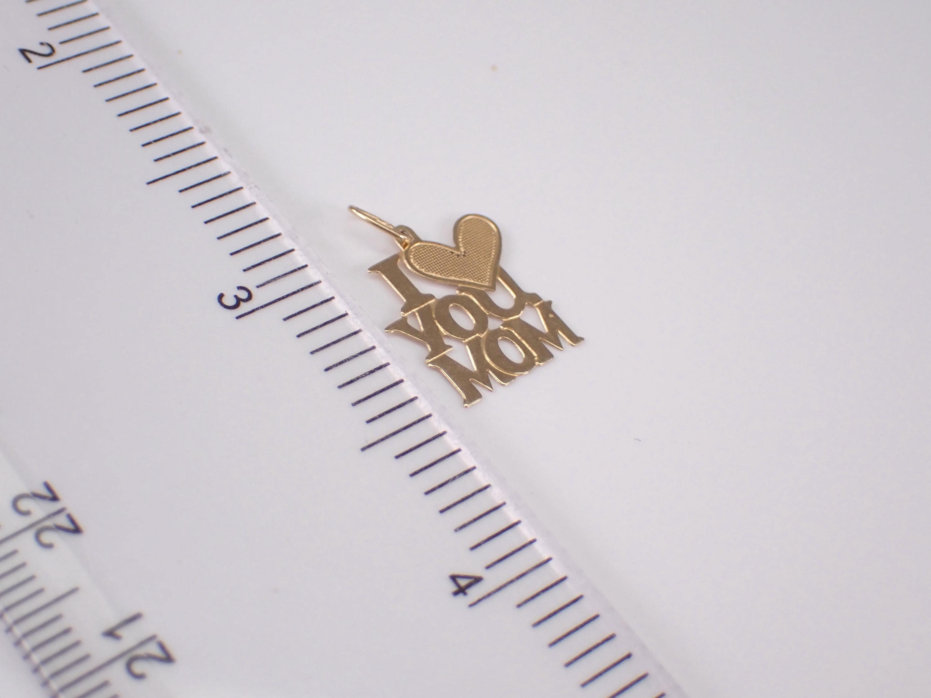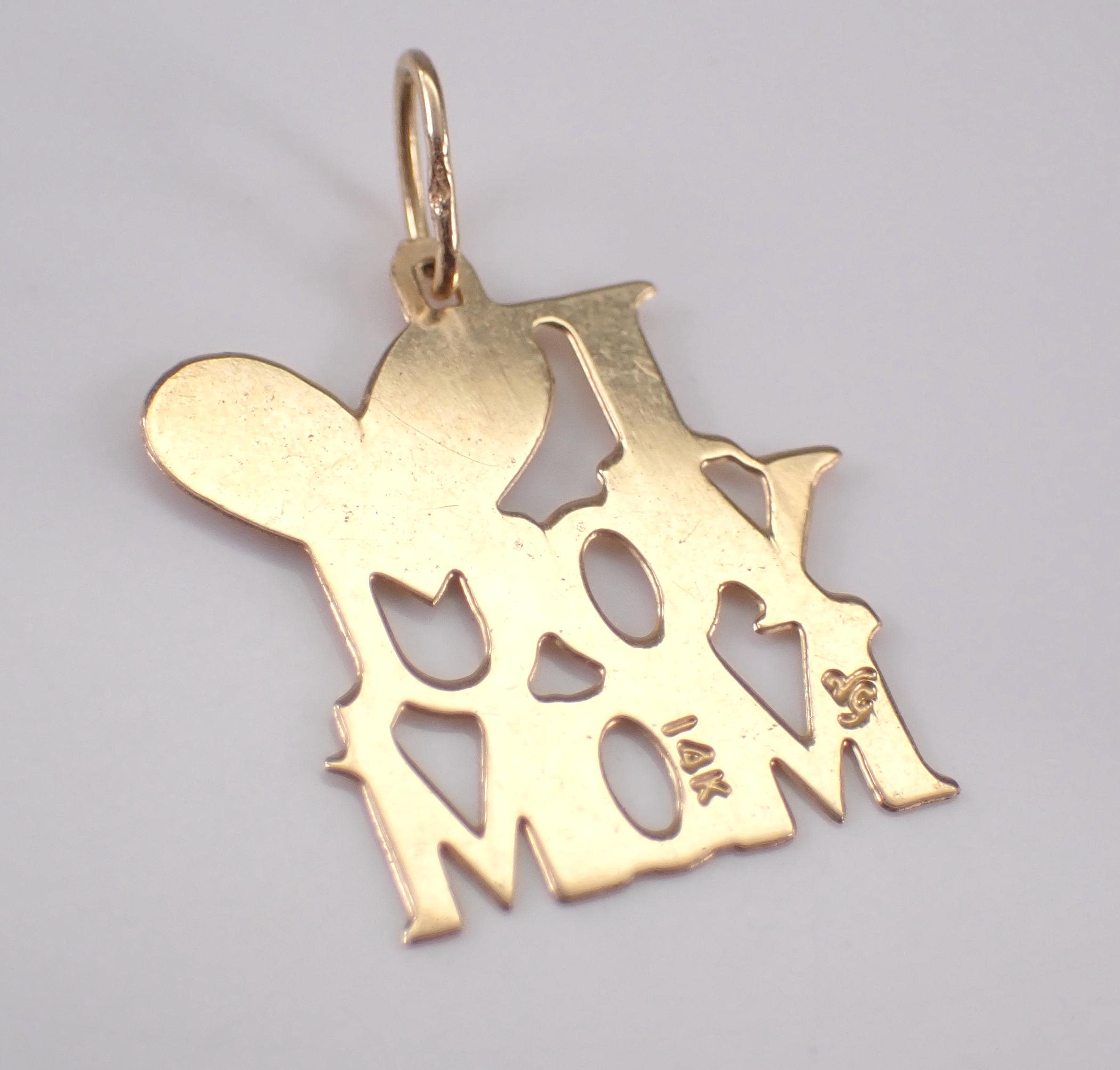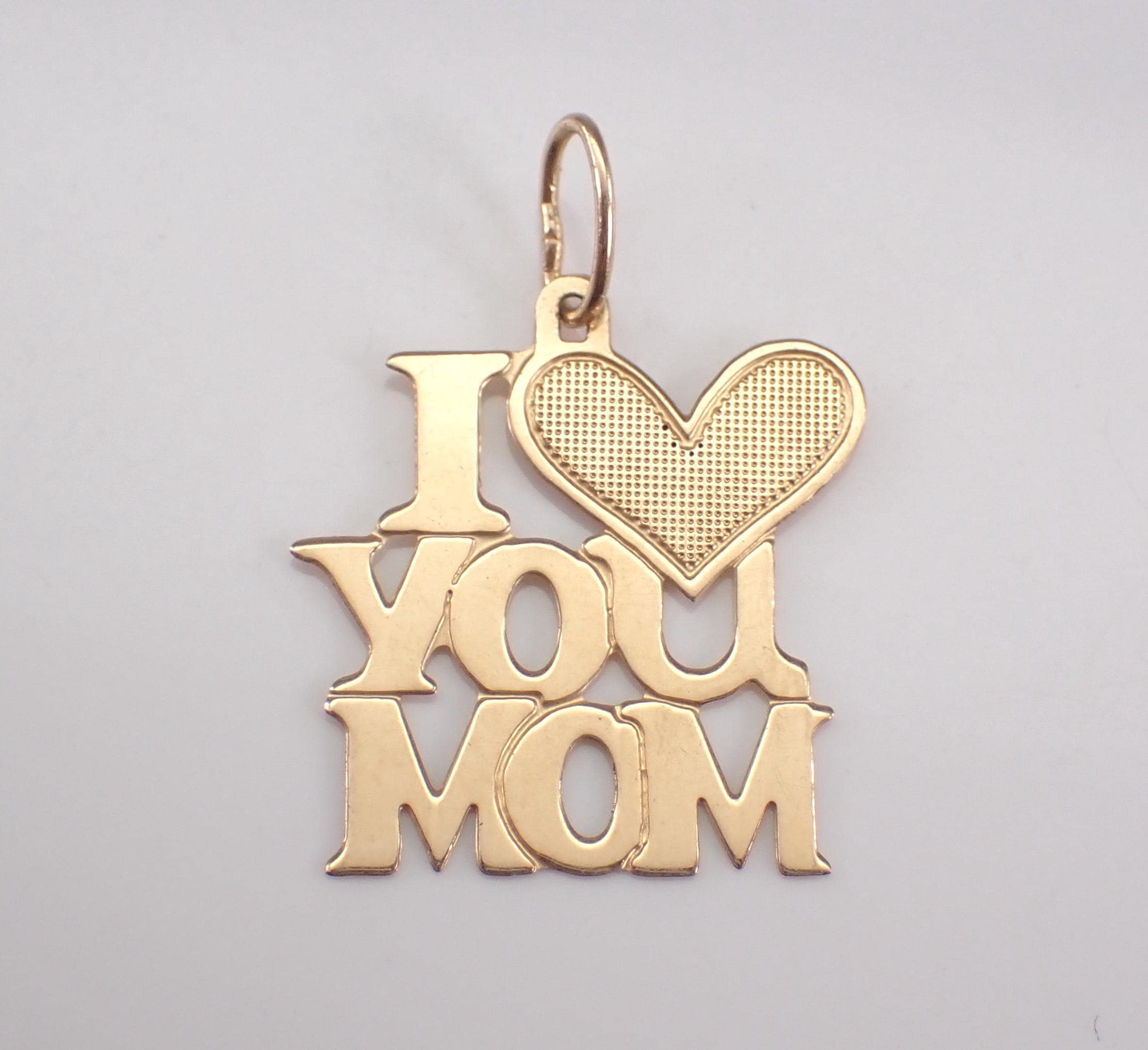 Vintage 14K Yellow Gold I :OVE MOM Charm Pendant. This charm is 14K Yellow gold and weighs .4 grams. This charm measures 12.5 X 13.5 mm without the bail. I will ship this pendant promptly in a gift pouch.