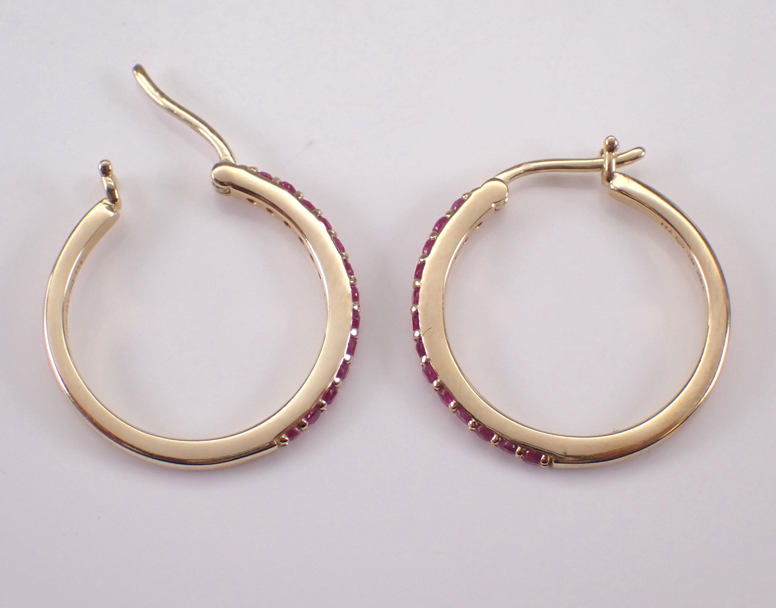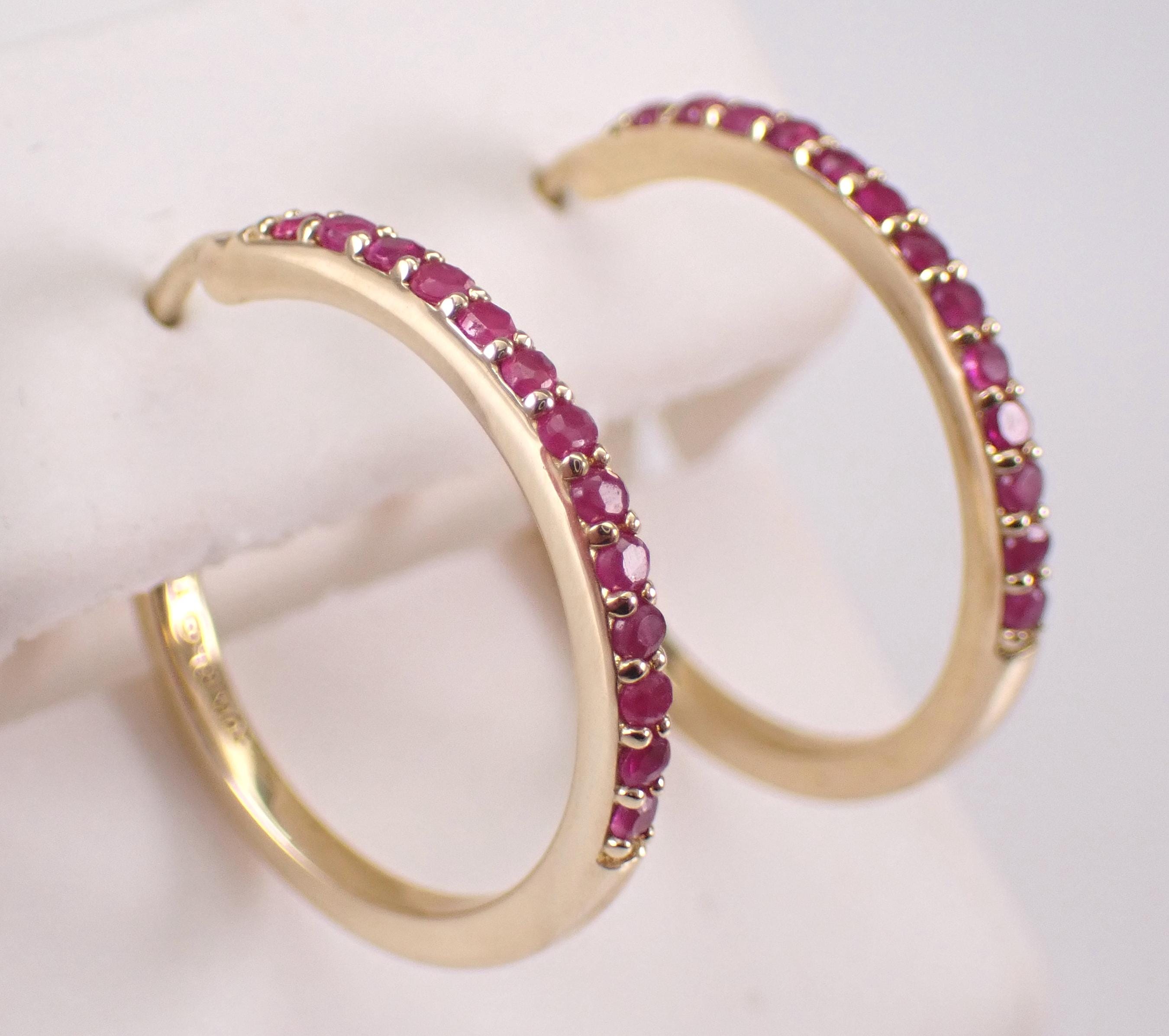 Yellow Gold Ruby Huggie Hoop Earrings. These earrings are set with thirteen genuine Round Rubies in EACH earring. These Rubies are are a medium red color and weigh a total of 1/3 carat. These earrings are 10K Yellow Gold and weigh a total of 3.4 grams. These earrings are for pierced ears and measure 20 mm in diameter. These earrings will be accompanied by an appraisal written by a GIA Certified Diamond Grader with the retail replacement value of $1,285.00. I will ship these earrings promptly in a gift box.