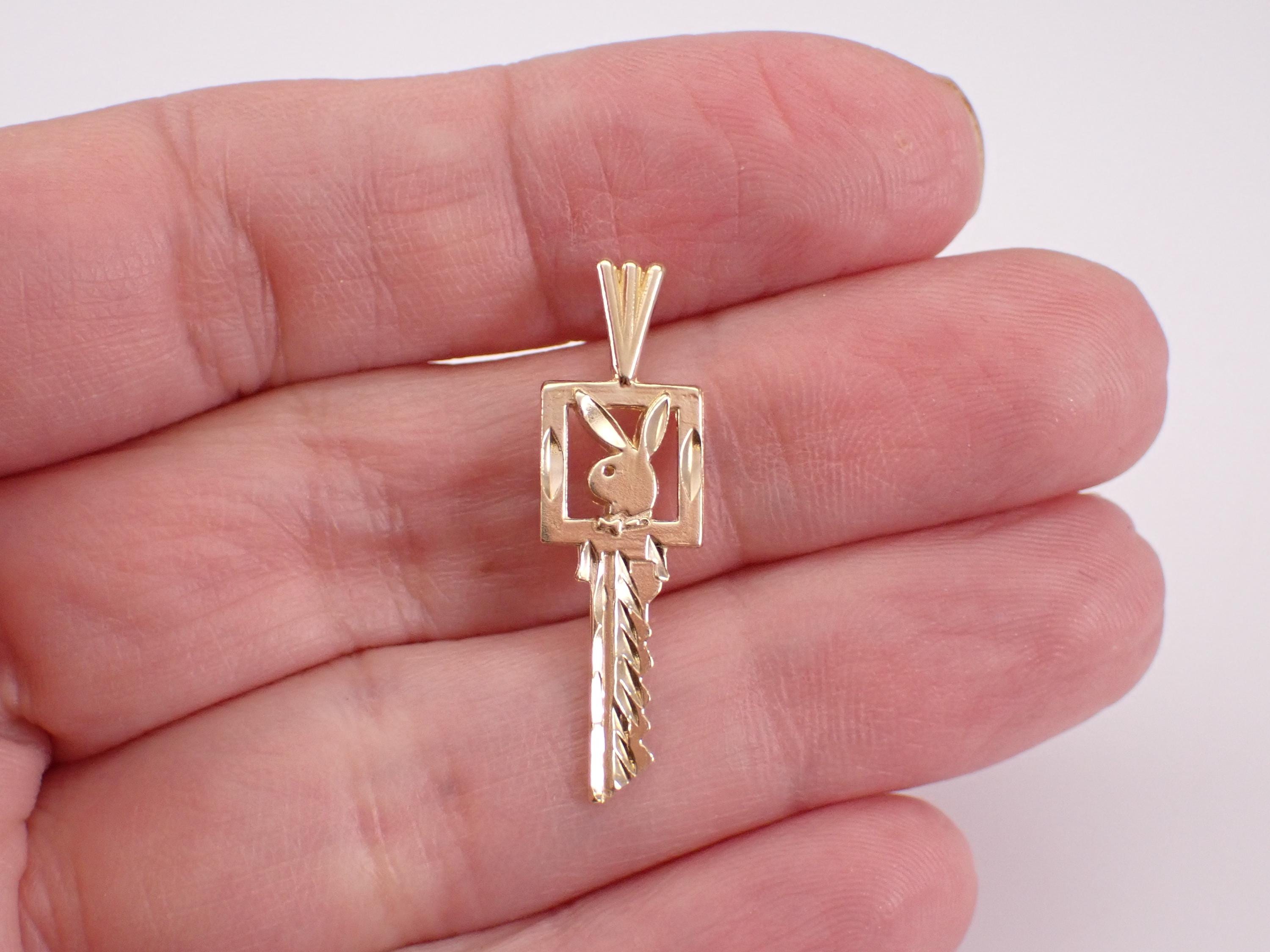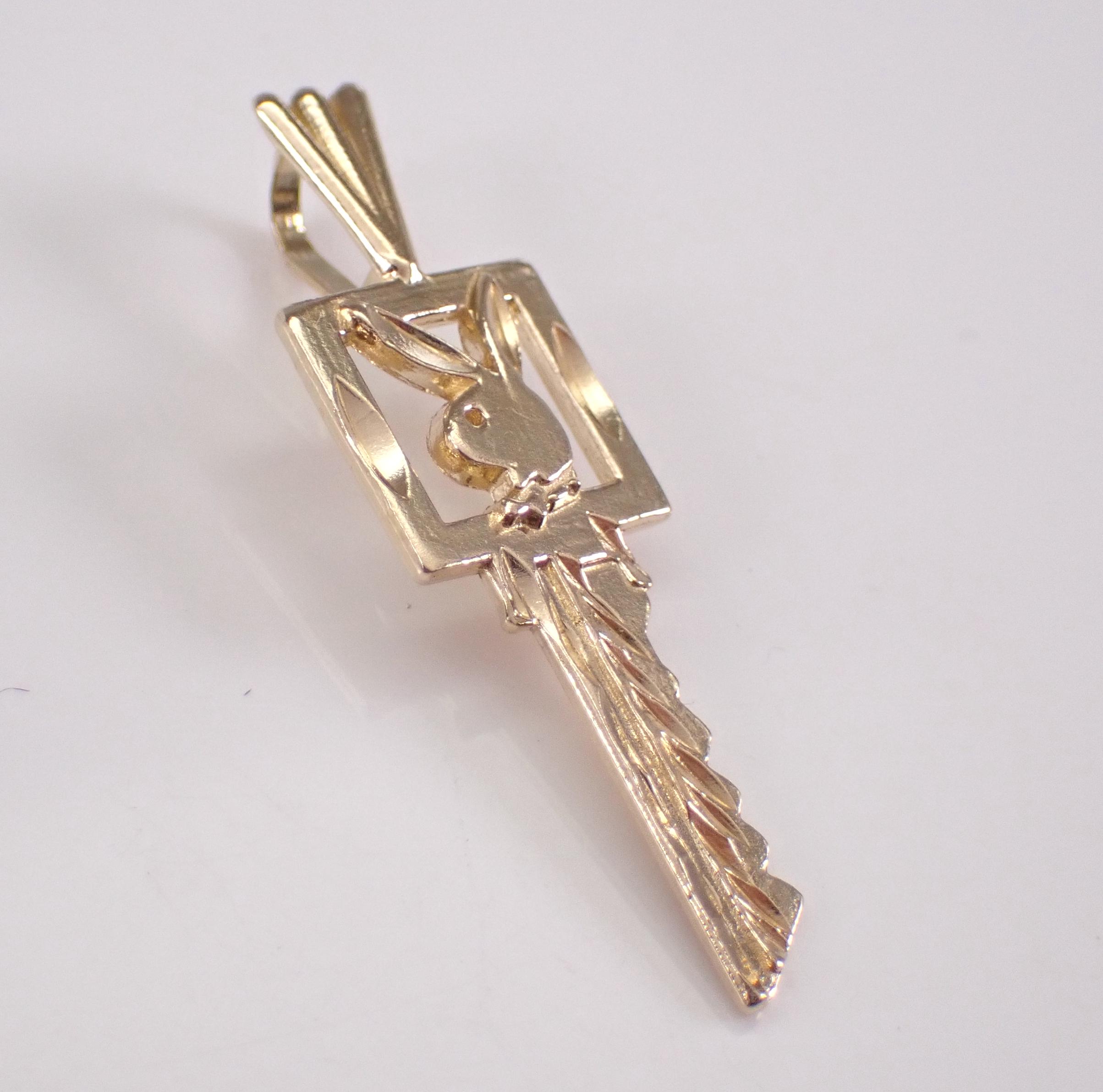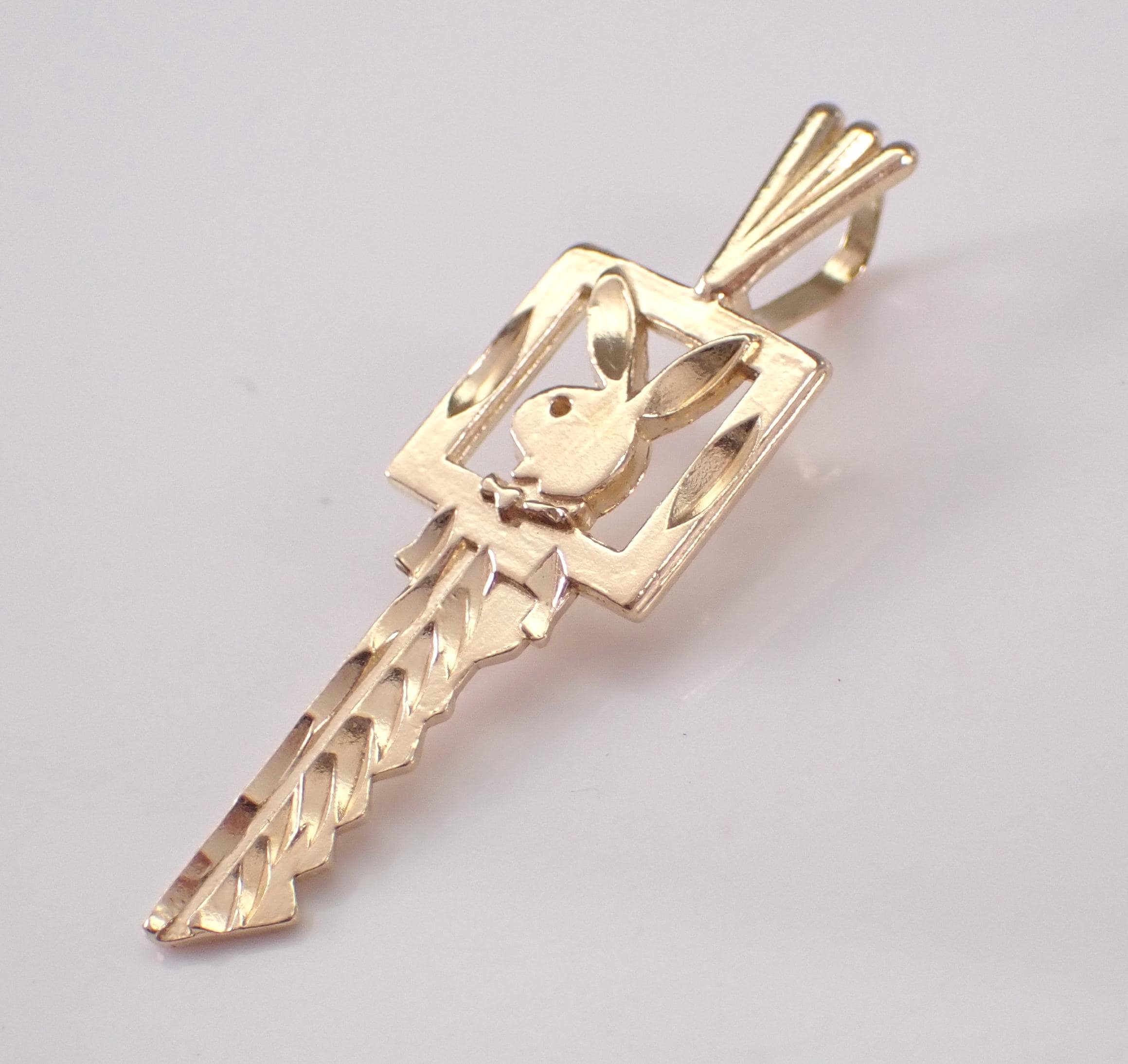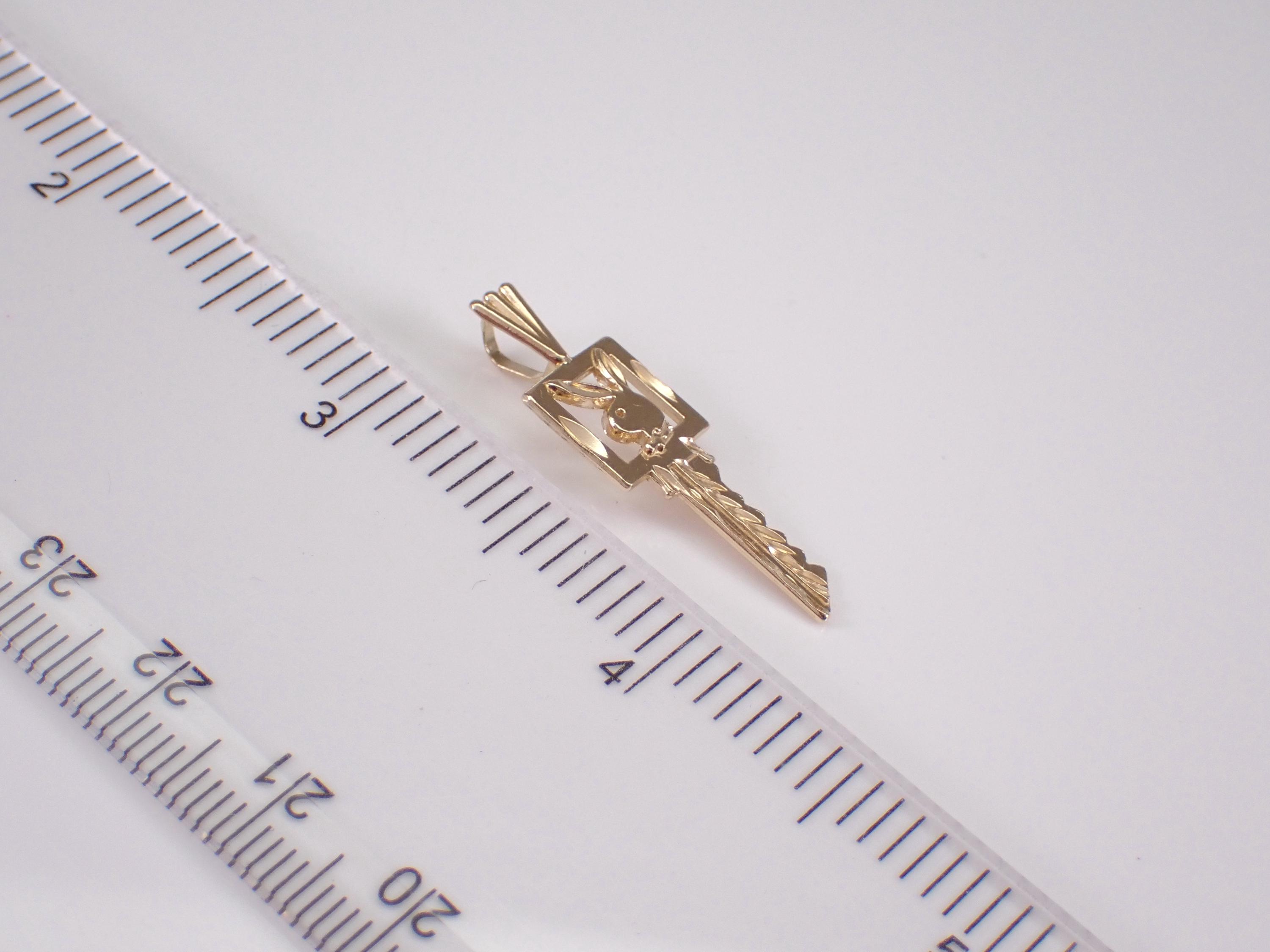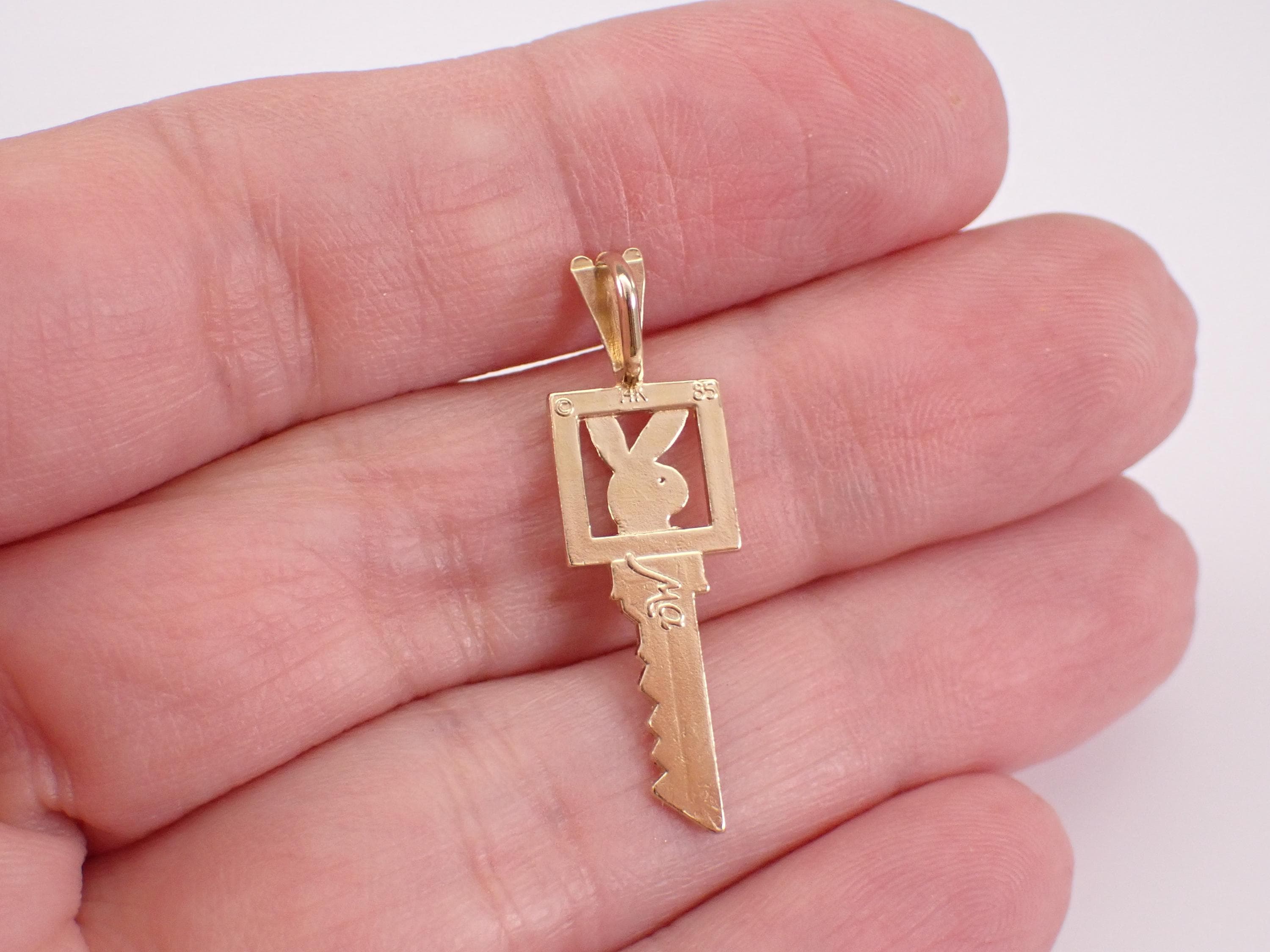 Vintage 14K Yellow Gold Playboy Bunny Key Lock Charm Pendant. This charm is 14K Yellow gold and weighs 1.4 grams. This Key measures 30 X 9 mm. I will ship this pendant promptly in a gift pouch.