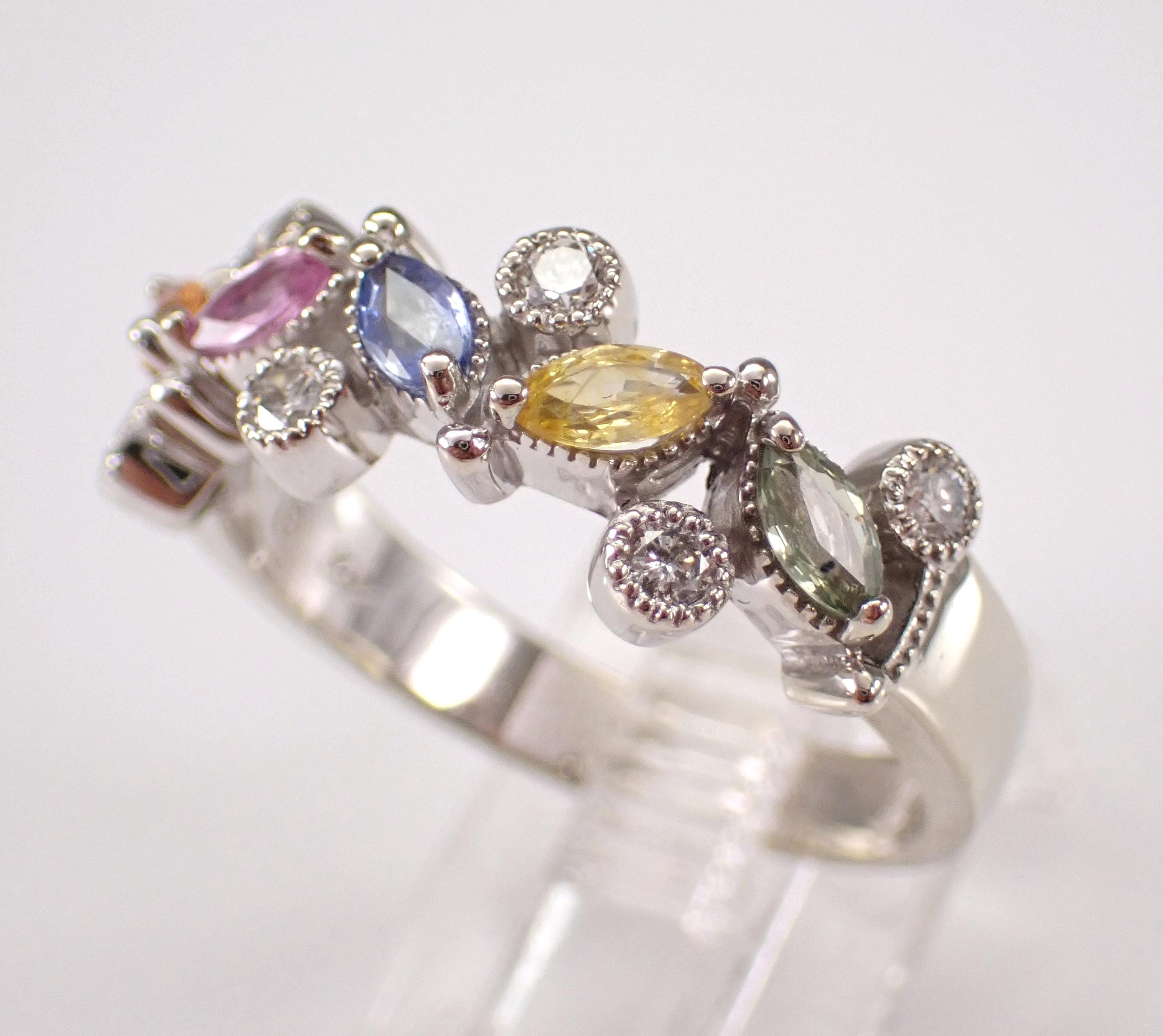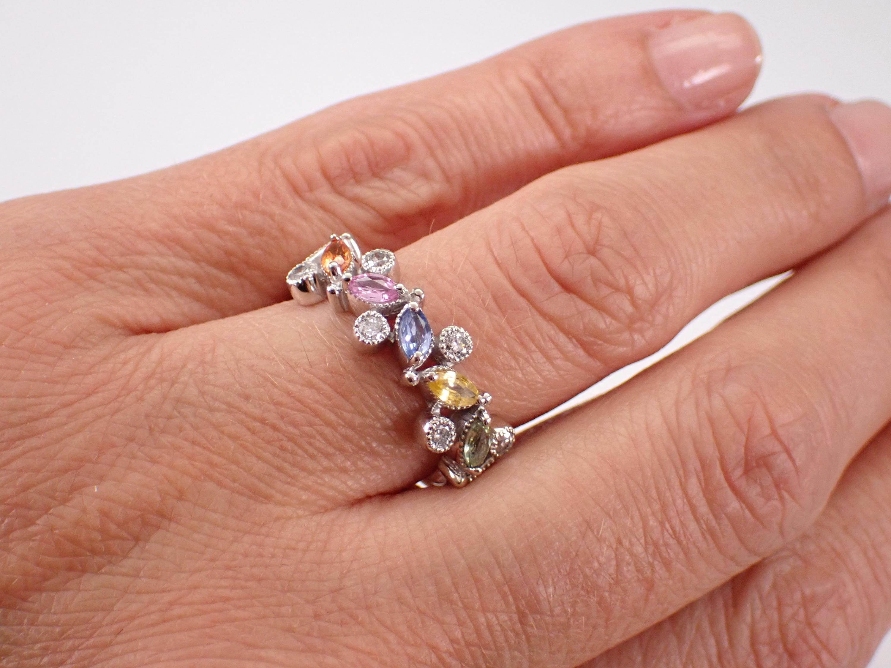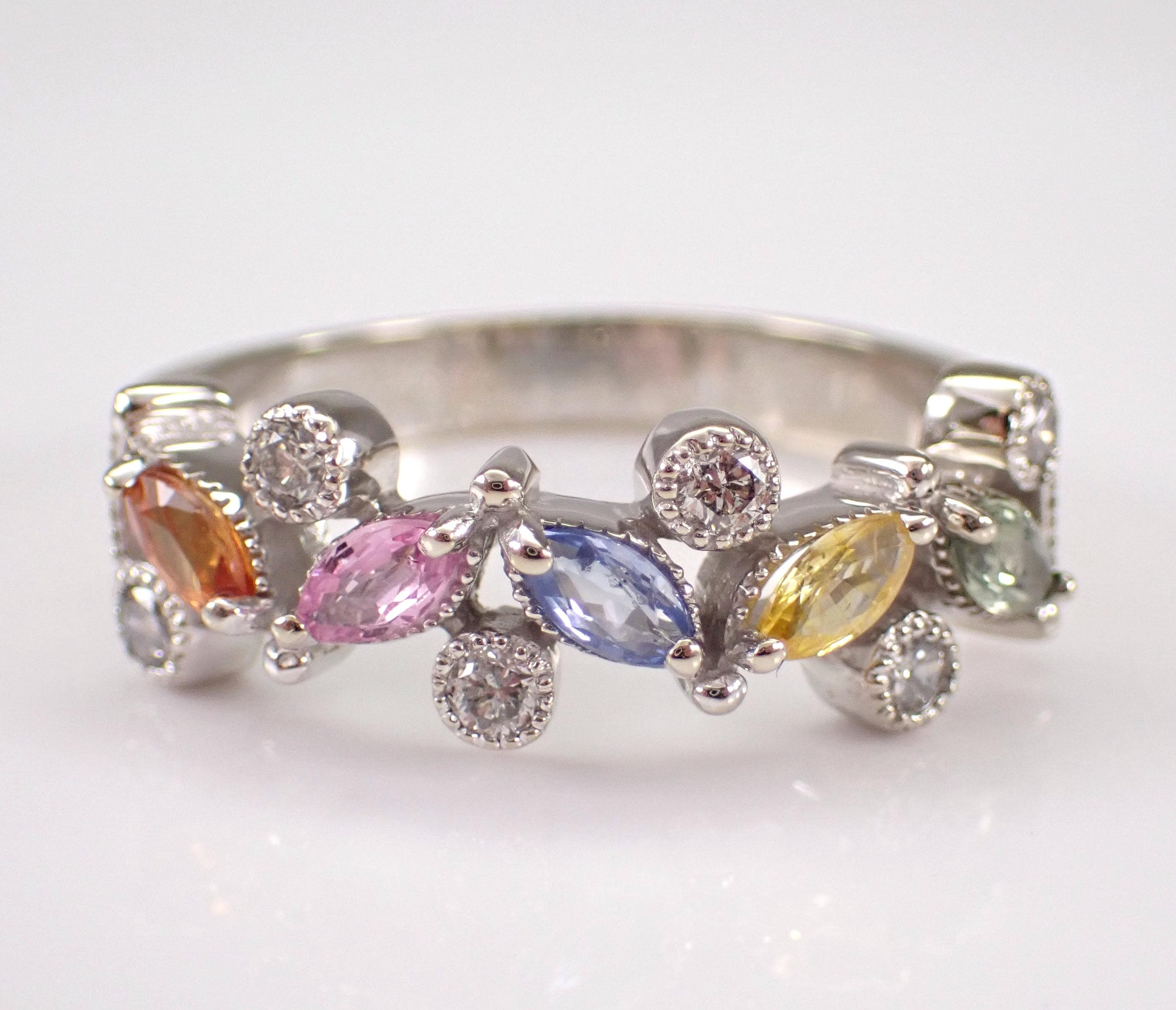14K White Gold Multi Color Sapphire and Diamond Wedding Ring Anniversary Band. This ring is set with genuine Multi Color Sapphires. All these Sapphires are 100% Genuine and amount to a total weight of .65 carat. There are six natural Round Brilliant Diamonds set in this ring. These Diamonds are H color, I1 clarity and weigh a total of .20 carat. This ring is 14KT White Gold, weighs 5.2 grams, measures 8 mm in width and is a finger size 9, can be sized free of charge (please inquire about sizing with the finger size you need). This ring will be accompanied by an appraisal by a GIA Certified Diamond Grader with the replacement value of $2,689.00. I will ship this ring promptly in a beautiful gift box.