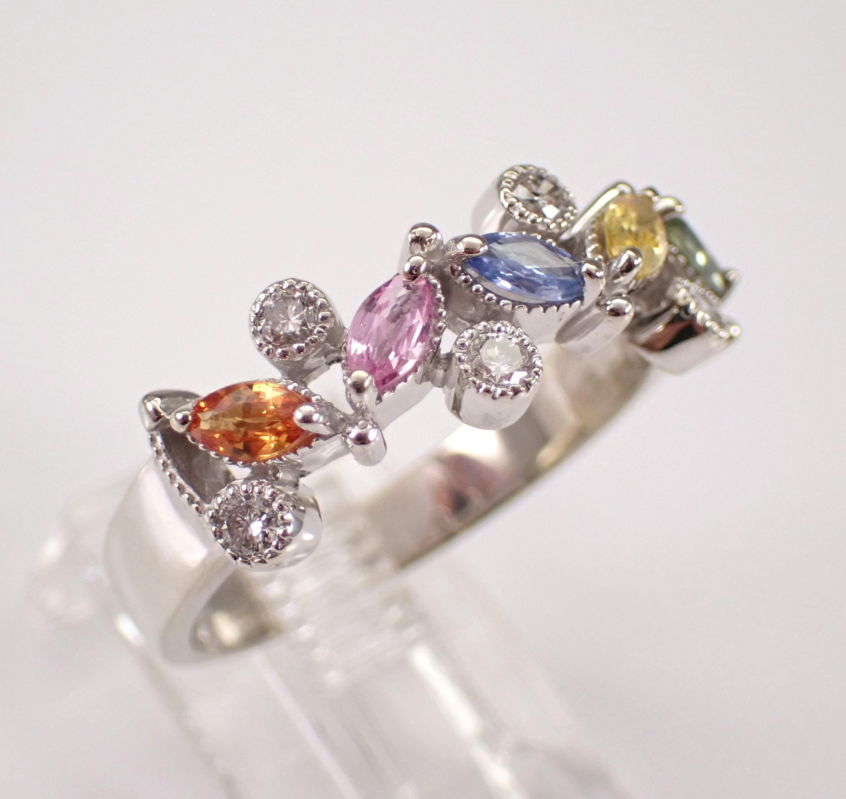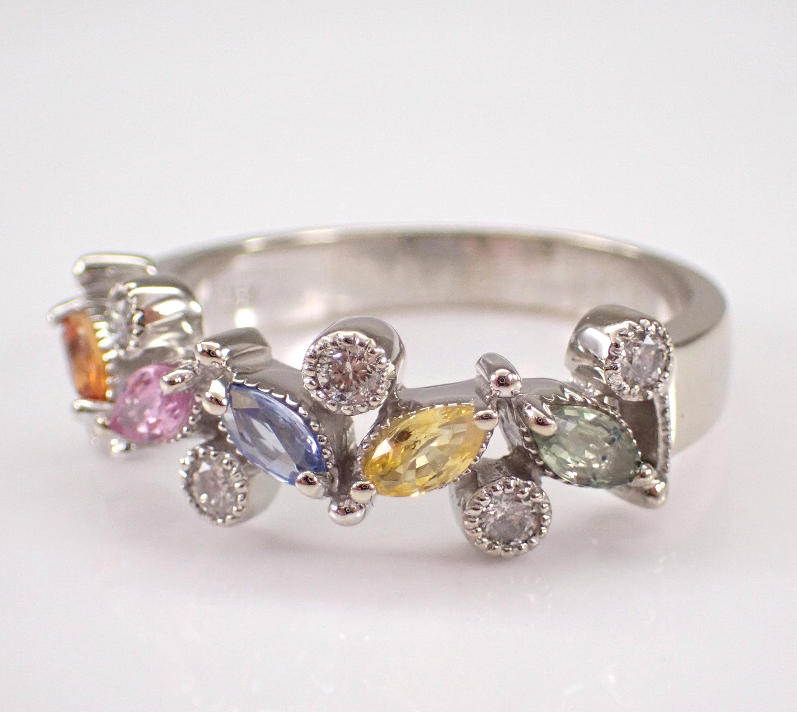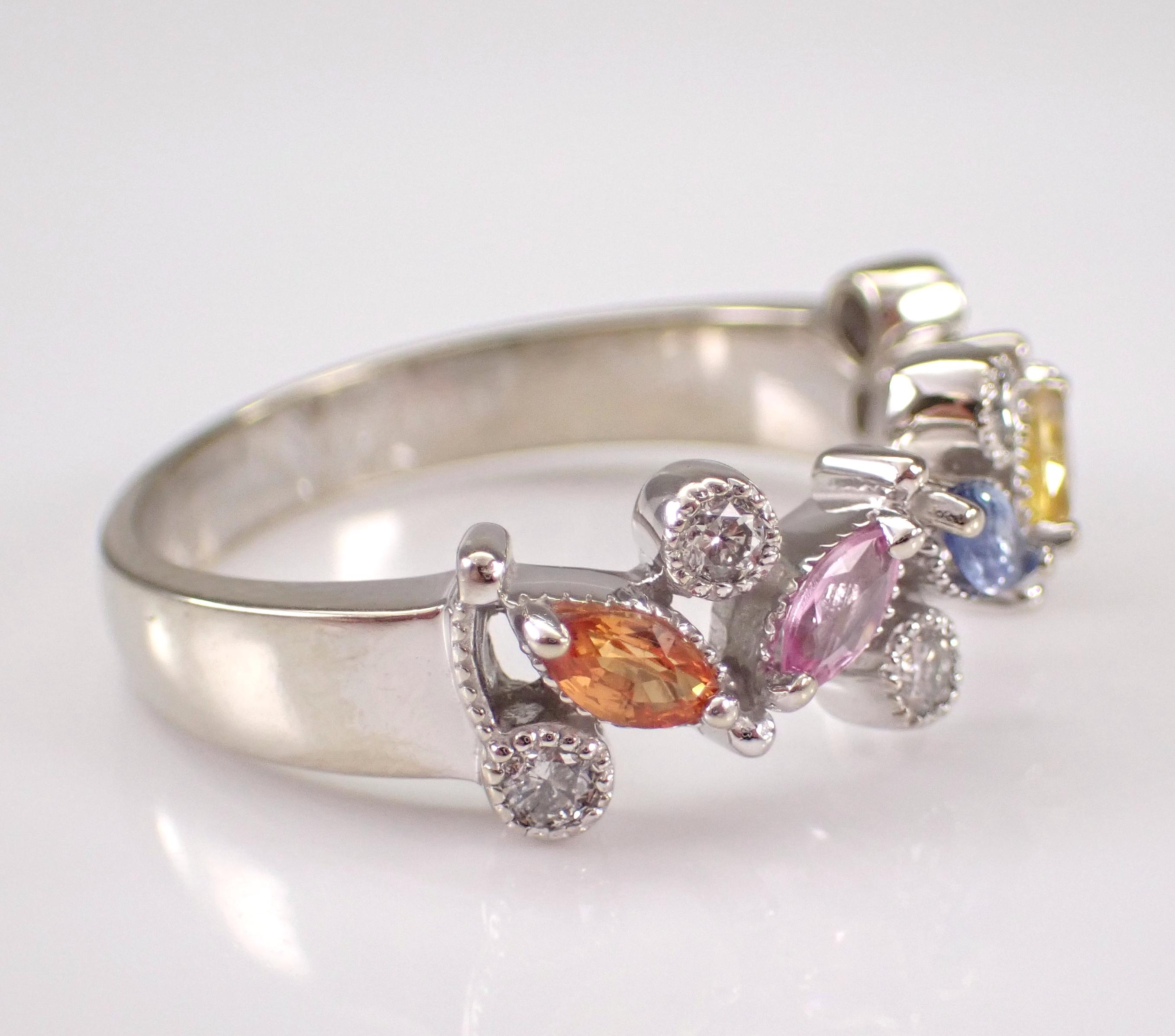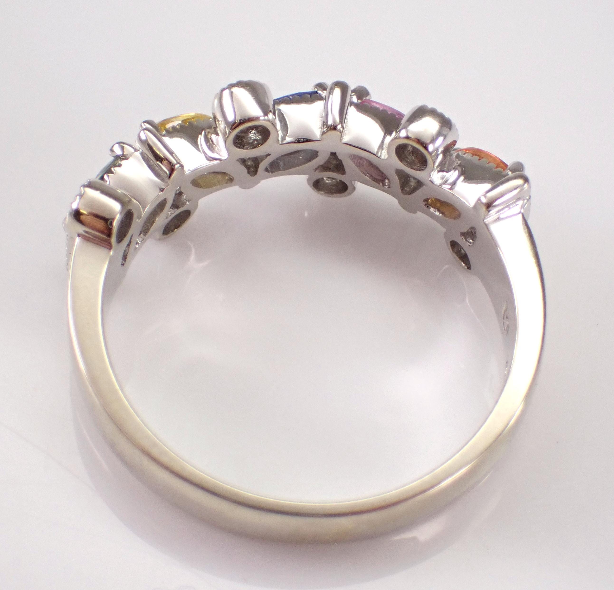 14K White Gold Multi Color Sapphire and Diamond Wedding Ring Anniversary Band. This ring is set with genuine Multi Color Sapphires. All these Sapphires are 100% Genuine and amount to a total weight of .65 carat. There are six natural Round Brilliant Diamonds set in this ring. These Diamonds are H color, I1 clarity and weigh a total of .20 carat. This ring is 14KT White Gold, weighs 5.2 grams, measures 8 mm in width and is a finger size 9, can be sized free of charge (please inquire about sizing with the finger size you need). This ring will be accompanied by an appraisal by a GIA Certified Diamond Grader with the replacement value of $2,689.00. I will ship this ring promptly in a beautiful gift box.