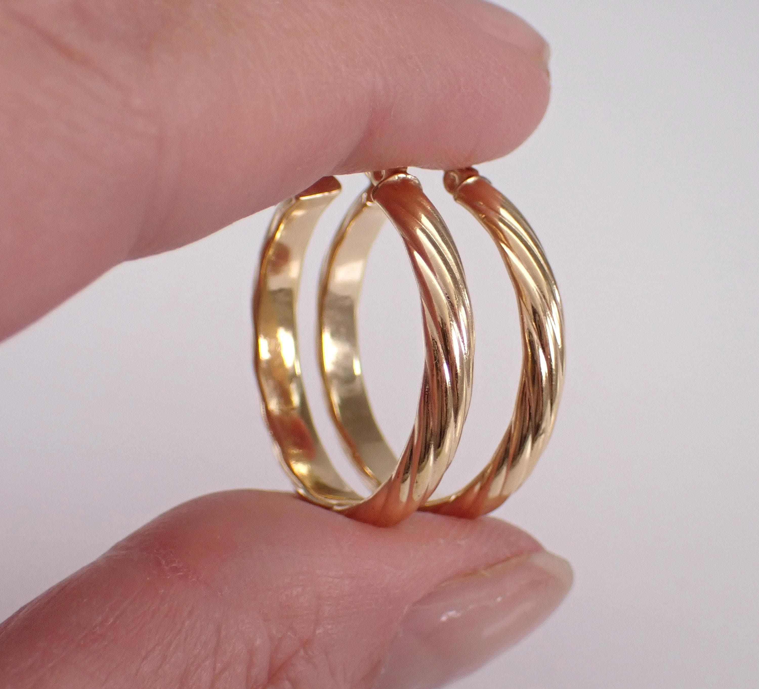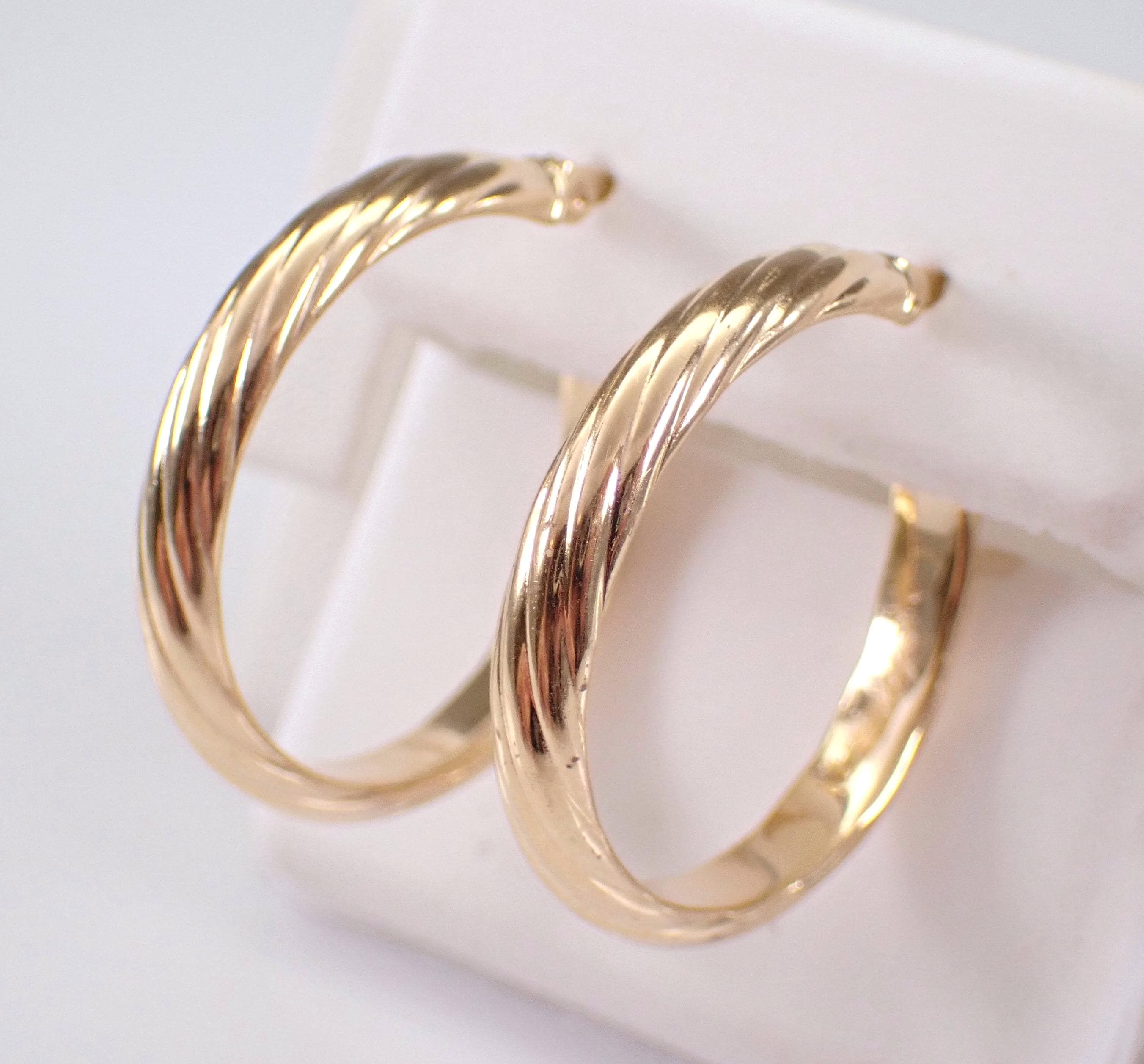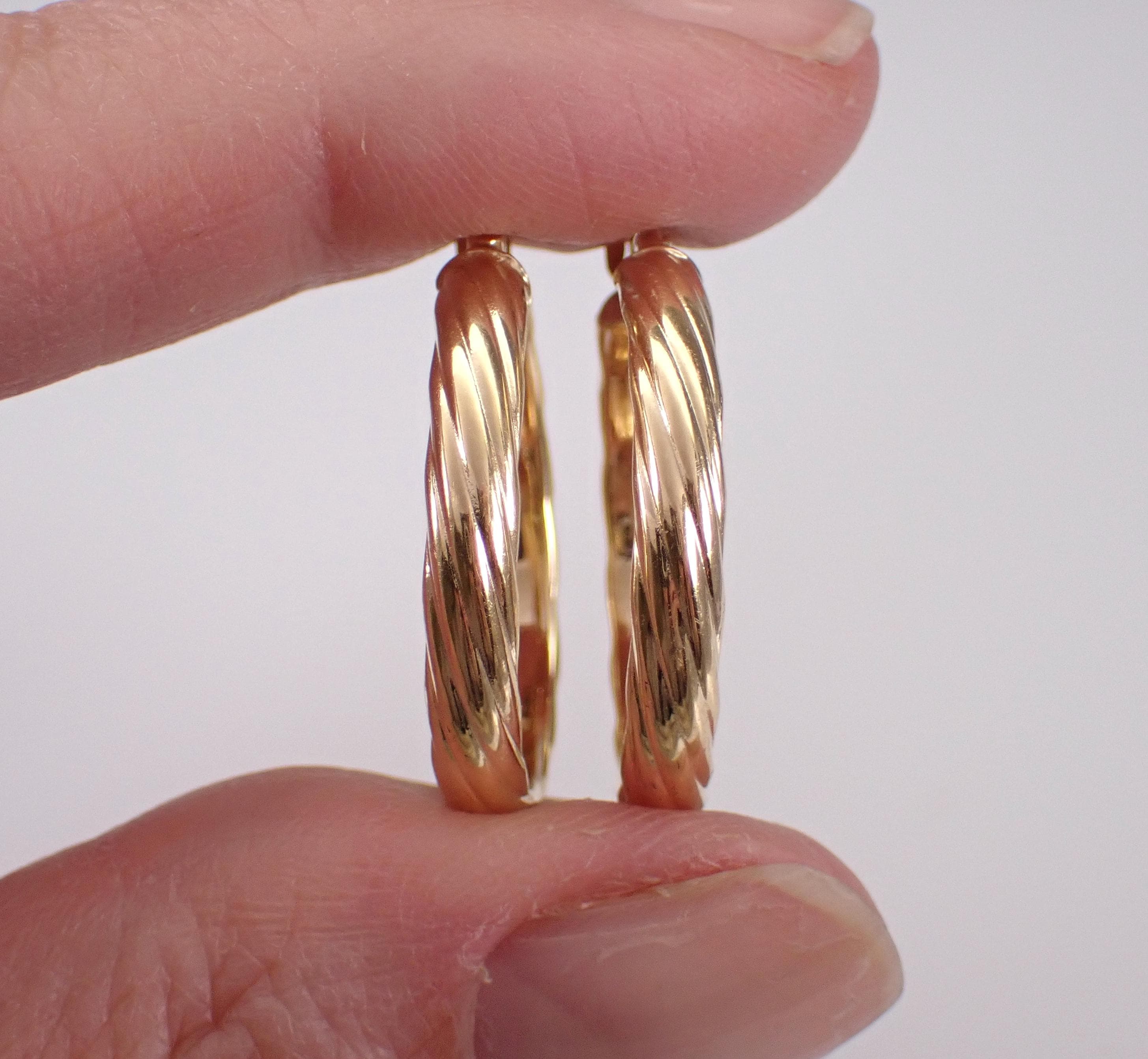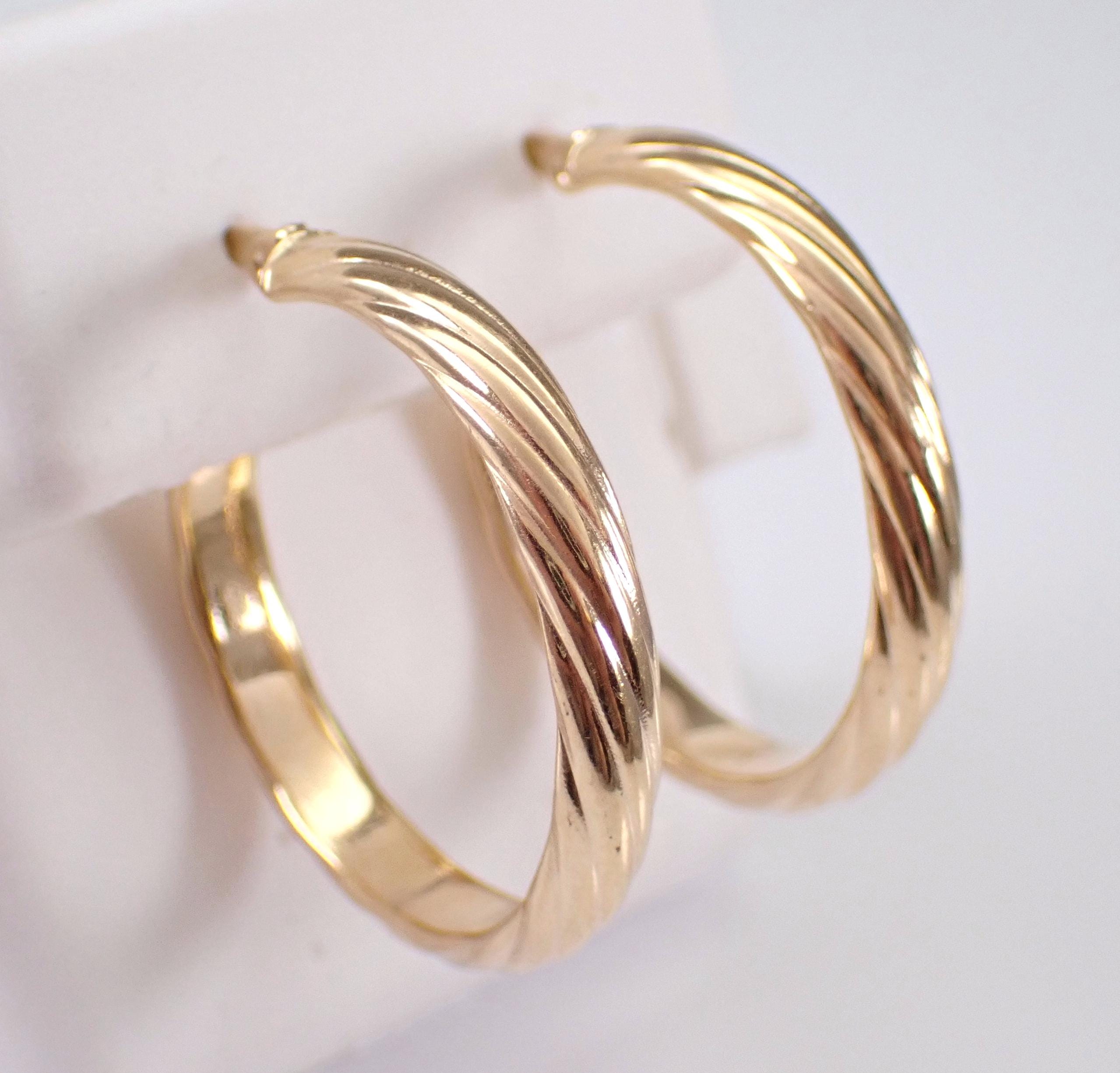 14K Yellow Gold Hoop Earrings. These earrings are 14K Yellow Gold and weigh a total of 3.0 grams. These earrings are for pierced ears and measure 24.5 mm in diameter ( 1" ) and will be shipped promptly in a gift box.