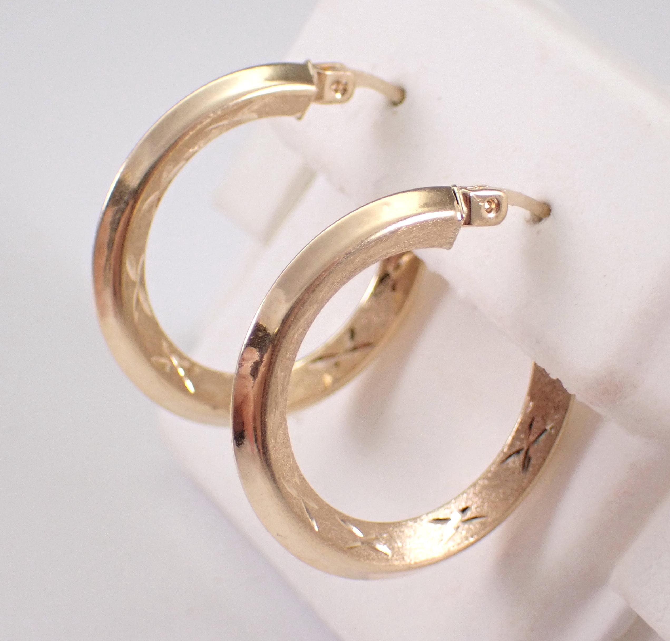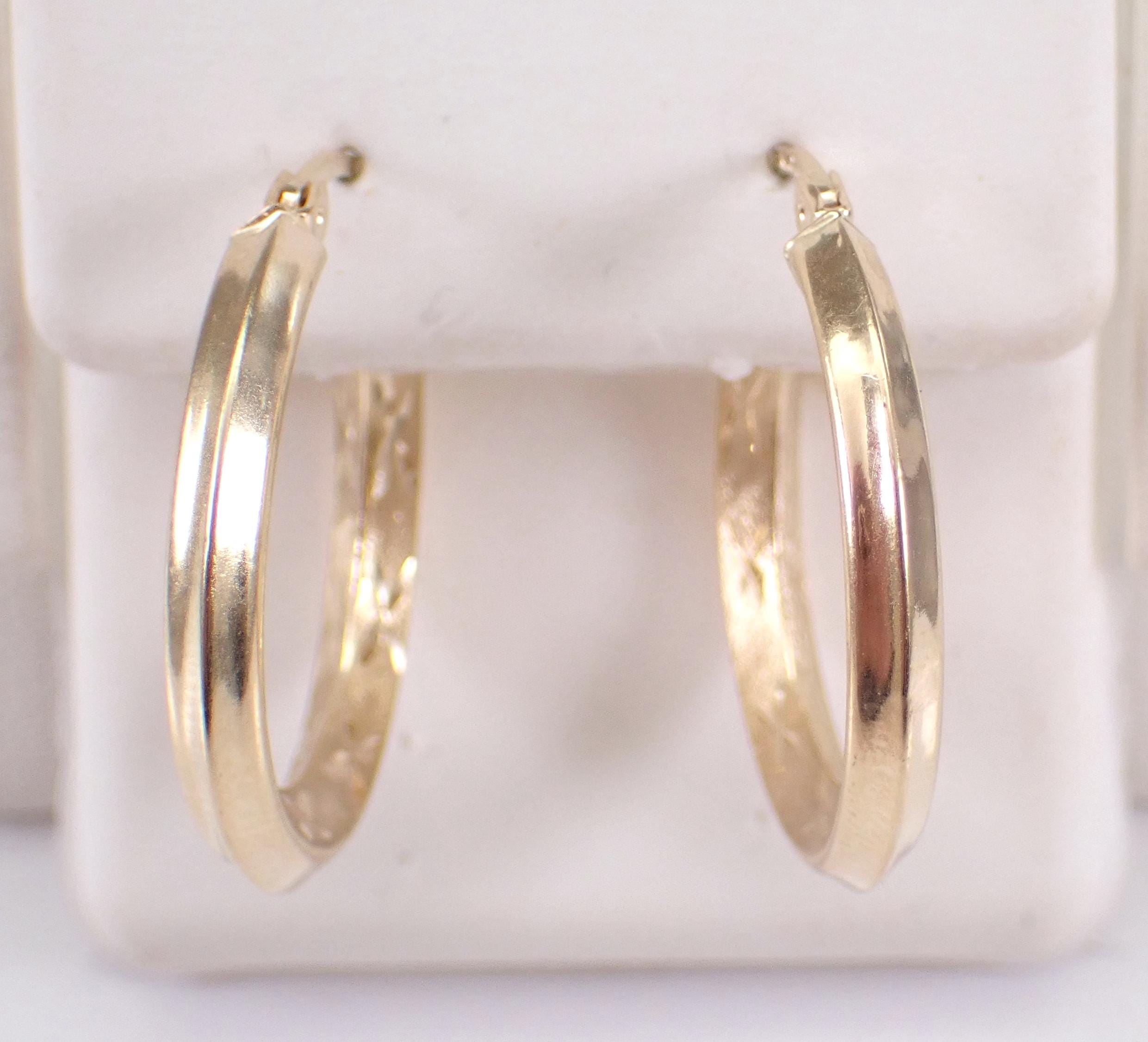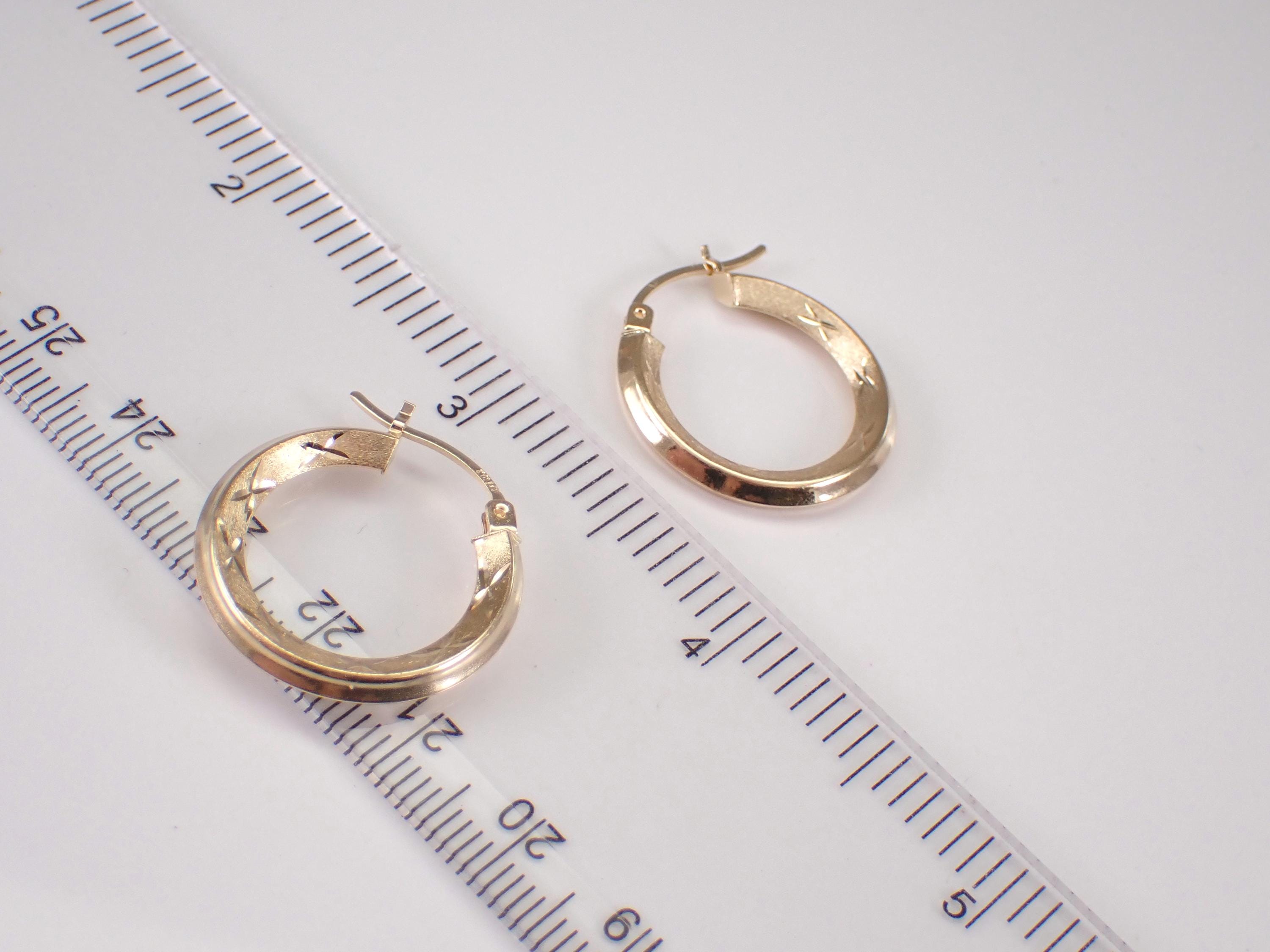 Yellow Gold Unique Vintage Hoop Earrings. These earrings are 10K Yellow Gold and weigh a total of 1.2 grams. These earrings are for pierced ears and measure 22 mm in diameter. These earrings will be shipped promptly in a gift box.