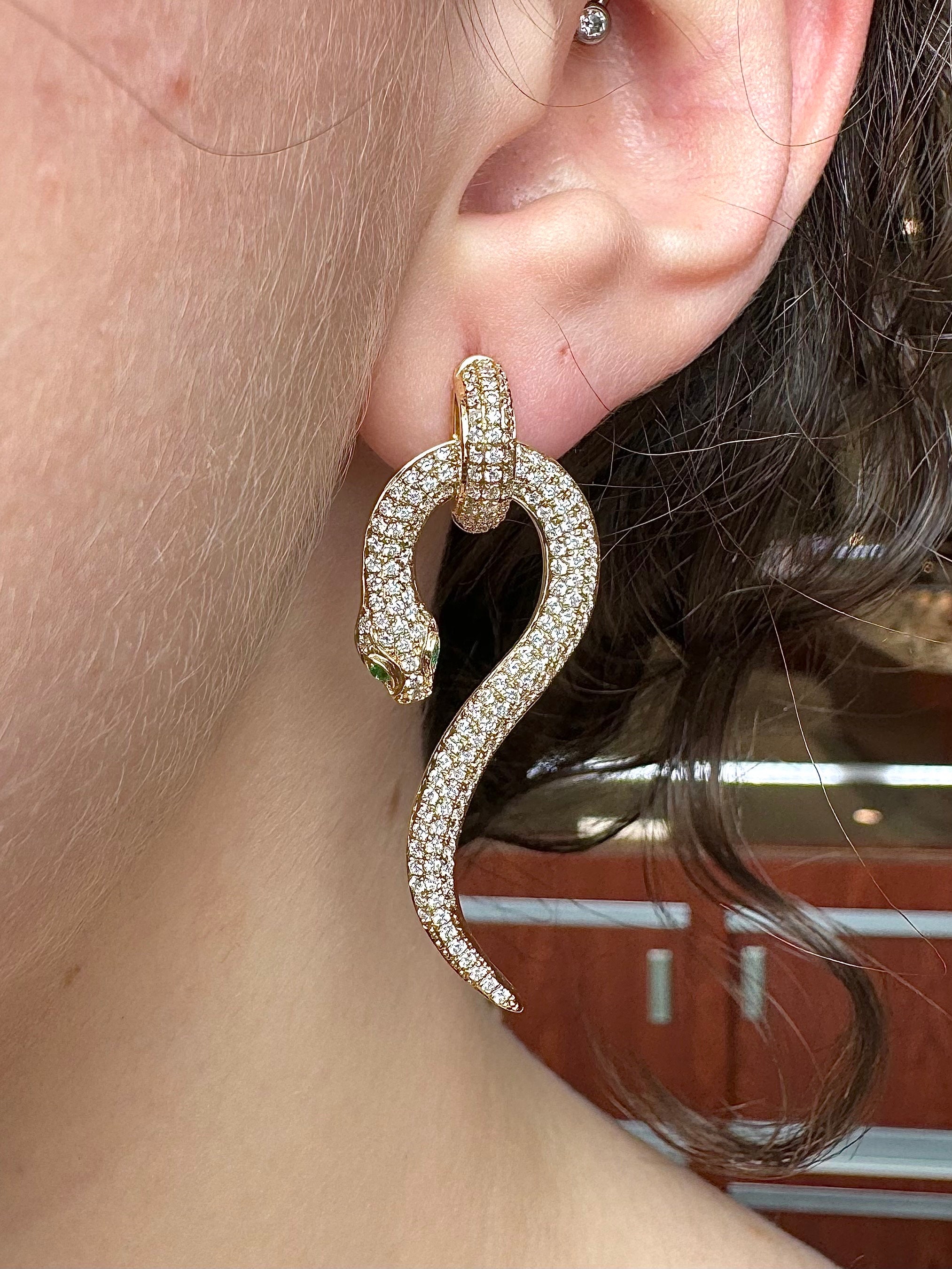 These earrings are 18K Yellow Gold and are set with all genuine Diamonds and Emeralds. There are three hundred and thirty-six (336) genuine round brilliant diamonds in these earrings. These diamonds are G color, SI1 clarity and amount to a total weight of 1.95 carats. The emeralds in the eyes of the snake are also 100% natural and weigh a total of .06 carat. These earrings weigh a total of 11.8 grams and measure 46 mm in length (a little over 1 3/4"). These earrings are for pierced ears and have friction post backings.