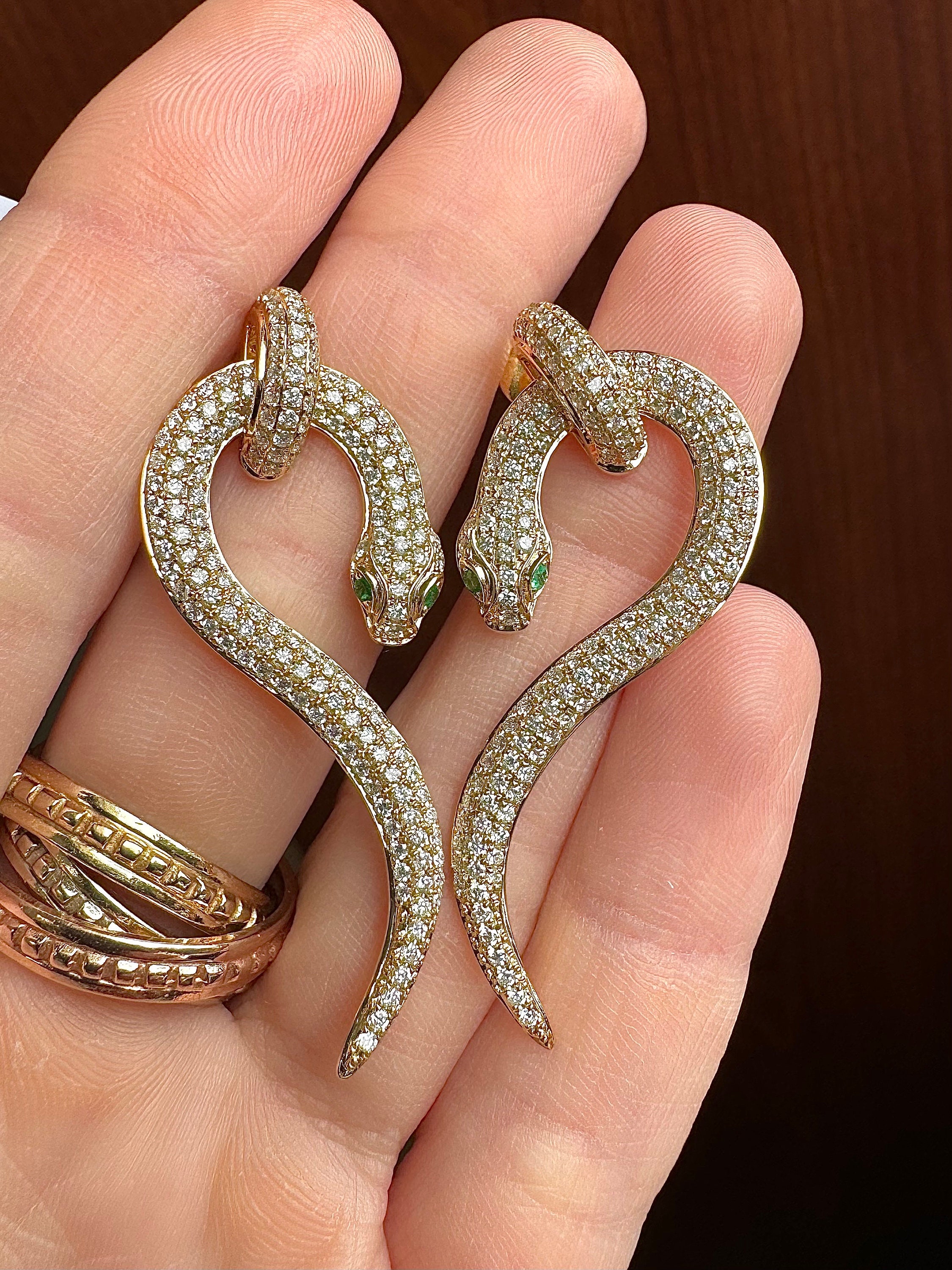 These snake earrings are the perfect gateway into the fabulous world of high jewelry! Studded with pavé diamonds and delightful jungle-green emeralds, these earrings boast a beautiful sparkle. They shimmy and shake as you move, but they’ll go no further than your ears (thanks to ingenious engineering). Not only are these beautiful from the front, but beautiful hidden details are interspersed throughout the back of the earrings.