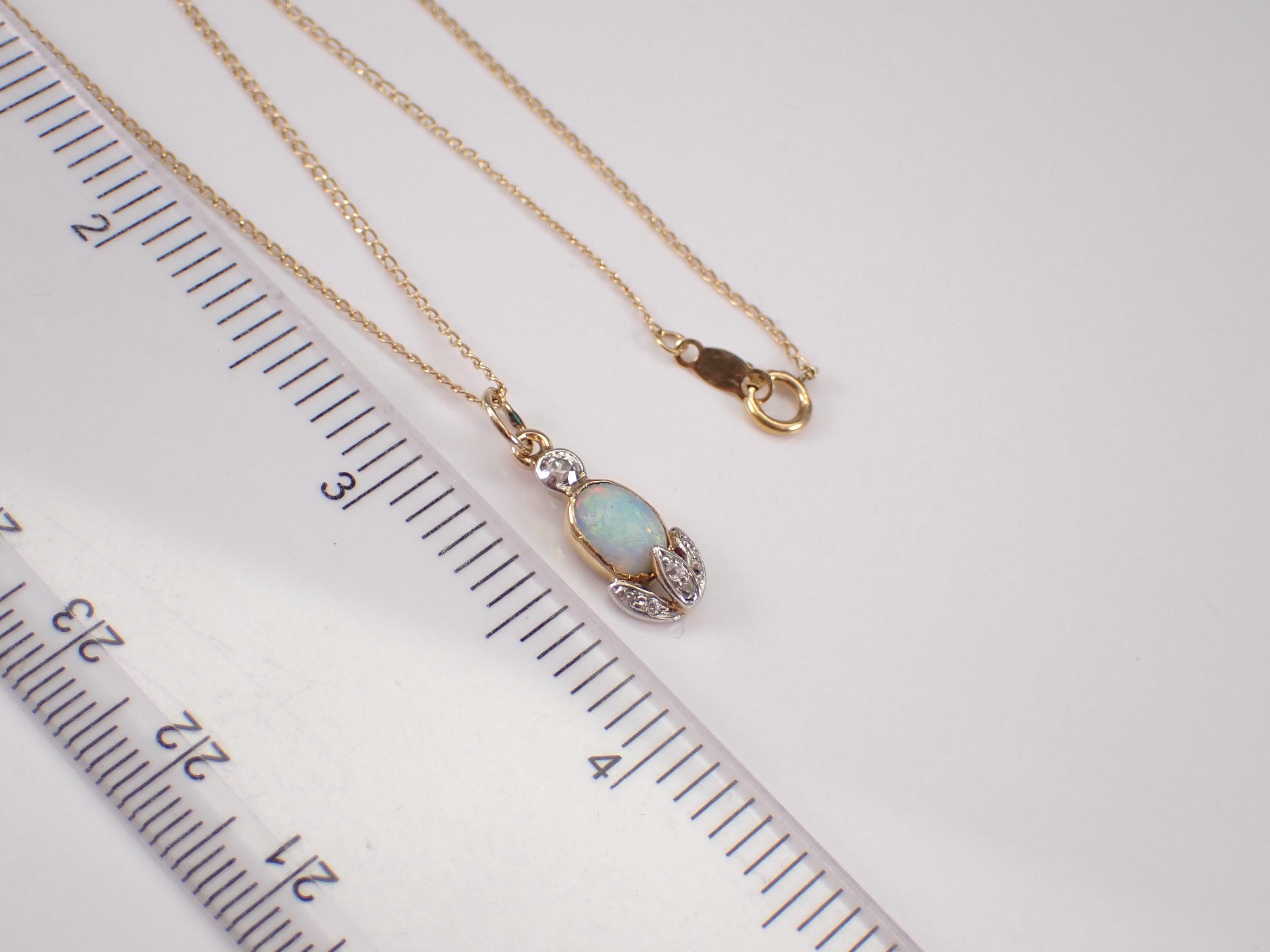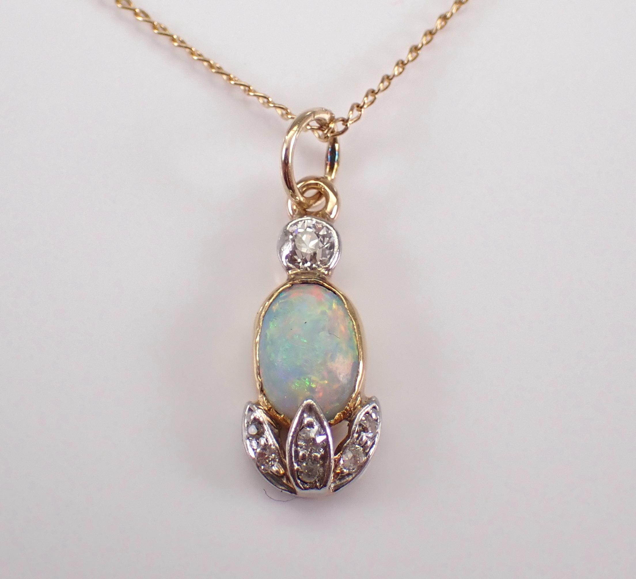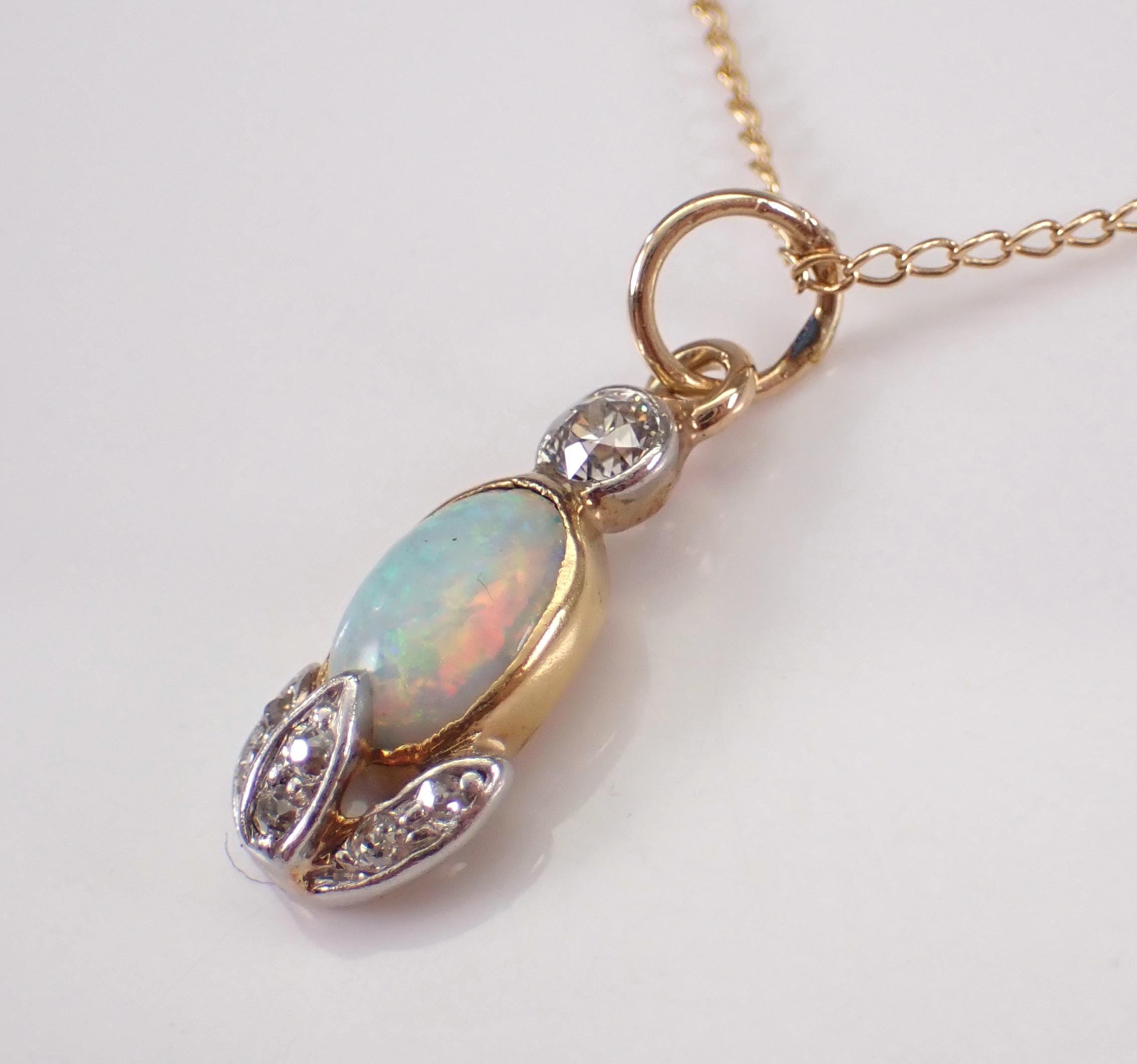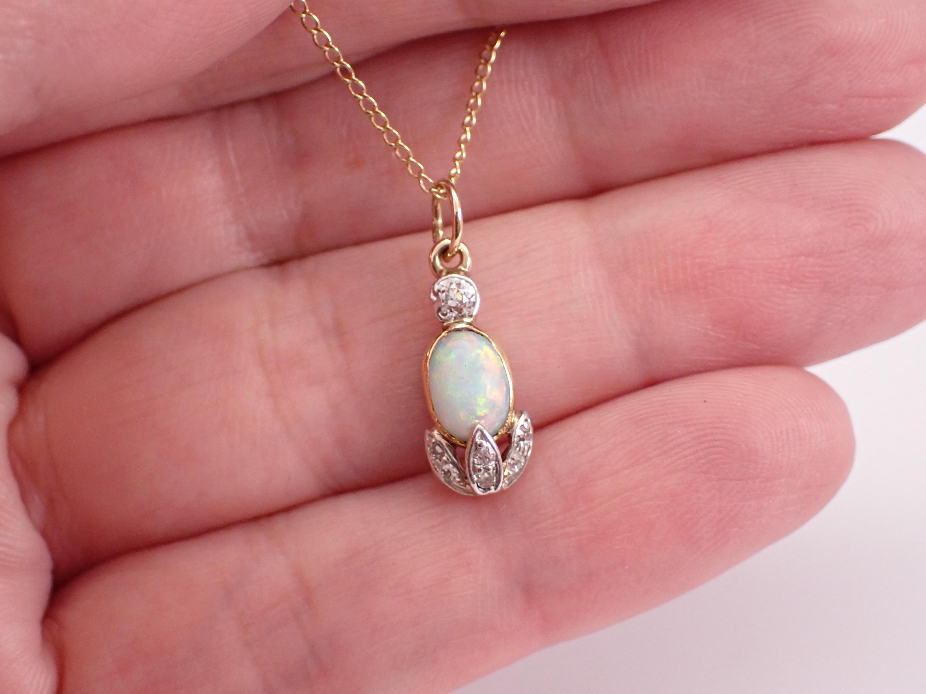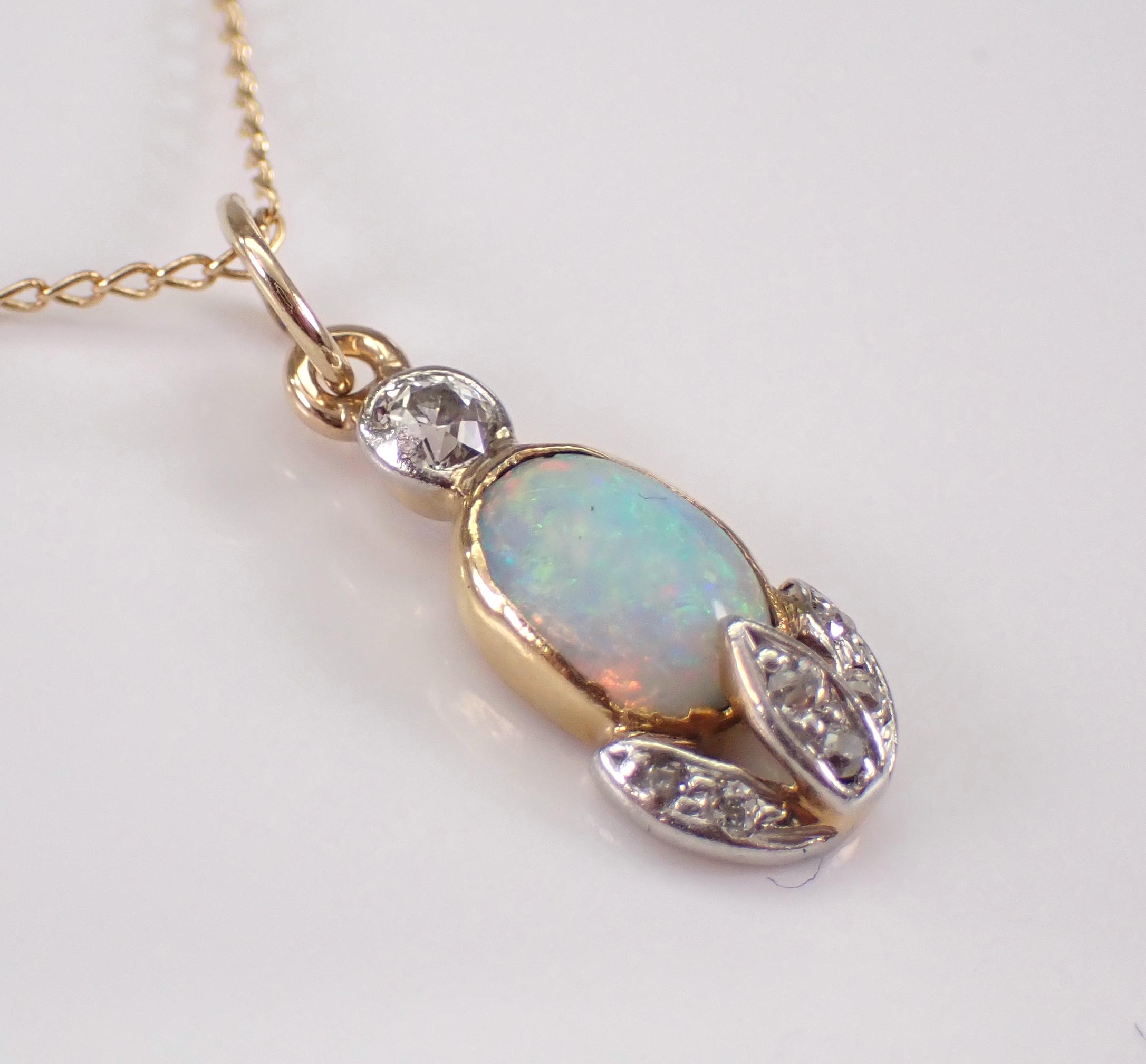 Antique 14K Yellow Gold Opal and Diamond Pendant with Chain. This pendant is set with a genuine Oval Opal and seven natural Round Old Miner Diamonds. These diamonds are H color, SI clarity and weigh a total of .15 carat. The Opal measures 7 X 5 mm. This pendant is 14KT Yellow Gold and comes with a 17" 14KT Yellow Gold chain. Both the pendant and chain weigh a total of 2.1 grams and the pendant measures 17 X 7 mm. I will ship this necklace promptly in a beautiful gift box accompanied by an appraisal for insurance and authentication purposes.