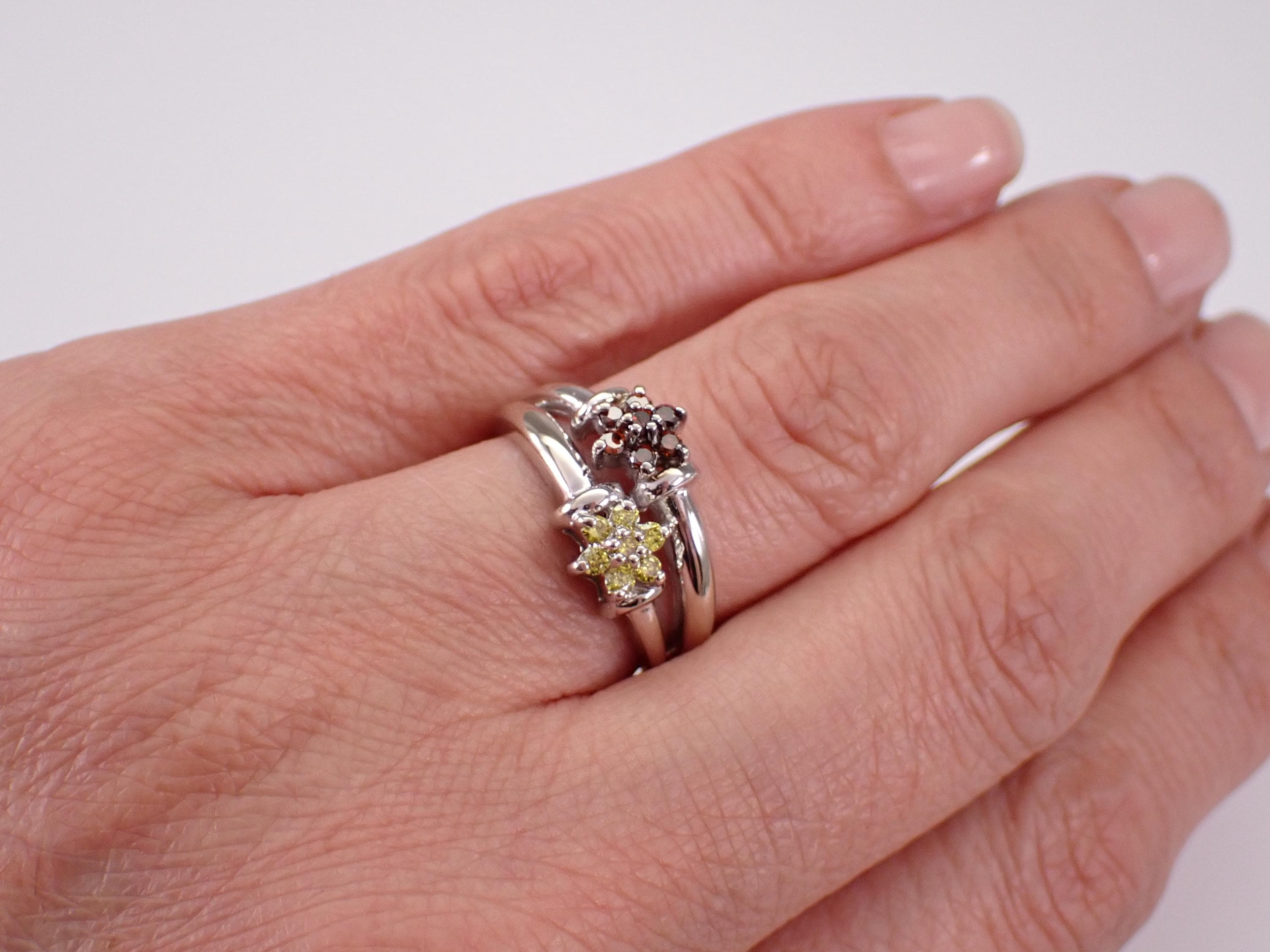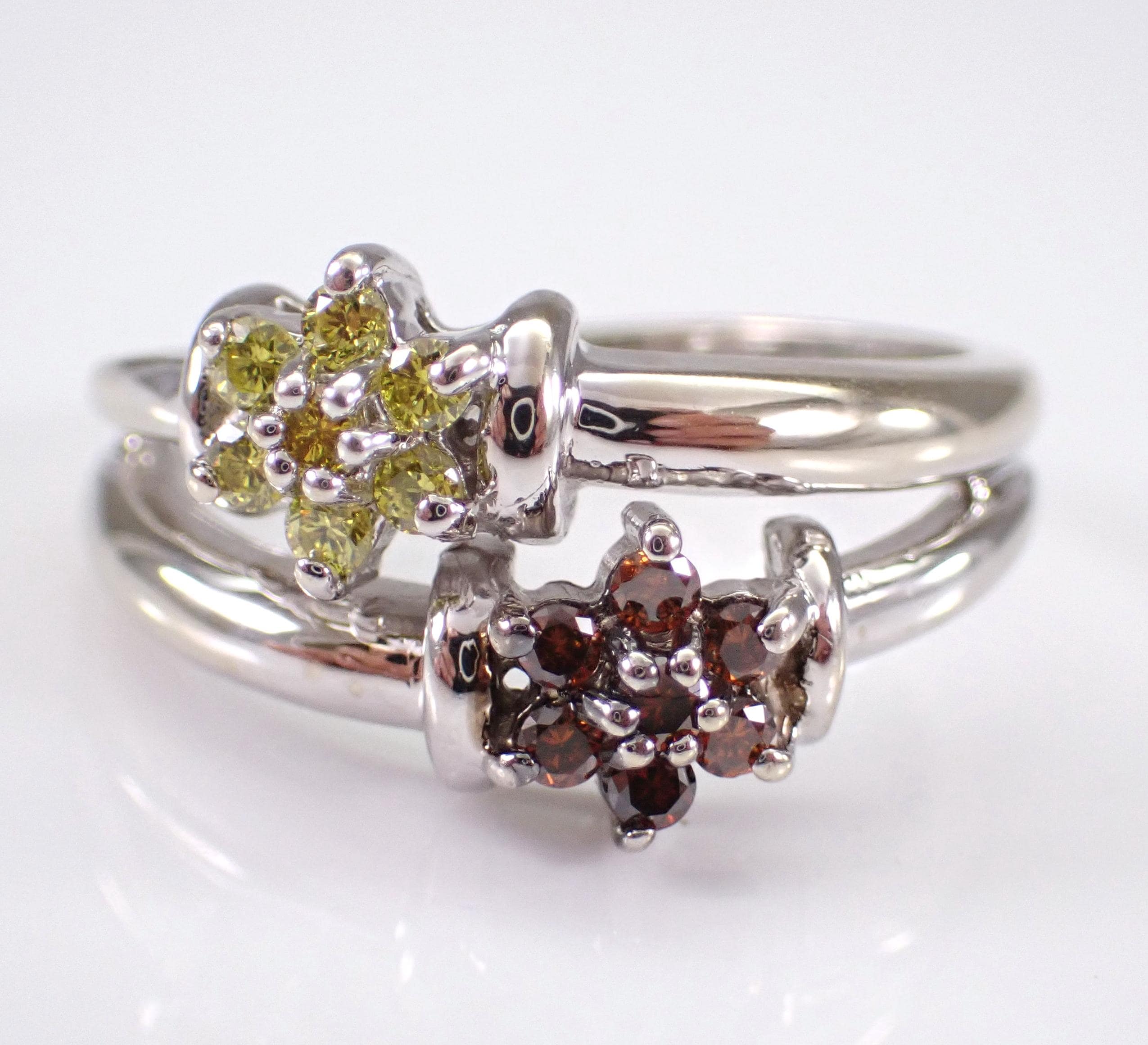 14K White Gold Diamond Flower Ring - Canary and Orange Cluster Multi Row Setting - Estate Vintage Fine Jewelry Gift