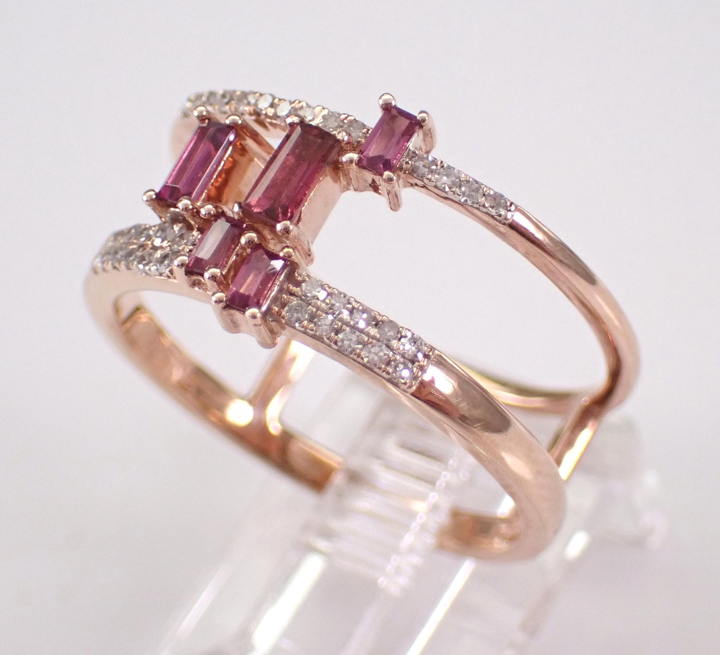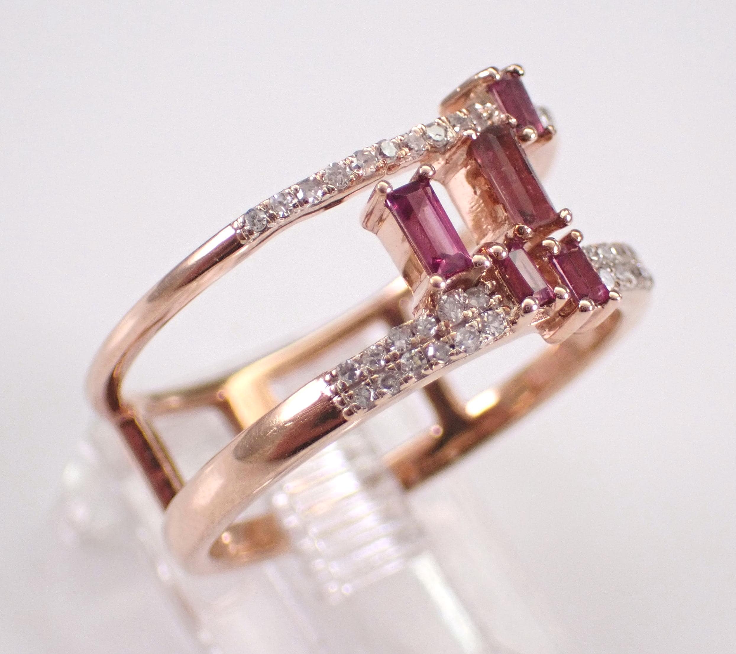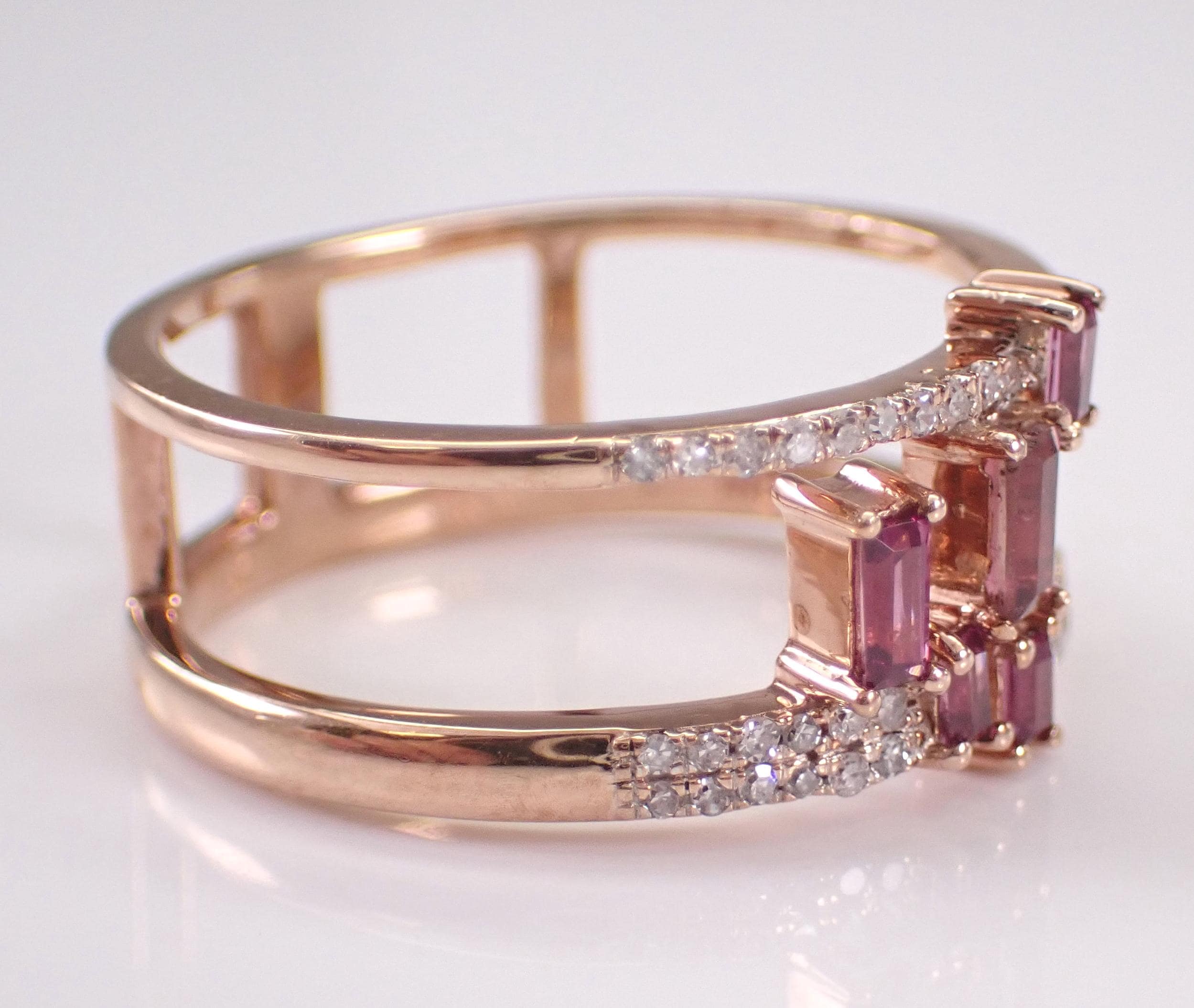 Solid Rose Gold Garnet and Diamond Ring. This gorgeous ring is set with thirty-six genuine Round Brilliant Diamonds and five natural Baguette Rhodolite Garnets. These diamonds are H color, I1 clarity and combine to a total weight of .15 carat. The garnets weigh a total of .38 carat. This ring is Solid 10KT Rose Gold, weighs 3.3 grams, measures 8 mm in width at its widest point and is a finger size 7, which is slightly resizable (please inquire about sizing with the finger size you need). The ring will be accompanied by an appraisal by a GIA Certified Diamond Grader with the retail replacement value of $1,485.00. I will ship this ring promptly in a gift box.
