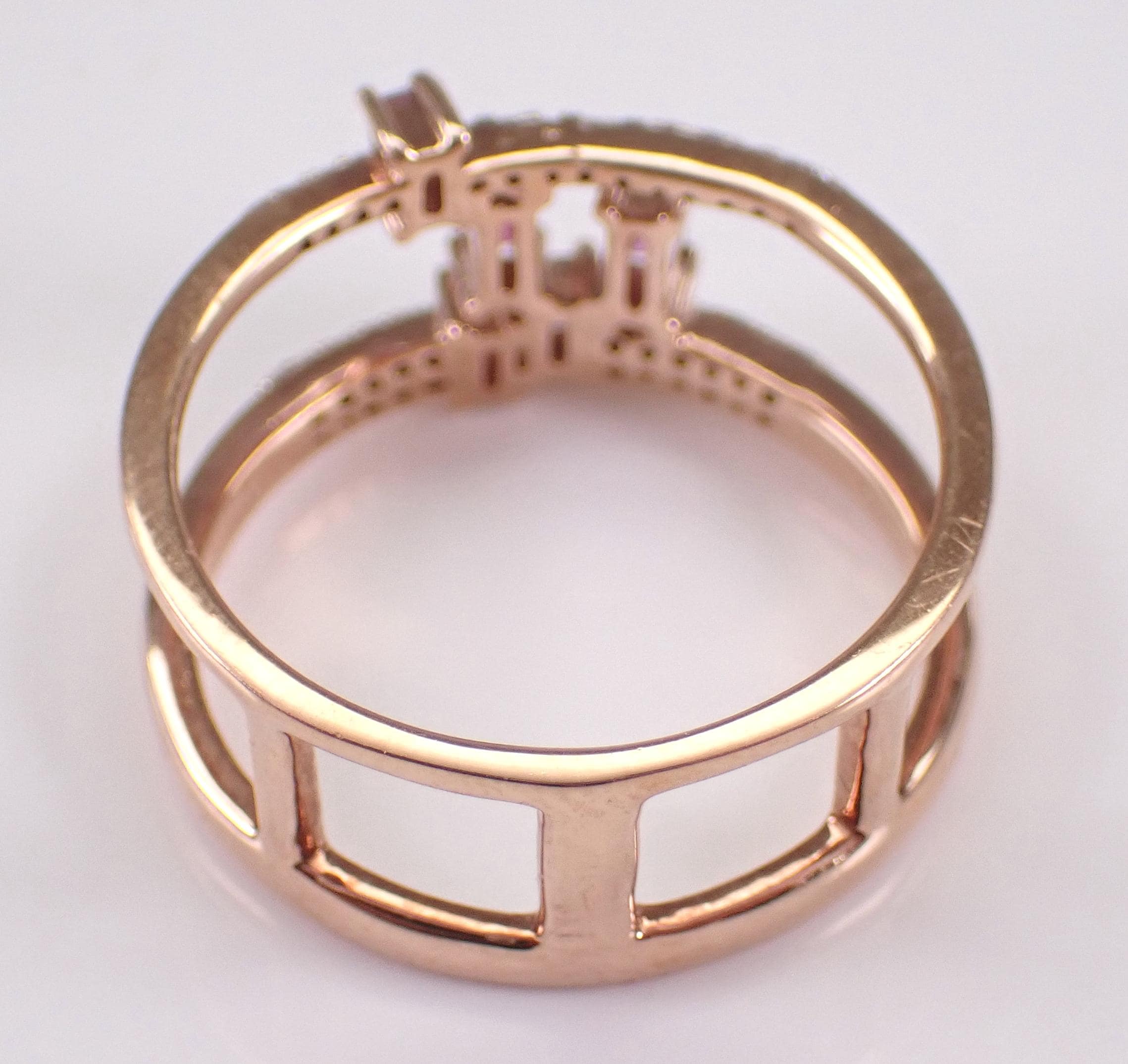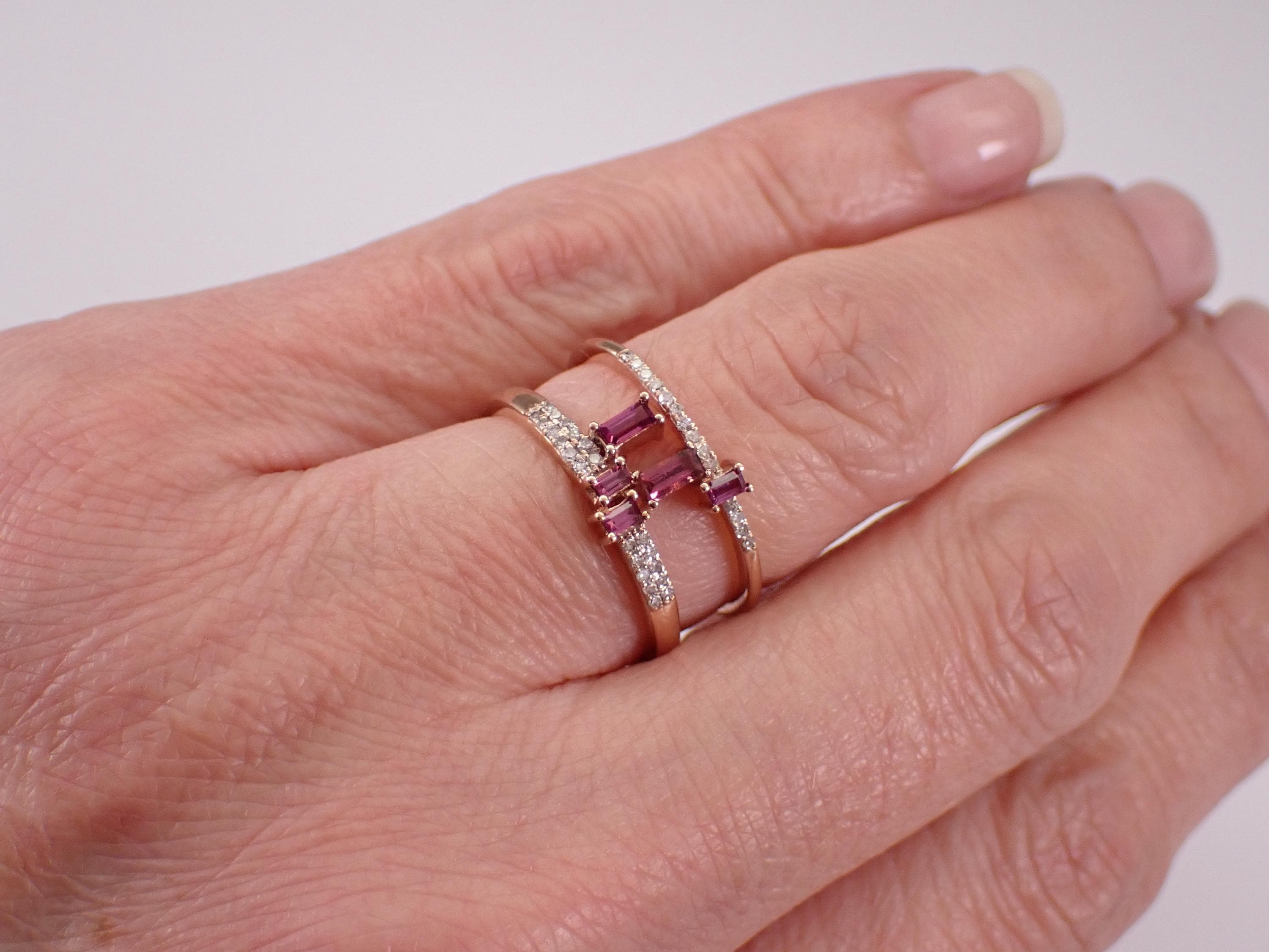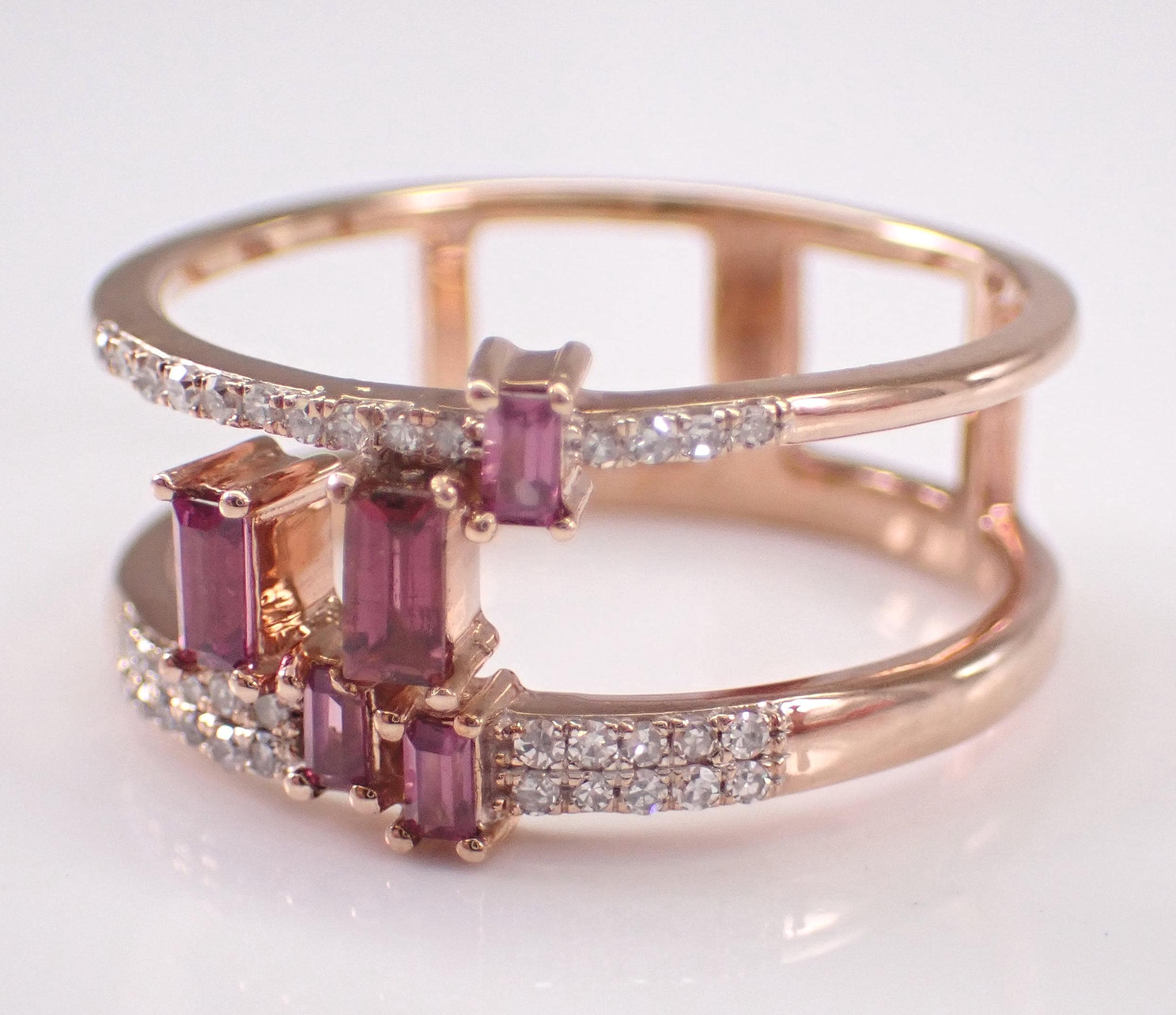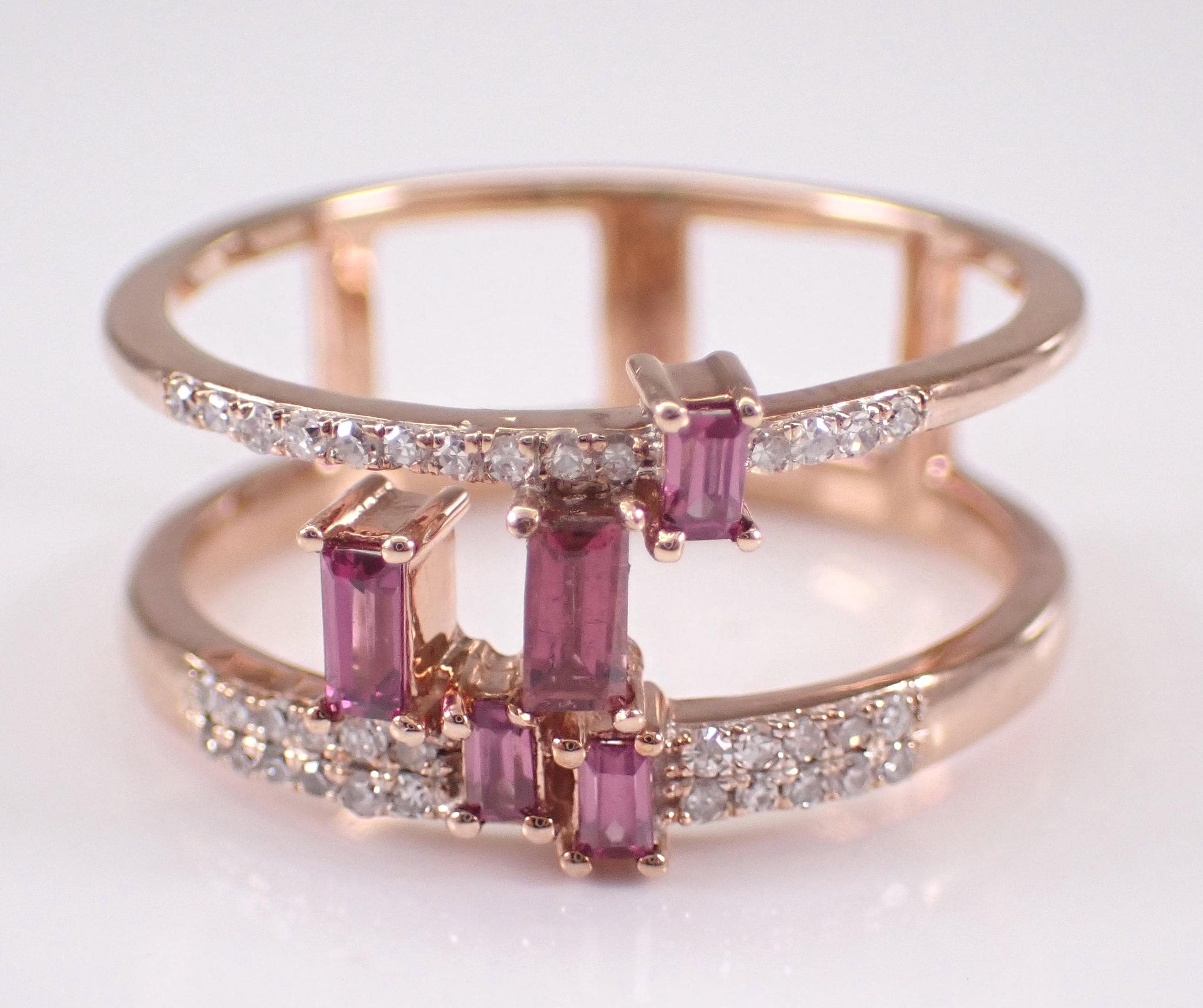 Solid Rose Gold Garnet and Diamond Ring. This gorgeous ring is set with thirty-six genuine Round Brilliant Diamonds and five natural Baguette Rhodolite Garnets. These diamonds are H color, I1 clarity and combine to a total weight of .15 carat. The garnets weigh a total of .38 carat. This ring is Solid 10KT Rose Gold, weighs 3.3 grams, measures 8 mm in width at its widest point and is a finger size 7, which is slightly resizable (please inquire about sizing with the finger size you need). The ring will be accompanied by an appraisal by a GIA Certified Diamond Grader with the retail replacement value of $1,485.00. I will ship this ring promptly in a gift box.