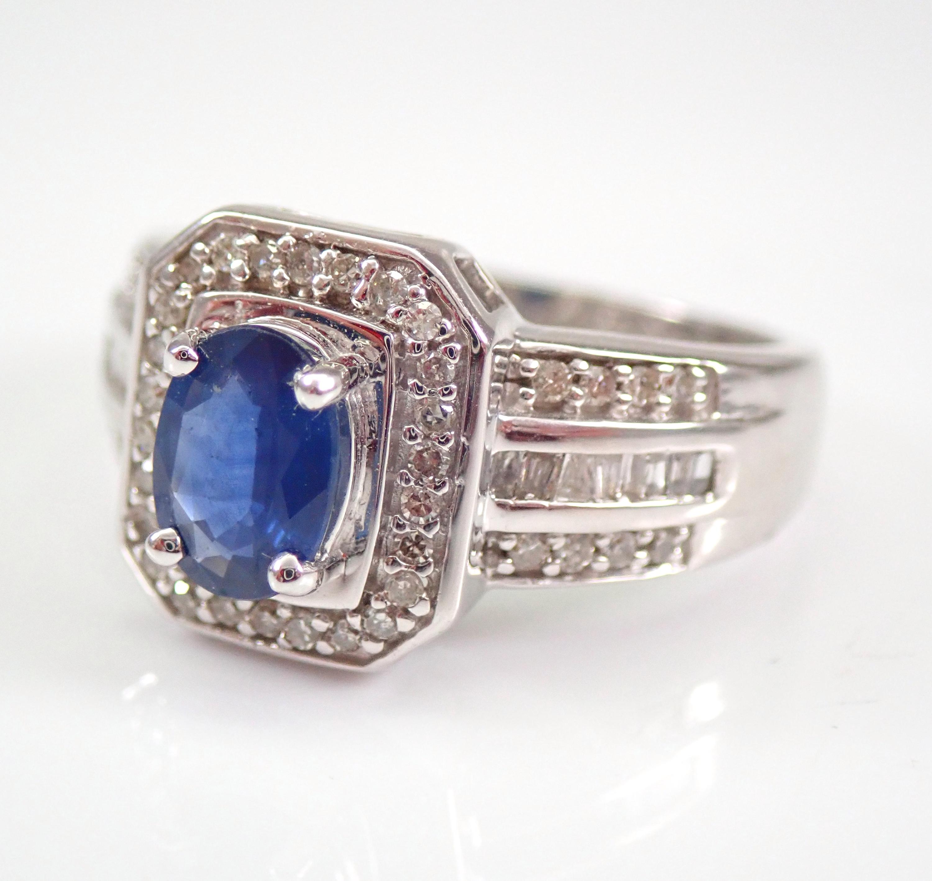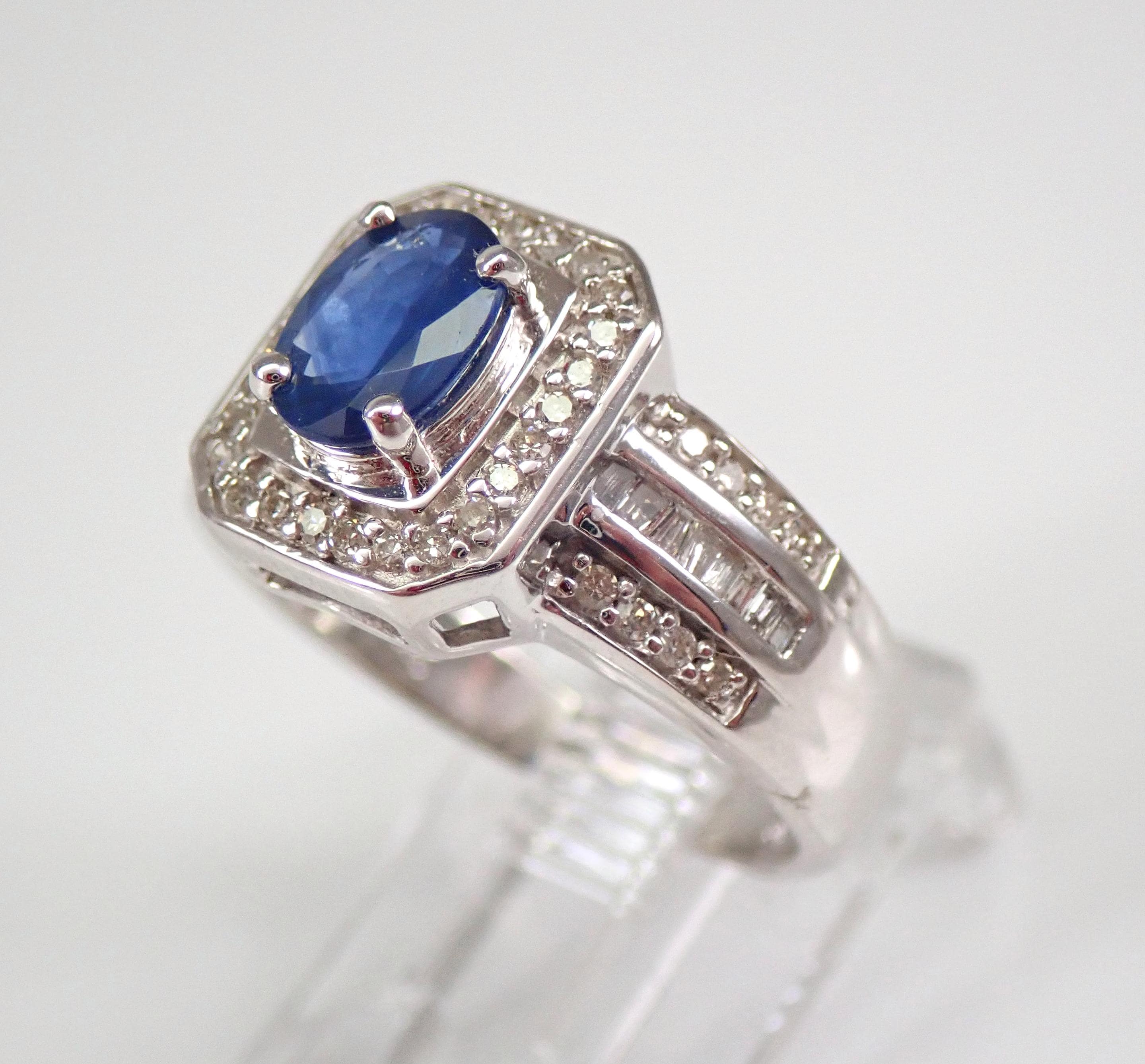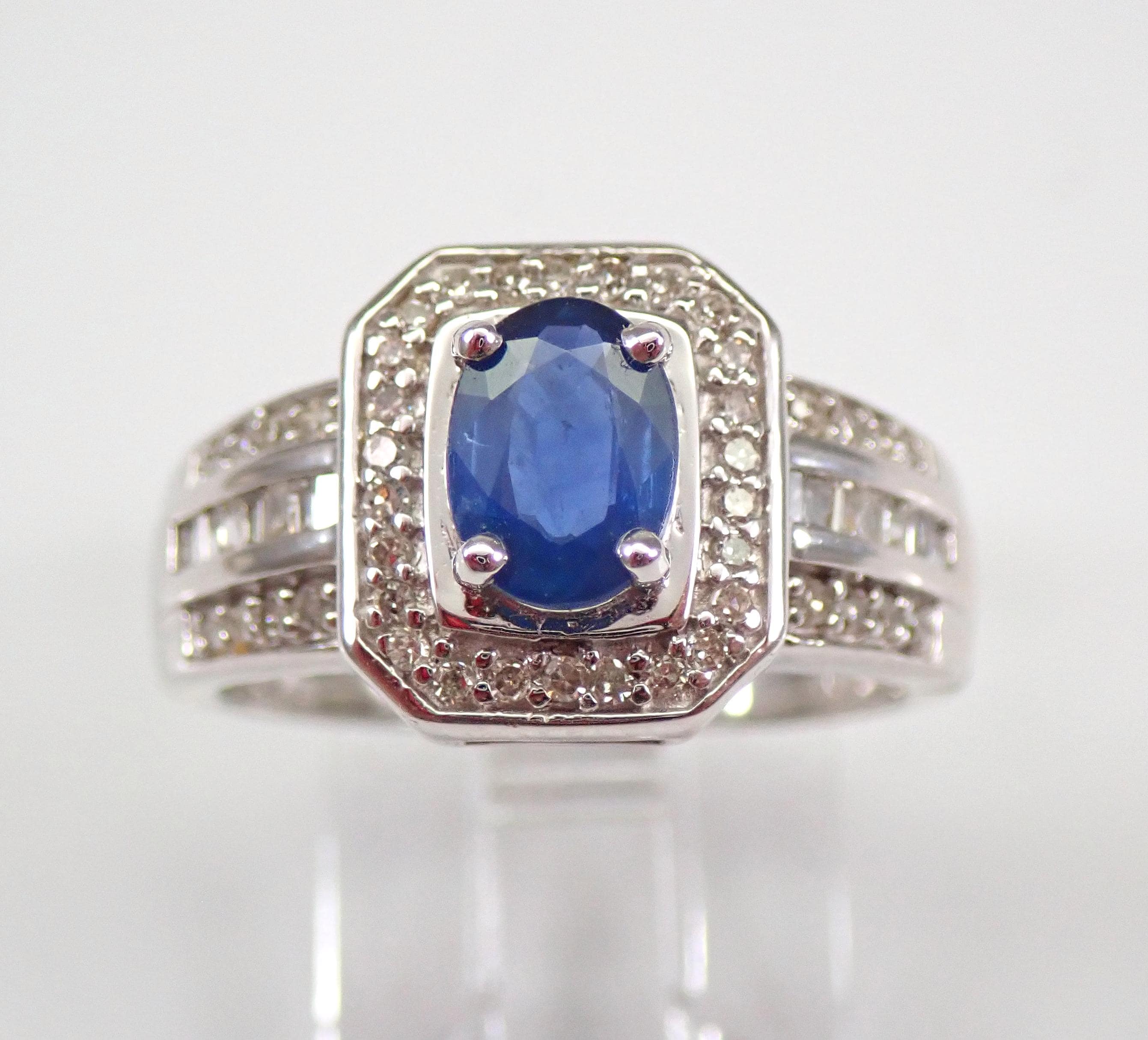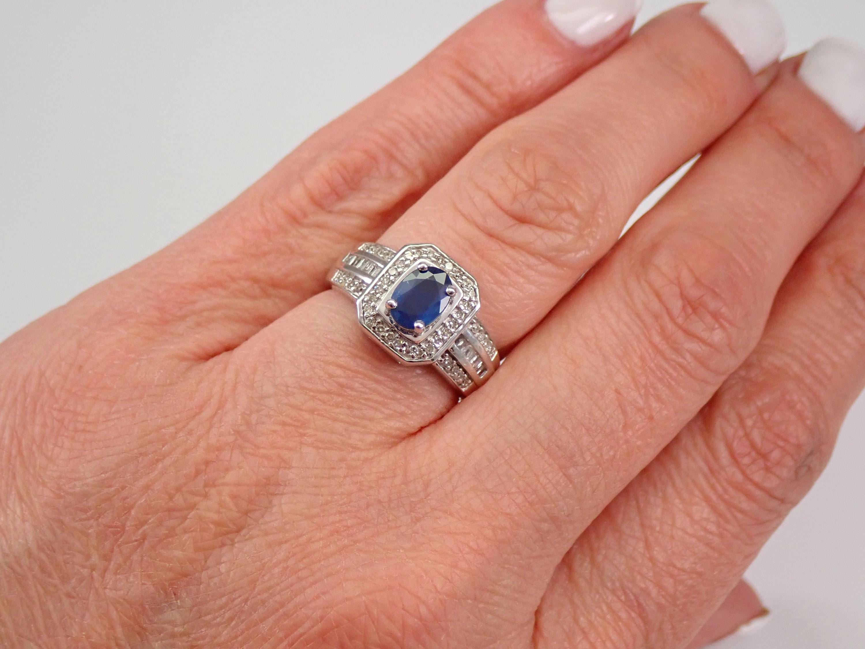 White Gold Diamond and Sapphire Halo Engagement Ring. This ring is set with one genuine Oval Sapphire in the center, sixteen baguette diamonds and forty-two natural Round Brilliant Diamonds. These diamonds are H color, SI/I clarity and weigh a total of 1/2 carats. The Sapphire is a beautiful dark blue color, measures 6.8 X 5 mm and weighs 1 carat. This ring is 10KT White Gold, weighs 5.1 grams and is a finger size 6, which is resizable free of charge (please inquire about sizing with the finger size you need). The ring will be accompanied by an appraisal by a GIA Certified Diamond Grader with the retail replacement value of $1,695.00. I will ship this ring promptly in a gift box.