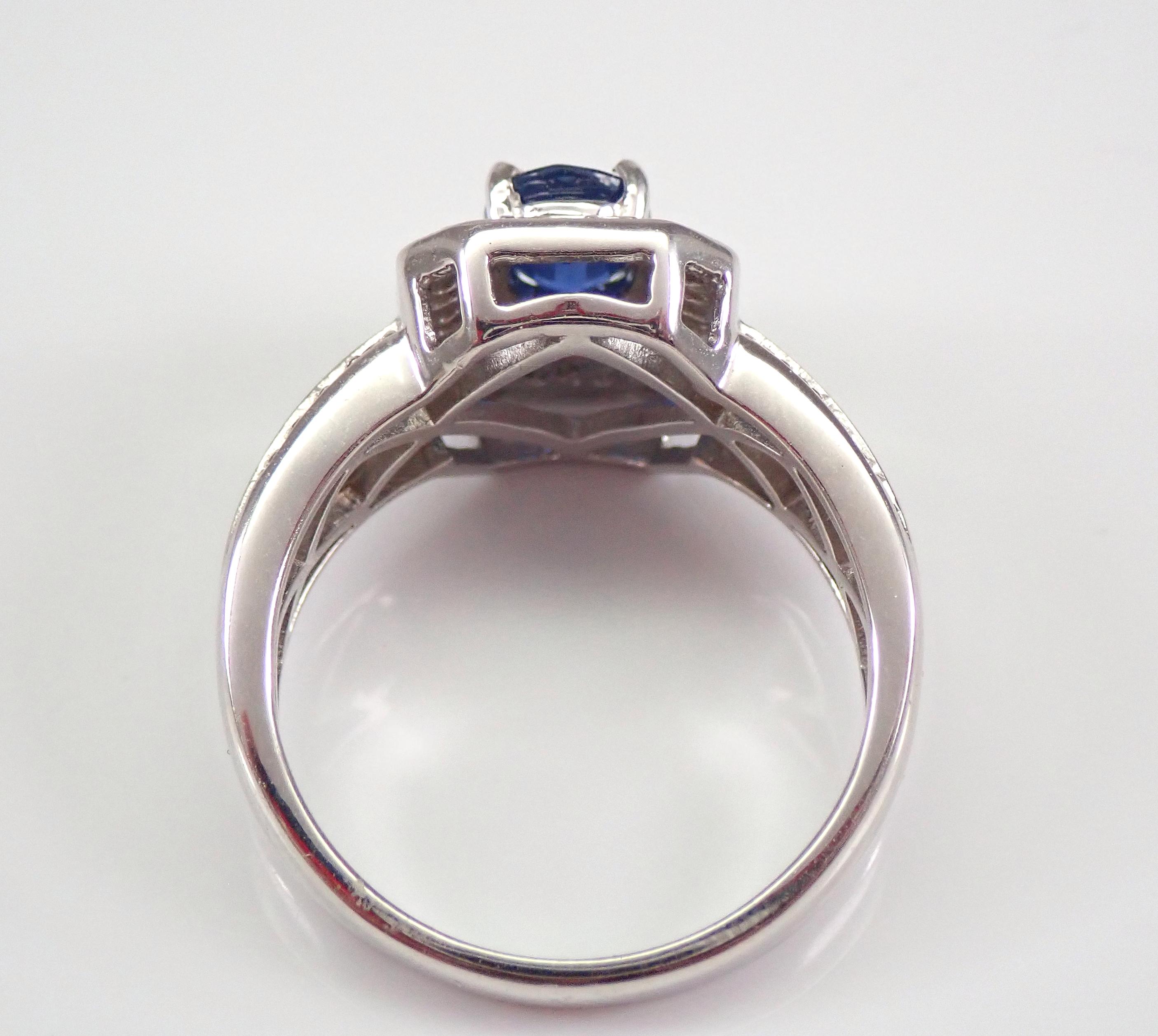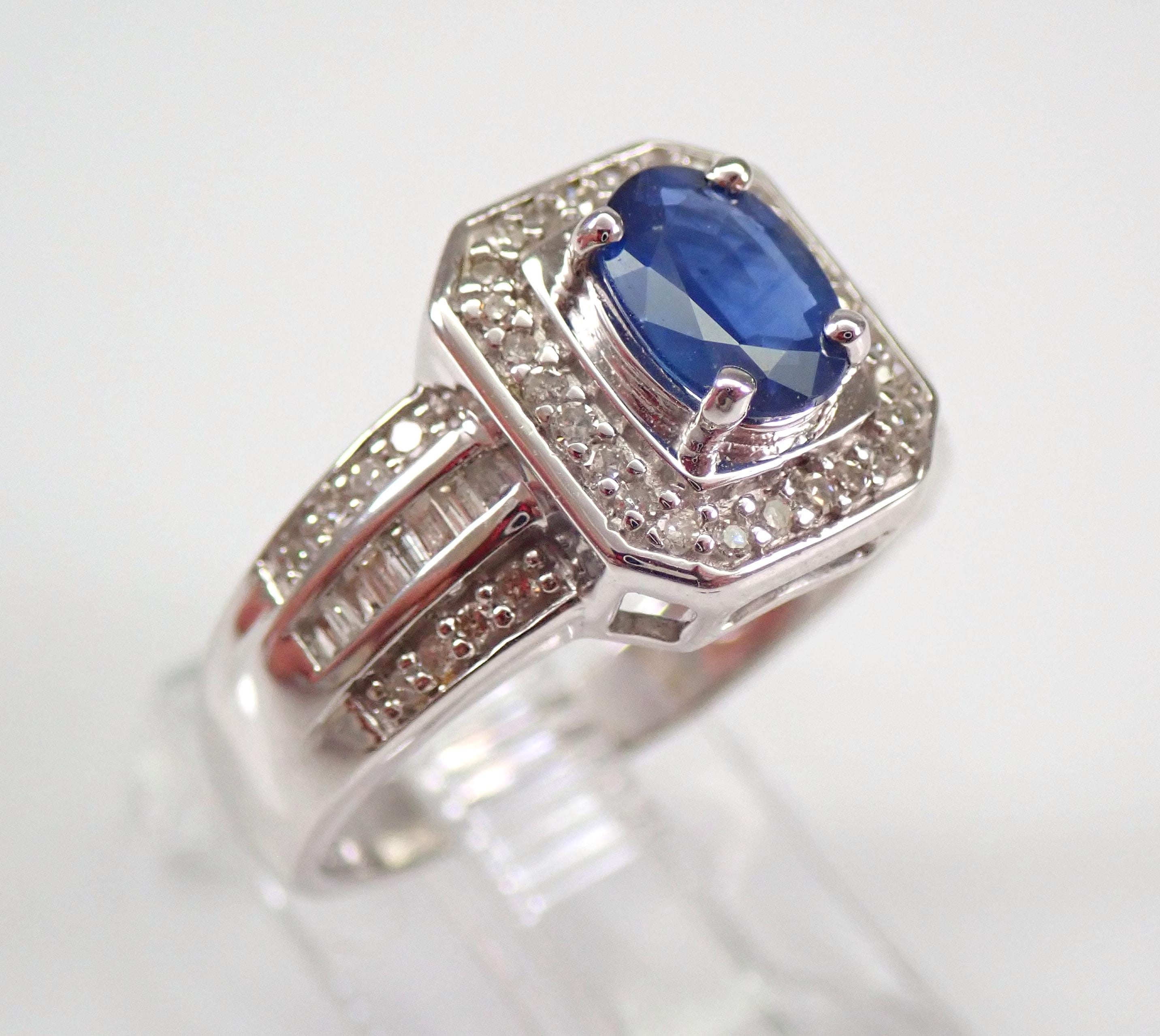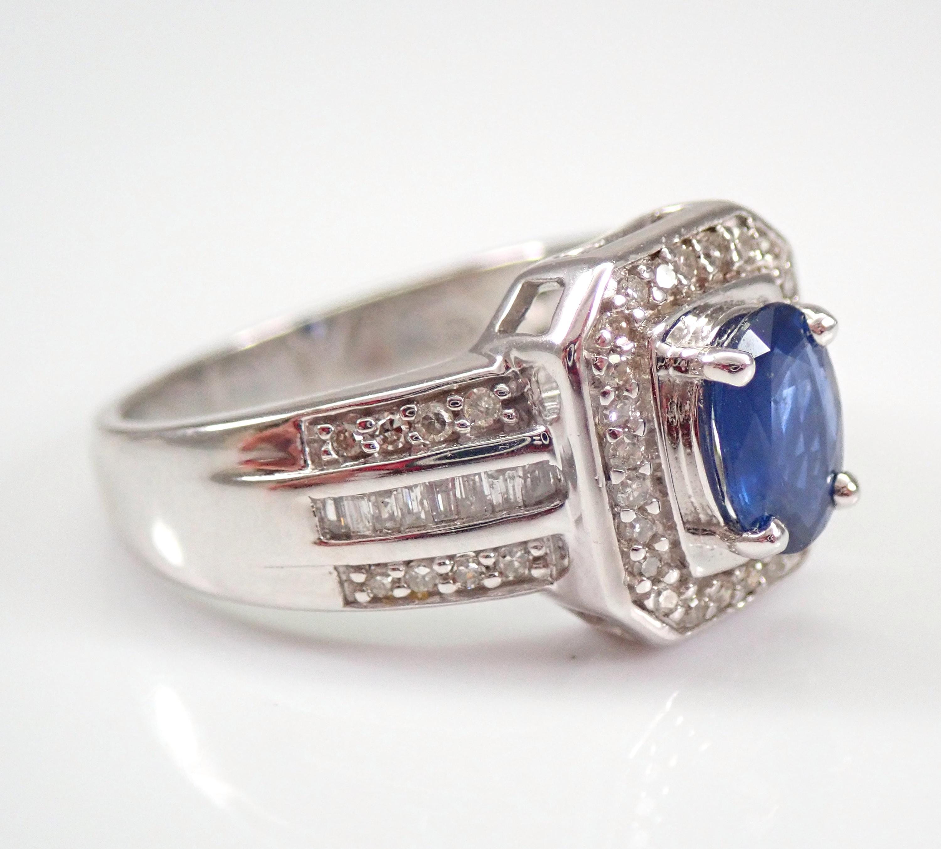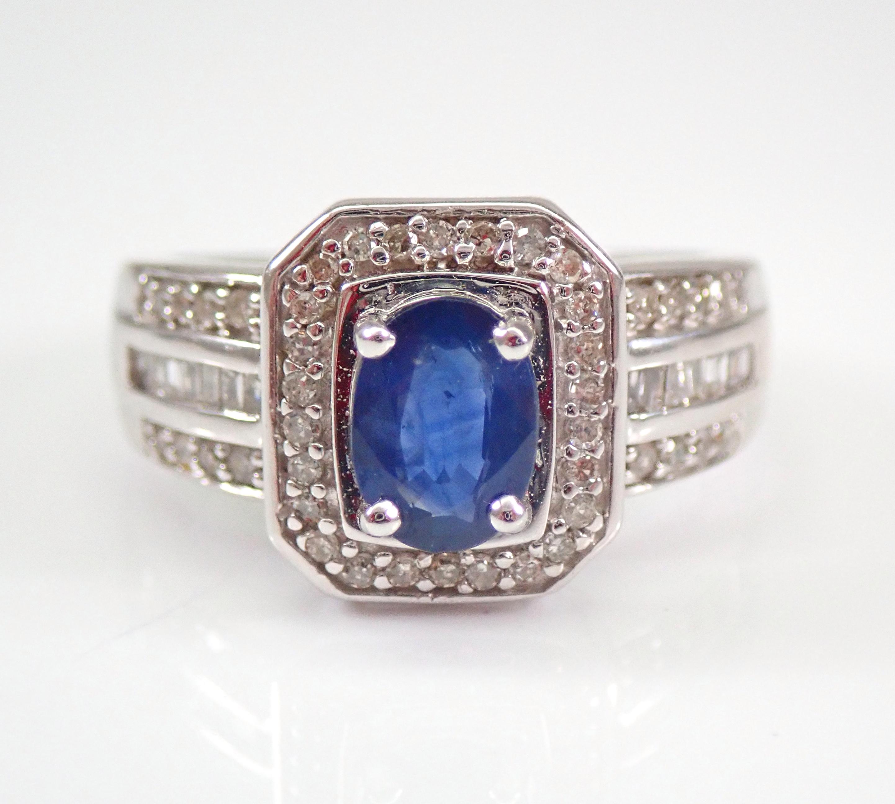 White Gold Diamond and Sapphire Halo Engagement Ring. This ring is set with one genuine Oval Sapphire in the center, sixteen baguette diamonds and forty-two natural Round Brilliant Diamonds. These diamonds are H color, SI/I clarity and weigh a total of 1/2 carats. The Sapphire is a beautiful dark blue color, measures 6.8 X 5 mm and weighs 1 carat. This ring is 10KT White Gold, weighs 5.1 grams and is a finger size 6, which is resizable free of charge (please inquire about sizing with the finger size you need). The ring will be accompanied by an appraisal by a GIA Certified Diamond Grader with the retail replacement value of $1,695.00. I will ship this ring promptly in a gift box.
