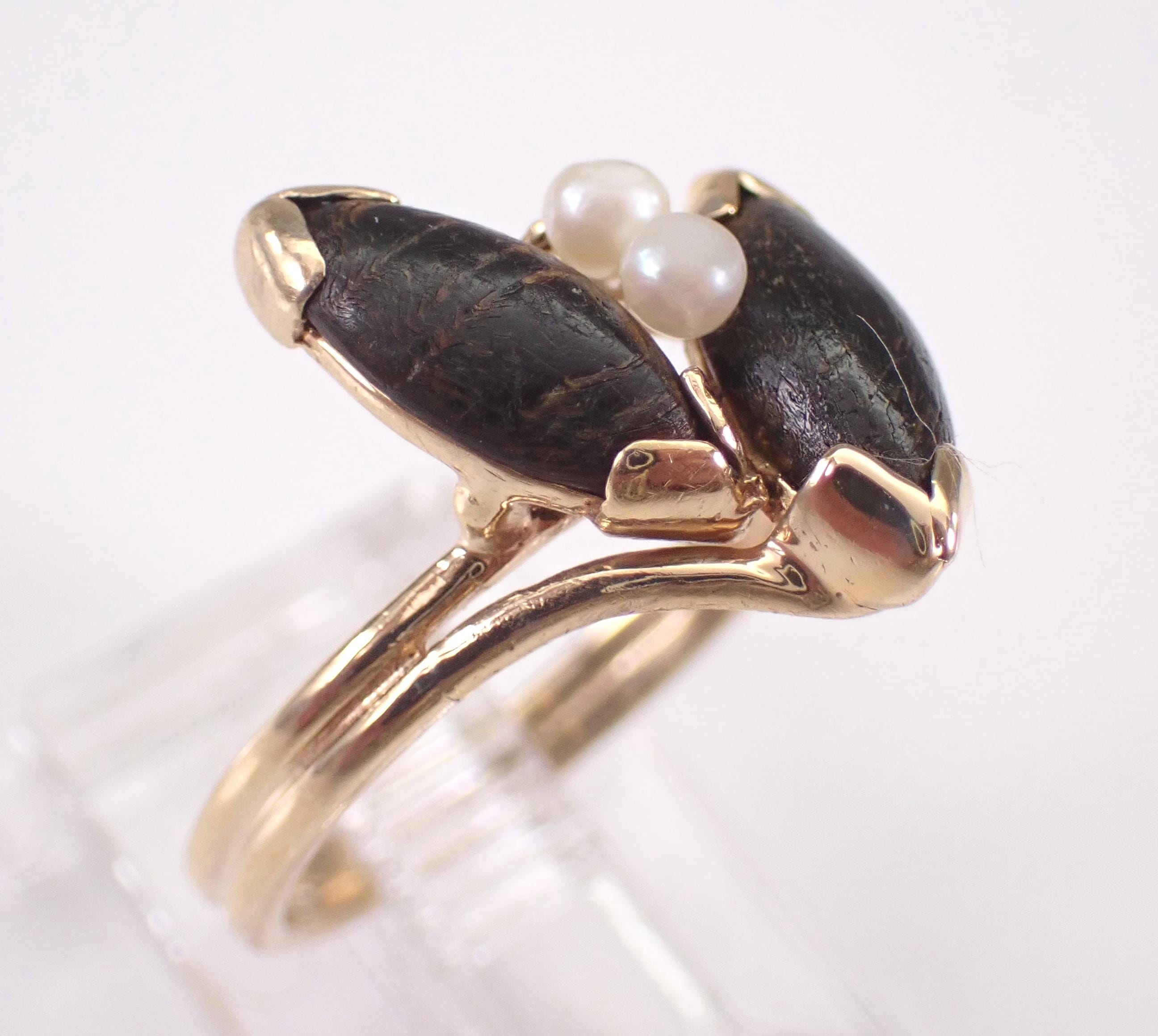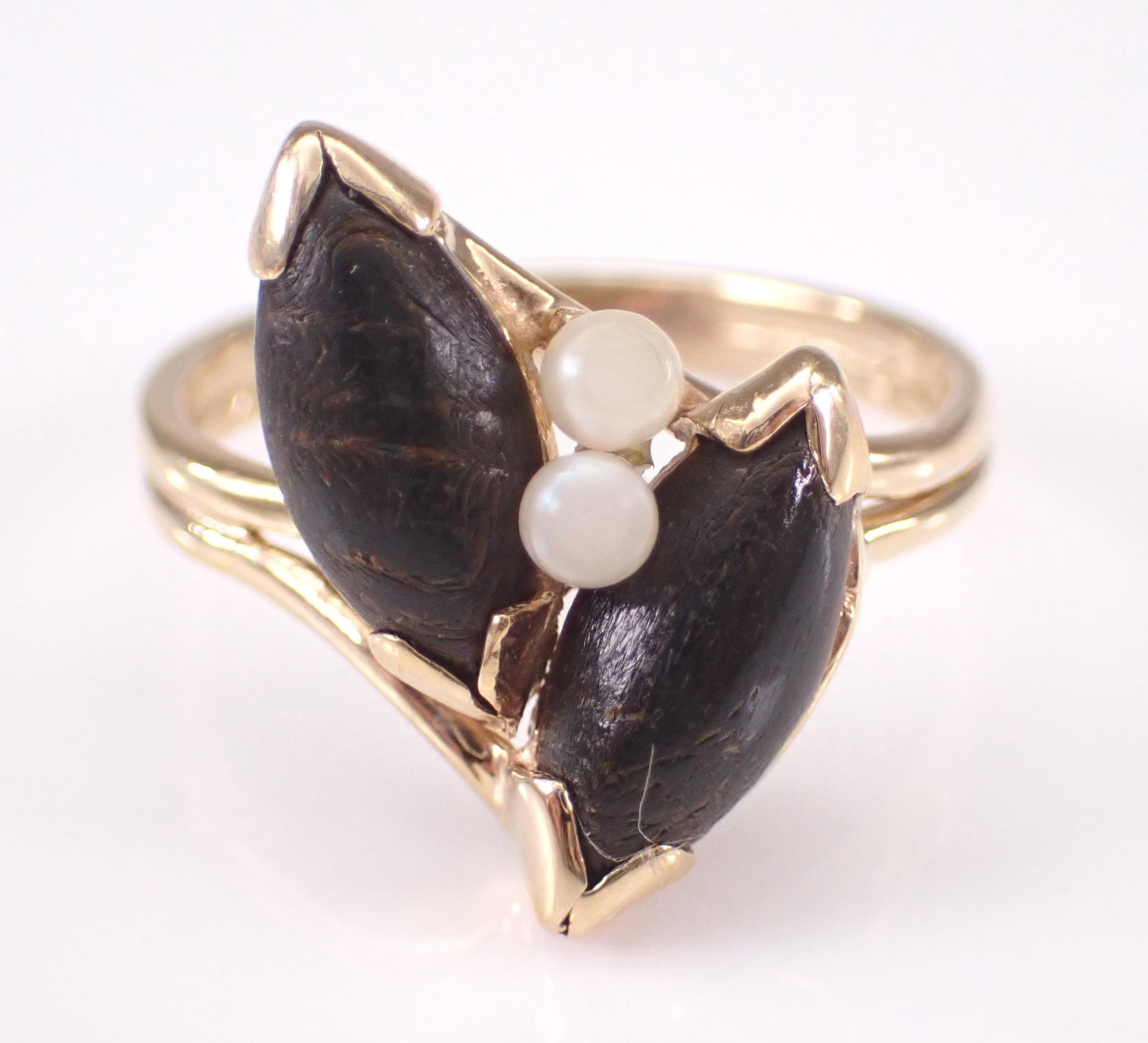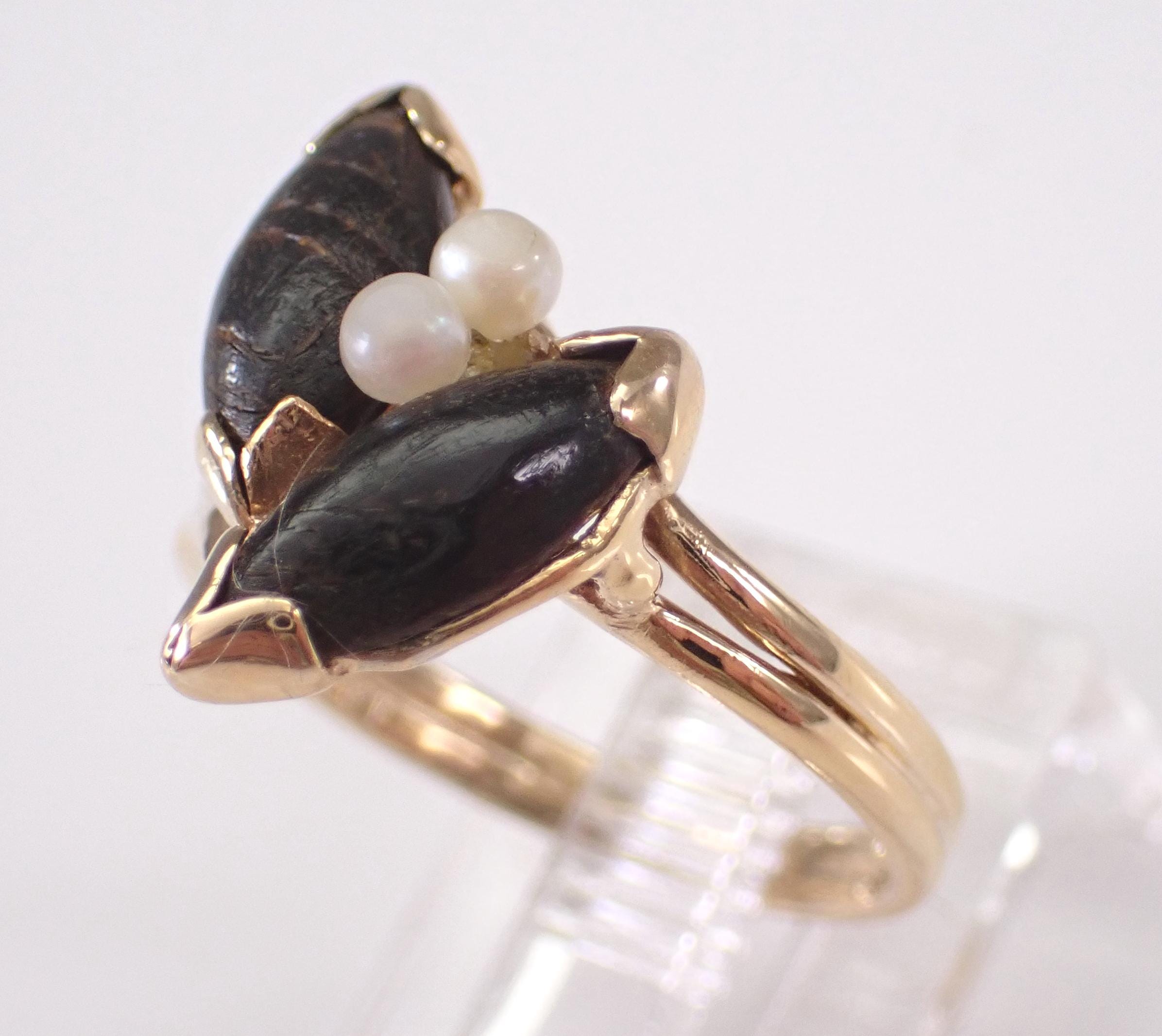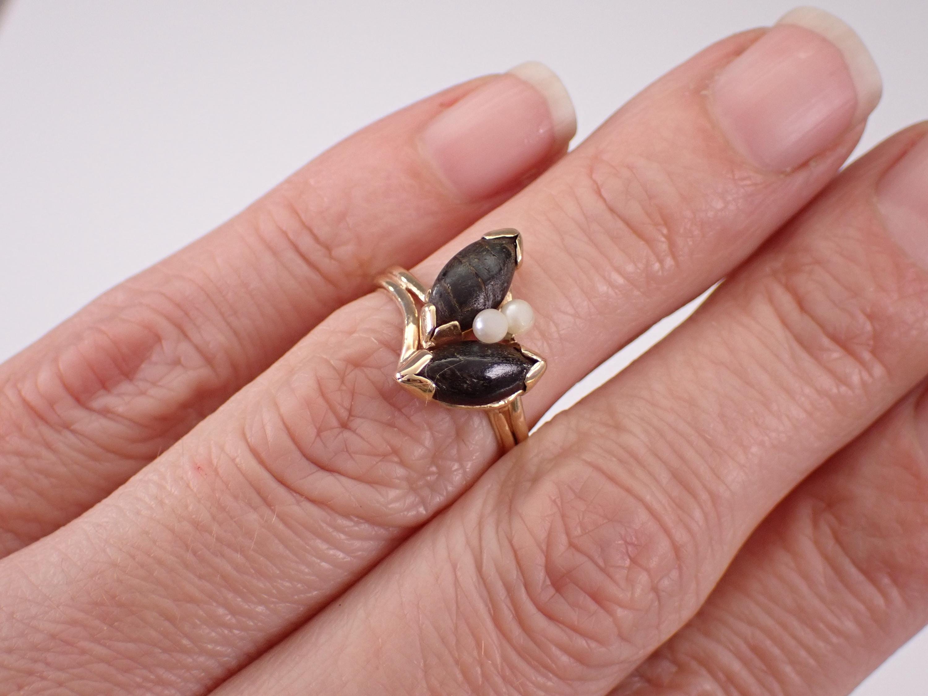 Vintage 14K Yellow Gold Jet and Pearl ring. This ring is set with two genuine Marquise Jet gemstones and two seed pearls. This ring is 14KT Yellow Gold, weighs 2.4 grams and is a finger size 4 3/4, can be resized (please inquire about sizing with the finger size you need). This ring dates back to Circa 1960's and the ring will be shipped promptly in a beautiful gift box.