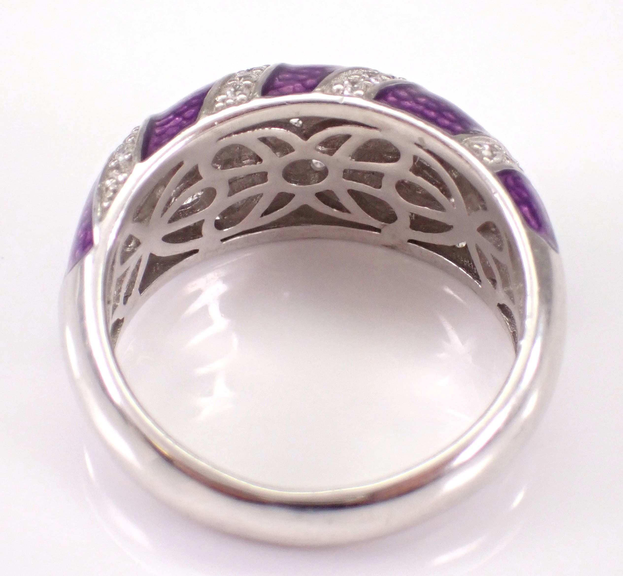 Vintage Sterling Silver Purple Enamel and Cubic Zirconia (CZ) ring. This ring is set with thirty-seven Round Cubic Zirconia. This ring is in very good, like new condition, is finger size 8 and weighs 6.2 grams. This ring measures 10 mm in width. This ring will be shipped promptly in a gift pouch.