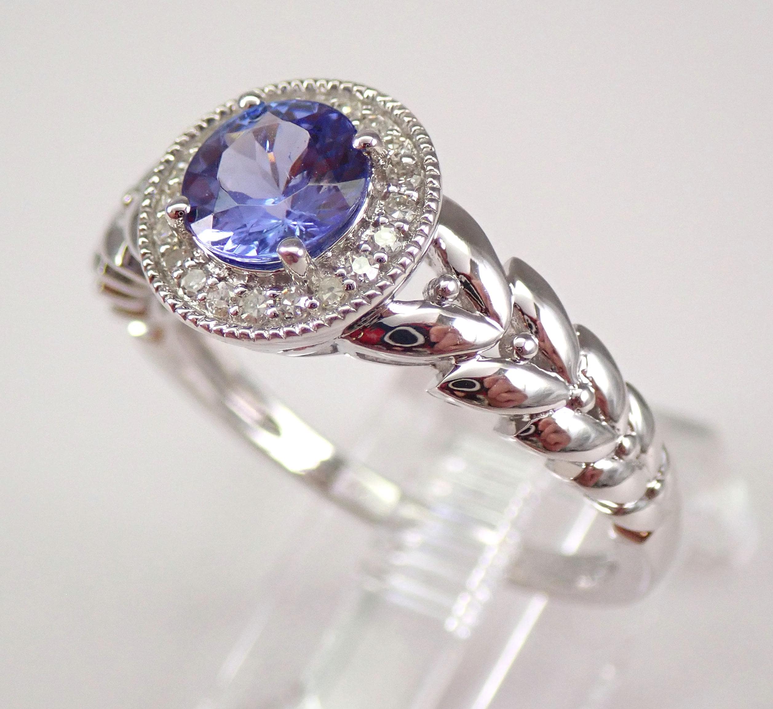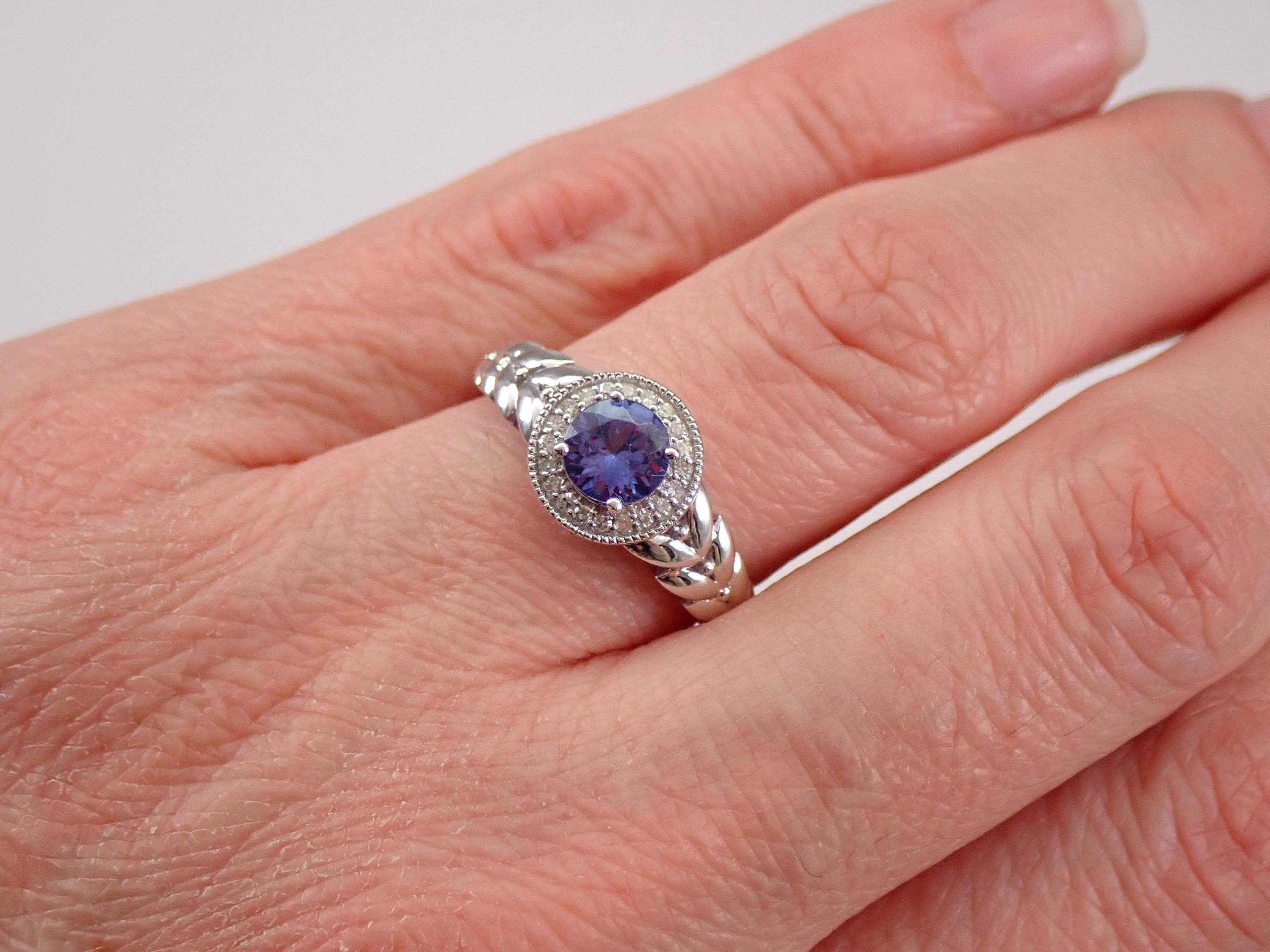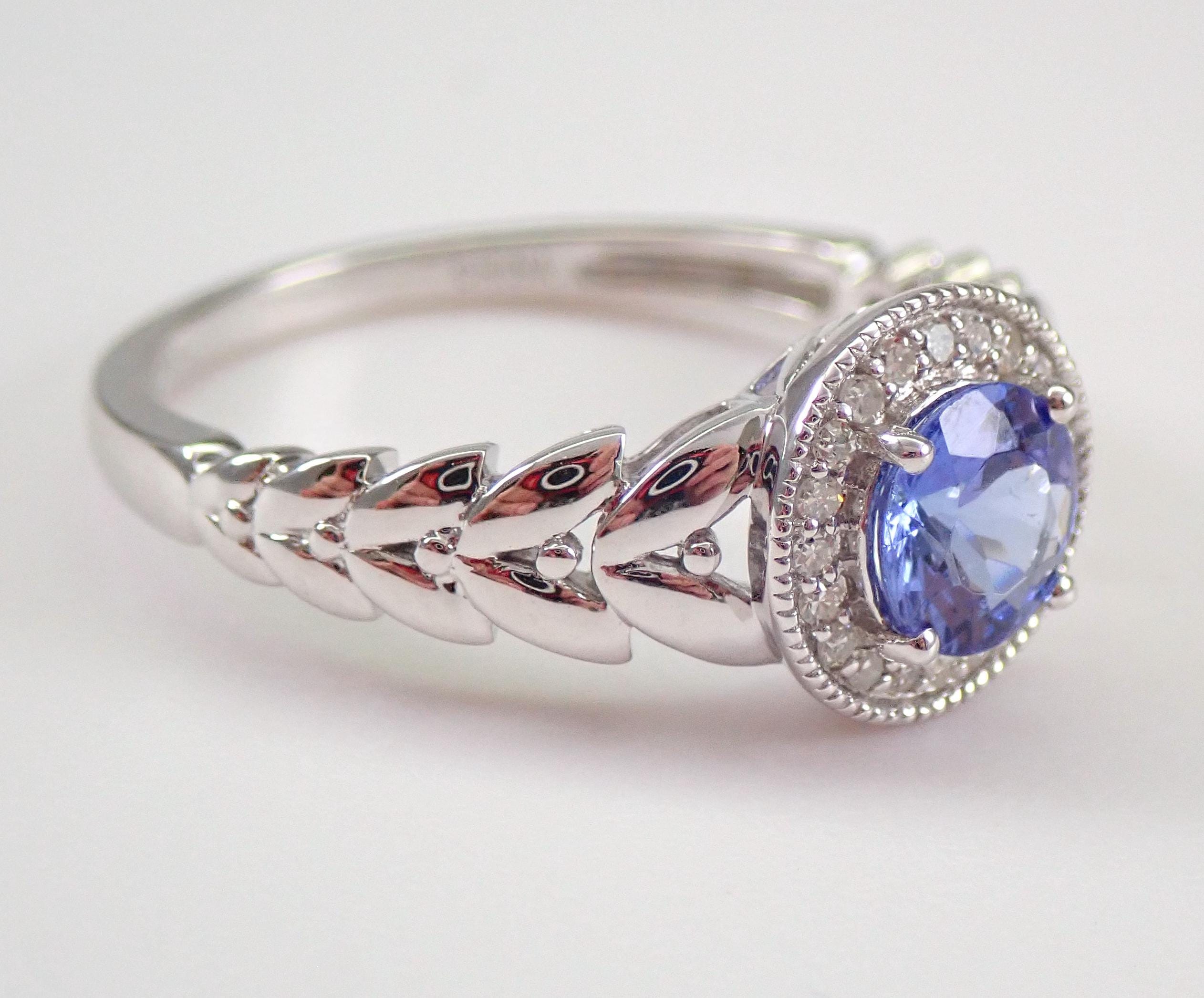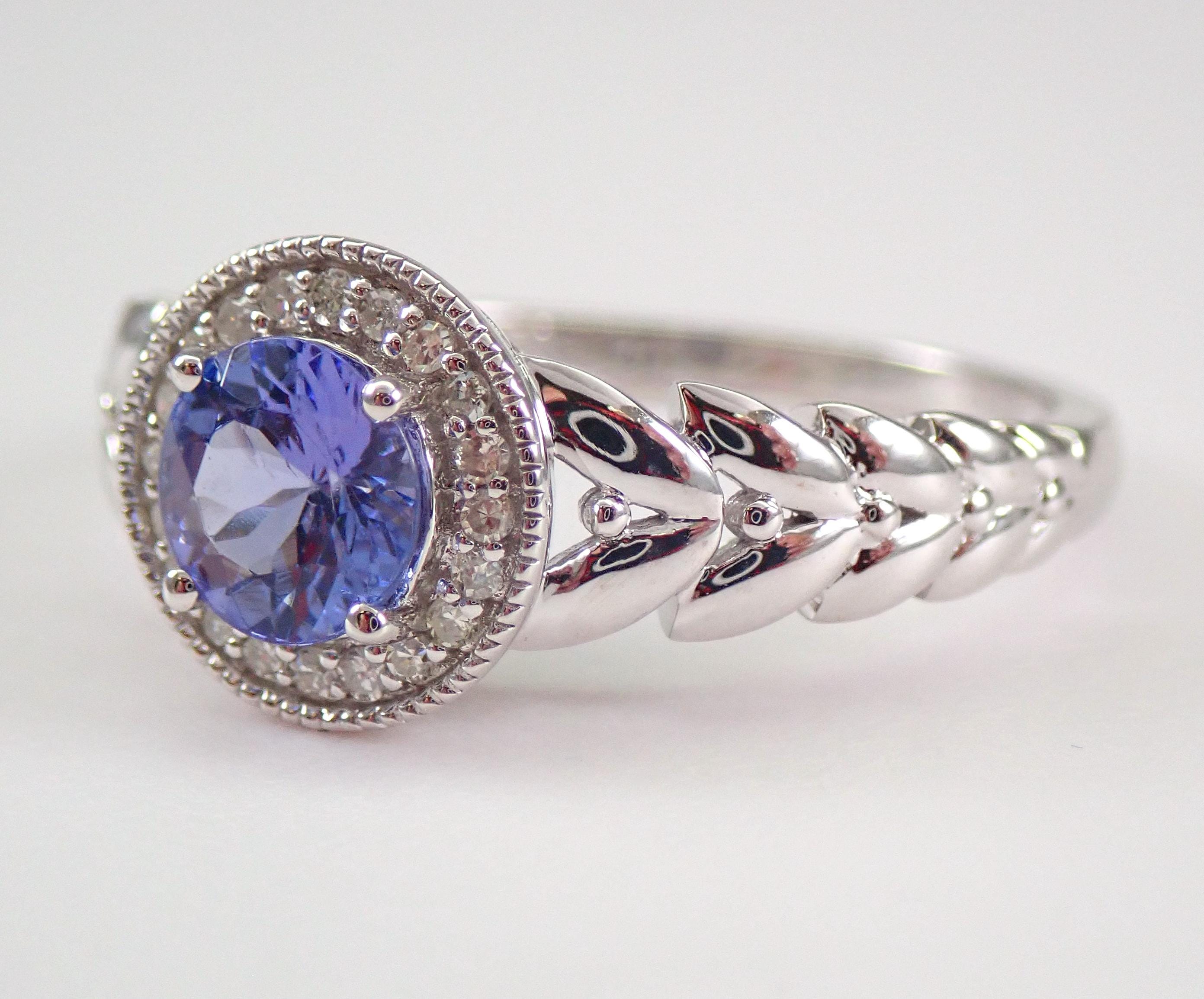 14K White Gold Diamond and Tanzanite Halo Engagement Ring. This ring is set with one genuine Round Tanzanite in the center. This Tanzanite measures 6 mm in diameter and weighs .70 carats. There are also twenty genuine Round Brilliant Diamonds set in this ring. These diamonds are H color, SI/I clarity and weigh a total of .10 carat. This ring is 14KT White Gold, weighs 3.4 grams and is a finger size 8, which can be resized free of charge (please inquire about sizing with the finger size you need). This ring will also be accompanied by an appraisal by a GIA Certified Diamond Grader with the replacement value of $1,495.00. I will ship this ring promptly in a beautiful gift box.
