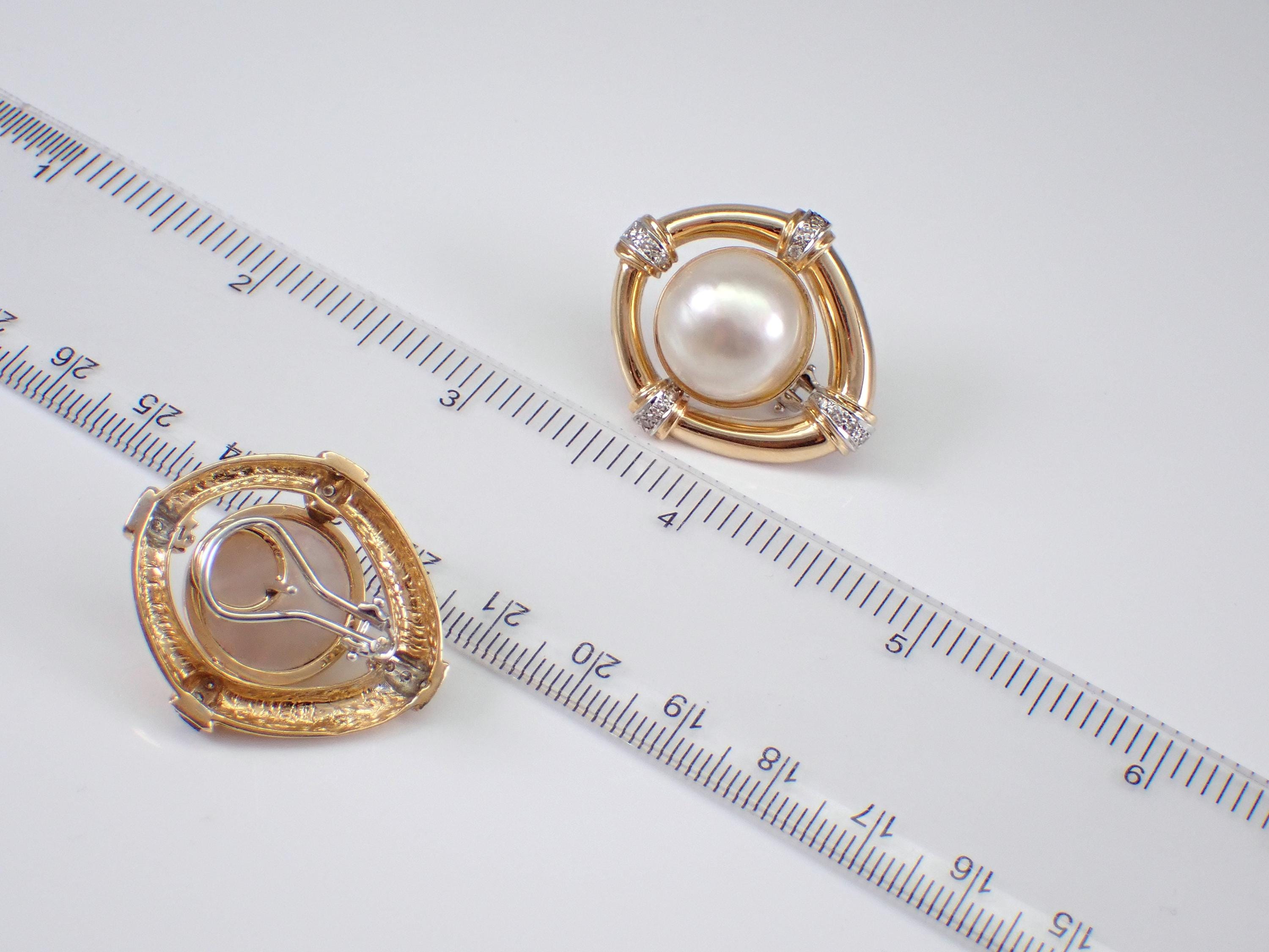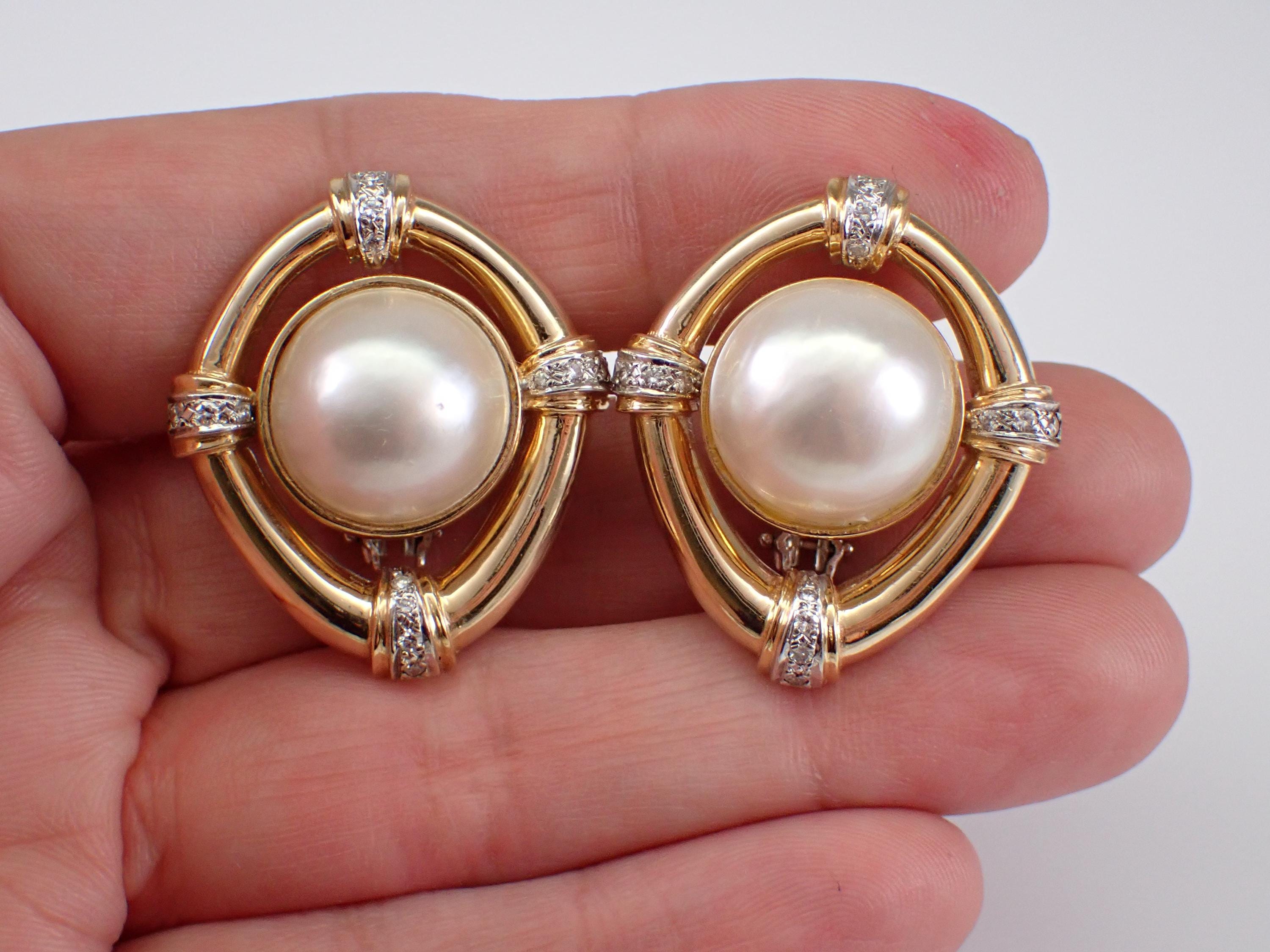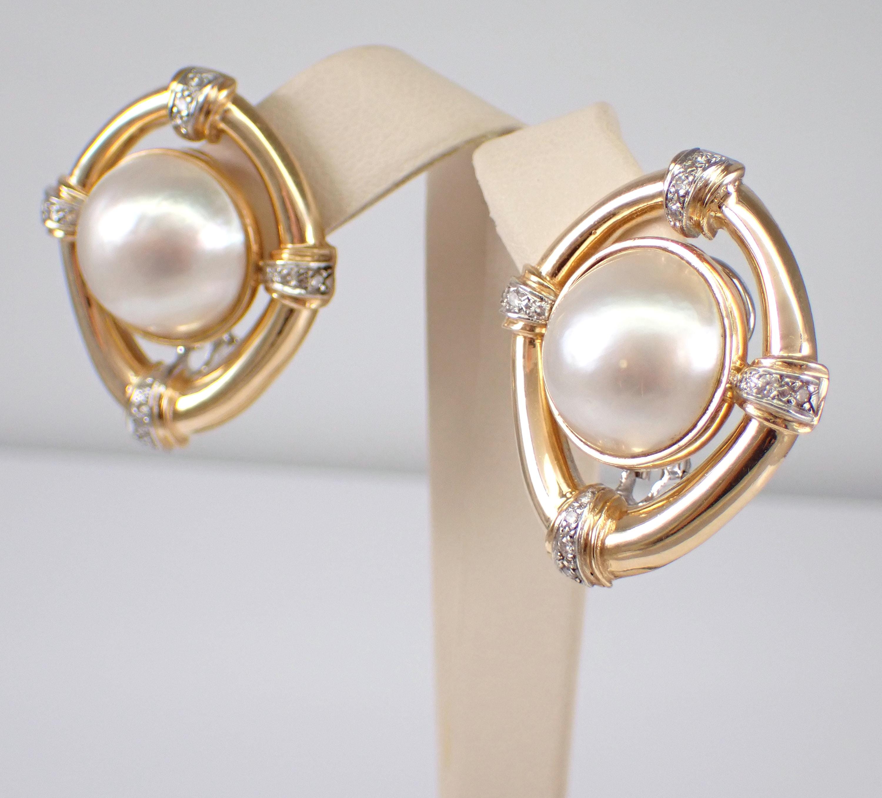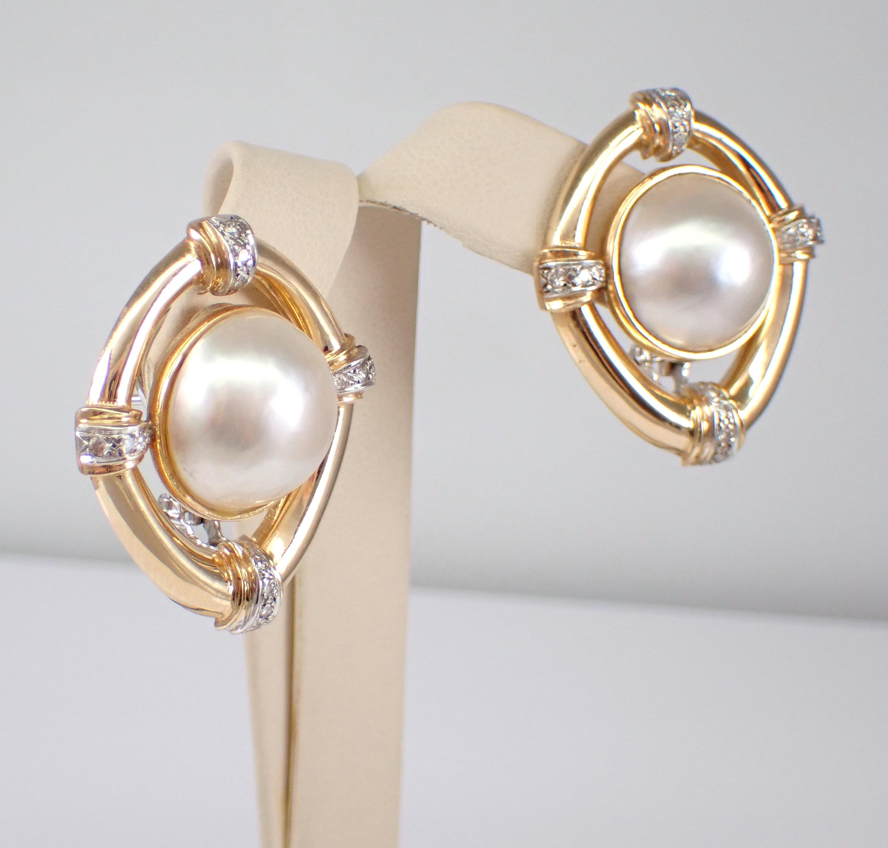 Vintage 14K Yellow Gold Mabe Pearl and Diamond Earrings. These earrings are set with two Round White Mabe Pearls that measure 14.5 mm in diameter each. There are also thirteen Round Brilliant Diamonds set in EACH Earring. These diamonds are H color, I1 clarity and weigh a total of 1/4 carat. These earrings are 14KT Yellow Gold and weigh a total of 16.8 grams. These earrings are for pierced ears, measure 31.5 X 27.5 mm each and the earrings have secure Omega Clasp closures. These earrings will be accompanied by an appraisal written by a GIA Certified Diamond Grader with the retail replacement value of $5,495.00. I will ship these earrings promptly in a gift box.