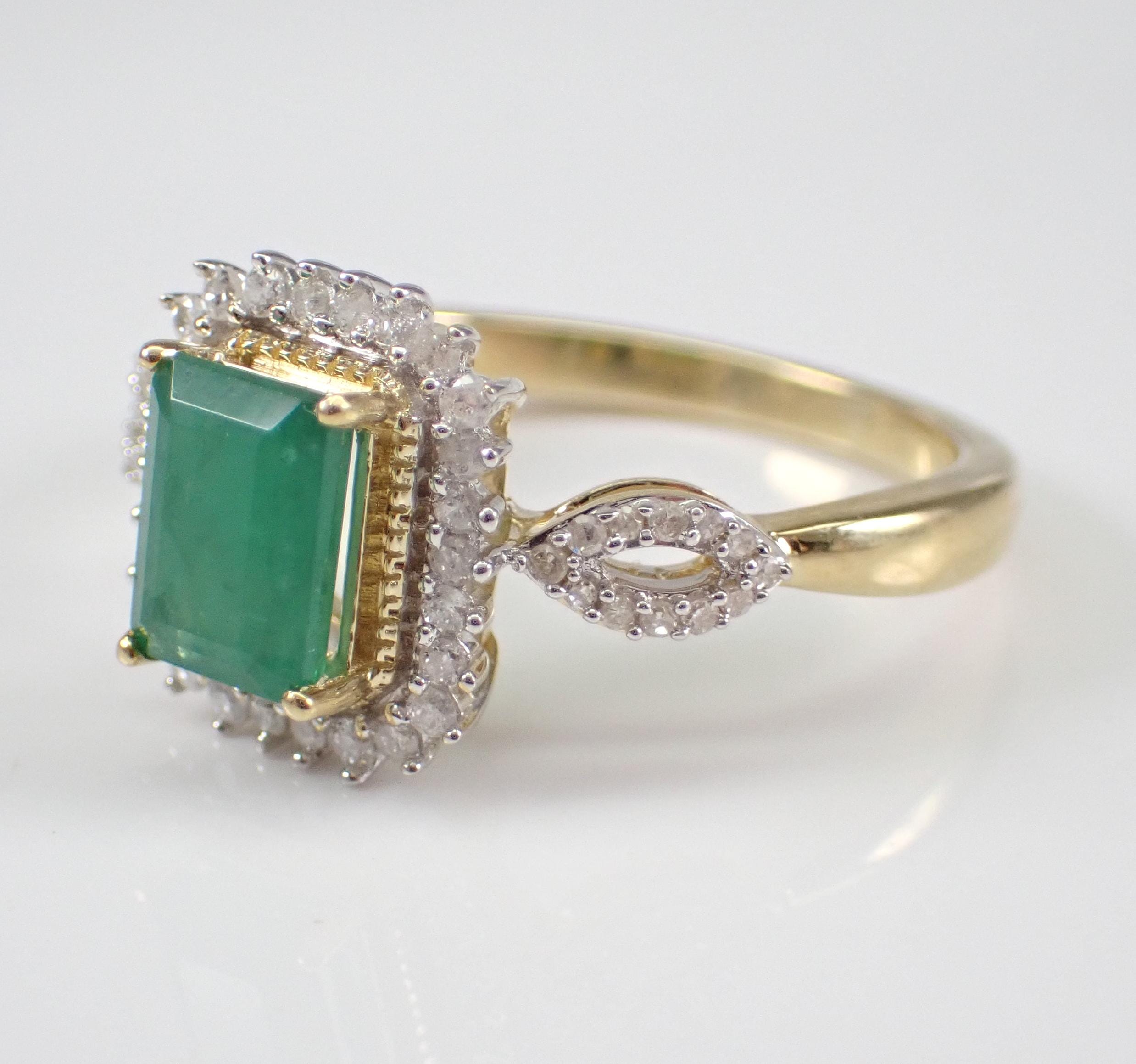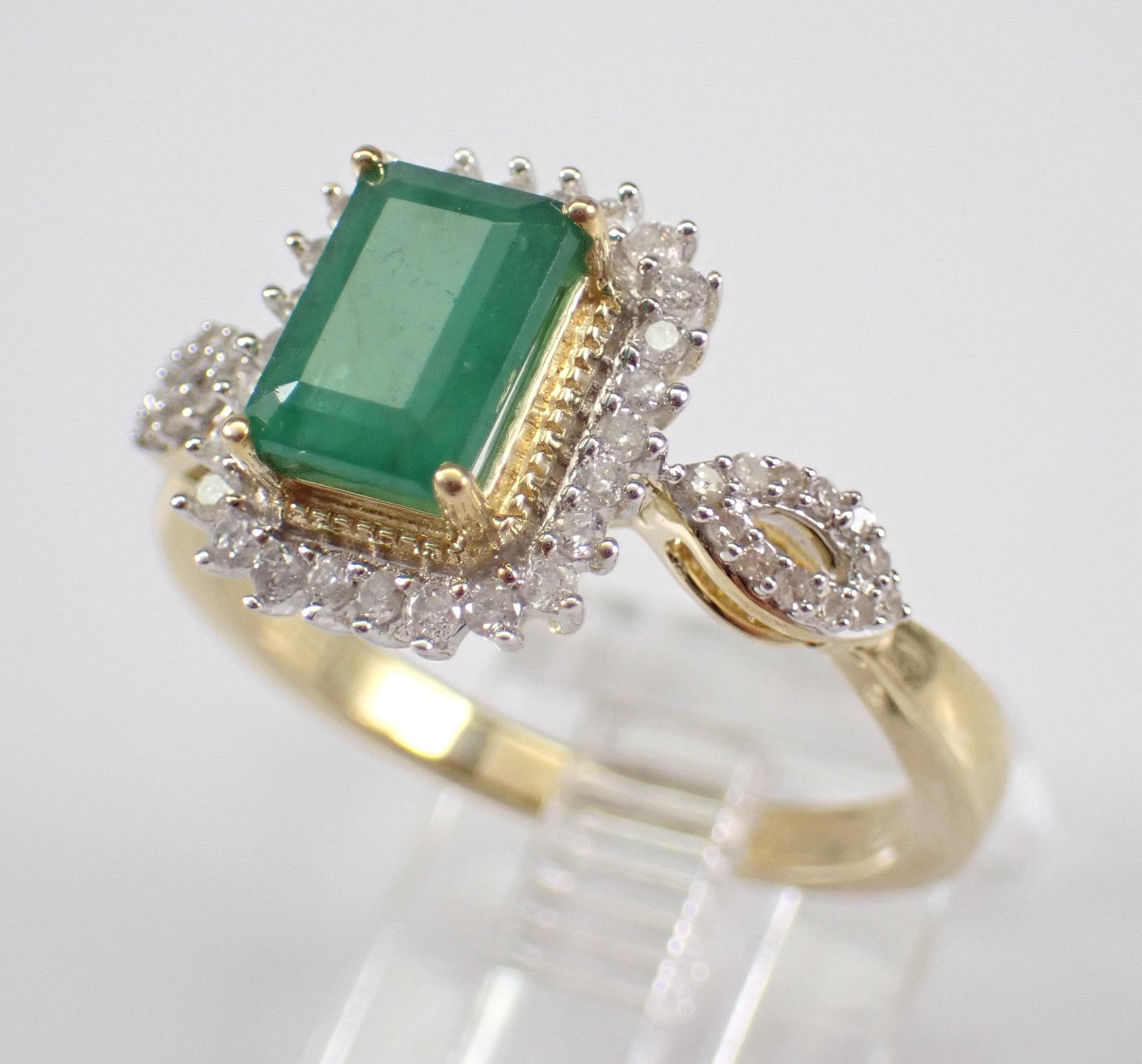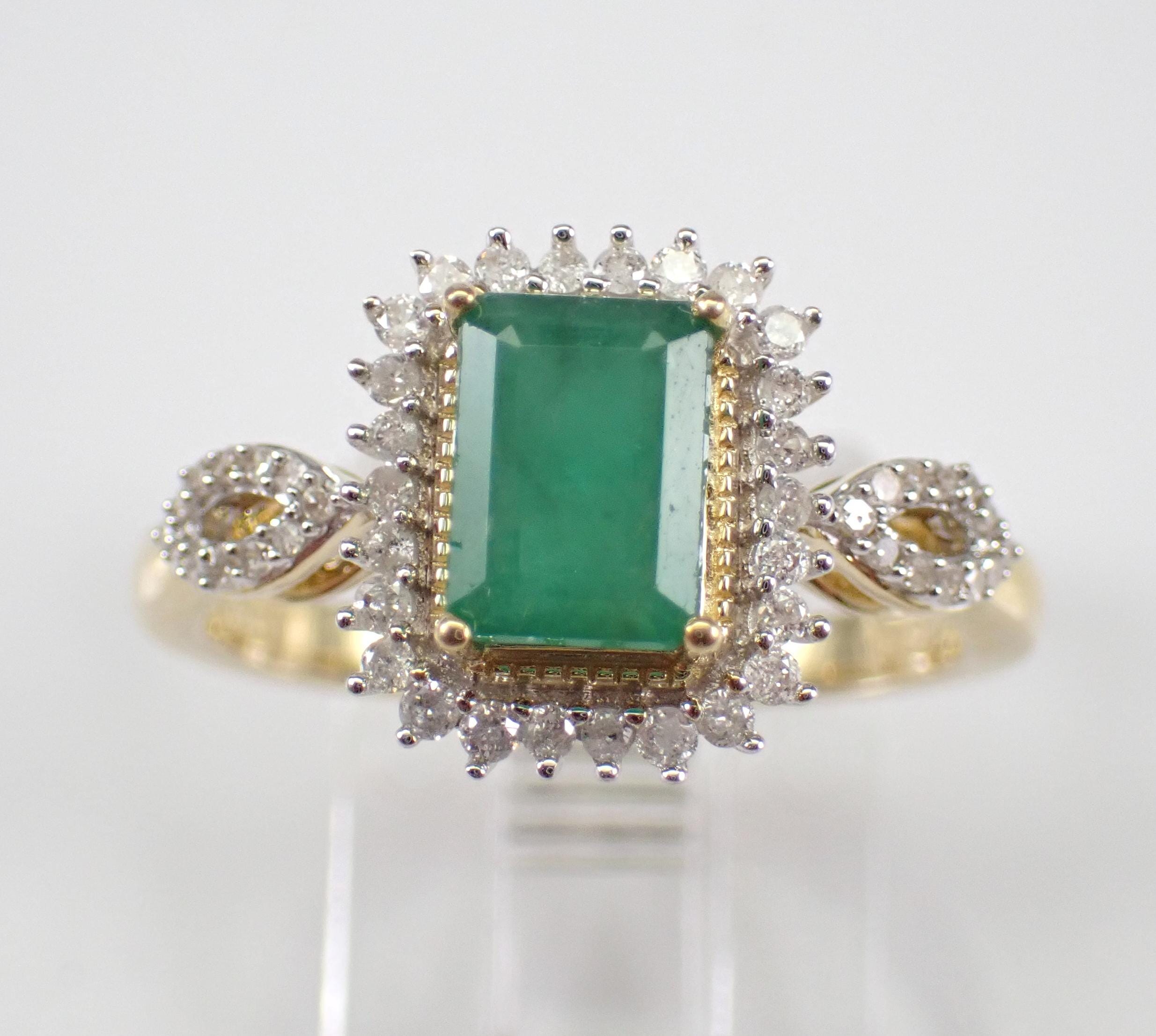 Yellow Gold Diamond and Emerald Halo Engagement Ring. This ring is set with one genuine Emerald-Cut Emerald in the center. This Emerald measures 7 X 5 mm and weighs 1 carats. There are fifty genuine Round Brilliant Diamonds set in this ring. These diamonds are H color, I1 clarity and weigh a total of .35 carats. This ring is 10KT Yellow Gold, weighs 3.3 grams and is a finger size 7, which can be resized (please inquire about sizing with the finger size you need). This ring will also be accompanied by an appraisal by a GIA Certified Diamond Grader with the replacement value of $1,495.00. I will ship this ring promptly in a beautiful gift box.