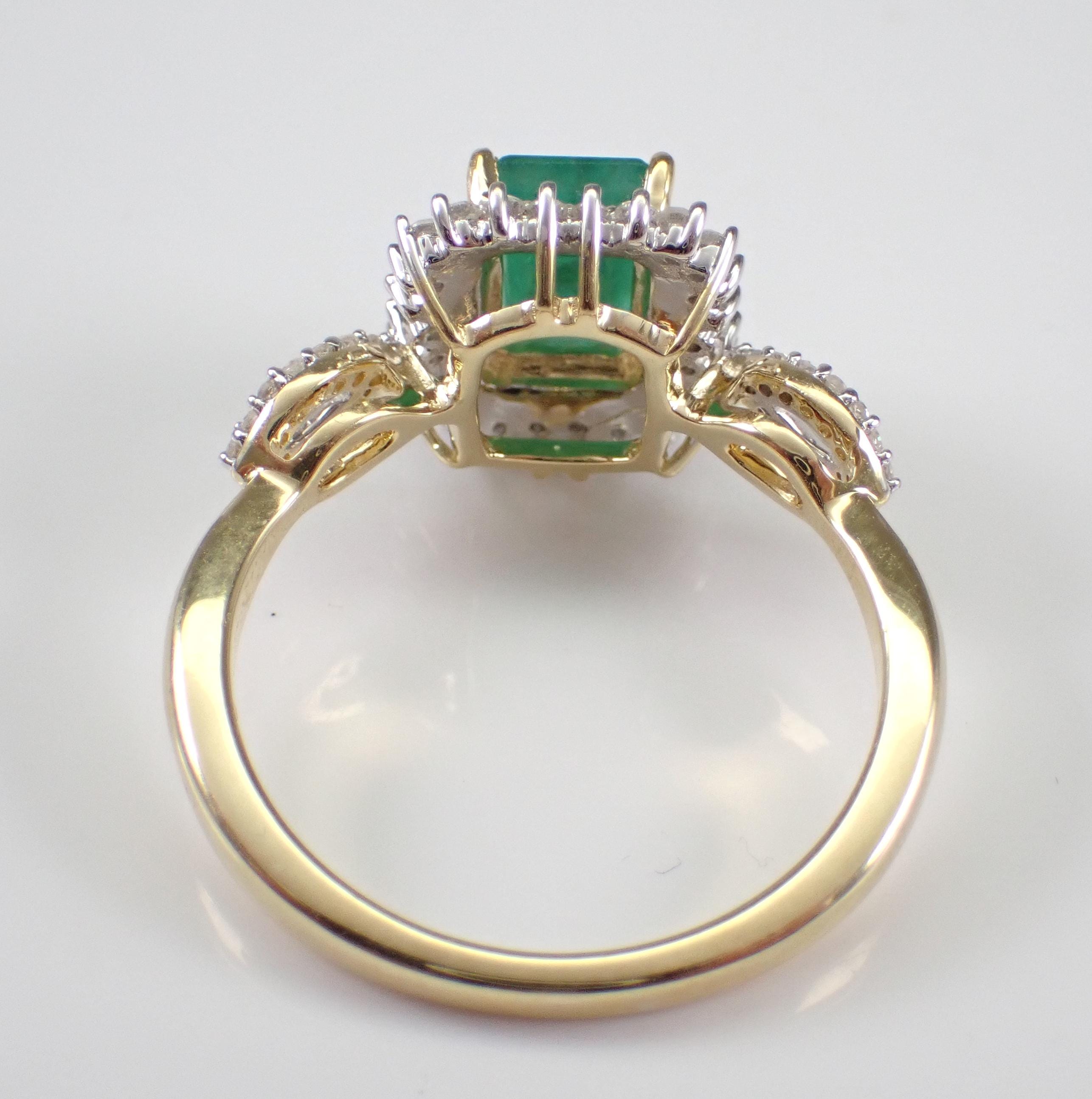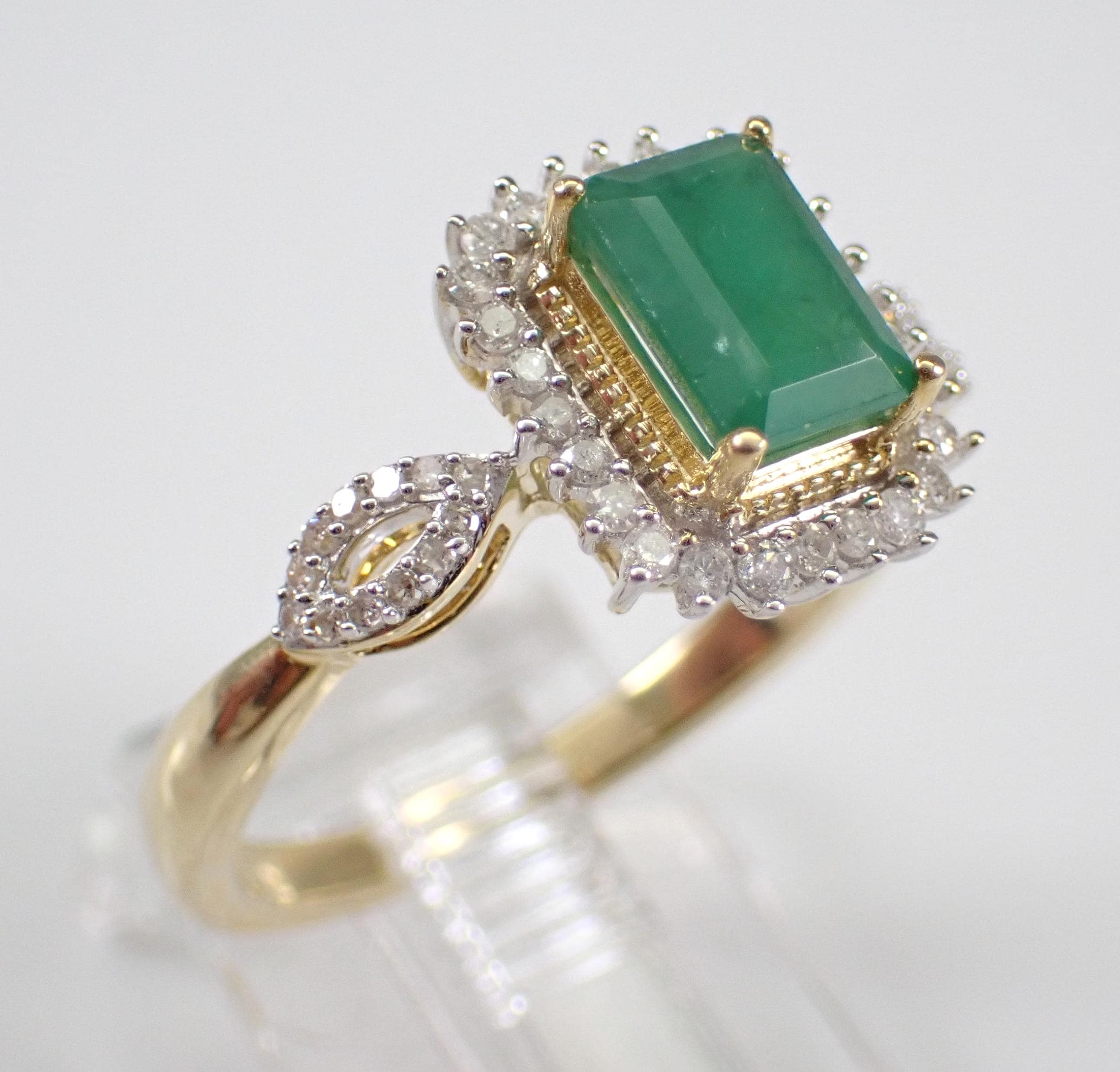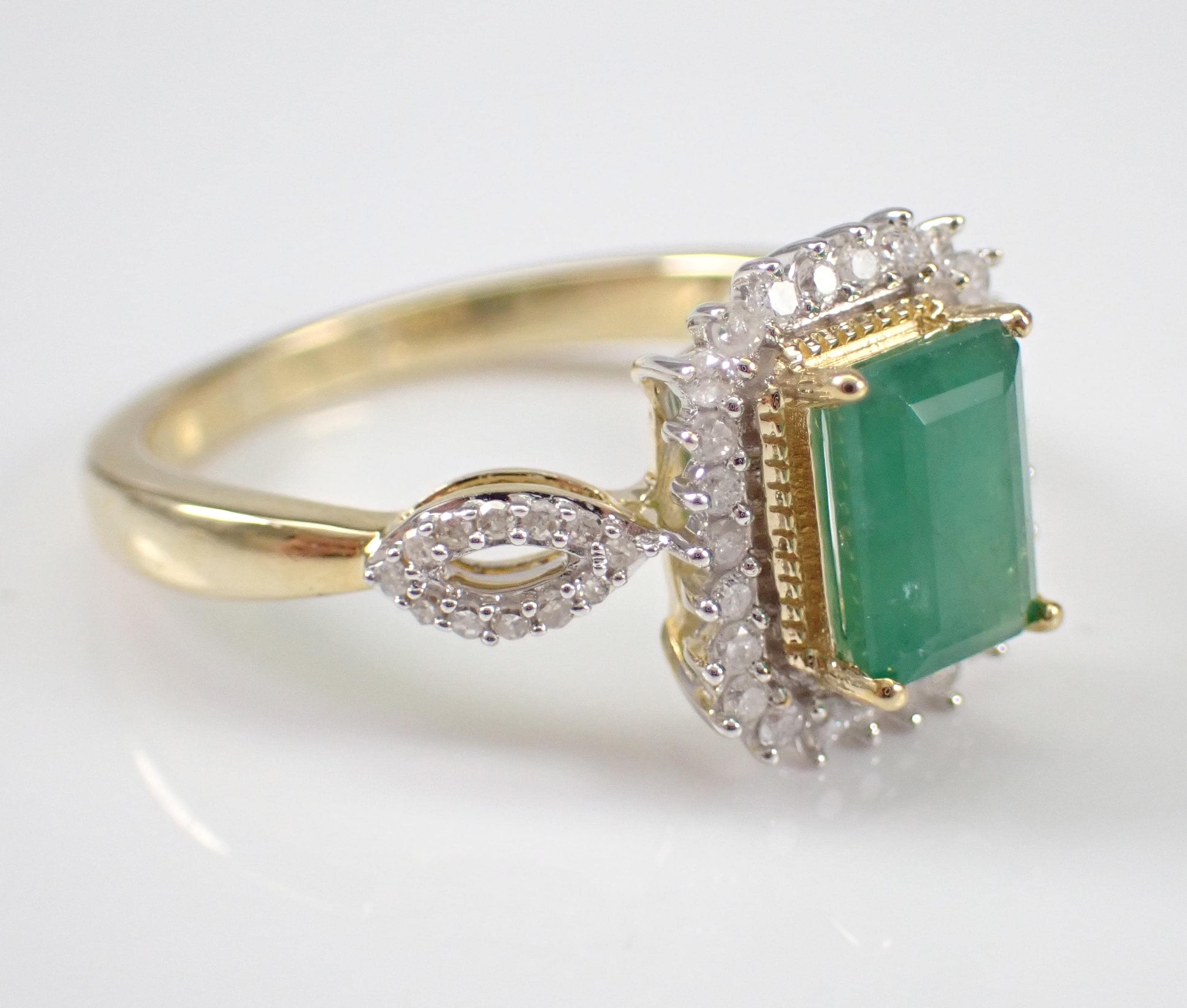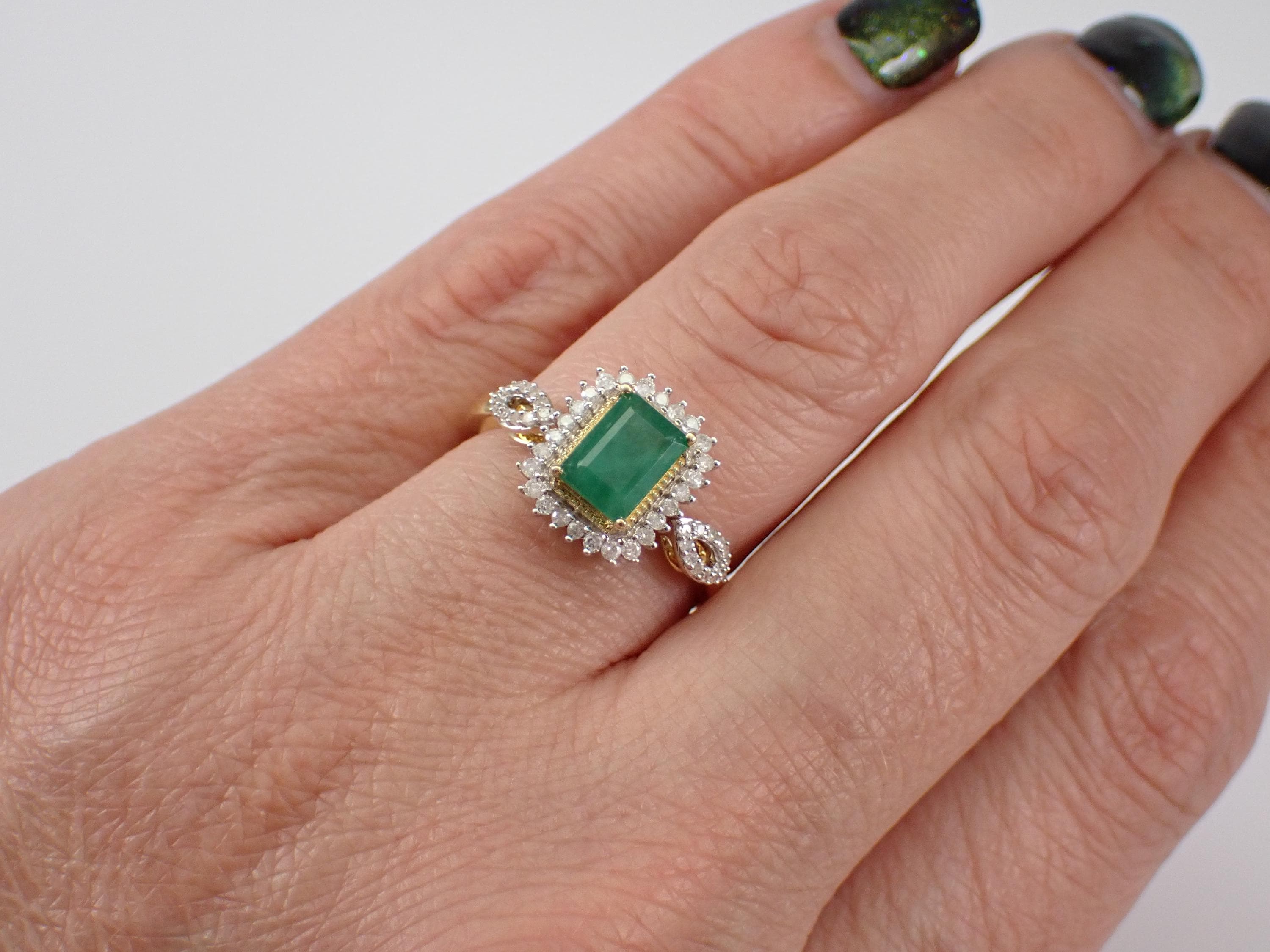 Yellow Gold Diamond and Emerald Halo Engagement Ring. This ring is set with one genuine Emerald-Cut Emerald in the center. This Emerald measures 7 X 5 mm and weighs 1 carats. There are fifty genuine Round Brilliant Diamonds set in this ring. These diamonds are H color, I1 clarity and weigh a total of .35 carats. This ring is 10KT Yellow Gold, weighs 3.3 grams and is a finger size 7, which can be resized (please inquire about sizing with the finger size you need). This ring will also be accompanied by an appraisal by a GIA Certified Diamond Grader with the replacement value of $1,495.00. I will ship this ring promptly in a beautiful gift box.