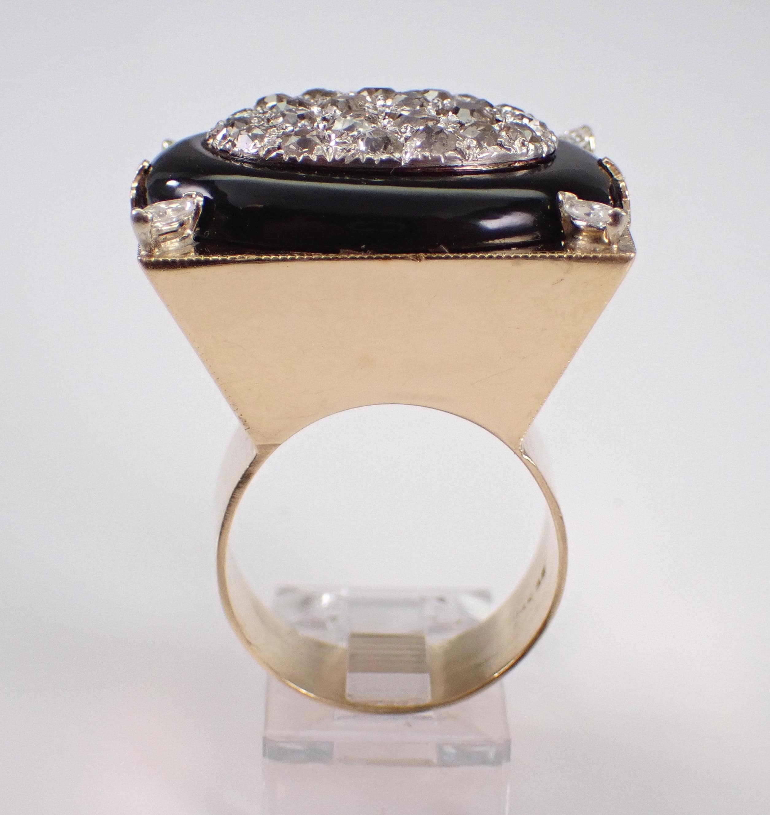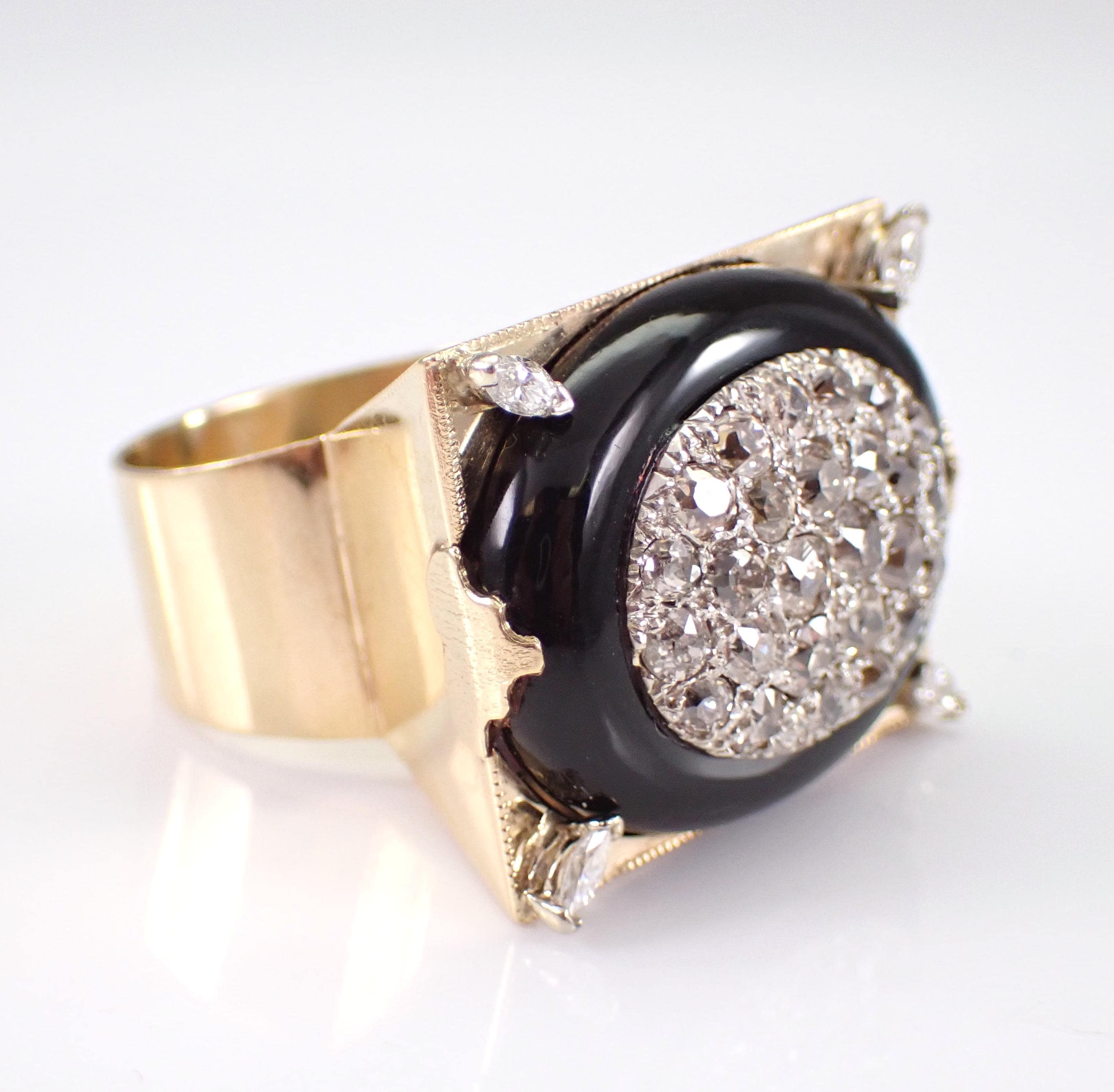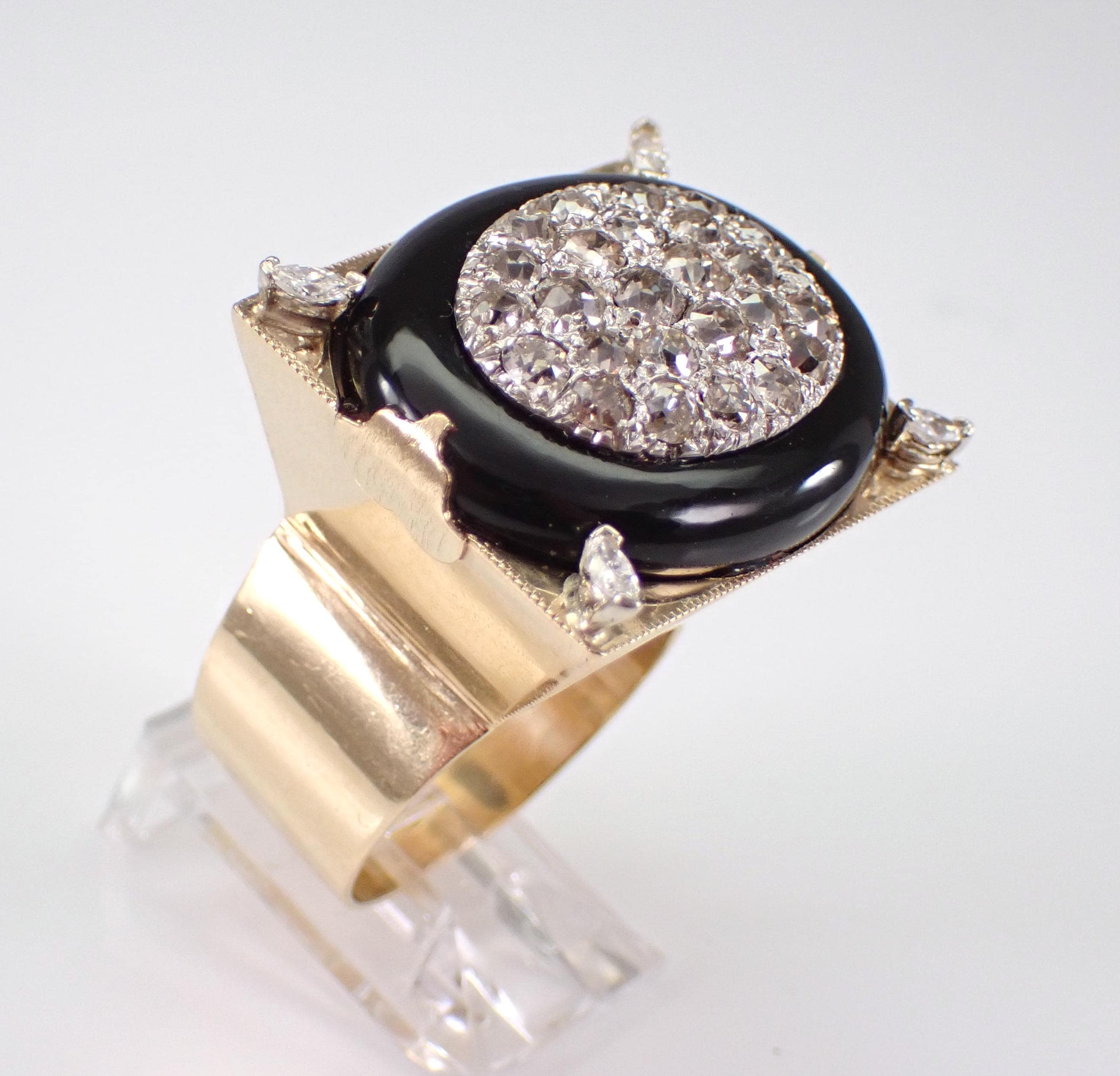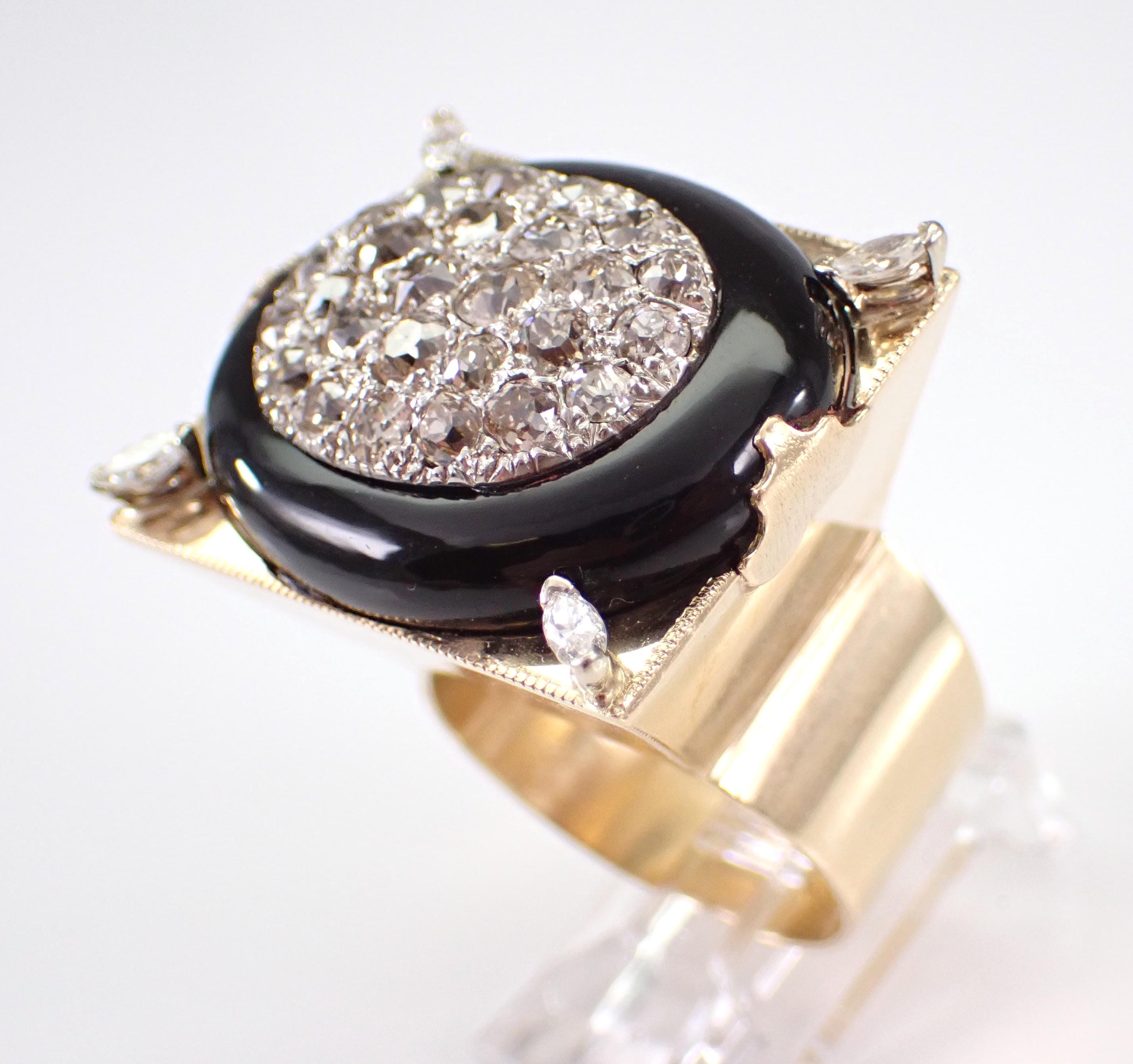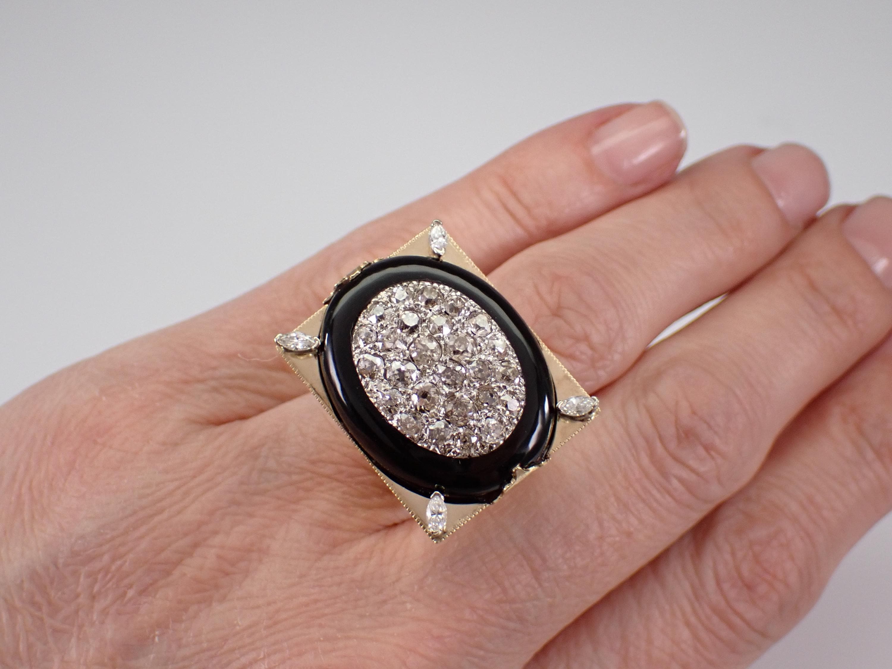 14K Yellow Gold onyx and diamond ring. This vintage ring is set with four genuine Marquise Diamonds, twenty-six Round Old Miner Diamonds and an Oval Black Onyx. This Black onyx measures 25.5 X 20.5 mm. The diamonds in this ring are I/J color, SI/I1 clarity and weigh a total of 3 carats. This ring is 14KT Yellow Gold, weighs 11.3 grams and is a finger size 7 3/4, which can be resized (please inquire about sizing with the finger size you need). The top of this ring measures 27 X 21 mm and the ring sits up 16 mm off the finger. This ring dates back to Circa 1970's and will be accompanied by an appraisal written by a GIA Certified Diamond Grader with the retail replacement value of $8,695.00. I will ship this ring promptly in a beautiful gift box.