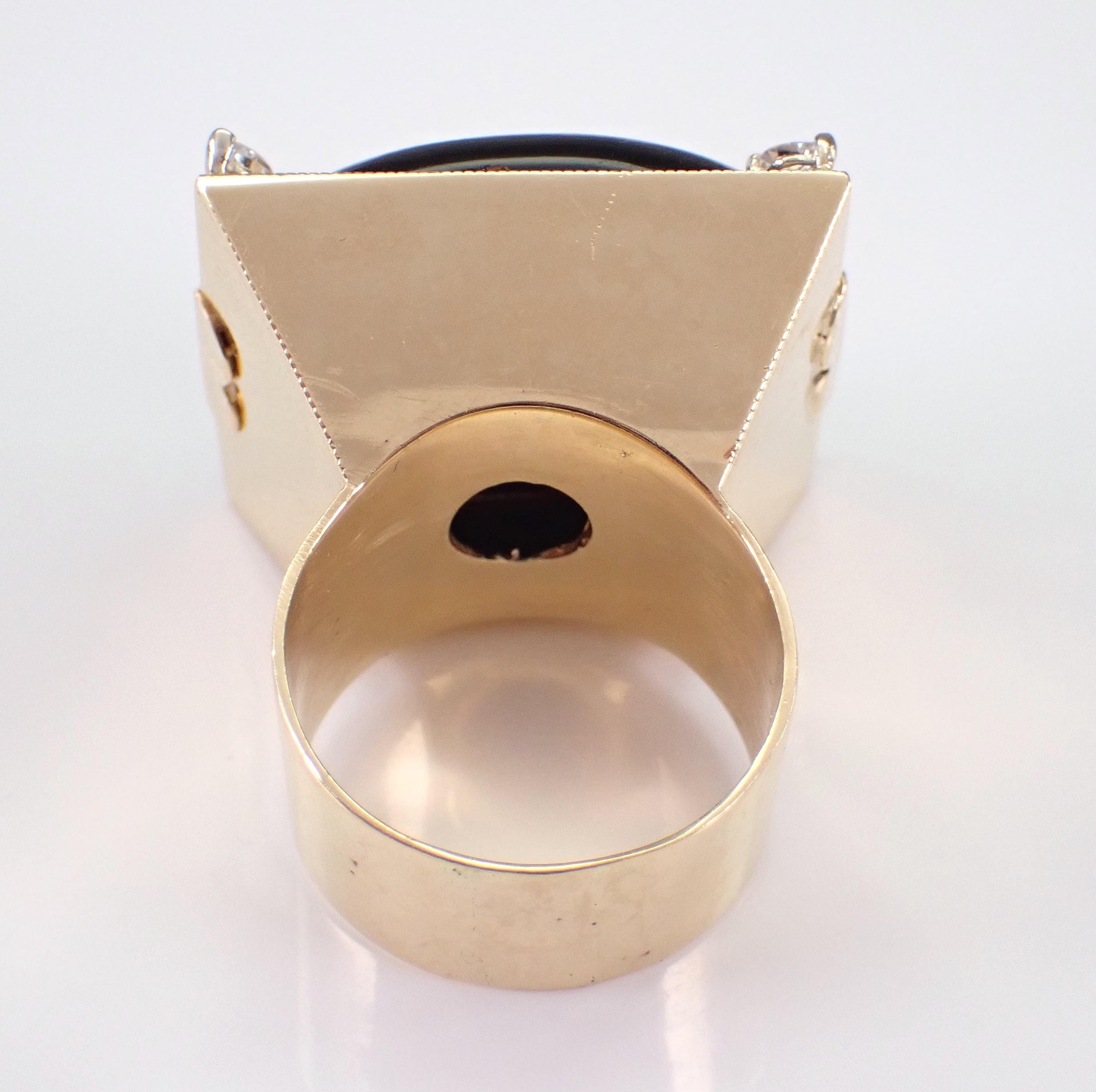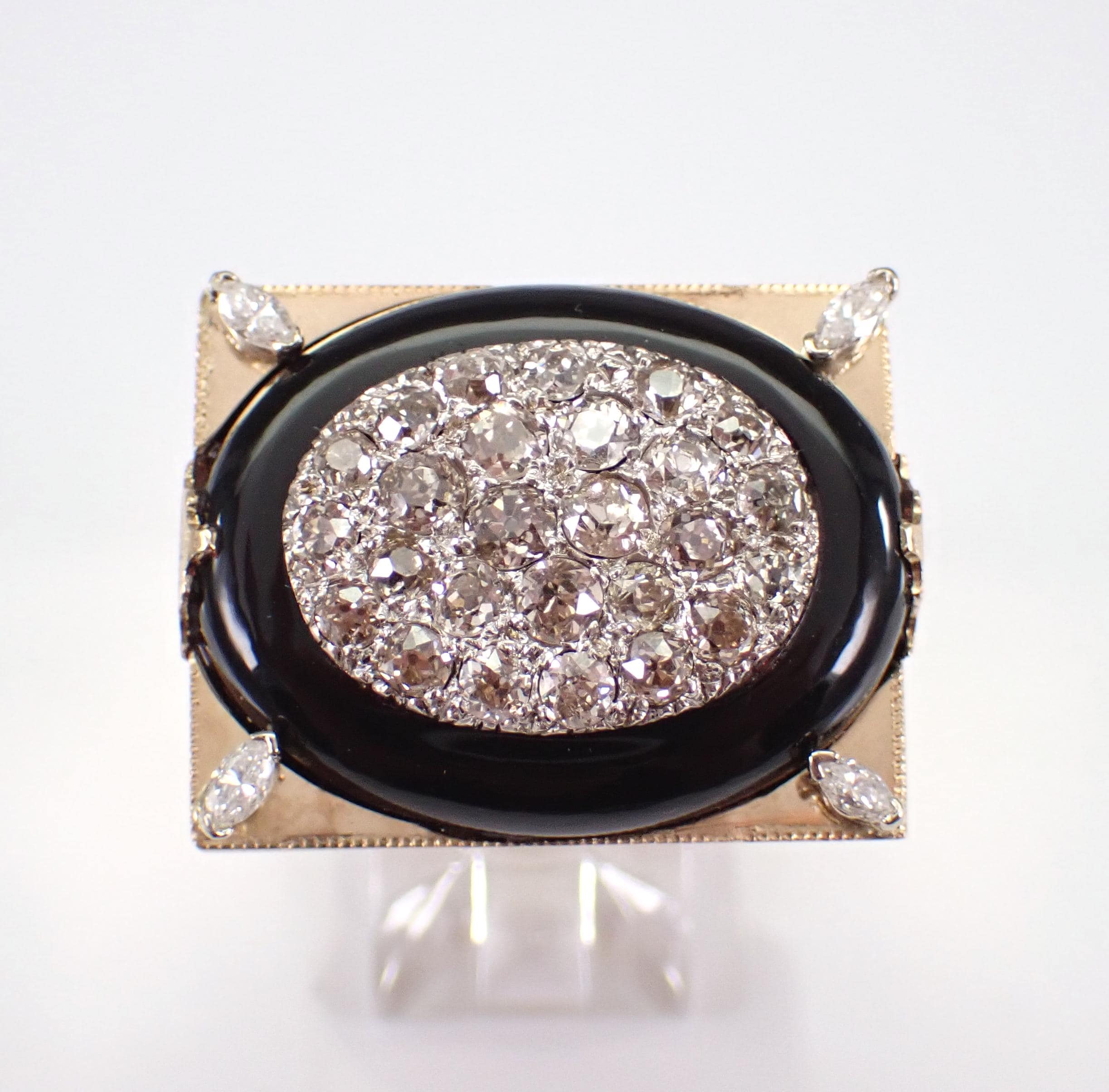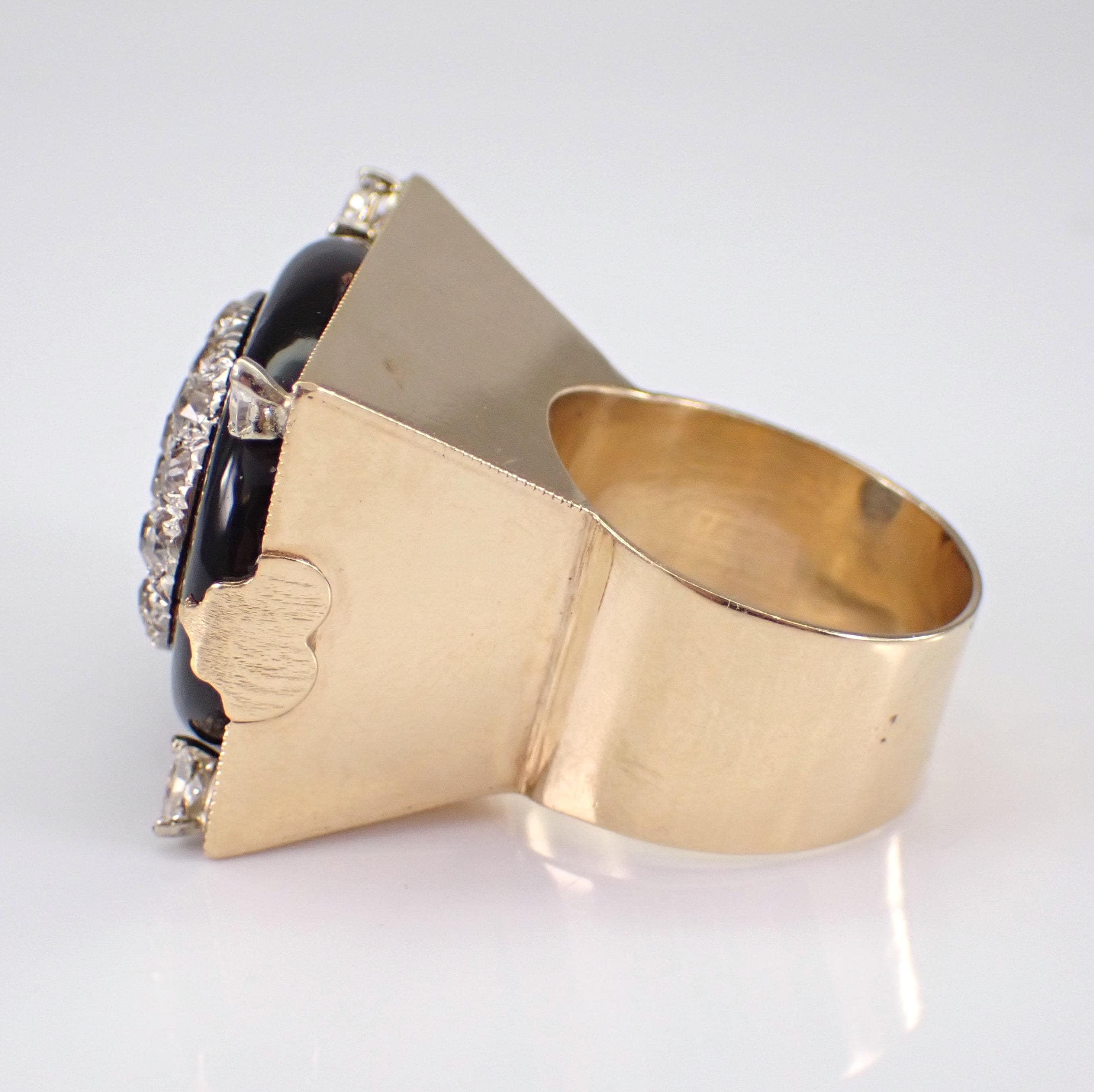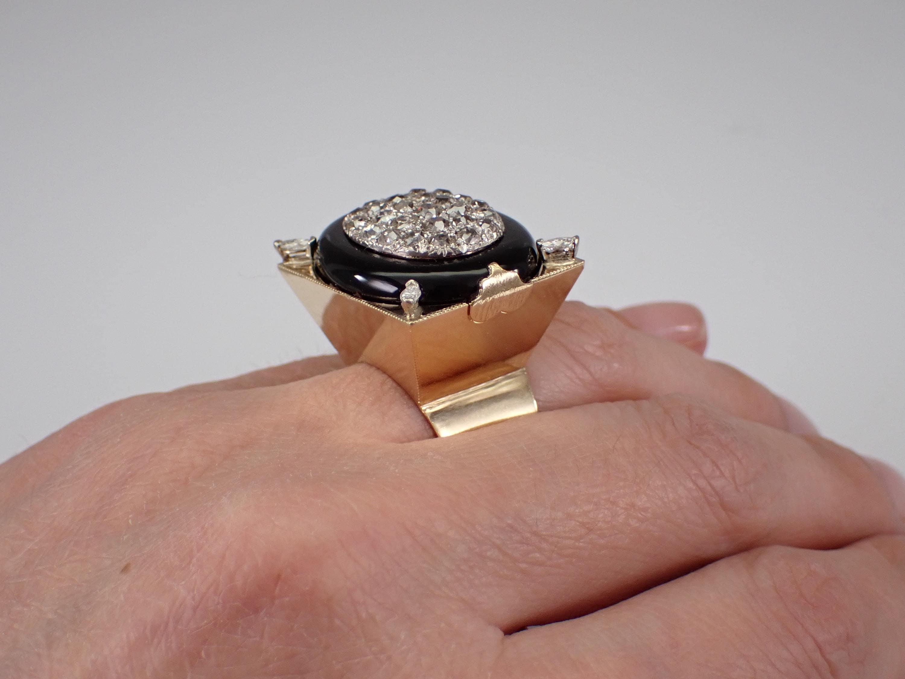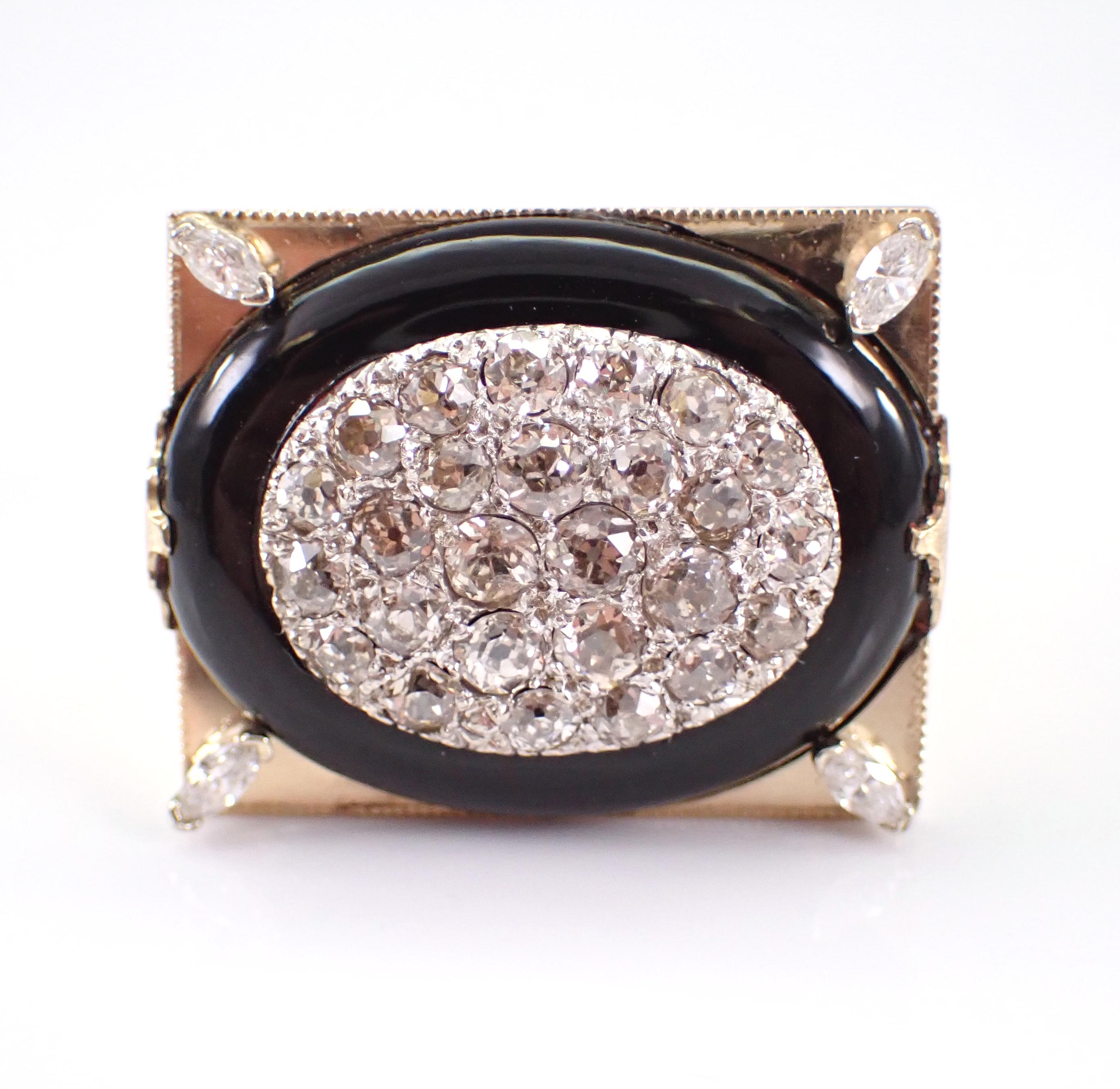14K Yellow Gold onyx and diamond ring. This vintage ring is set with four genuine Marquise Diamonds, twenty-six Round Old Miner Diamonds and an Oval Black Onyx. This Black onyx measures 25.5 X 20.5 mm. The diamonds in this ring are I/J color, SI/I1 clarity and weigh a total of 3 carats. This ring is 14KT Yellow Gold, weighs 11.3 grams and is a finger size 7 3/4, which can be resized (please inquire about sizing with the finger size you need). The top of this ring measures 27 X 21 mm and the ring sits up 16 mm off the finger. This ring dates back to Circa 1970's and will be accompanied by an appraisal written by a GIA Certified Diamond Grader with the retail replacement value of $8,695.00. I will ship this ring promptly in a beautiful gift box.