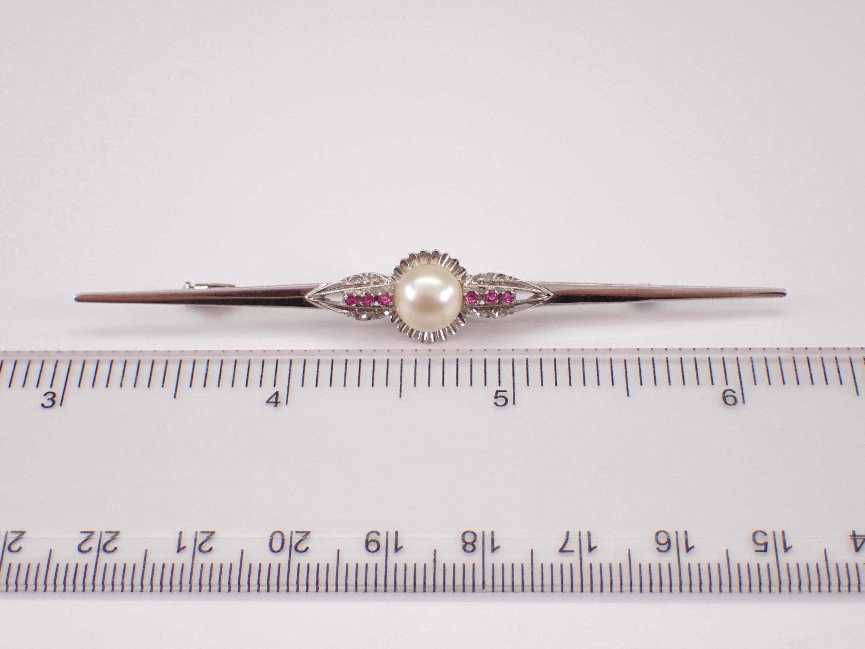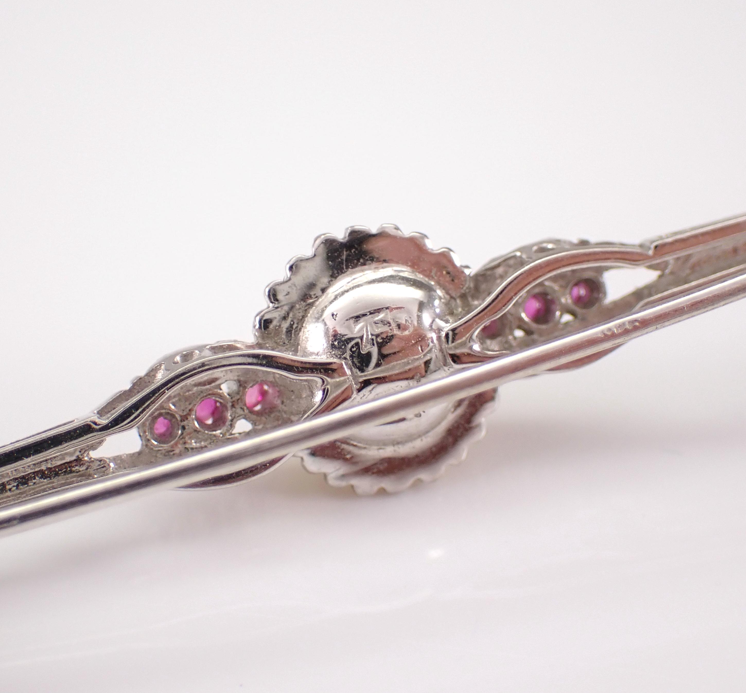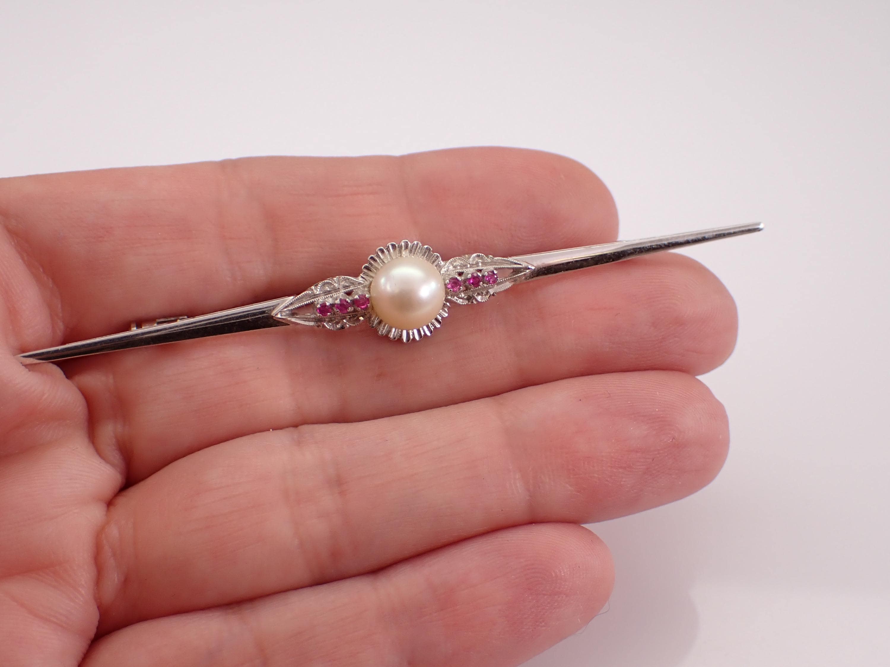 Antique 18K White Gold Pearl and Ruby Brooch Stick Pin. This pin is set with one Cultured Pearl in the center and six Round Natural Rubies. The Pearl measures 7.8 mm in diameter and the Rubies weigh a total of .14 carat. This brooch is made of 18K White Gold, weighs 5.5 grams and measures 3 1/4" in length. This brooch will also be accompanied by an appraisal by a GIA Certified Diamond Grader with the replacement value of $2,495.00. I will ship this pin promptly in a beautiful gift box.