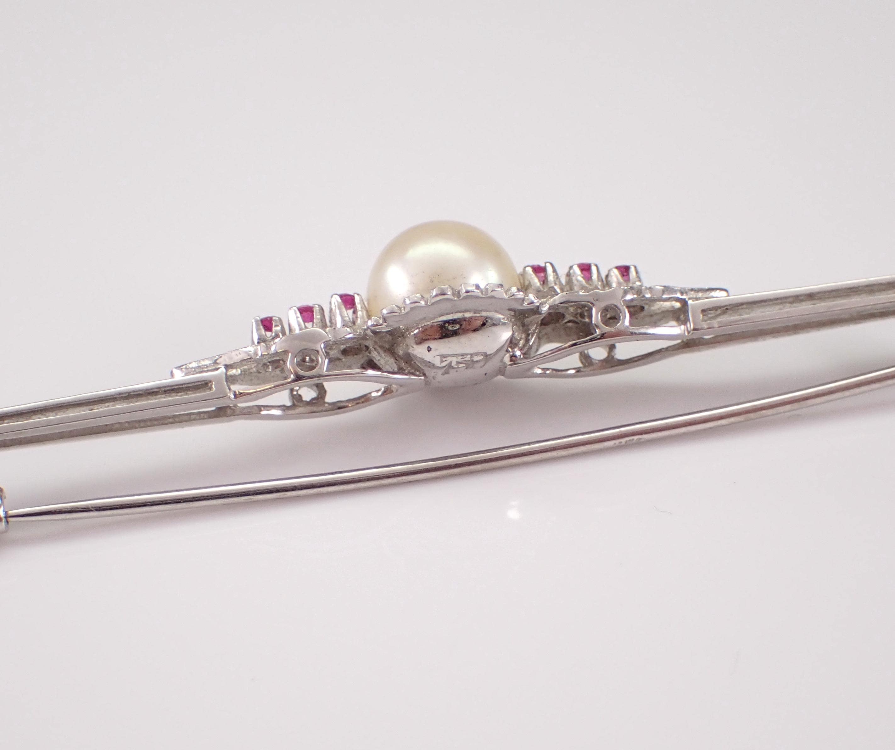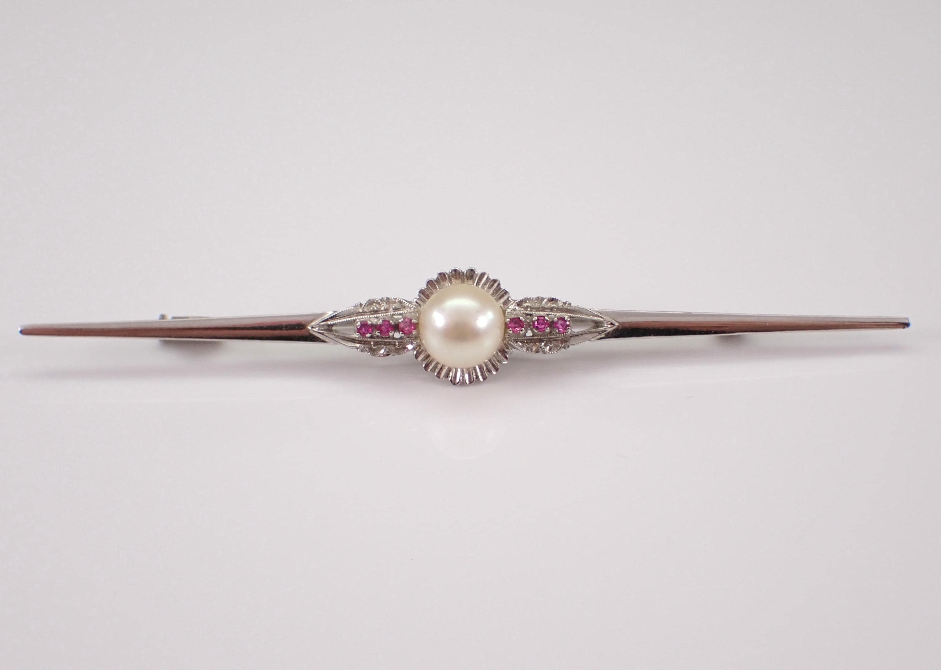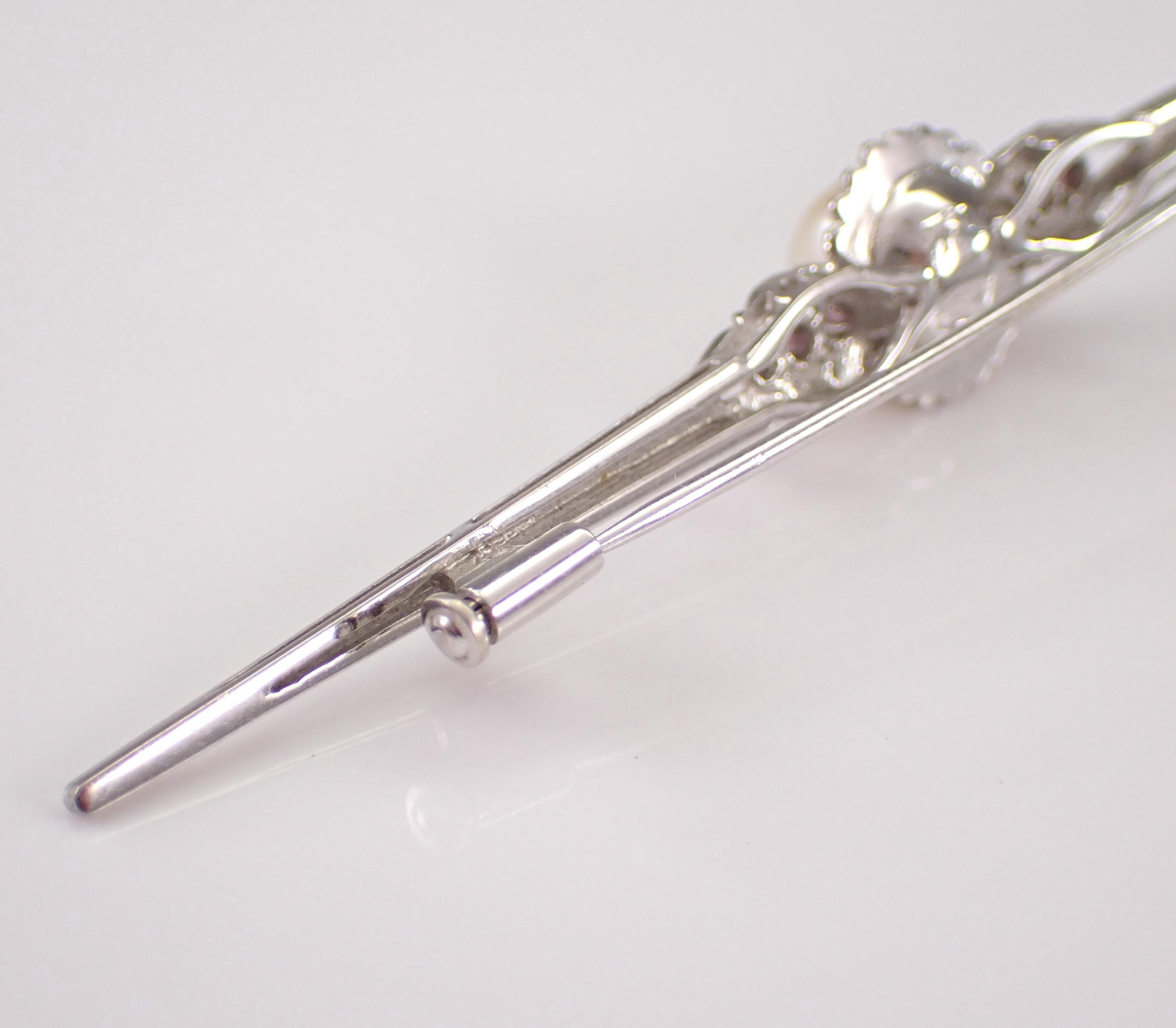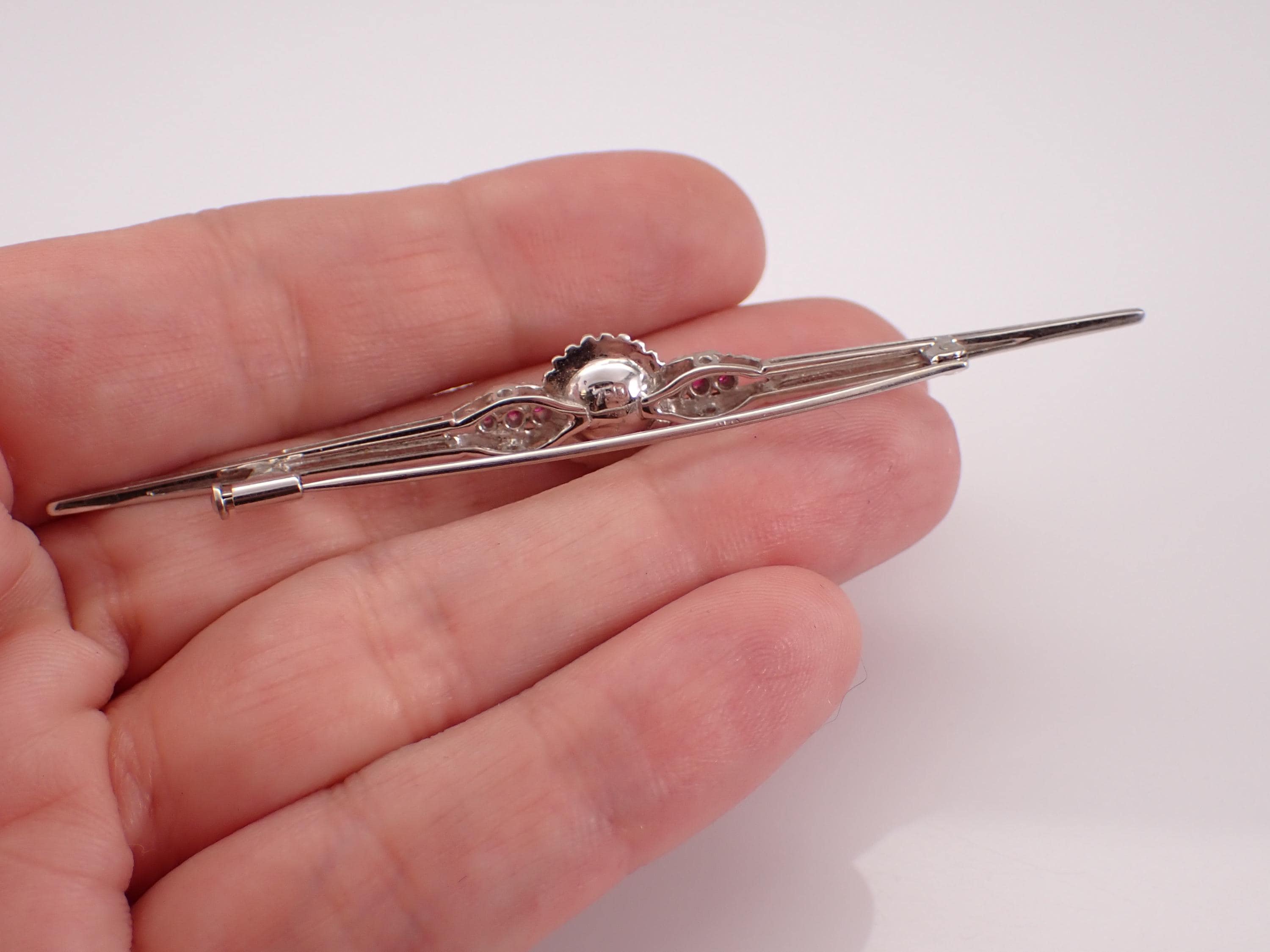 Antique 18K White Gold Pearl and Ruby Brooch Stick Pin. This pin is set with one Cultured Pearl in the center and six Round Natural Rubies. The Pearl measures 7.8 mm in diameter and the Rubies weigh a total of .14 carat. This brooch is made of 18K White Gold, weighs 5.5 grams and measures 3 1/4" in length. This brooch will also be accompanied by an appraisal by a GIA Certified Diamond Grader with the replacement value of $2,495.00. I will ship this pin promptly in a beautiful gift box.