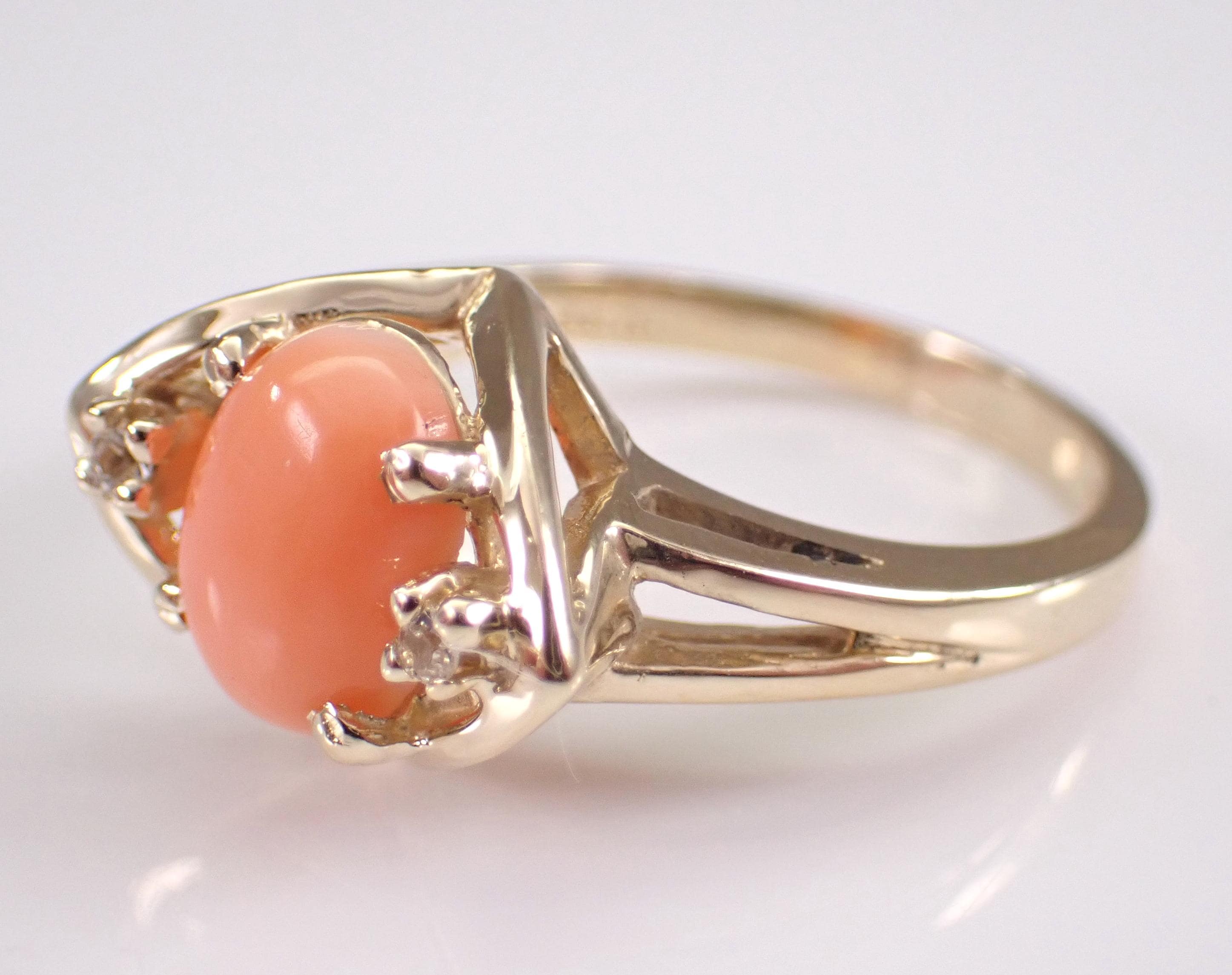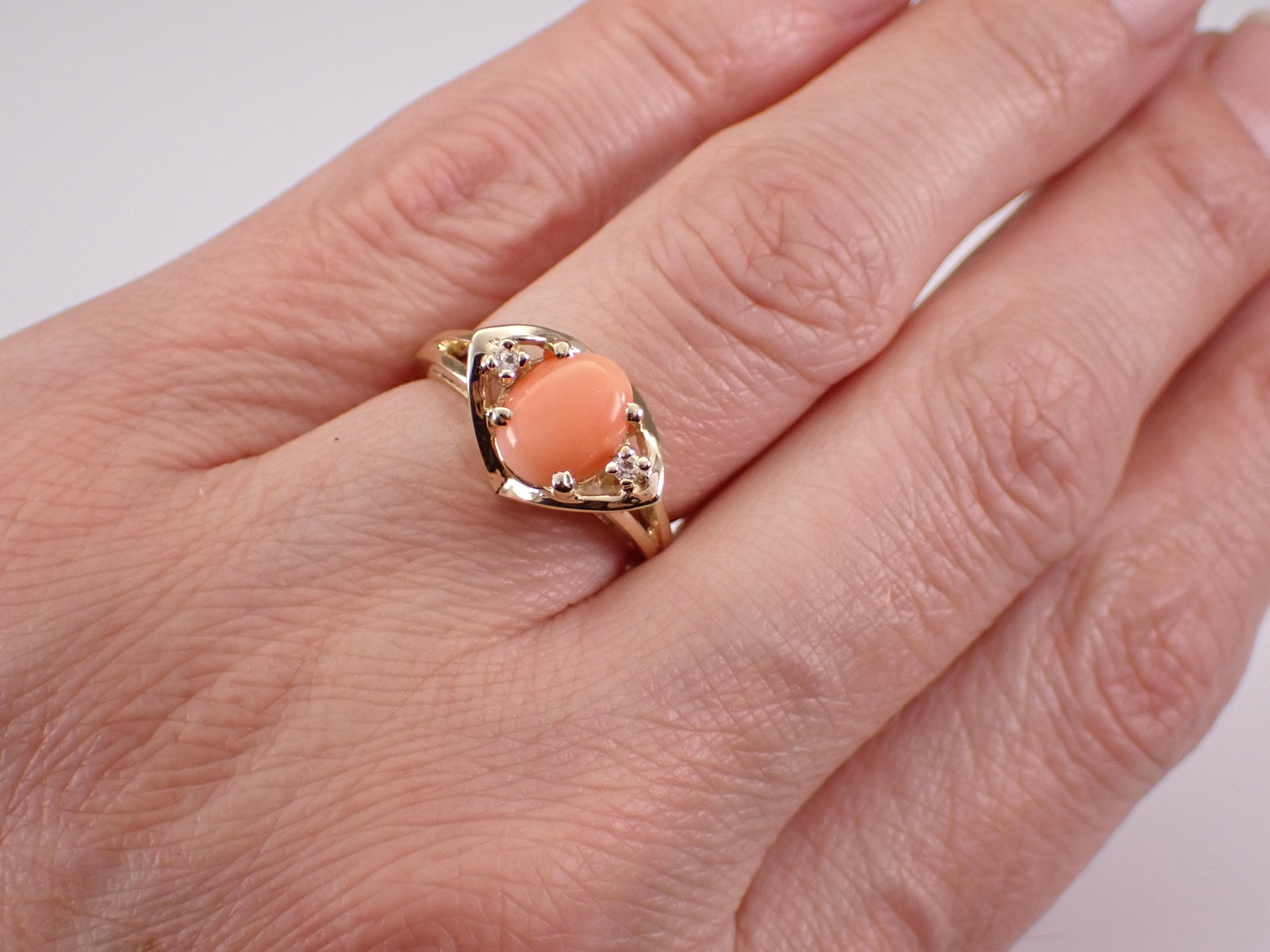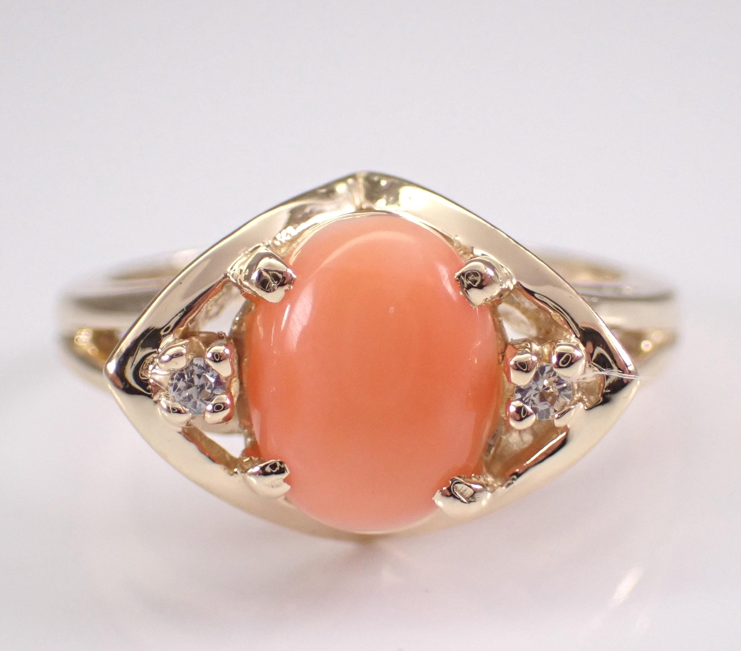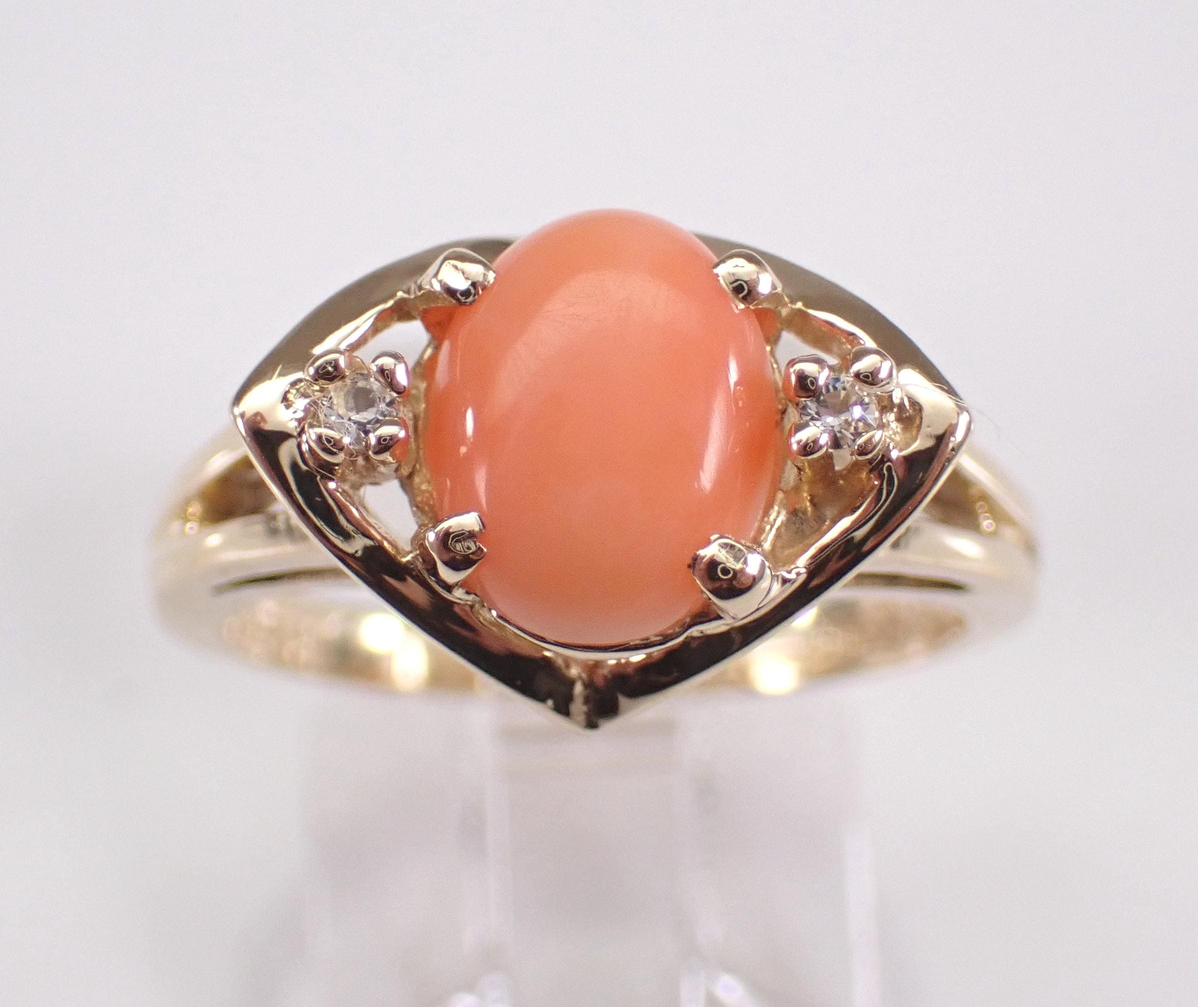 Vintage 14k Yellow Gold Coral Ring. This ring is set with an Oval Coral in the center and two Round White Sapphires. The Coral measures 9 X 6 mm. This ring is 14KT Yellow Gold, weighs 4.1 grams and is a finger size 6 1/2, which can be resized (please inquire about sizing with the finger size you need). This ring has a very unique design and dates back to Circa 1960's. I will ship this ring promptly in a gift box.