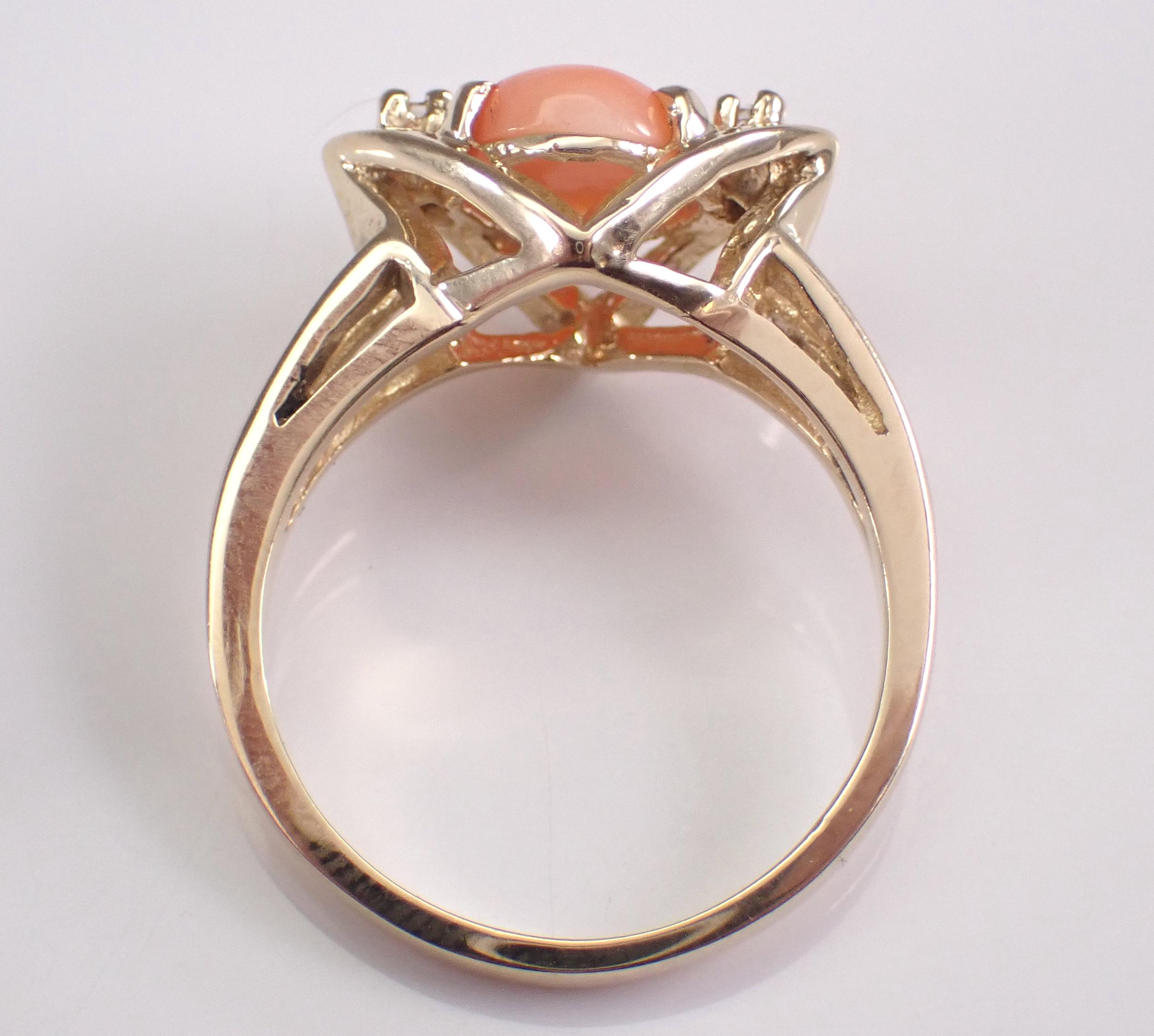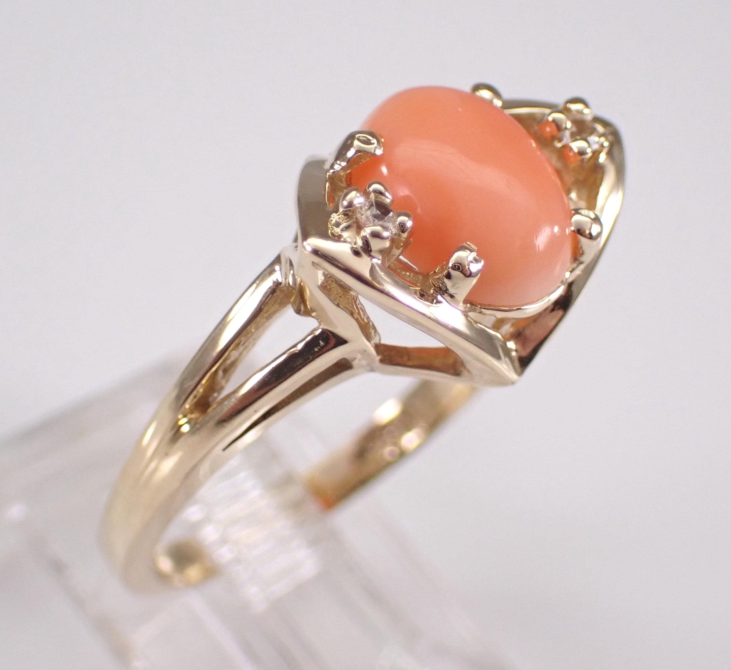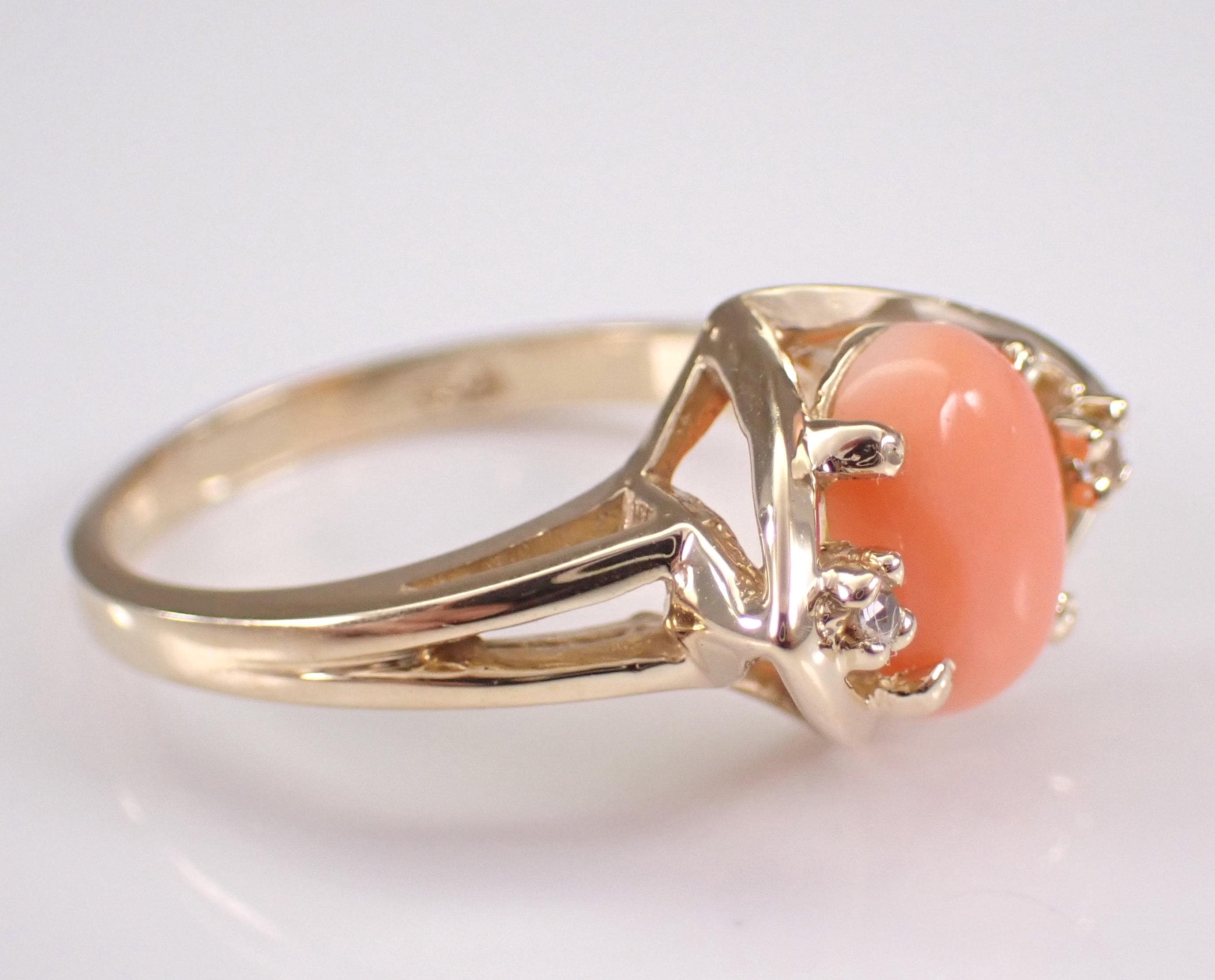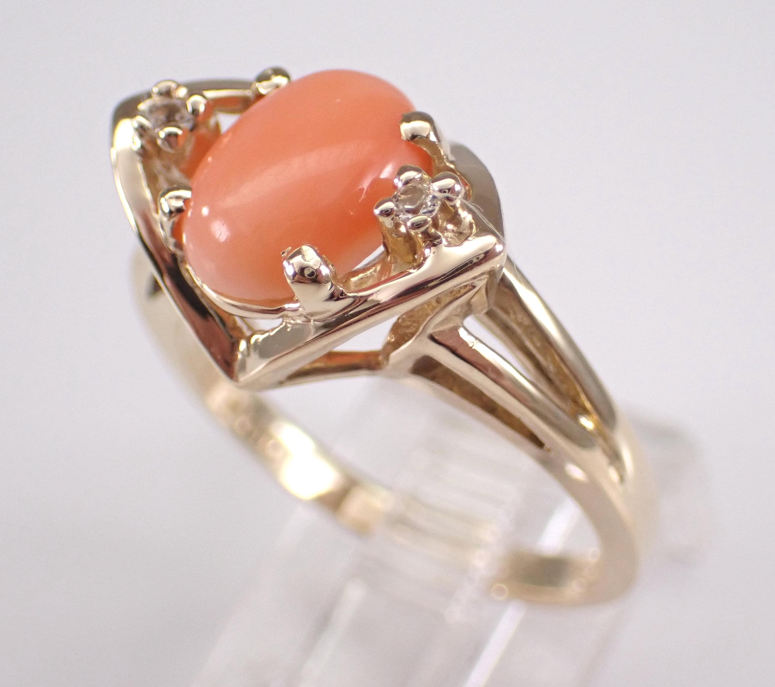 Vintage 14k Yellow Gold Coral Ring. This ring is set with an Oval Coral in the center and two Round White Sapphires. The Coral measures 9 X 6 mm. This ring is 14KT Yellow Gold, weighs 4.1 grams and is a finger size 6 1/2, which can be resized (please inquire about sizing with the finger size you need). This ring has a very unique design and dates back to Circa 1960's. I will ship this ring promptly in a gift box.