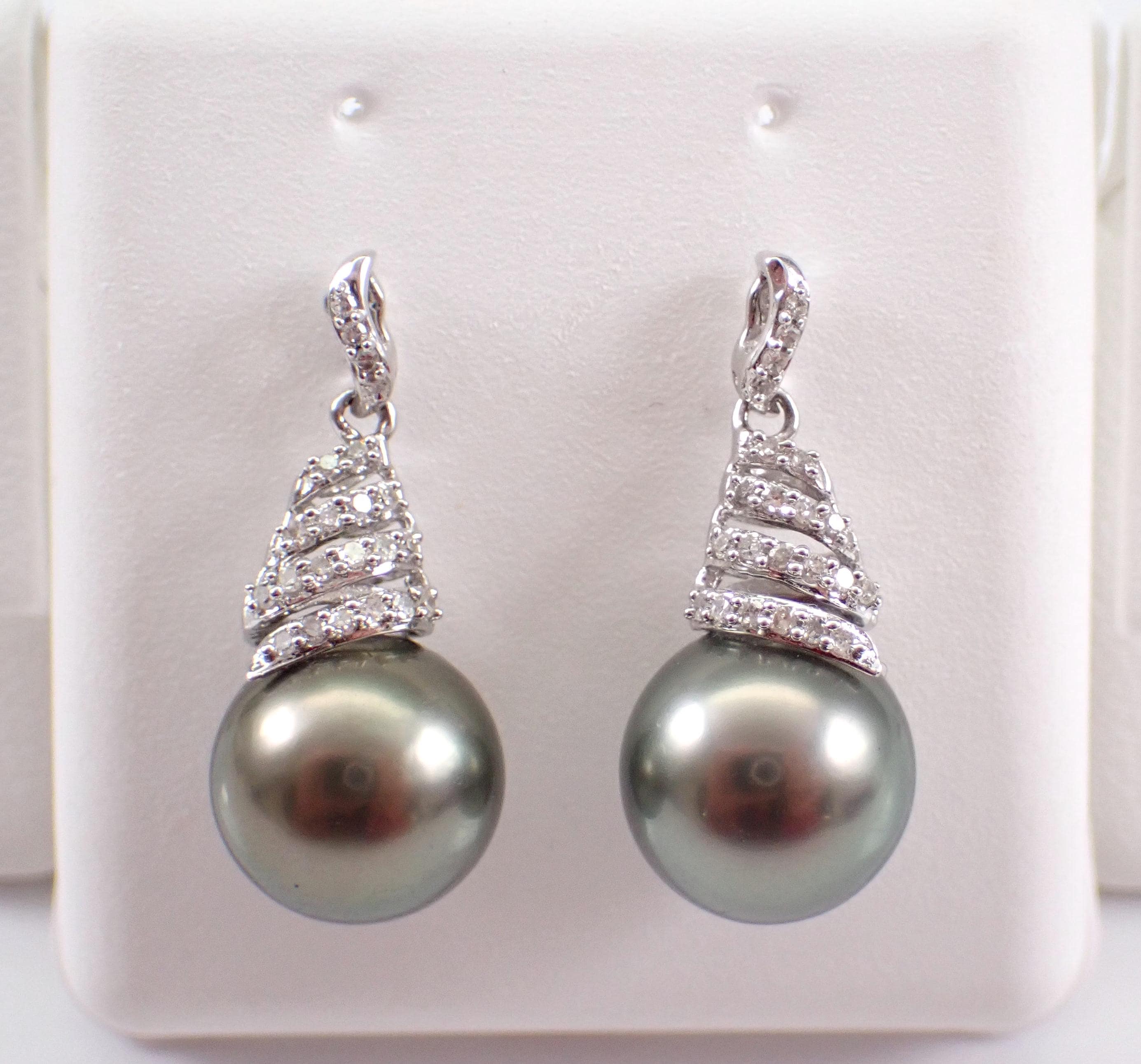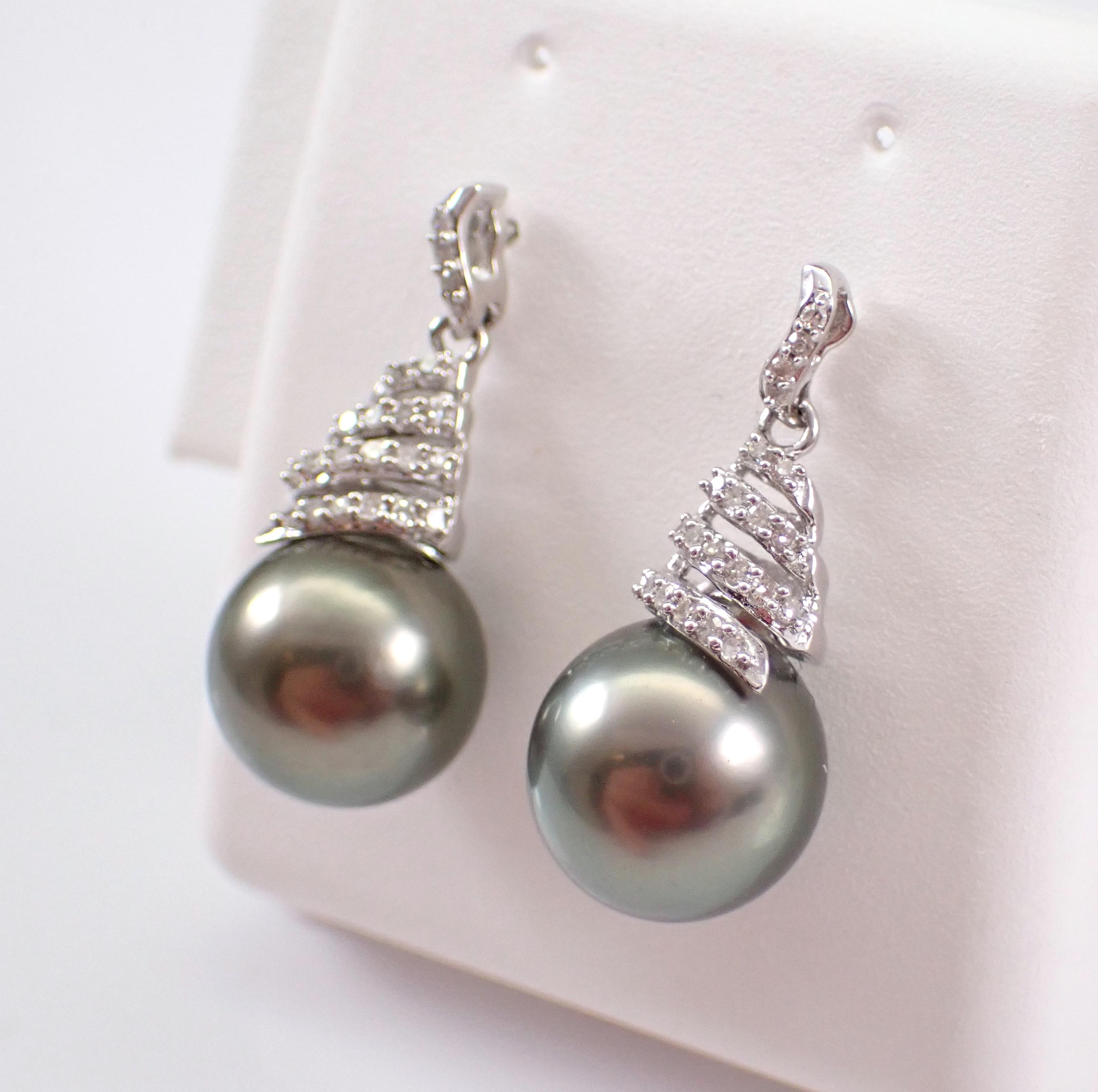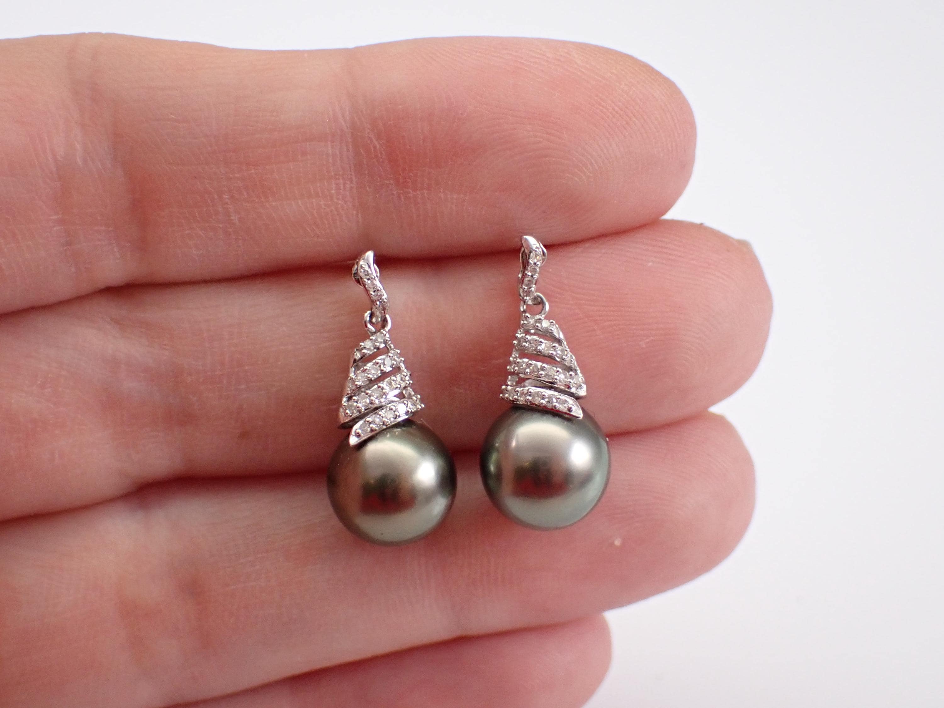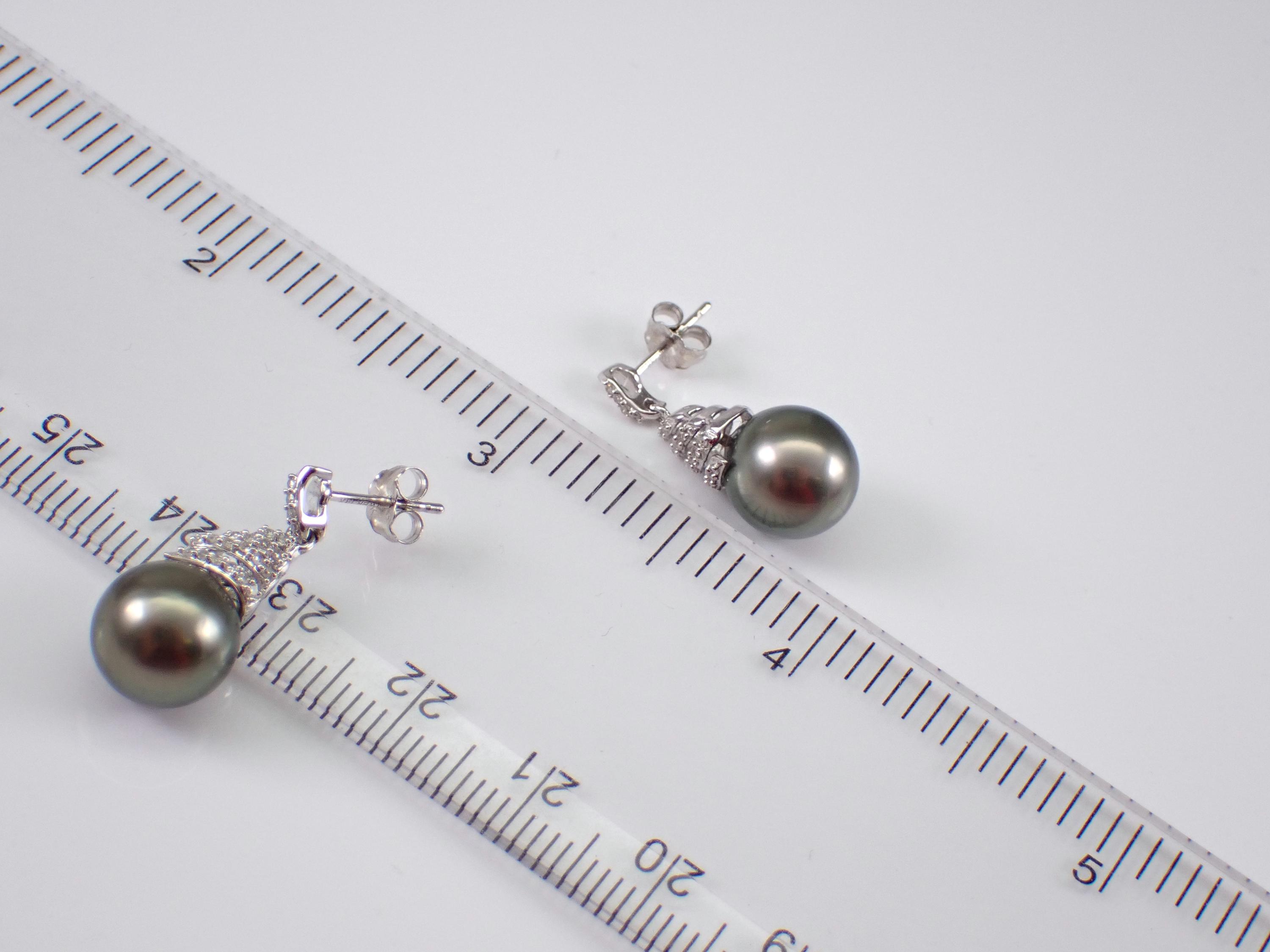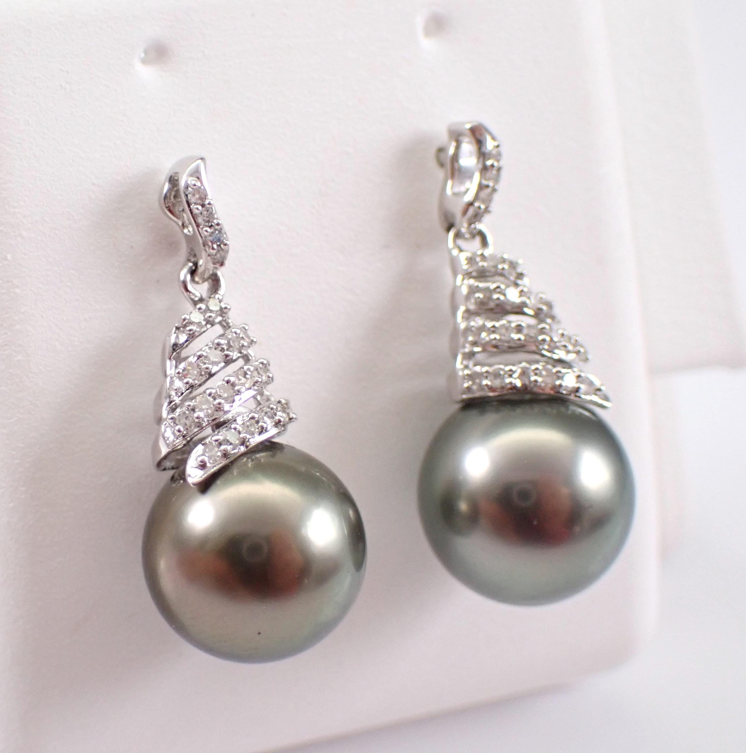 14K White Gold Black Tahitian Pearl and Diamond Dangle Drop Earrings. There is one Black Pearl set to dangle off each earring. These Pearls are Black Tahitian and measure 9.5 mm in diameter each. There are twenty-two genuine natural Round Brilliant Diamonds set in EACH earring. These diamonds are H color, SI/I1 clarity and weigh a total of .15 carat. These earrings are 14KT White Gold and weigh a total of 3.8 grams. These earrings are for pierced ears, measure 21 mm in length and the earrings have friction post backings. These earrings will be accompanied by an appraisal written by a GIA Certified Diamond Grader with the retail replacement value of $1,689.00. I will ship these earrings promptly in a gift box.