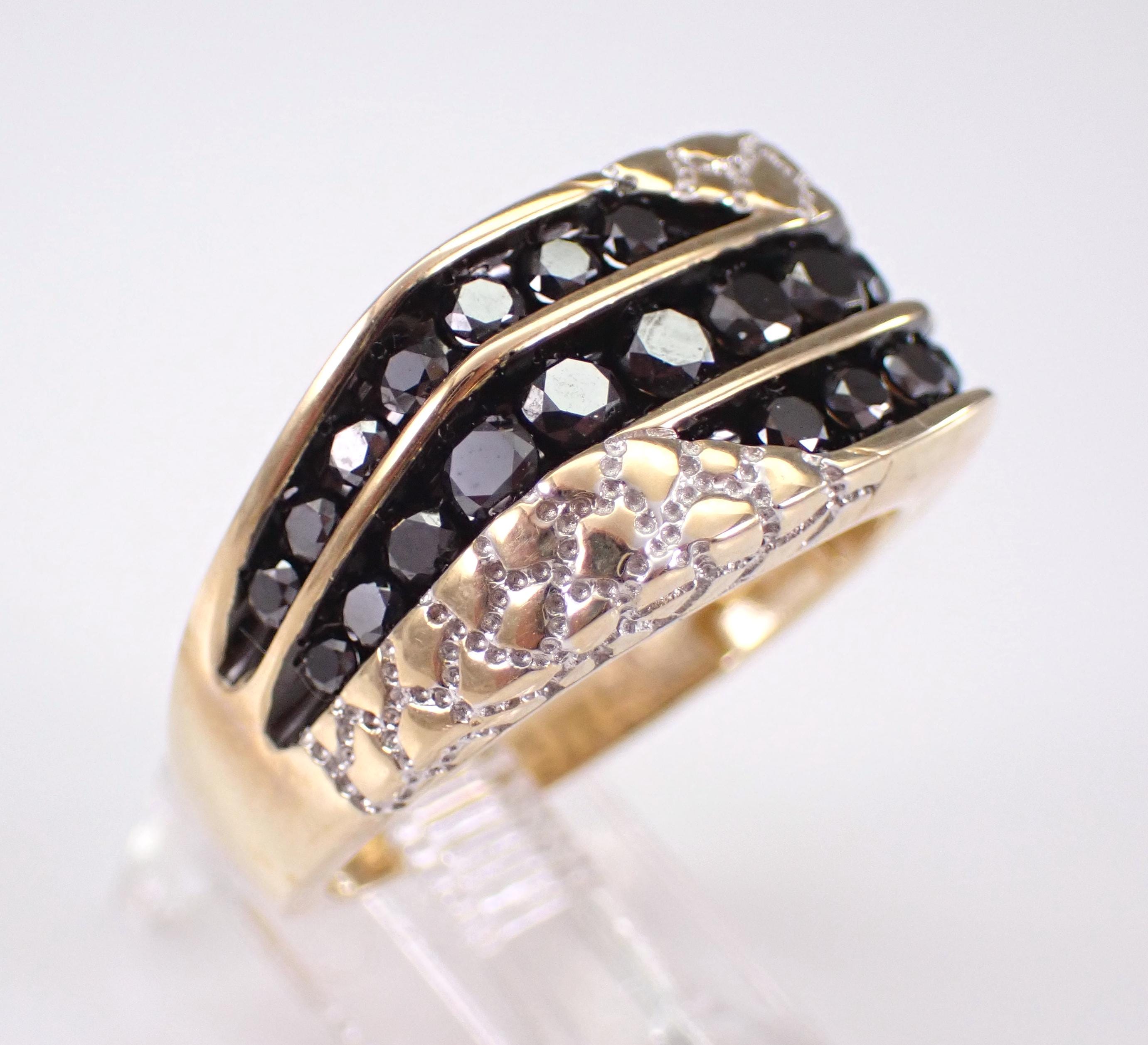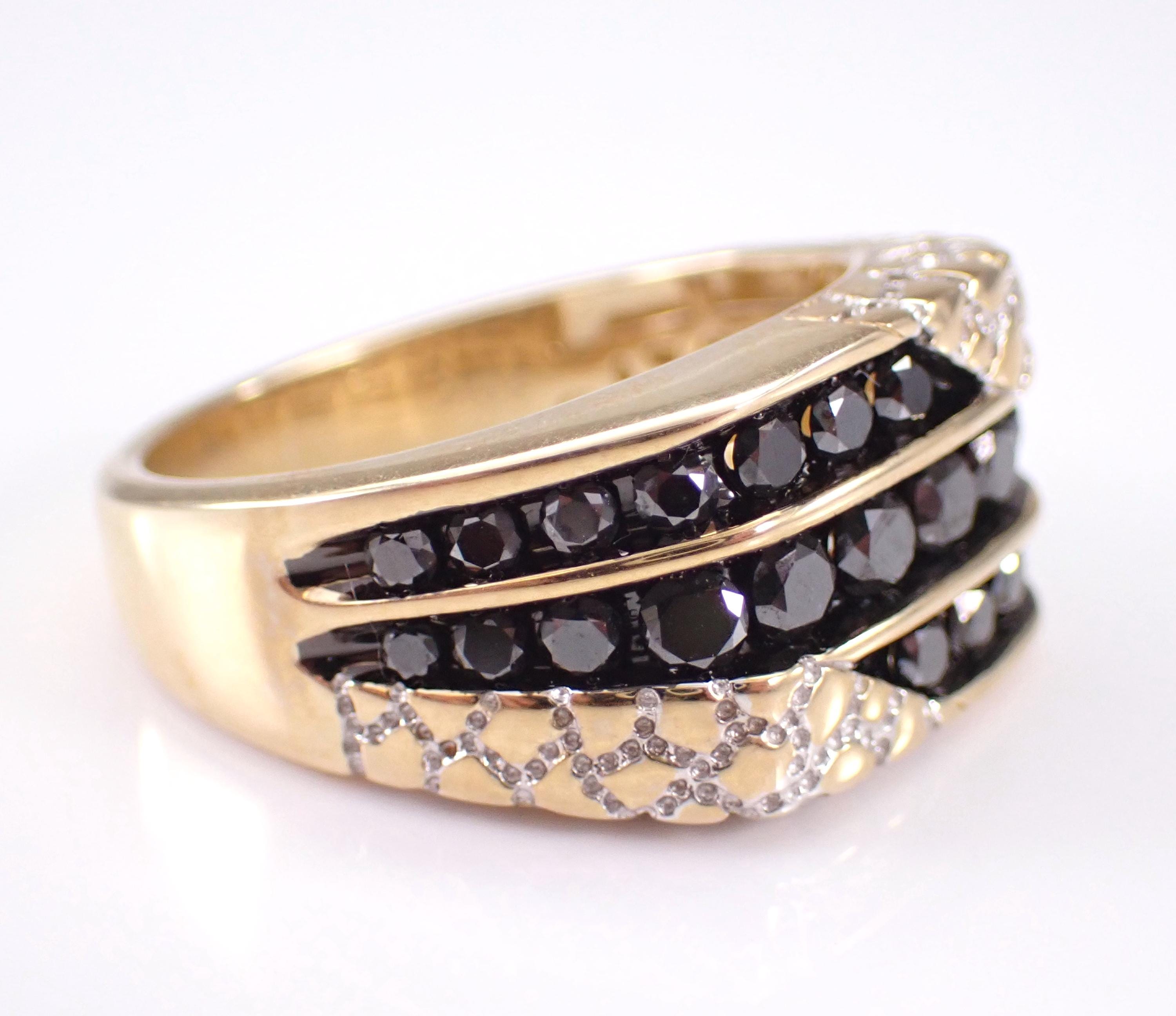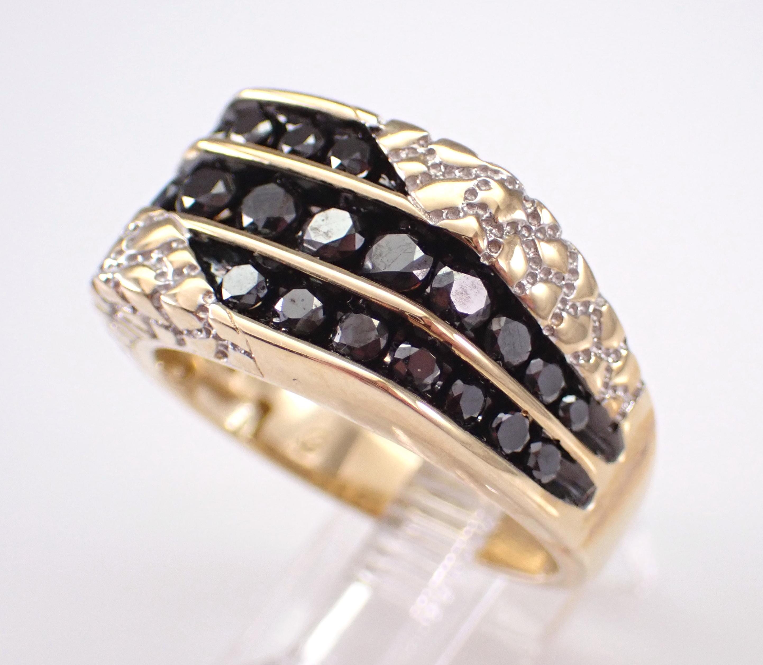 Yellow Gold Men's Black Diamond Wedding Ring Anniversary Band. This is a beautiful ring set with twenty-six genuine, natural round black diamonds. The diamonds weigh a total of 1 1/2 carats. The ring is 10KT Yellow Gold, weighs 8.7 grams, measures 12 mm in width and is a finger size 10 1/2, which can be sized (please inquire about sizing with the finger size you need). This ring will be accompanied by an appraisal by a GIA Certified Diamond Grader with the retail replacement value of $2,895.00. I will ship this ring promptly in a gift box.