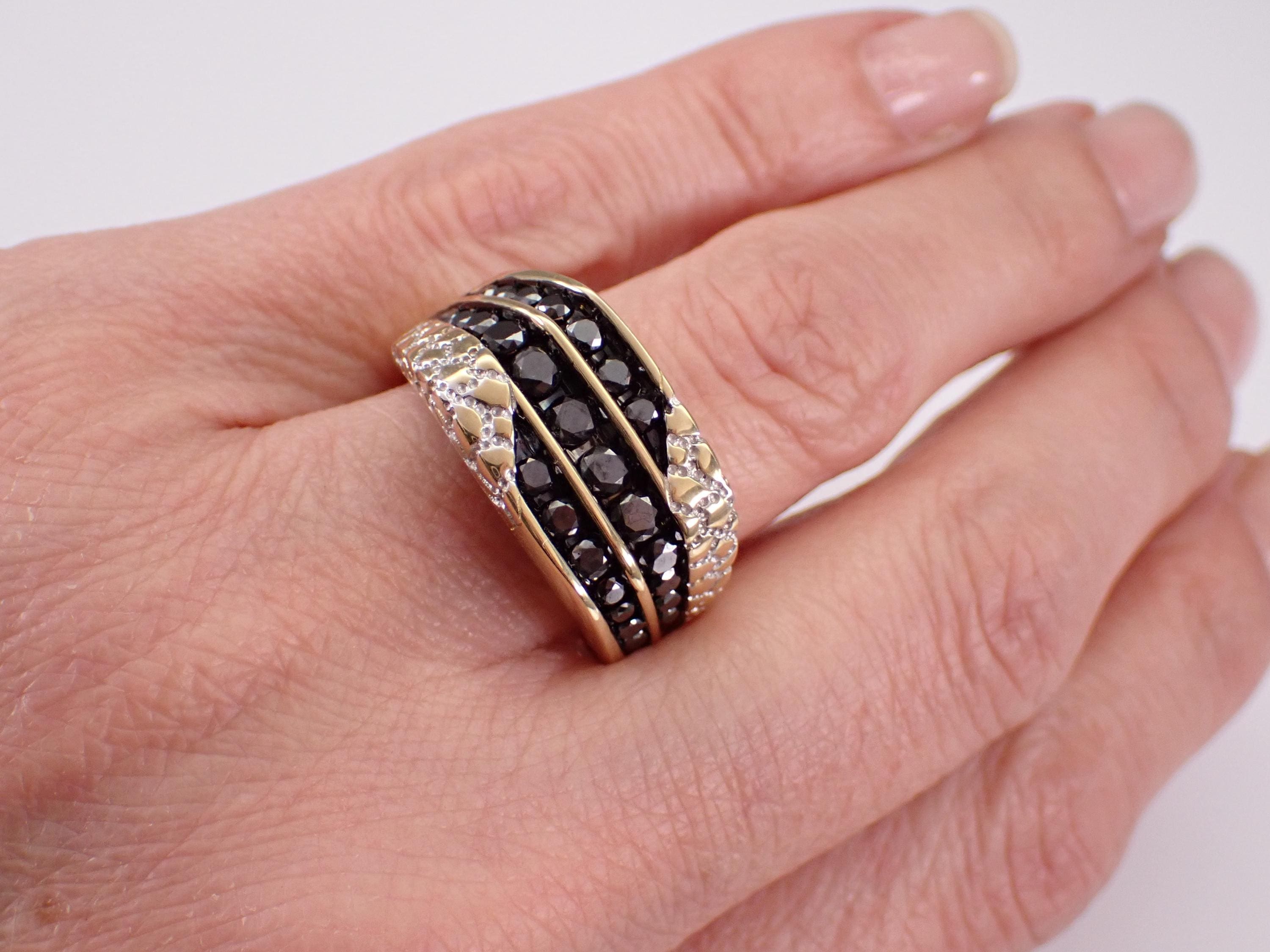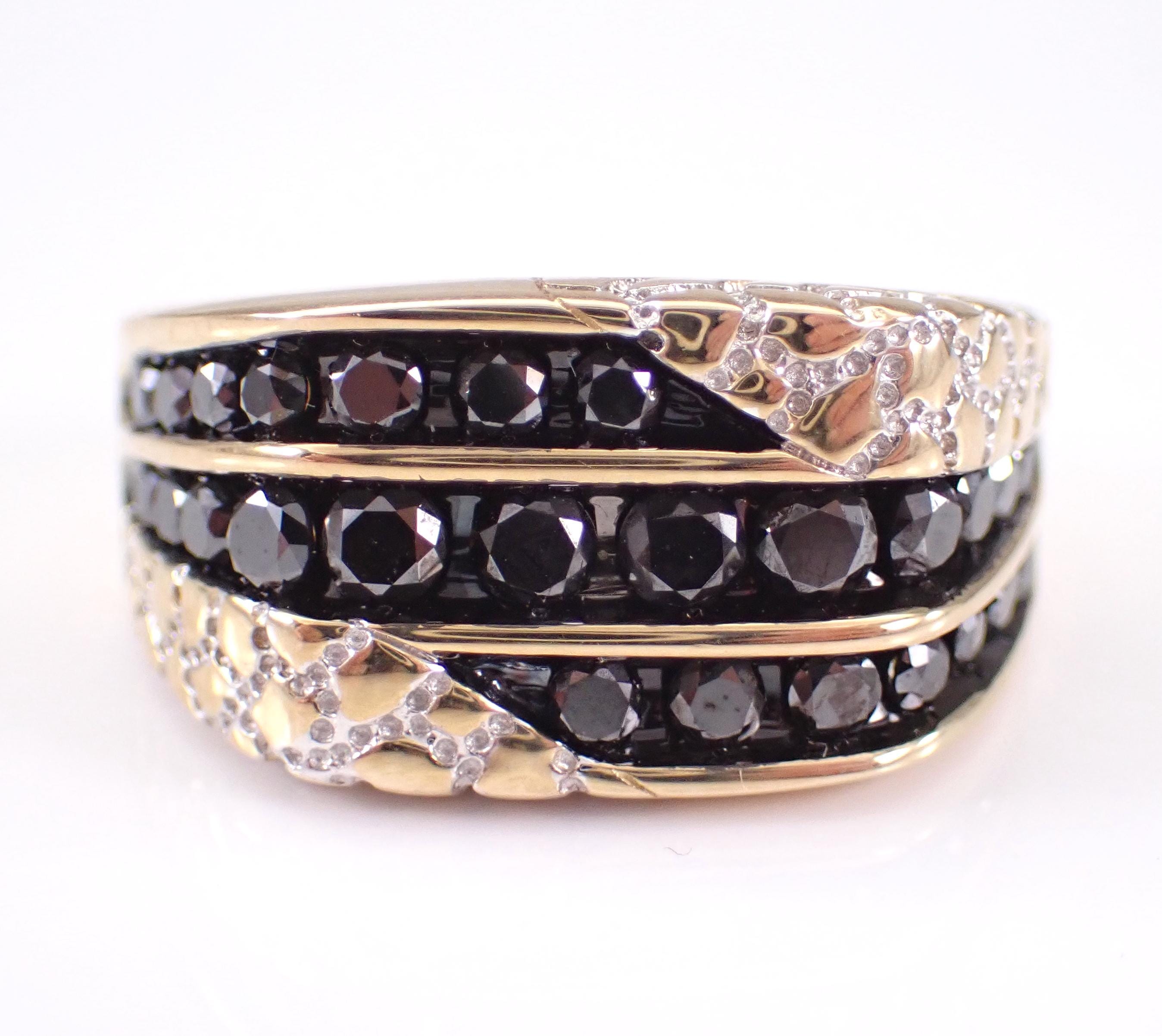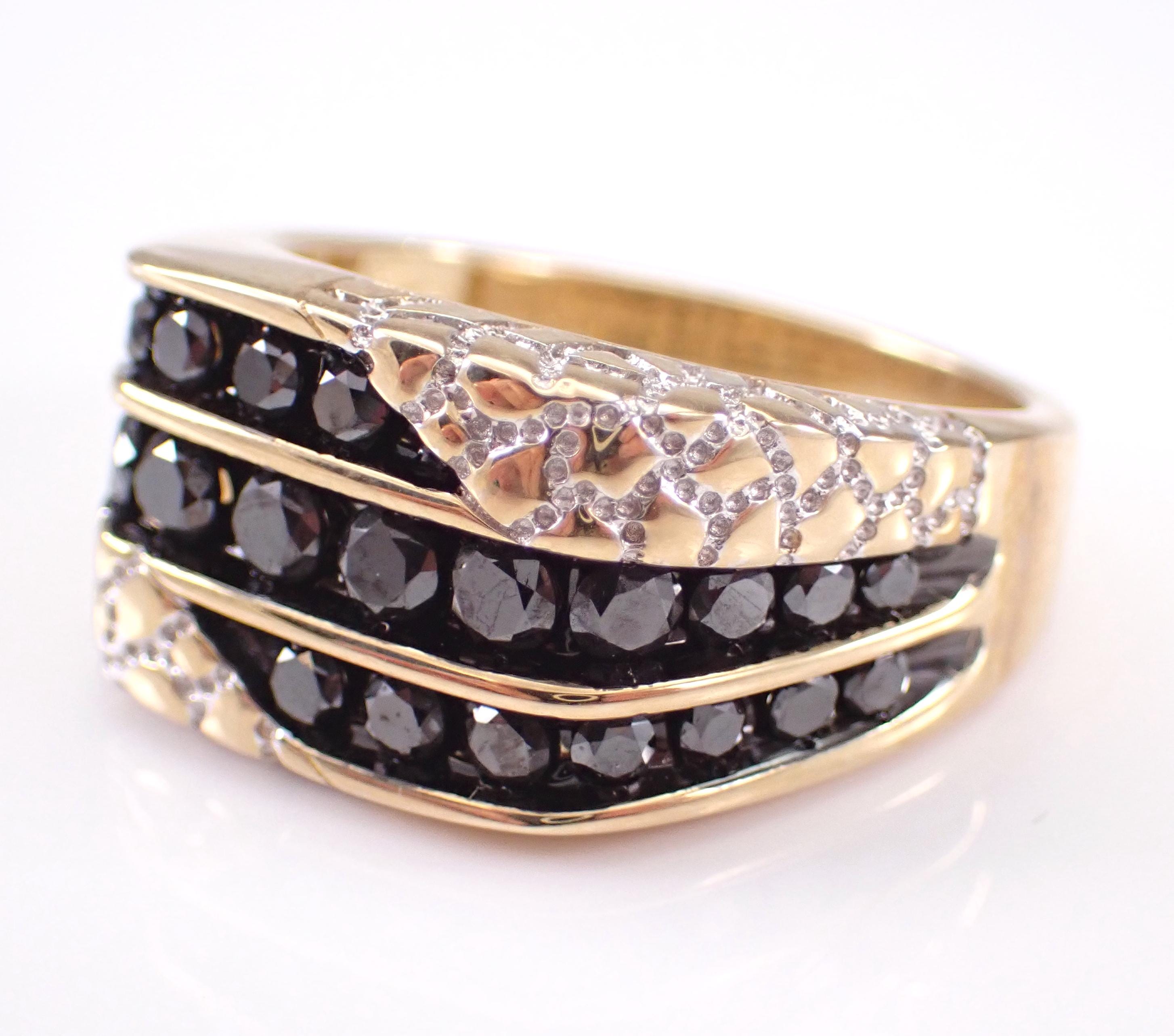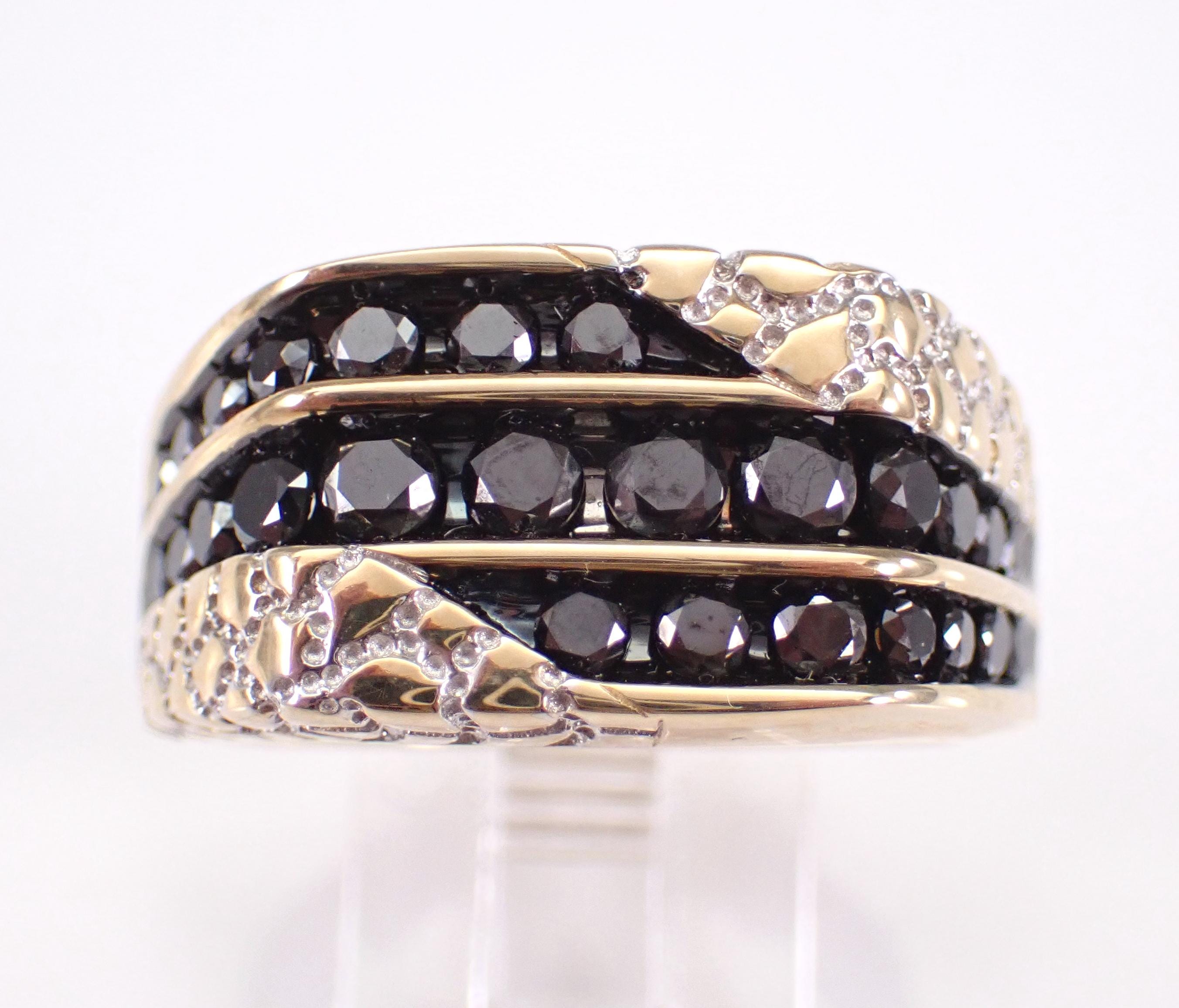 Yellow Gold Men's Black Diamond Wedding Ring Anniversary Band. This is a beautiful ring set with twenty-six genuine, natural round black diamonds. The diamonds weigh a total of 1 1/2 carats. The ring is 10KT Yellow Gold, weighs 8.7 grams, measures 12 mm in width and is a finger size 10 1/2, which can be sized (please inquire about sizing with the finger size you need). This ring will be accompanied by an appraisal by a GIA Certified Diamond Grader with the retail replacement value of $2,895.00. I will ship this ring promptly in a gift box.