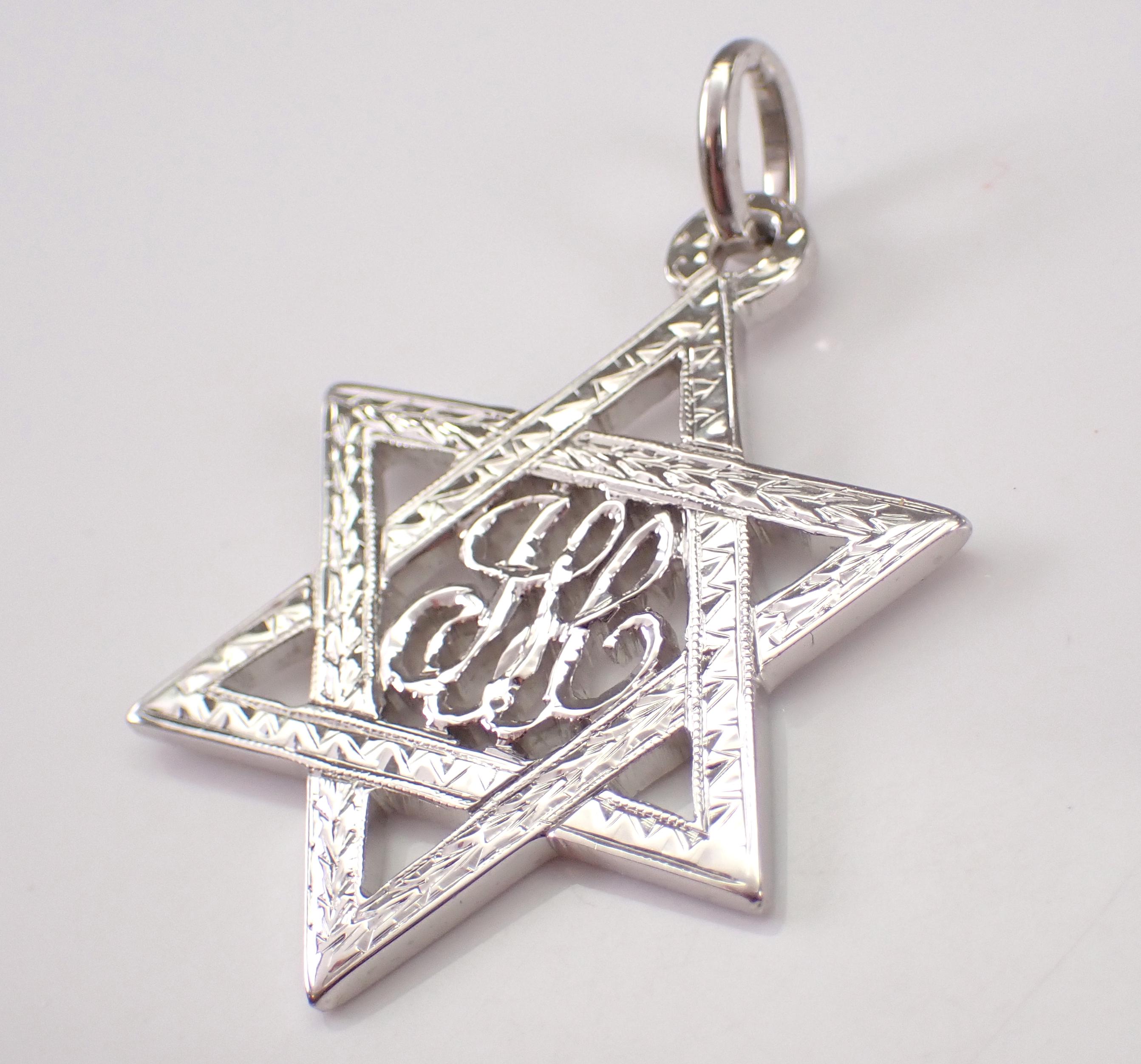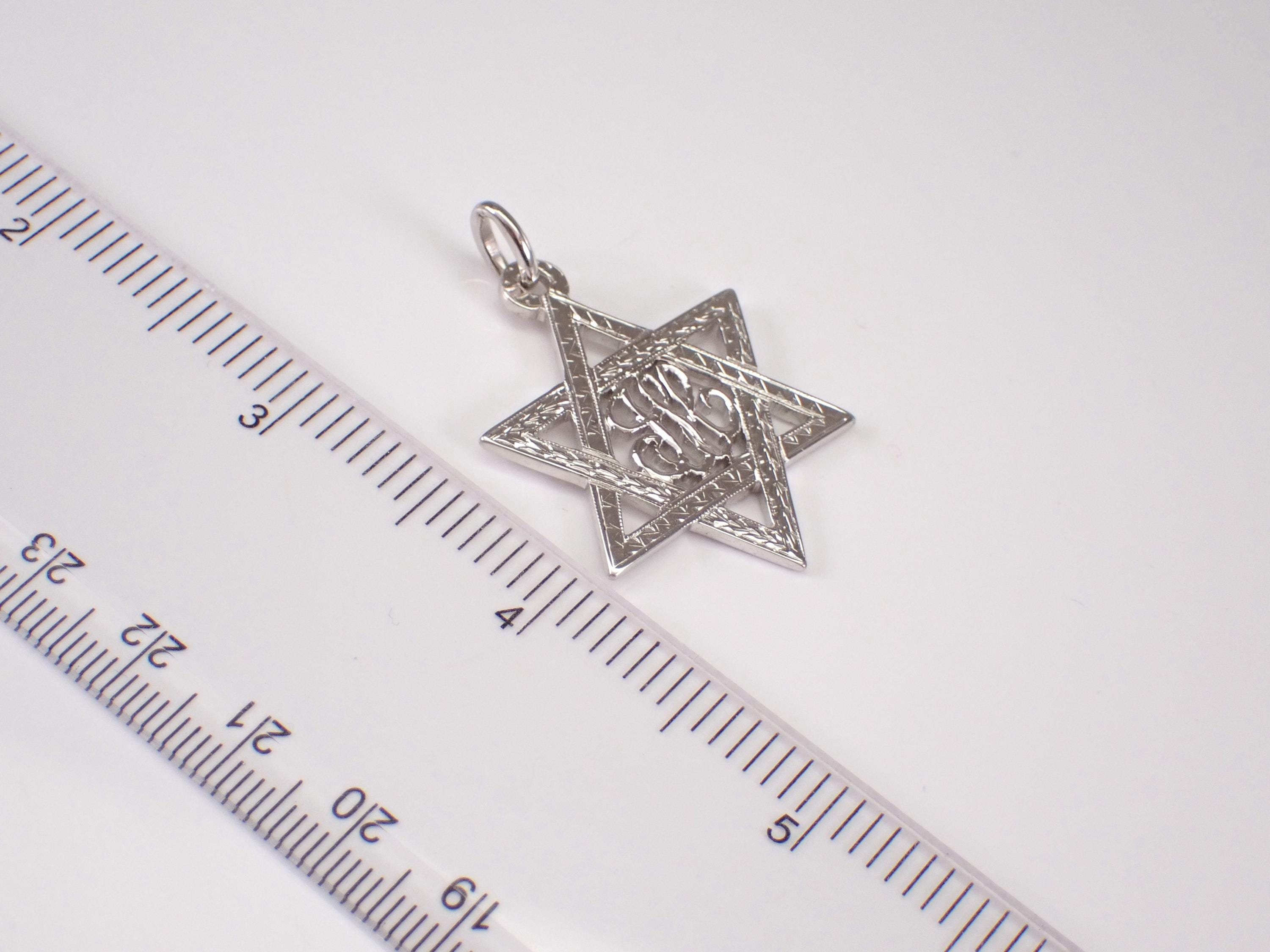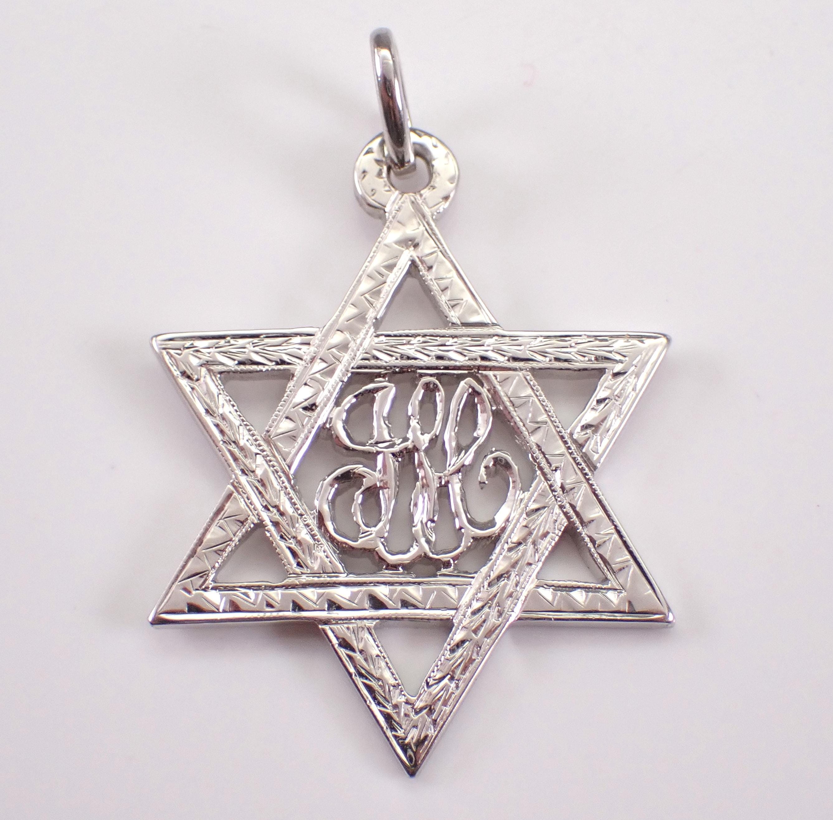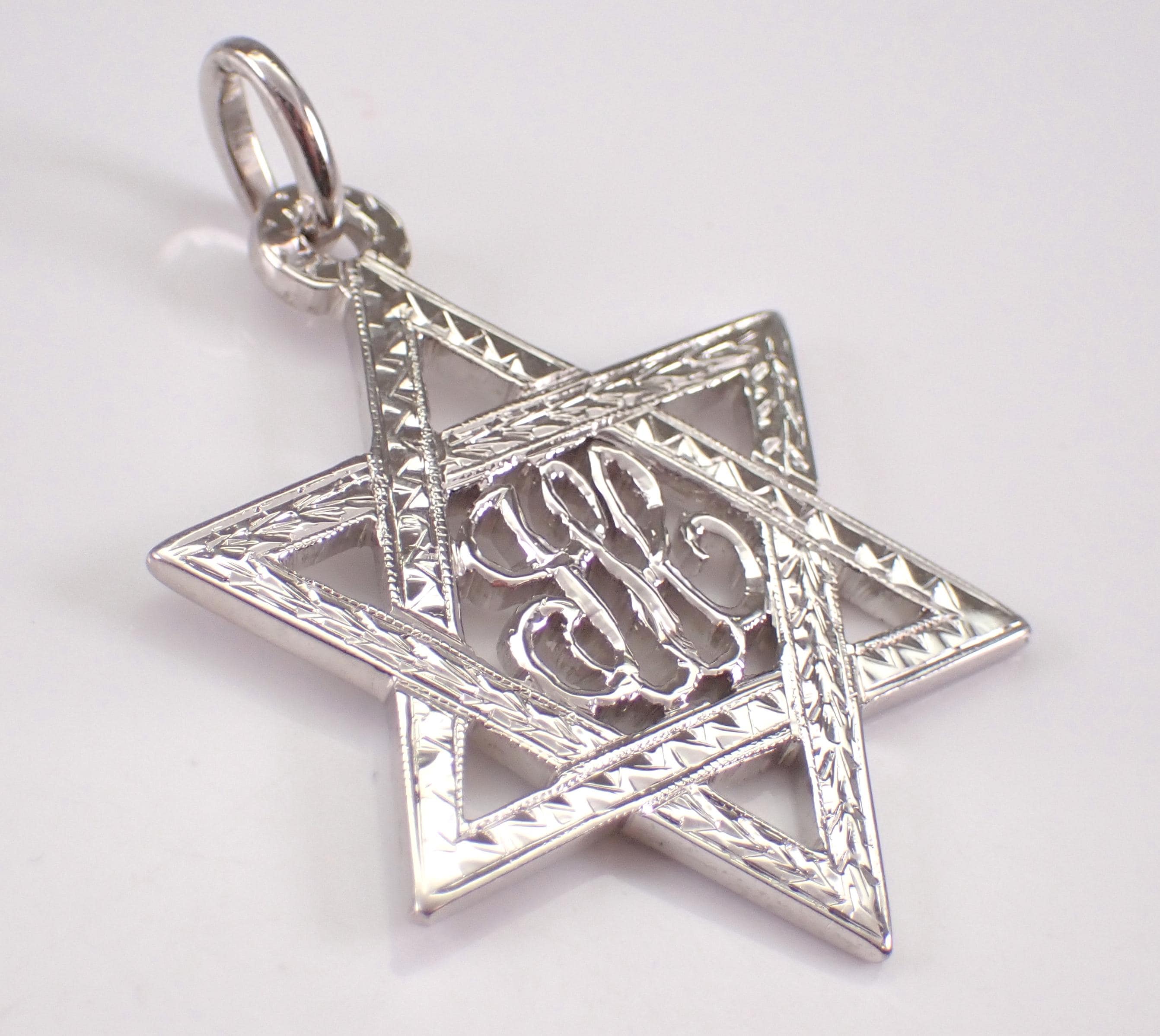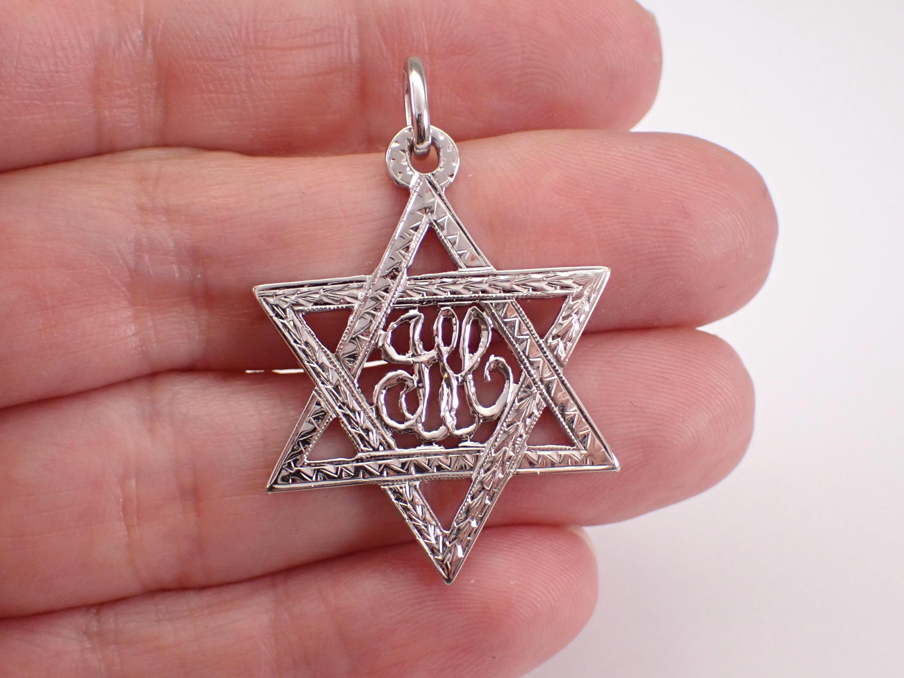 14K White Gold Vintage Star of David Jewish Religious Pendant Charm. This pendant weighs 6.6 grams and the star measures 35 X 28 mm without the bail. This charm will be accompanied by an appraisal for insurance and authentication purposes. I will ship this pendant promptly in a gift pouch.