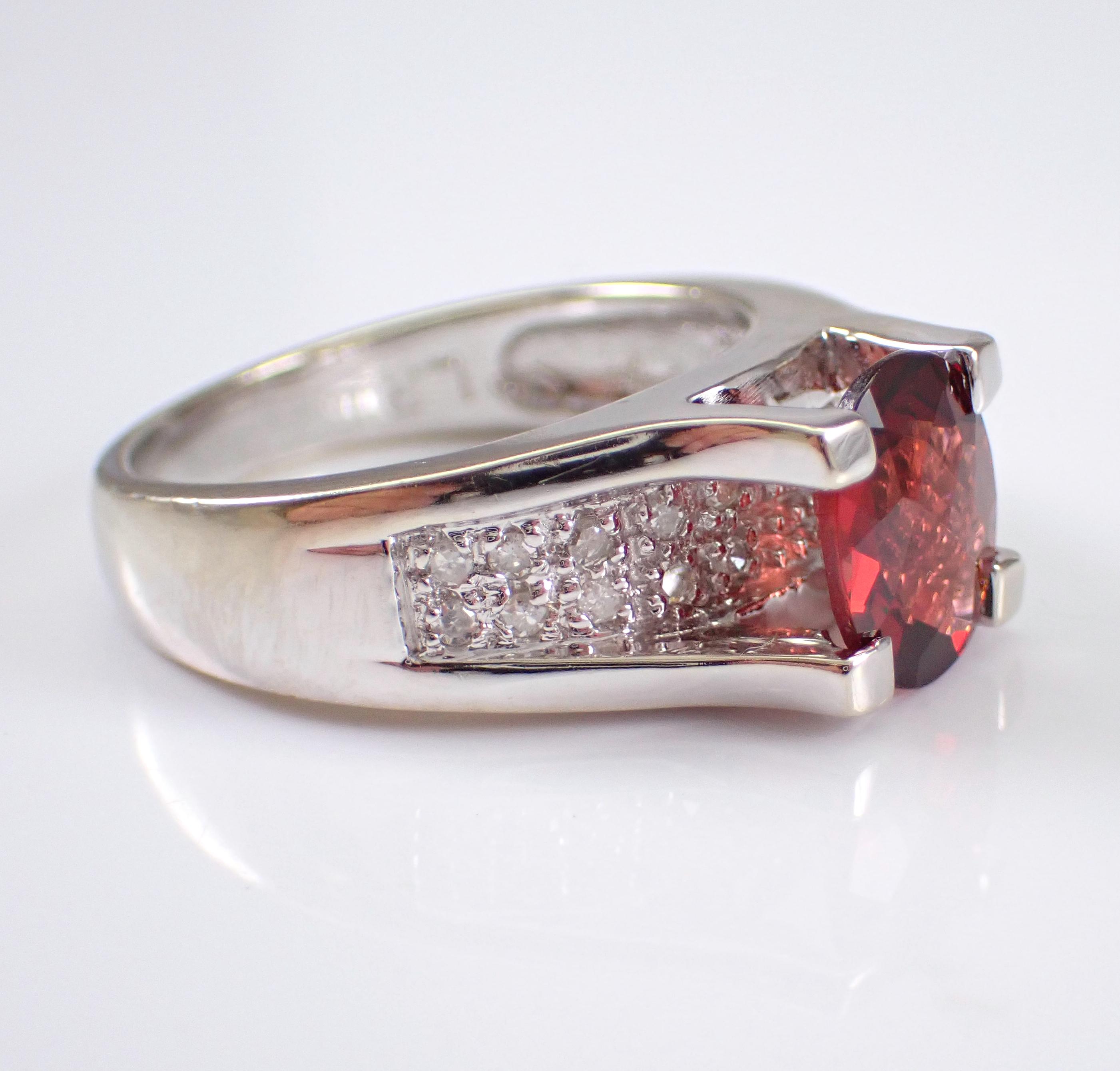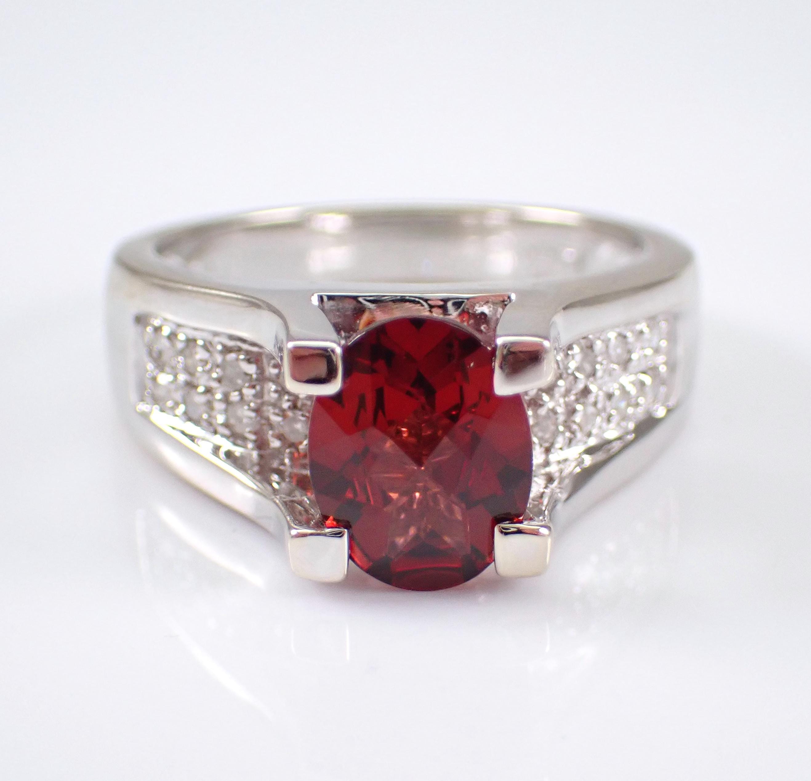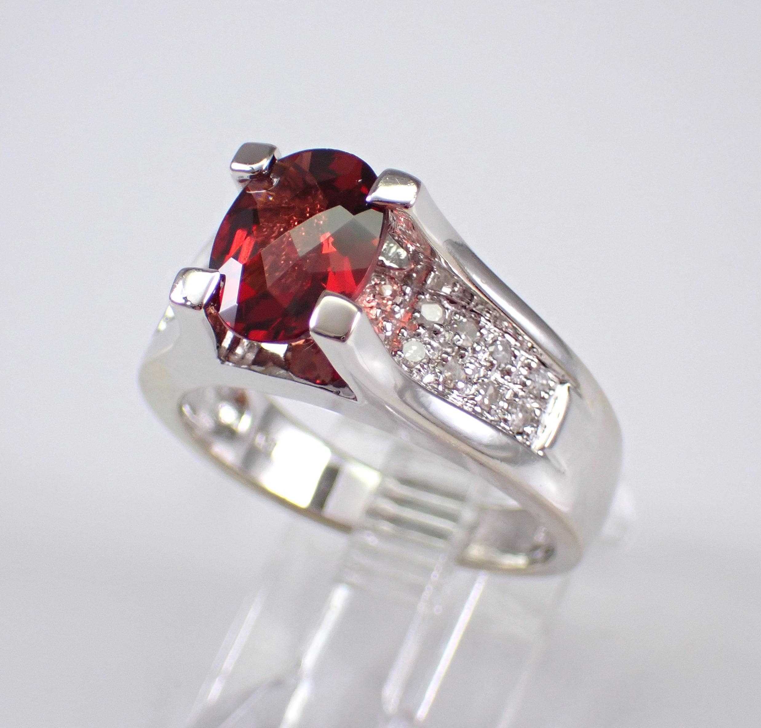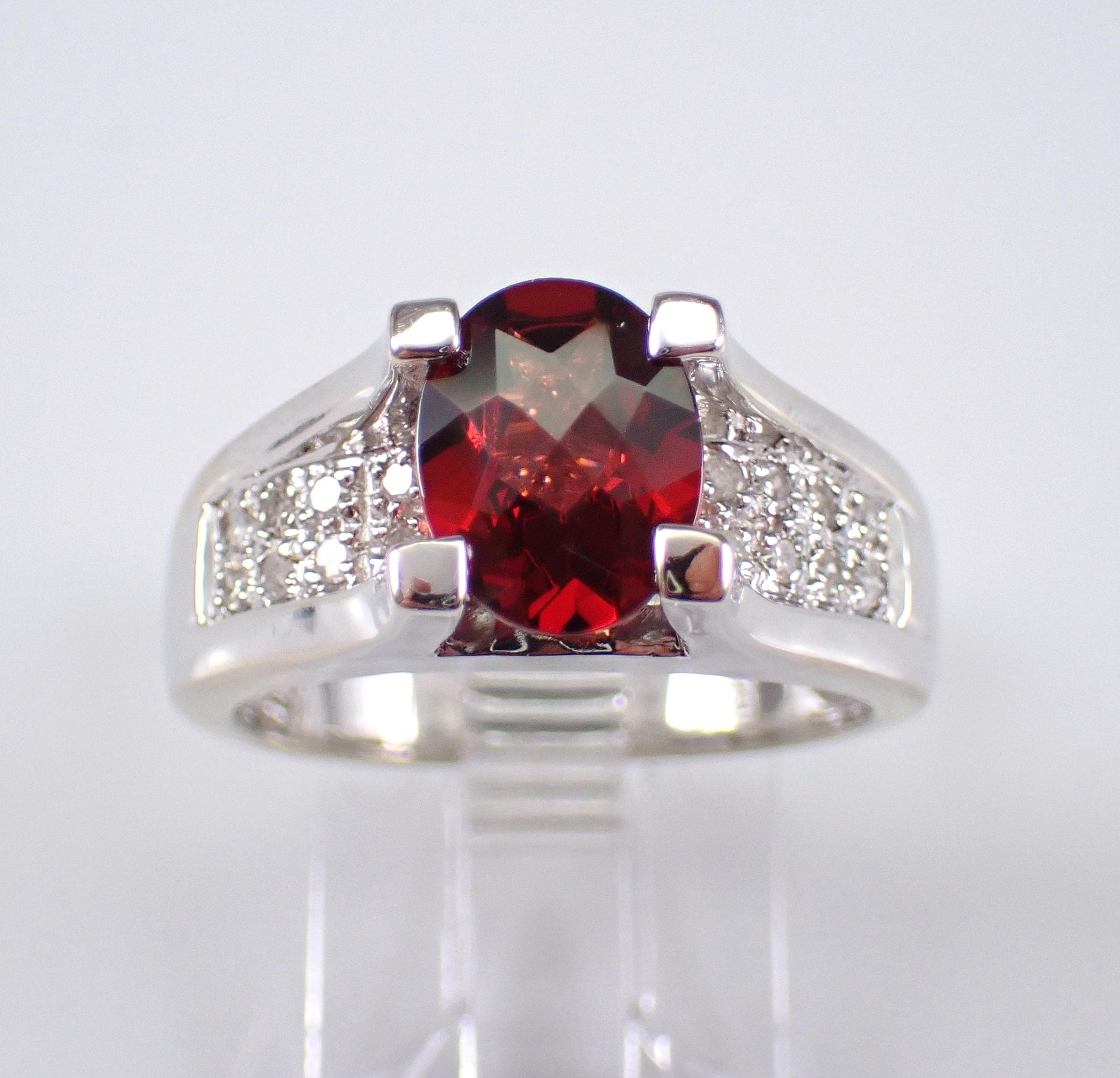 14K White Gold Diamond and Garnet Engagement Ring. This ring is set in the center with one genuine Checkerboard Oval Garnet and twenty Round Brilliant Diamonds. This Garnet measures 9 X 7 mm and weighs 2 carats. The diamonds are H color, I1 in clarity and weigh a total of .25 carat. This ring is 14KT White Gold, weighs 6.6 grams, the band measures 8 mm in width and is a finger size 7, which can be resized (please inquire about sizing with the finger size you need). This ring will be accompanied by an appraisal written by a GIA Certified Diamond Grader with the retail replacement value of $2,495.00. I will ship this ring promptly in a beautiful gift box.