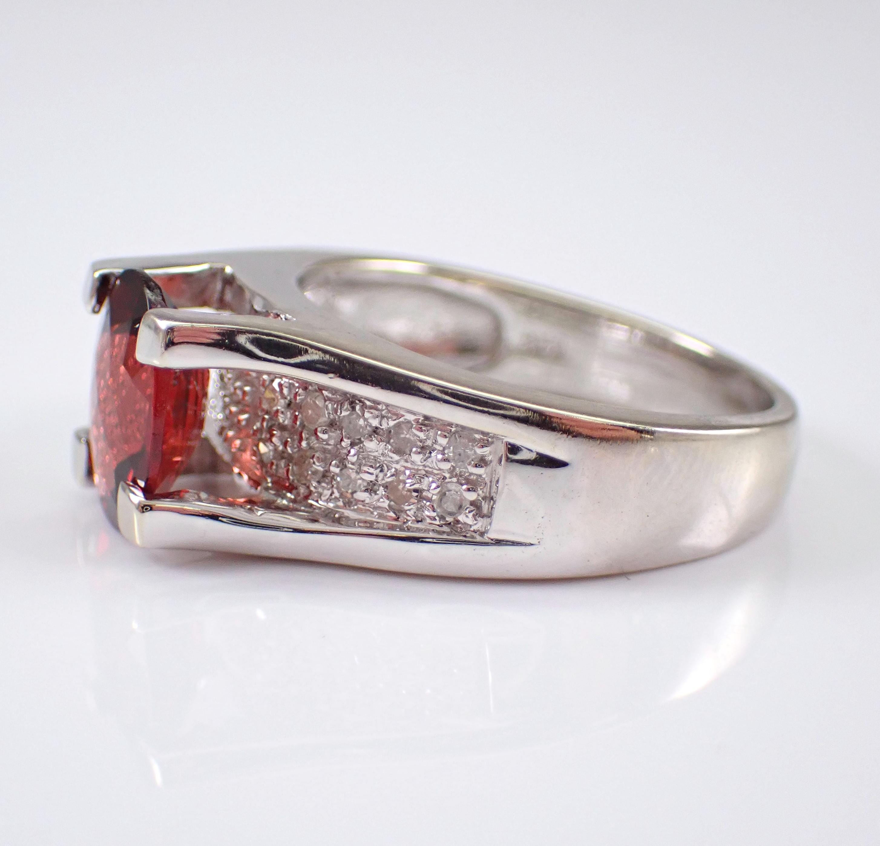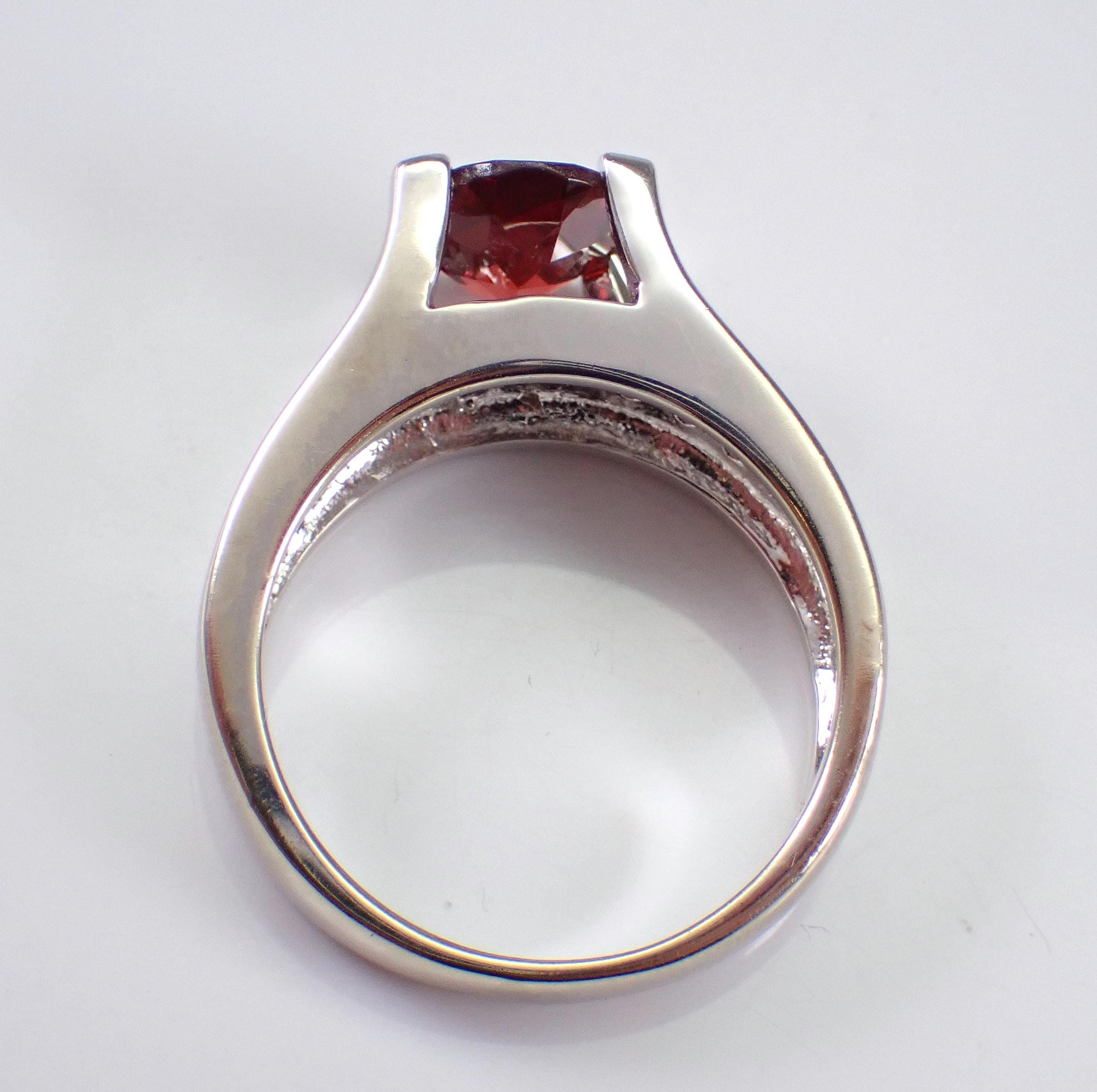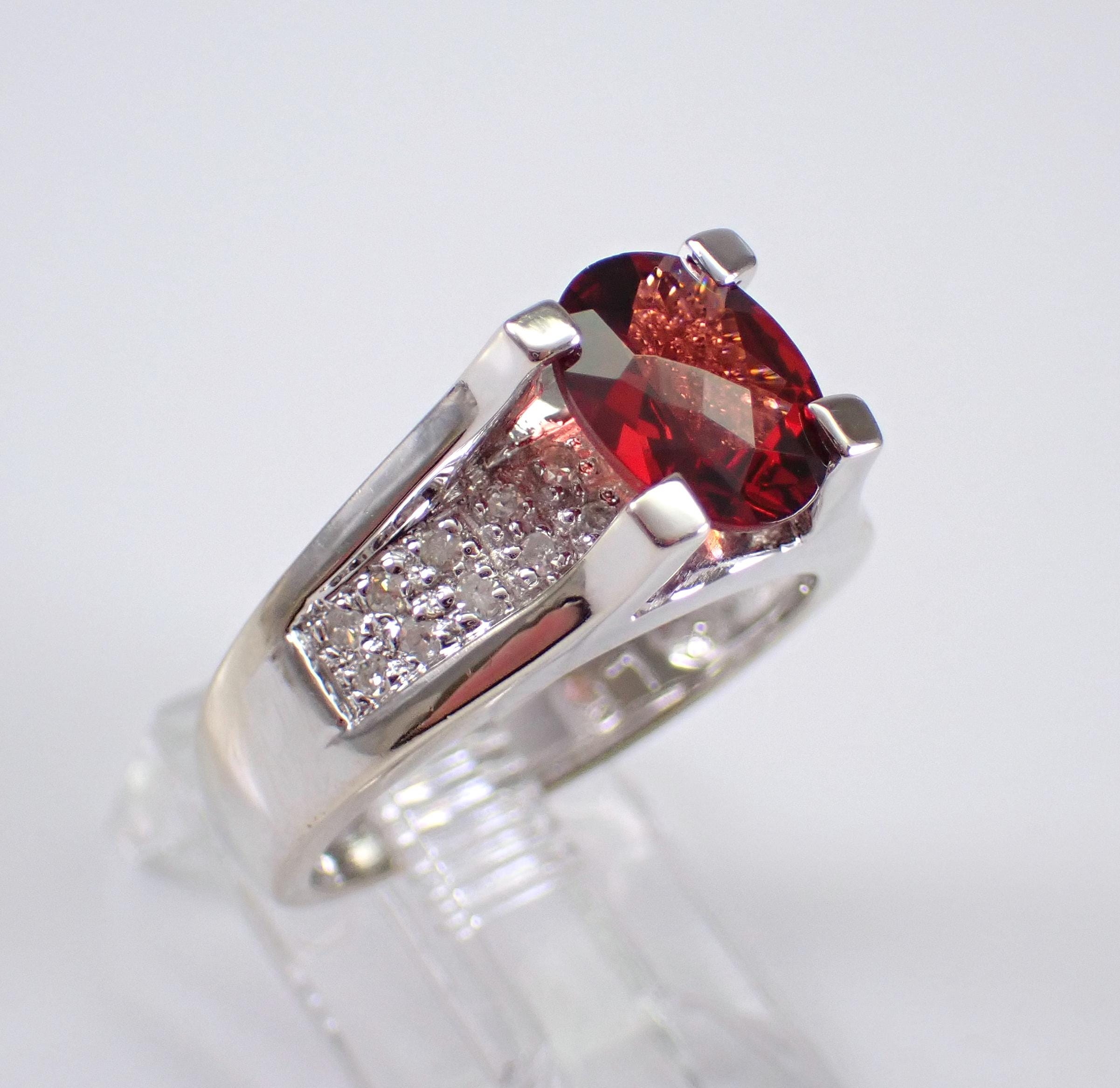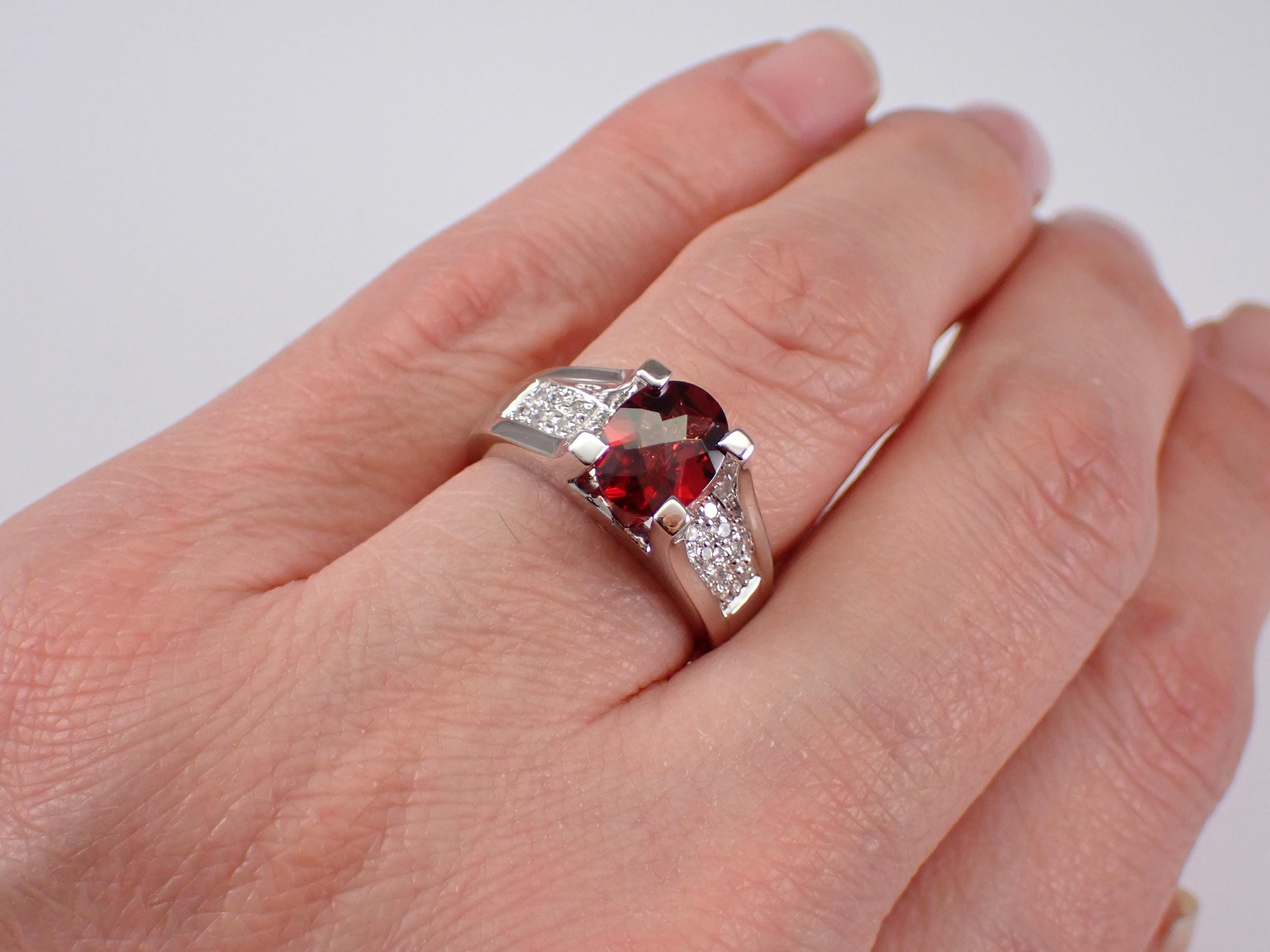 14K White Gold Diamond and Garnet Engagement Ring. This ring is set in the center with one genuine Checkerboard Oval Garnet and twenty Round Brilliant Diamonds. This Garnet measures 9 X 7 mm and weighs 2 carats. The diamonds are H color, I1 in clarity and weigh a total of .25 carat. This ring is 14KT White Gold, weighs 6.6 grams, the band measures 8 mm in width and is a finger size 7, which can be resized (please inquire about sizing with the finger size you need). This ring will be accompanied by an appraisal written by a GIA Certified Diamond Grader with the retail replacement value of $2,495.00. I will ship this ring promptly in a beautiful gift box.