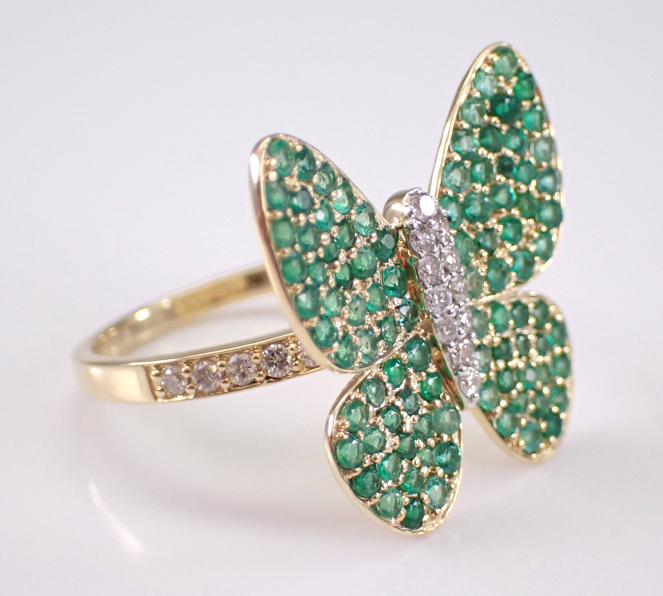 14K Yellow Gold Emerald and Diamond Butterfly Ring. This ring is set with ninety-four genuine Round Emeralds and twenty-five natural Round Brilliant Diamonds. These diamonds are G color, SI clarity and weigh a total of .40 carat. The Emeralds in this ring amount to a total weight of 1 1/4 carat. This ring is solid 14KT Yellow Gold, weighs 5.1 grams and is a finger size 7, which can be resized free of charge (please inquire about sizing with the finger size you need). This ring will be accompanied by an appraisal with the retail replacement value of $3,895.00. I will ship this ring promptly in a gift box.