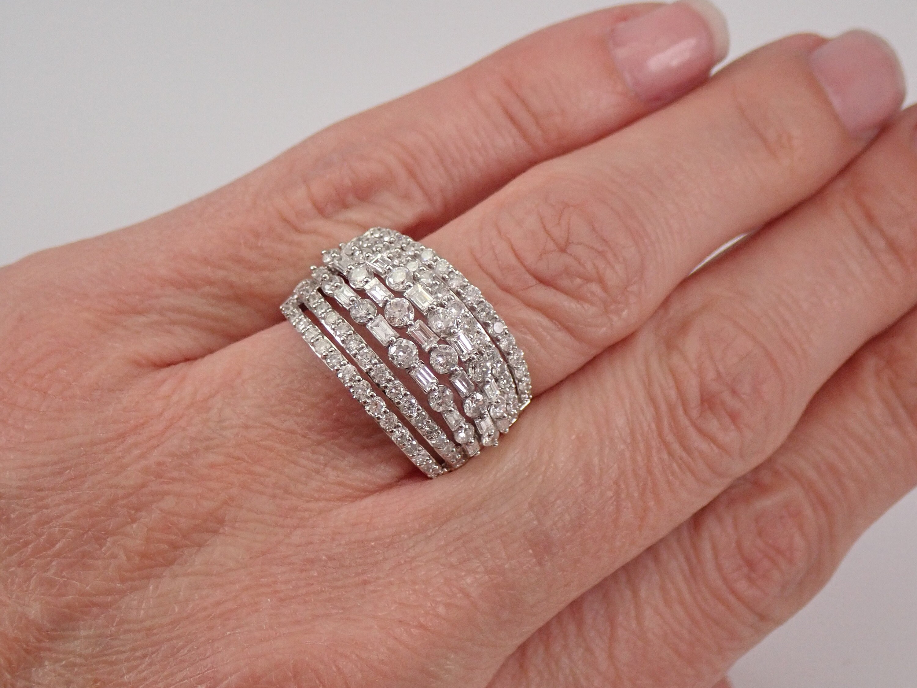 Platinum Diamond Wedding Ring Multi Row Anniversary Band. This ring is set with eighty genuine Round Brilliant Diamonds and seventeen Baguette Diamonds. These diamonds are H color, SI/I1 clarity and weigh a total of 2.06 carats. This ring is Platinum, weighs 9.5 grams, measures 14 mm in width at its widest point and is a finger size 8, which can be resized (please inquire about sizing with the finger size you need). This ring will be accompanied by an appraisal by a GIA Certified Diamond Grader with the retail replacement value of $5,795.00. I will ship this ring promptly in a gift box.