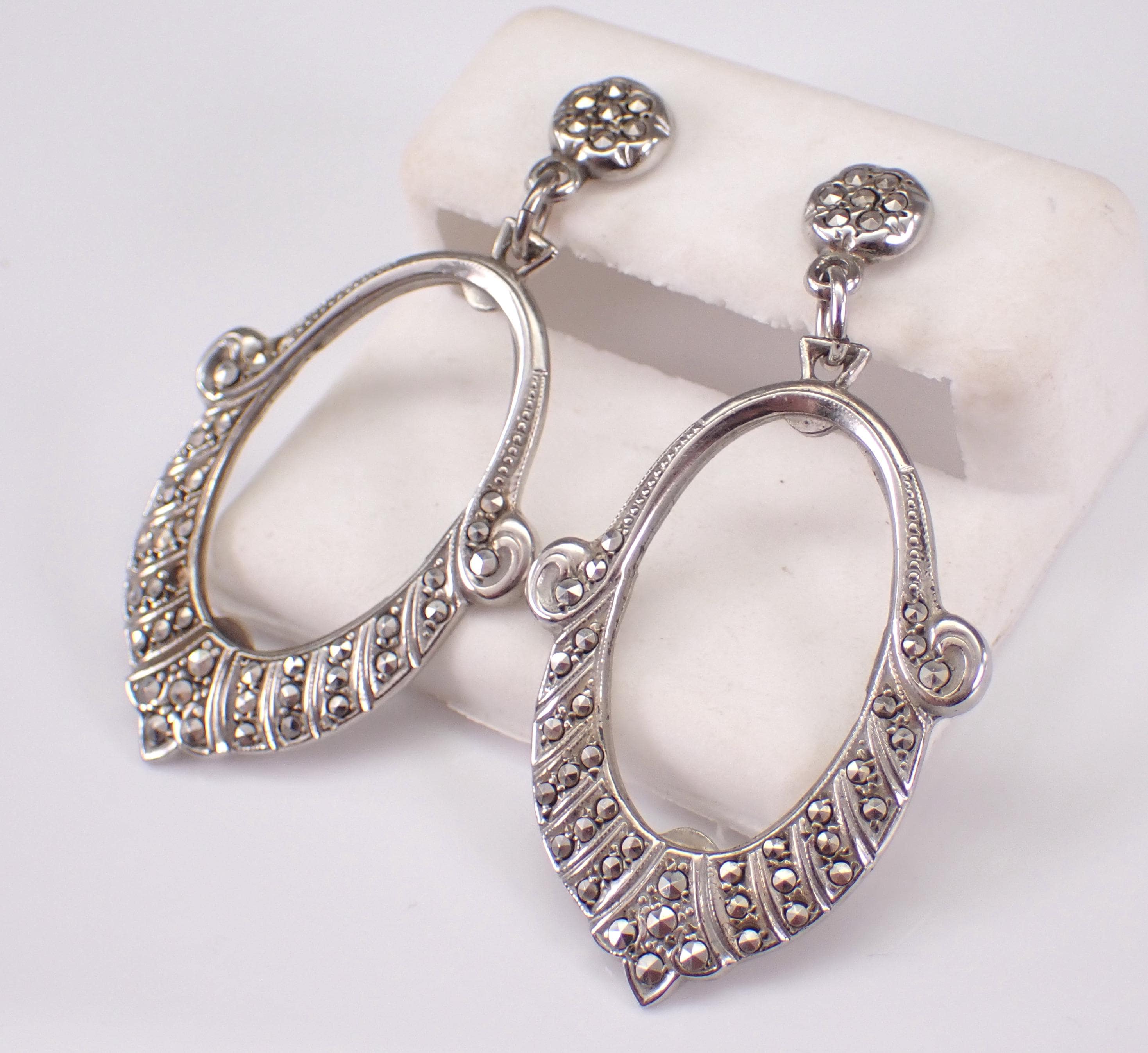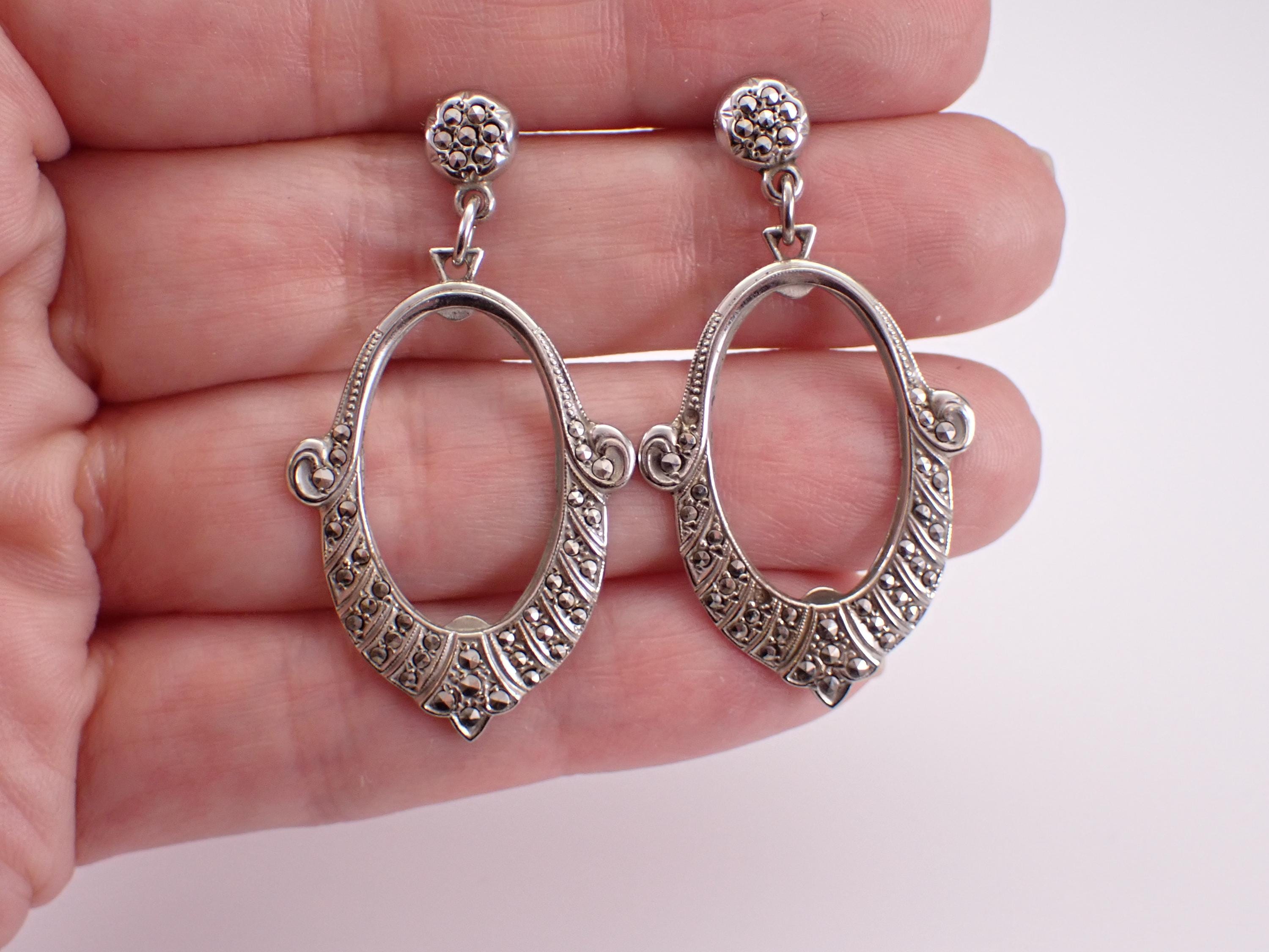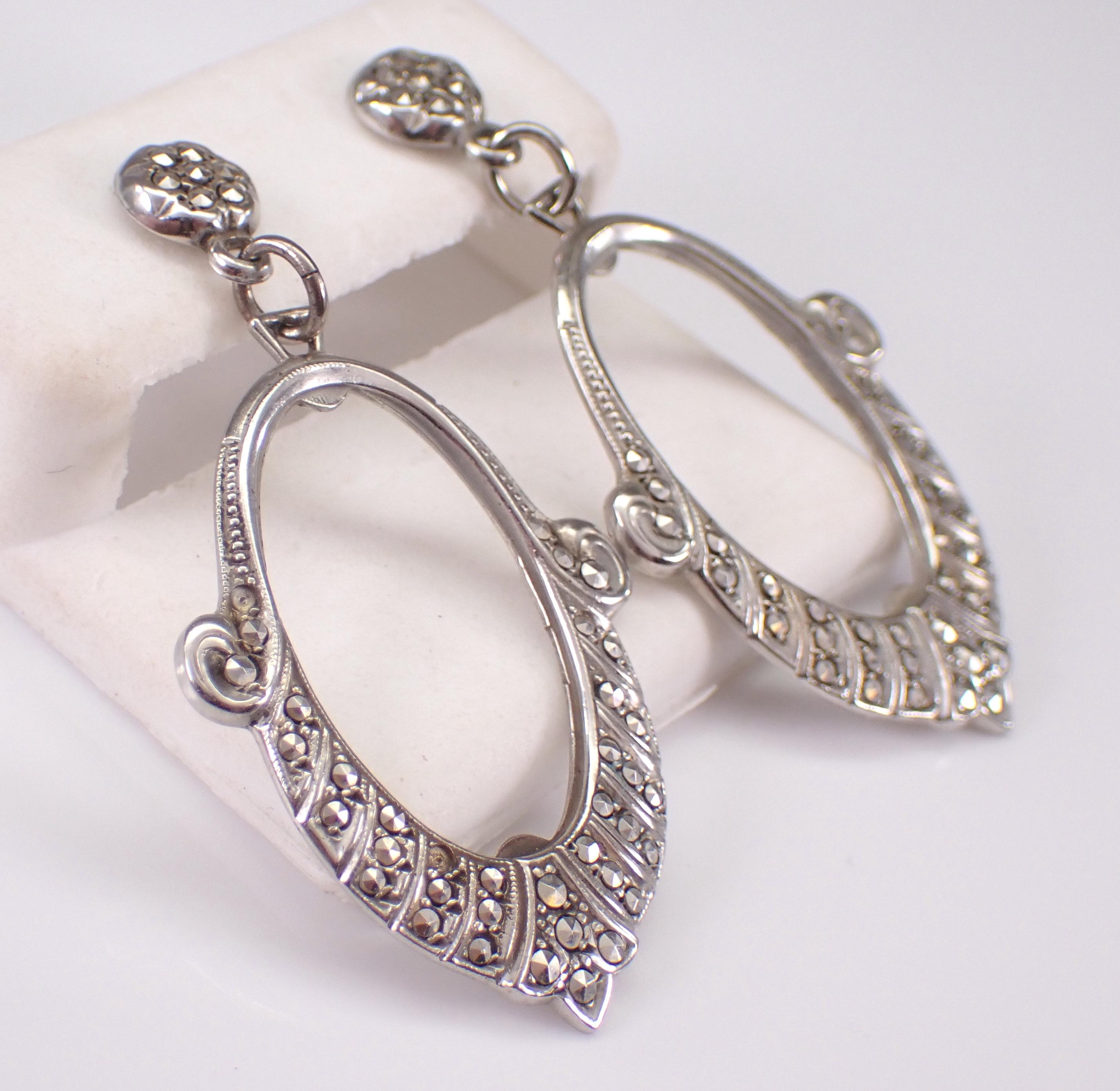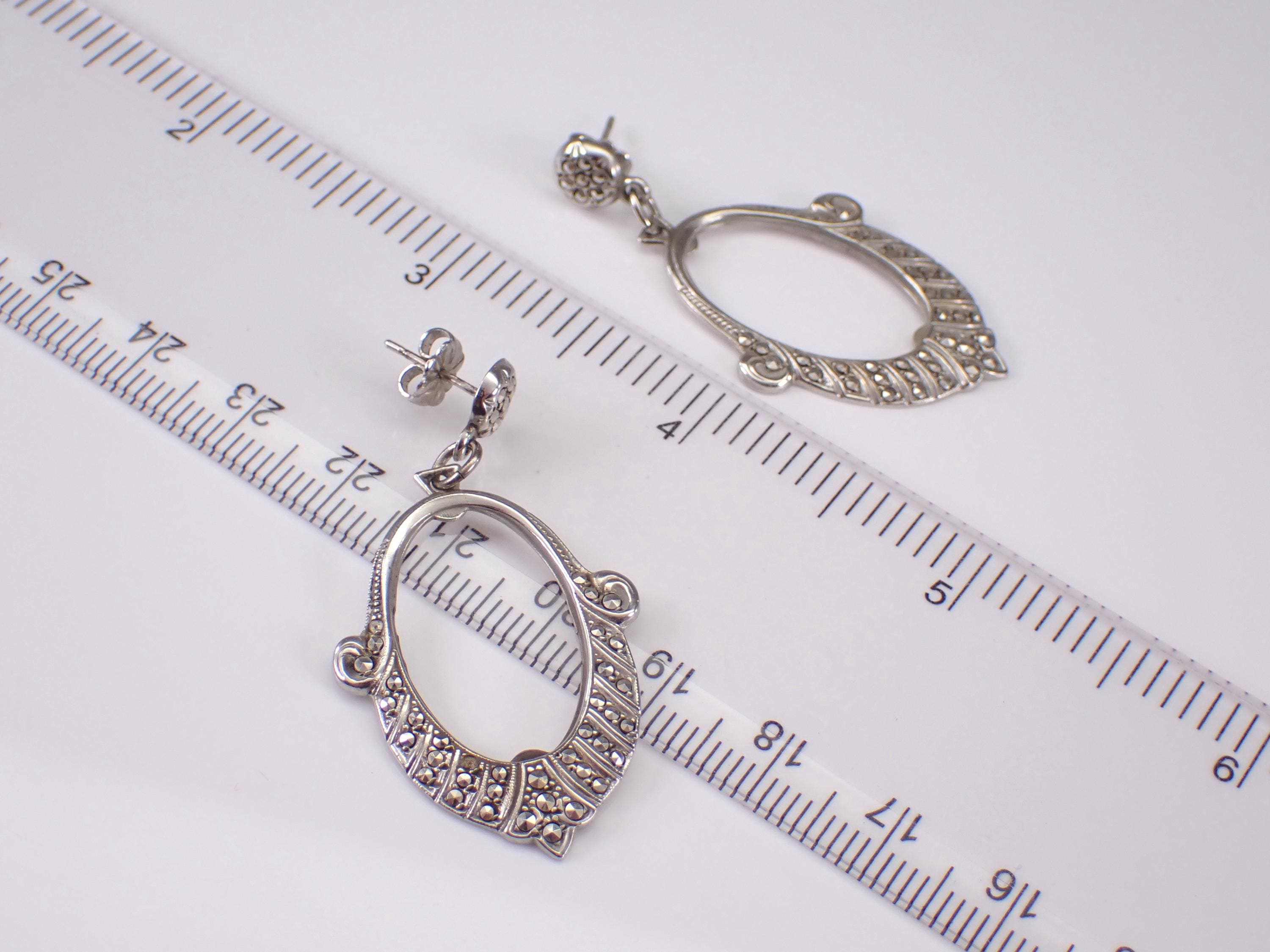 Beautiful and unique dangle earrings are crafted of 925 Sterling Silver. These earrings are set with Marcasite throughout (one little stone is missing on one of the earrings, barely visible). Each earring measures 44 mm in length and the weigh a total of 5.6 grams. These earrings will be shipped promptly in a gift pouch.