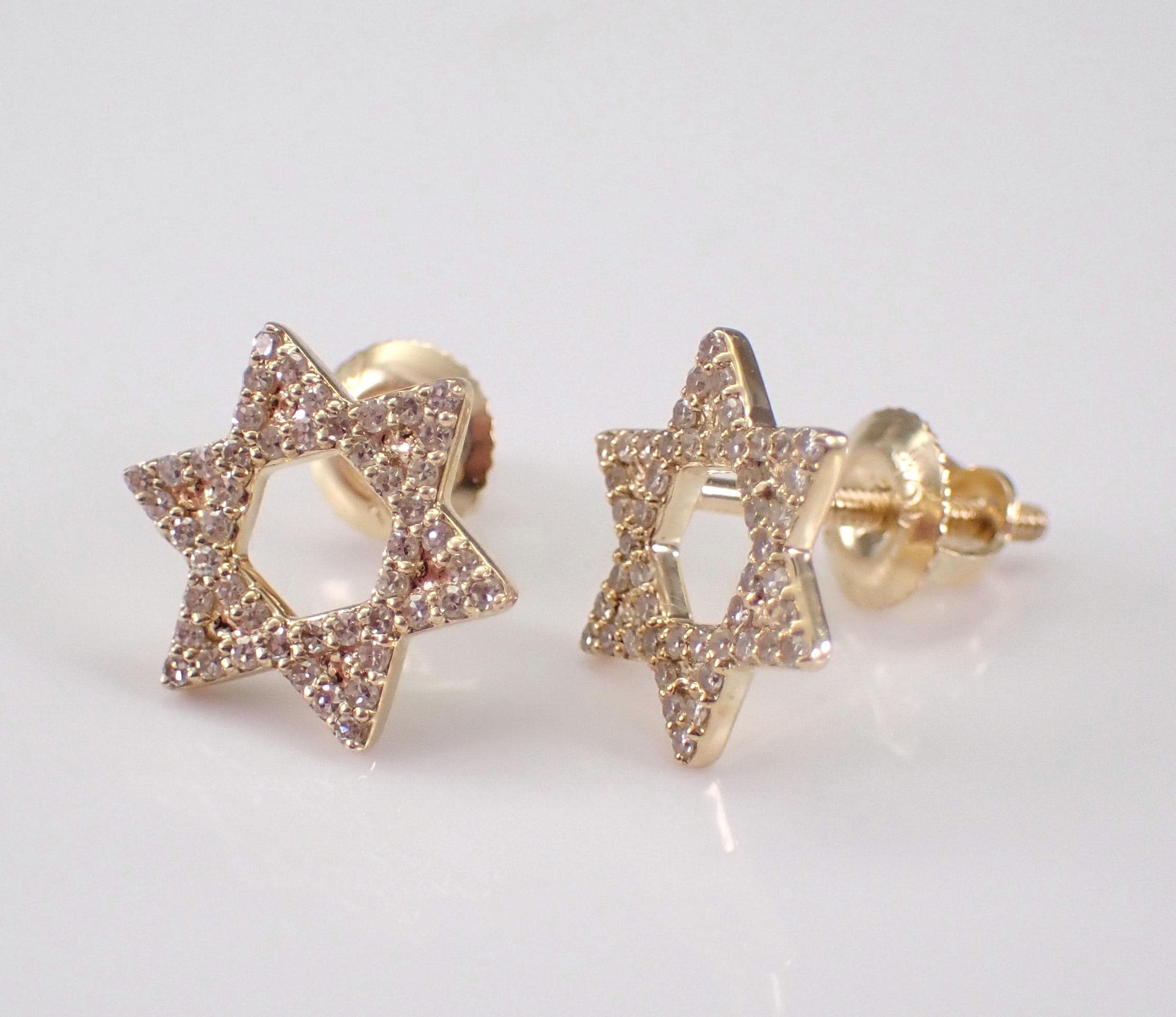 Yellow Gold Diamond Star of David Stud Earrings. These earrings are set with forty-eight natural Round Brilliant Diamonds in EACH earring. These Diamonds are very sparkly and brilliant, are H color, SI/I clarity and amount to a total weight of .20 carat. These earrings are 10K Yellow Gold, weigh 1.0 grams and measure 9.5 X 8 mm each. These earrings are for pierced ears and the earrings have secure screw back posts. These earrings will be accompanied by an appraisal written by a GIA Certified Diamond Grader with the retail replacement value of $1,395.00. I will ship these earrings promptly in a gift box.