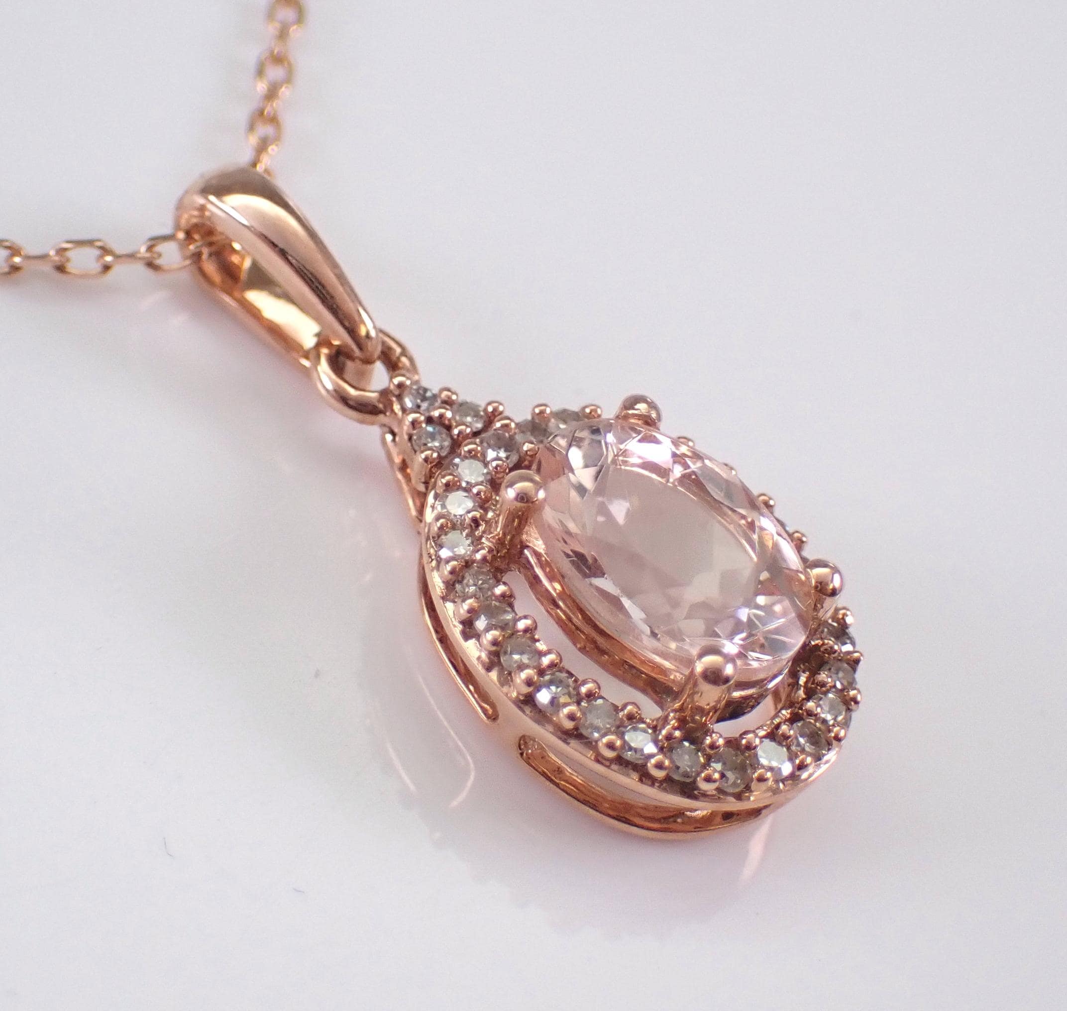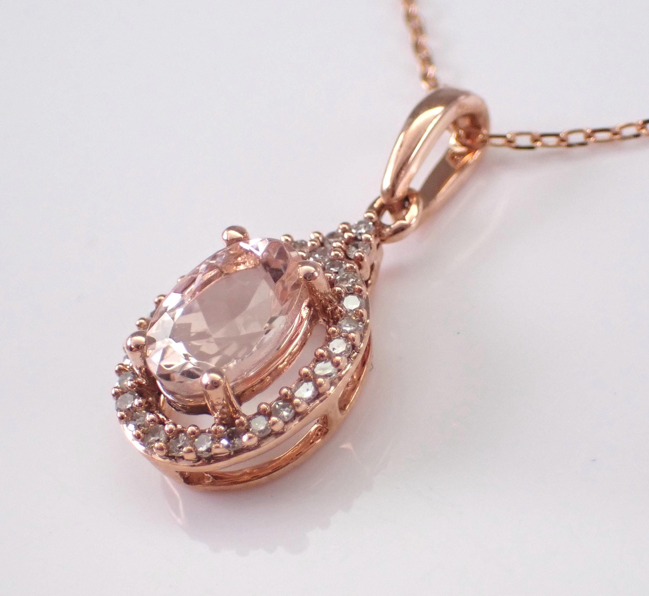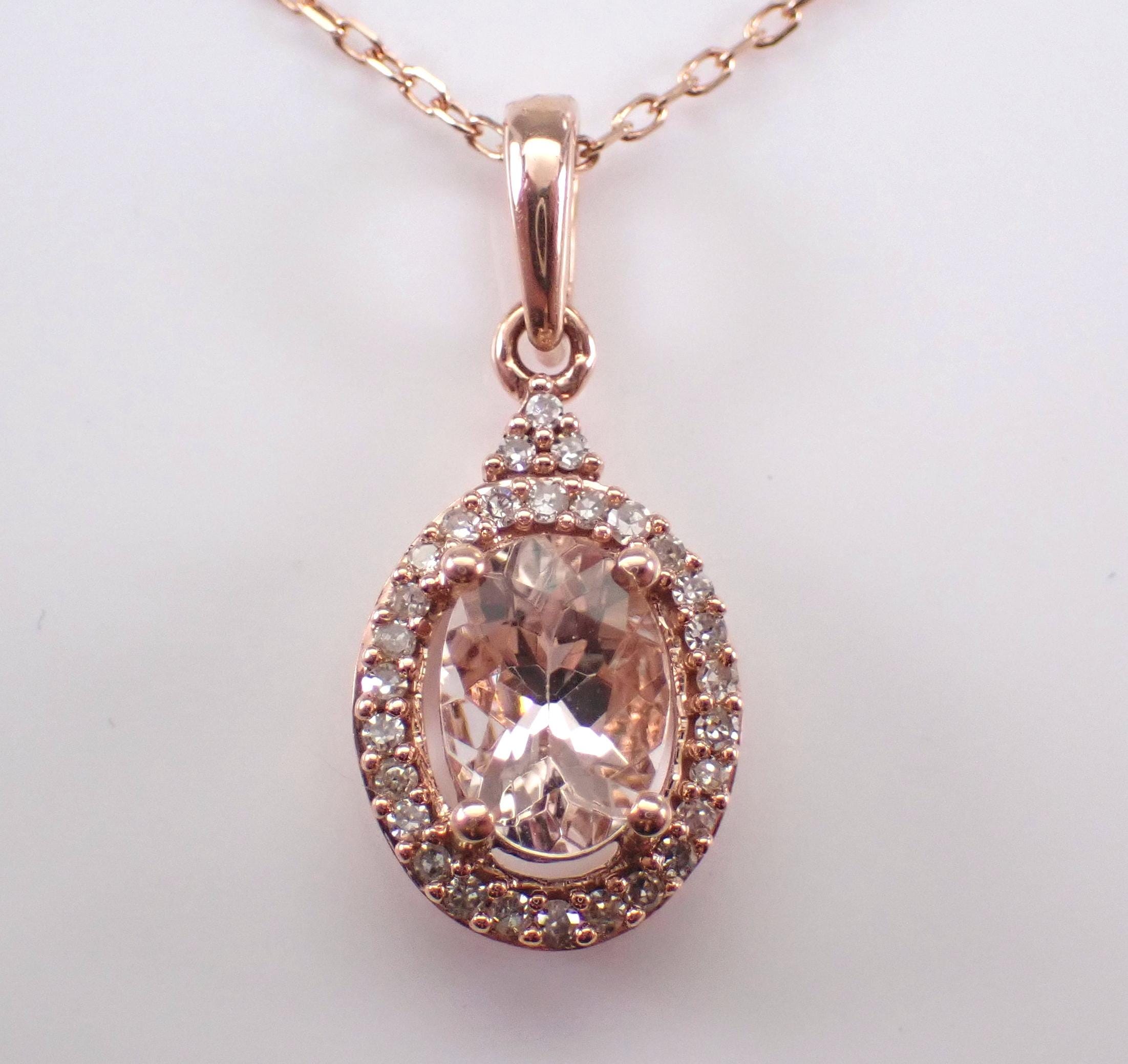 Rose Gold Diamond and Morganite Pendant Necklace and chain. There is one Oval Morganite set in this pendant. This Morganite measures 7 X 5 mm and weighs 1 carat. There are fifty-five genuine Round Brilliant Diamonds set in this pendant. These diamonds are H color, SI/I clarity and weigh a total of .15 carat. This pendant is 10KT Rose Gold, comes with an 18" 10K Rose Gold chain and together with the chain weighs 1.9 grams. This pendant measures 13 X 8.5 mm without the bail. This necklace will be accompanied by an appraisal by a GIA Certified Diamond Grader with the retail replacement value of $1,495.00. I will ship this pendant promptly in a beautiful gift box.
