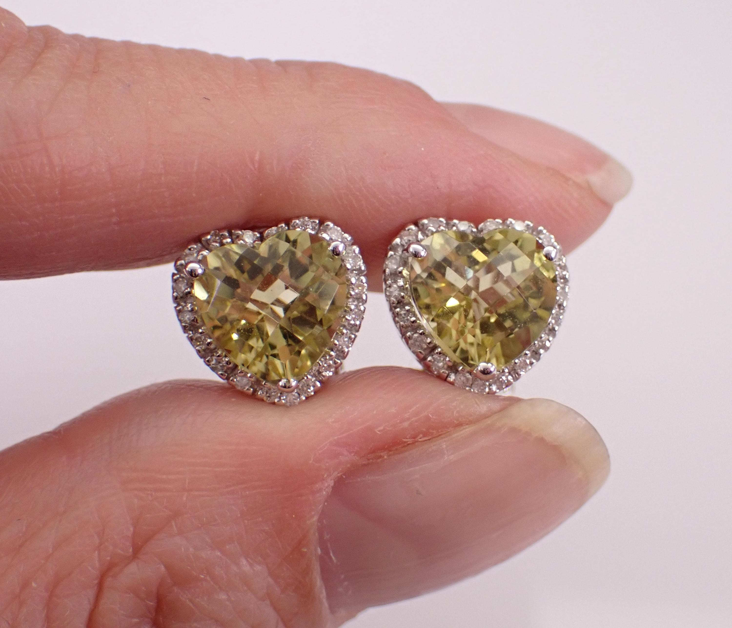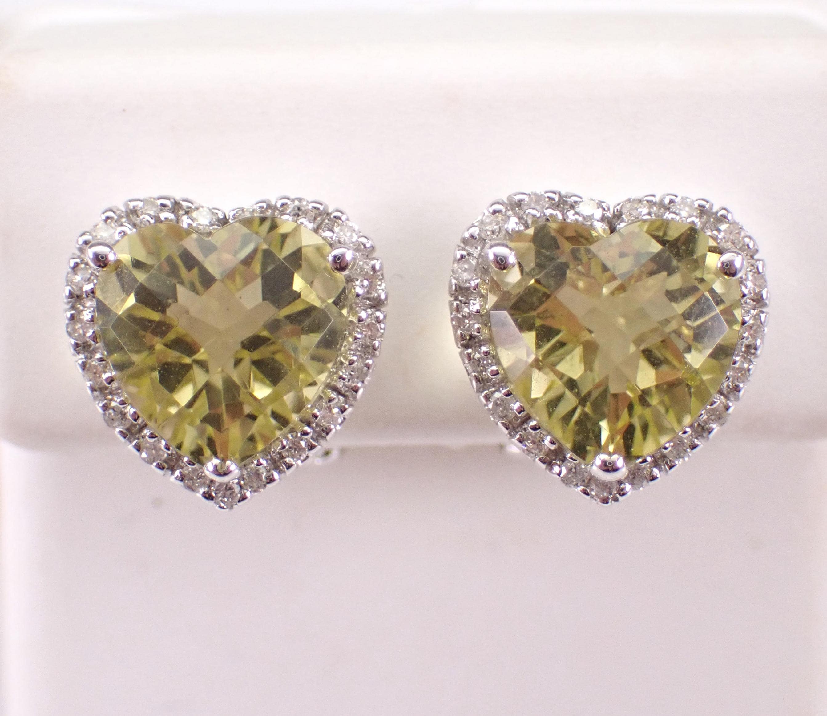 14K White Gold Lemon Quartz and Diamond Earrings. These earrings are set with two Heart shaped Lemon Quartz and thirty-eight Round Brilliant Diamonds. These diamonds are H color, SI/I clarity and weigh a total of .25 carat. The Lemon Quartz in these earrings are of a light green color, measure 9 X 9 mm each and weigh a total of 5 carats. These earrings are 14K White Gold and weigh a total of 4.6 grams. These earrings are for pierced ears and have secure Omega Clasp closures. These earrings measure 11 X 11 mm each. These earrings will be accompanied by an appraisal for insurance and authentication purposes. I will ship these earrings promptly in a gift box.