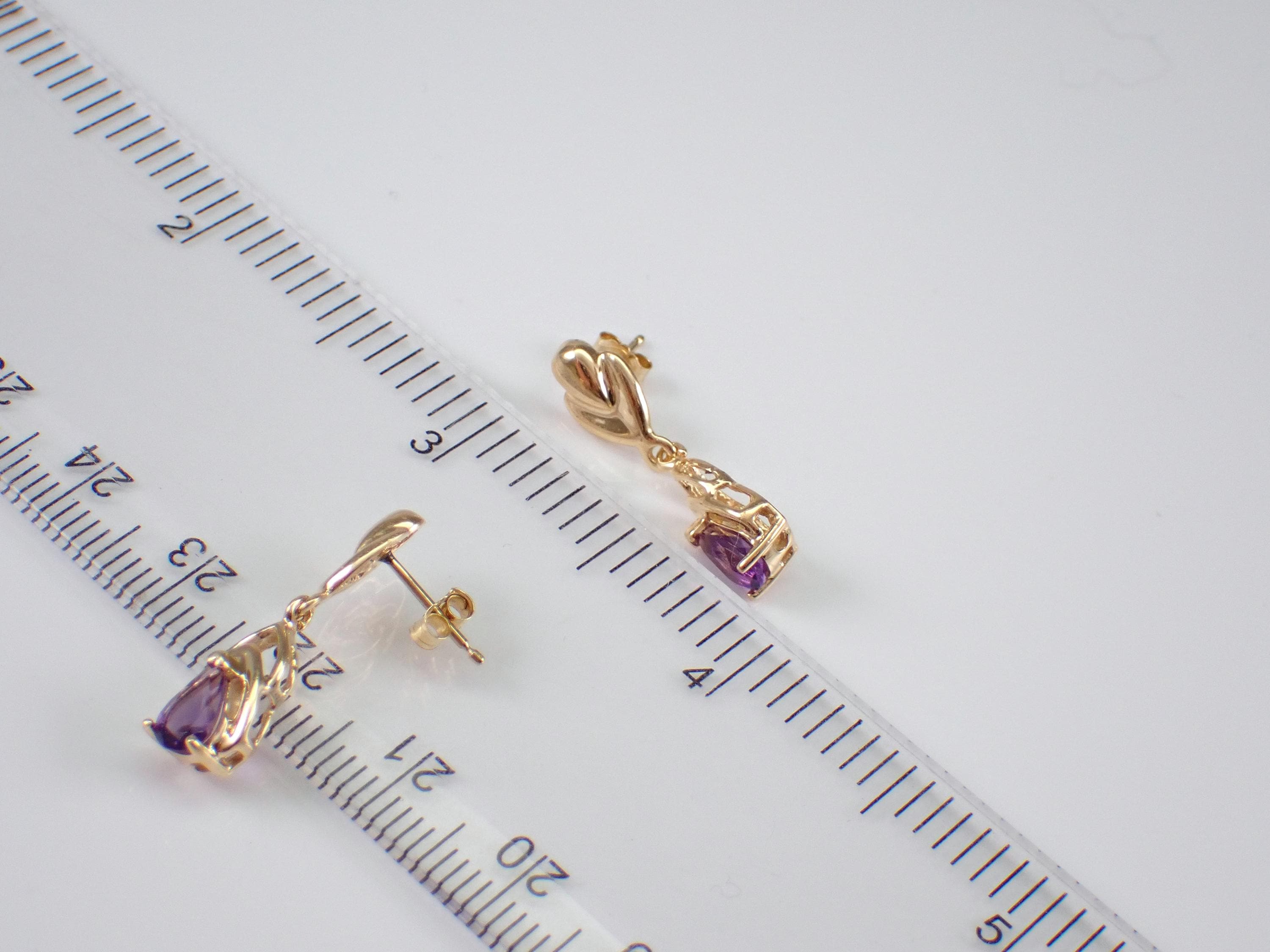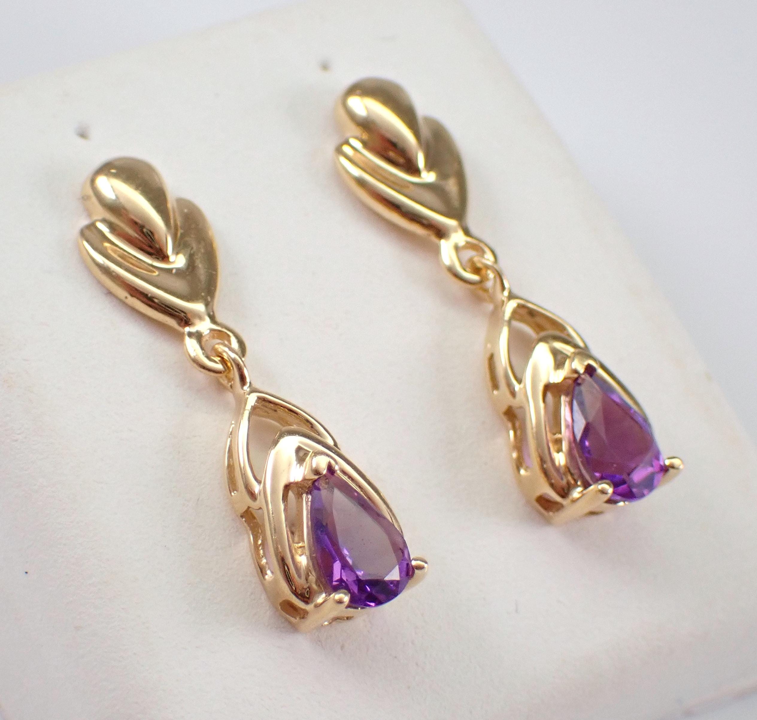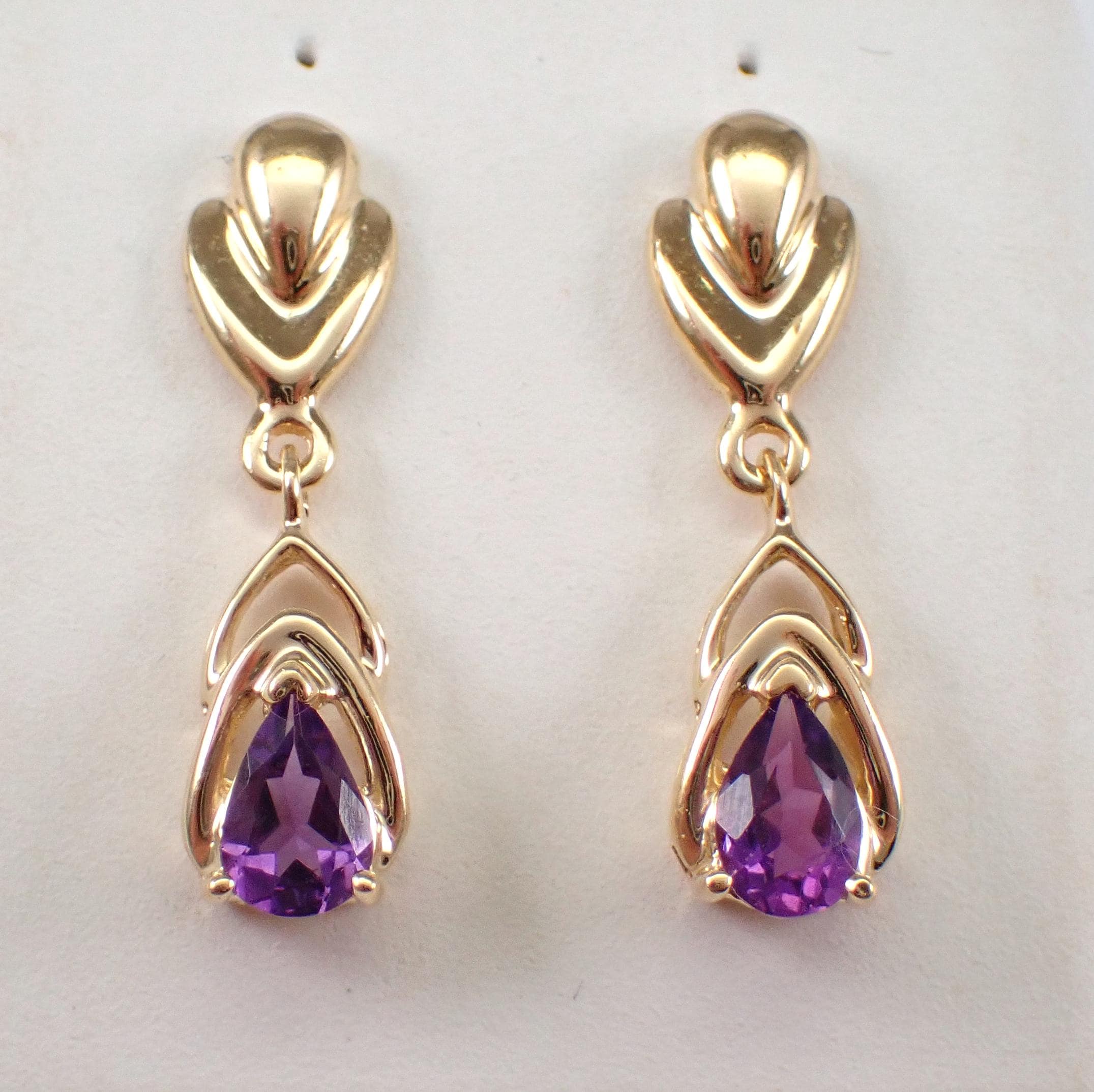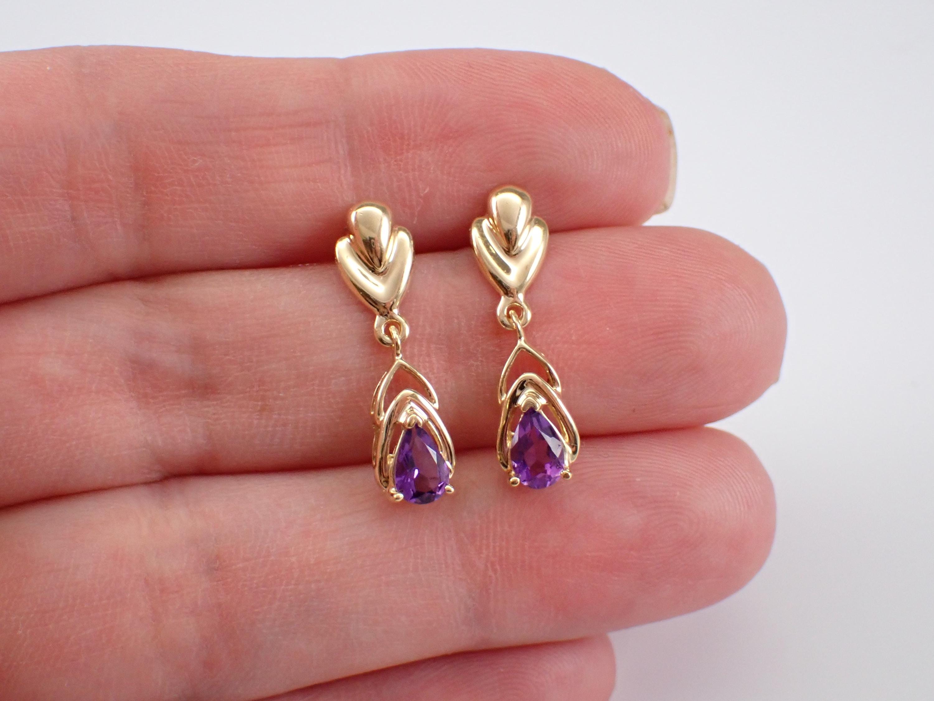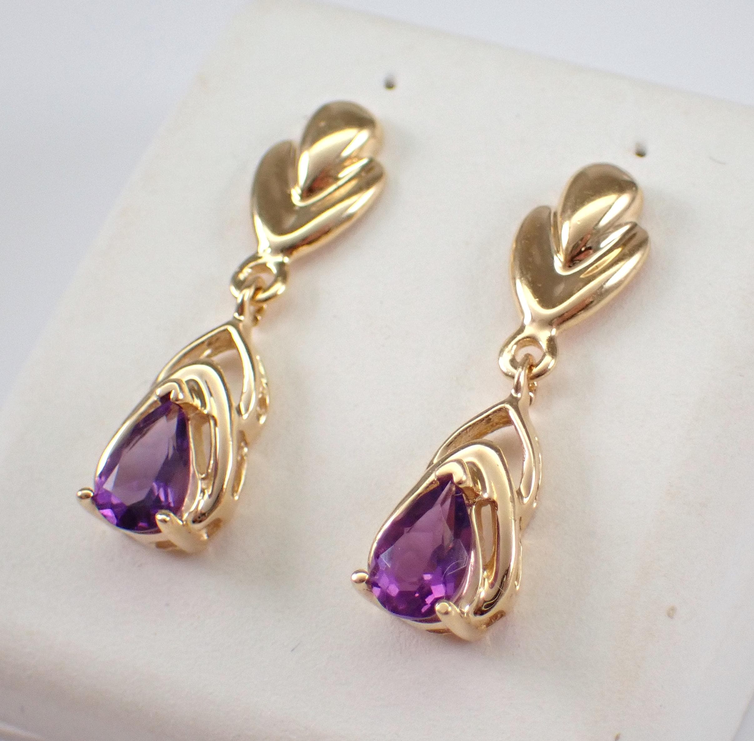 Vintage 14K Yellow Gold Amethyst Dangle Drop Earrings. There are two genuine Pear shaped Amethysts set in these earrings. These Amethysts are a beautiful purple color and measure 6 X 4 mm each. These earrings are 14KT Yellow Gold and weigh a total of 2.6 grams. These earrings are for pierced ears and measures 23 mm in length. These earrings will be accompanied by an appraisal with the retail replacement value of $1,095.00. I will ship these earrings promptly in a gift box.