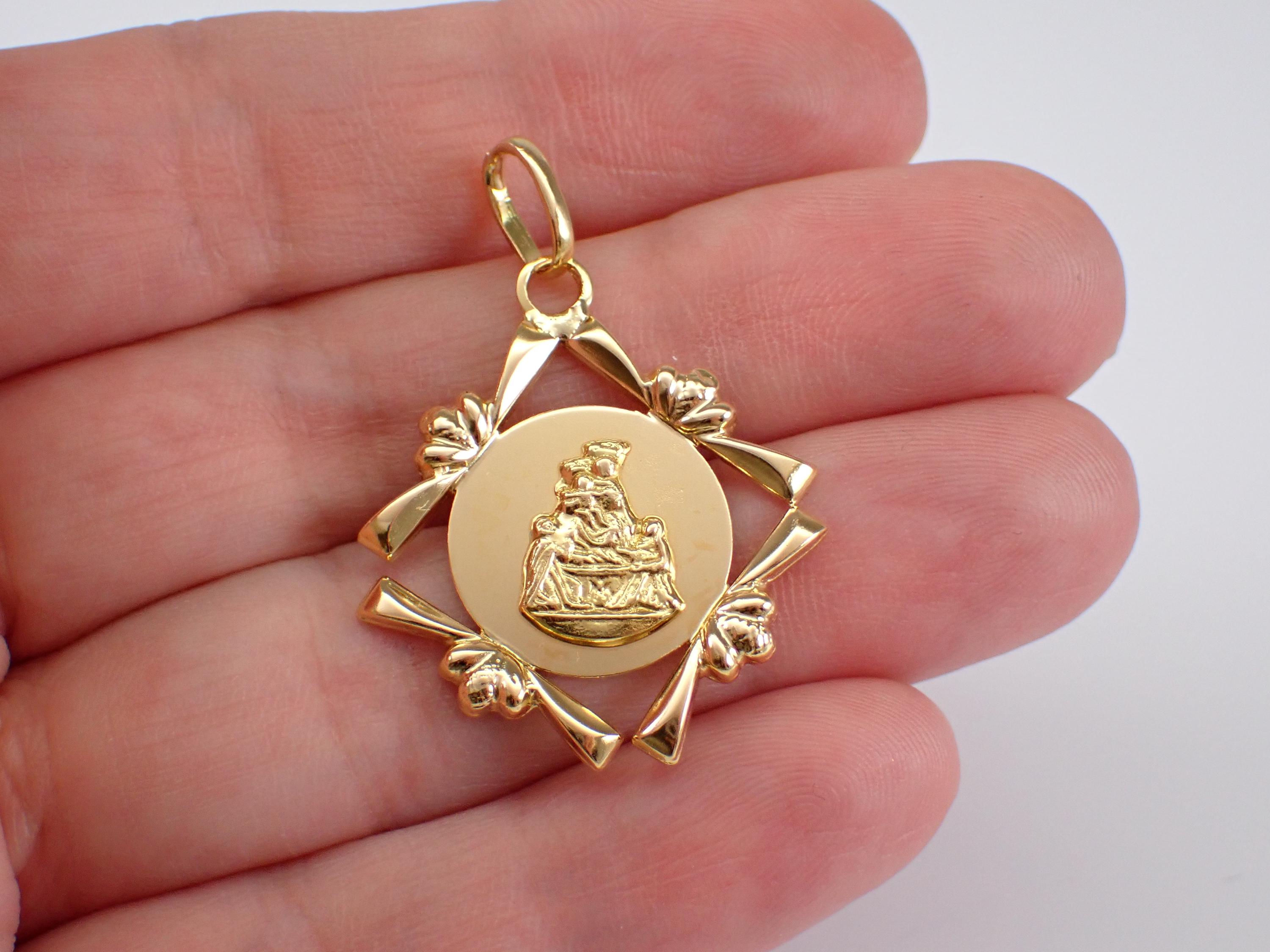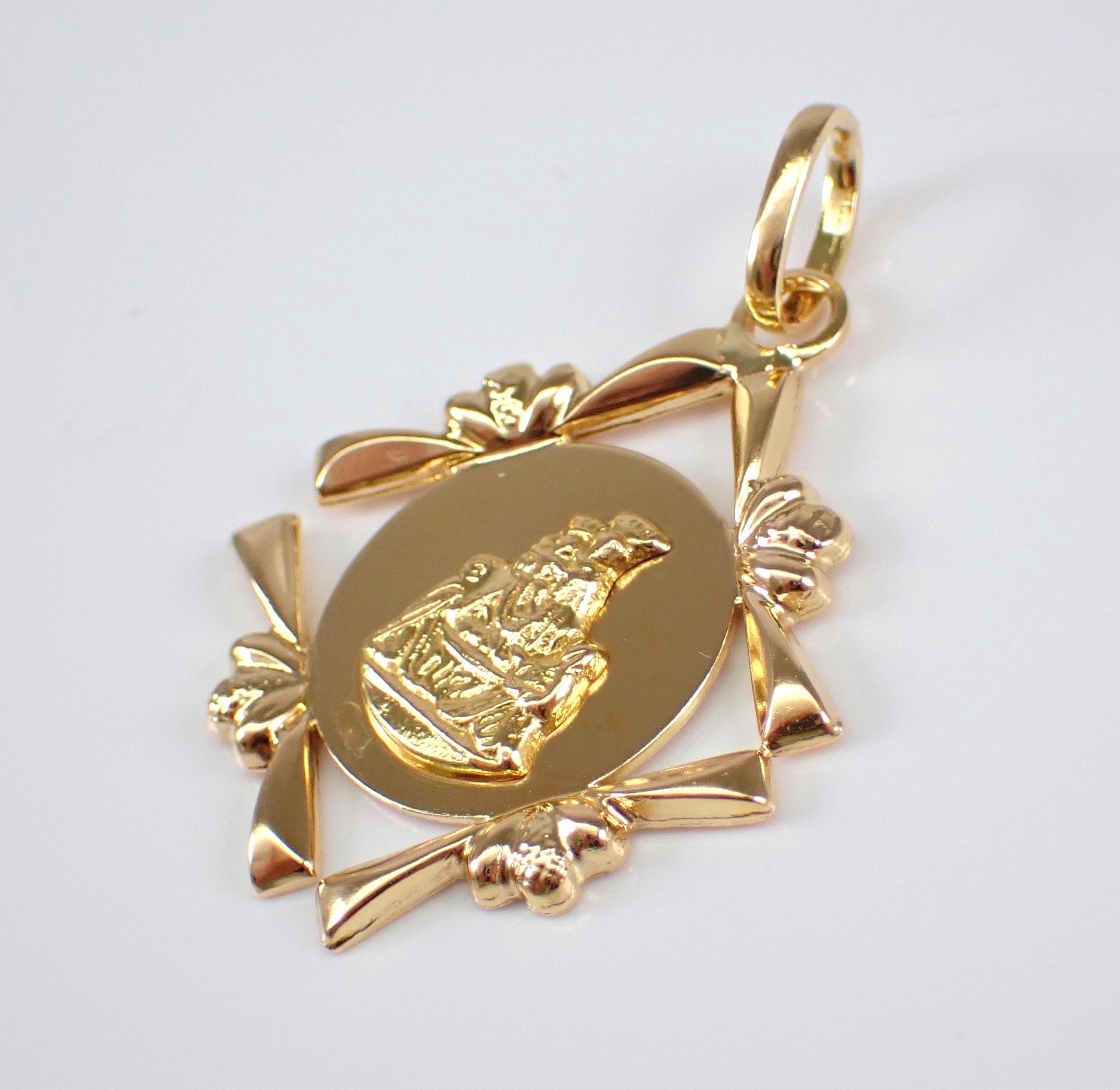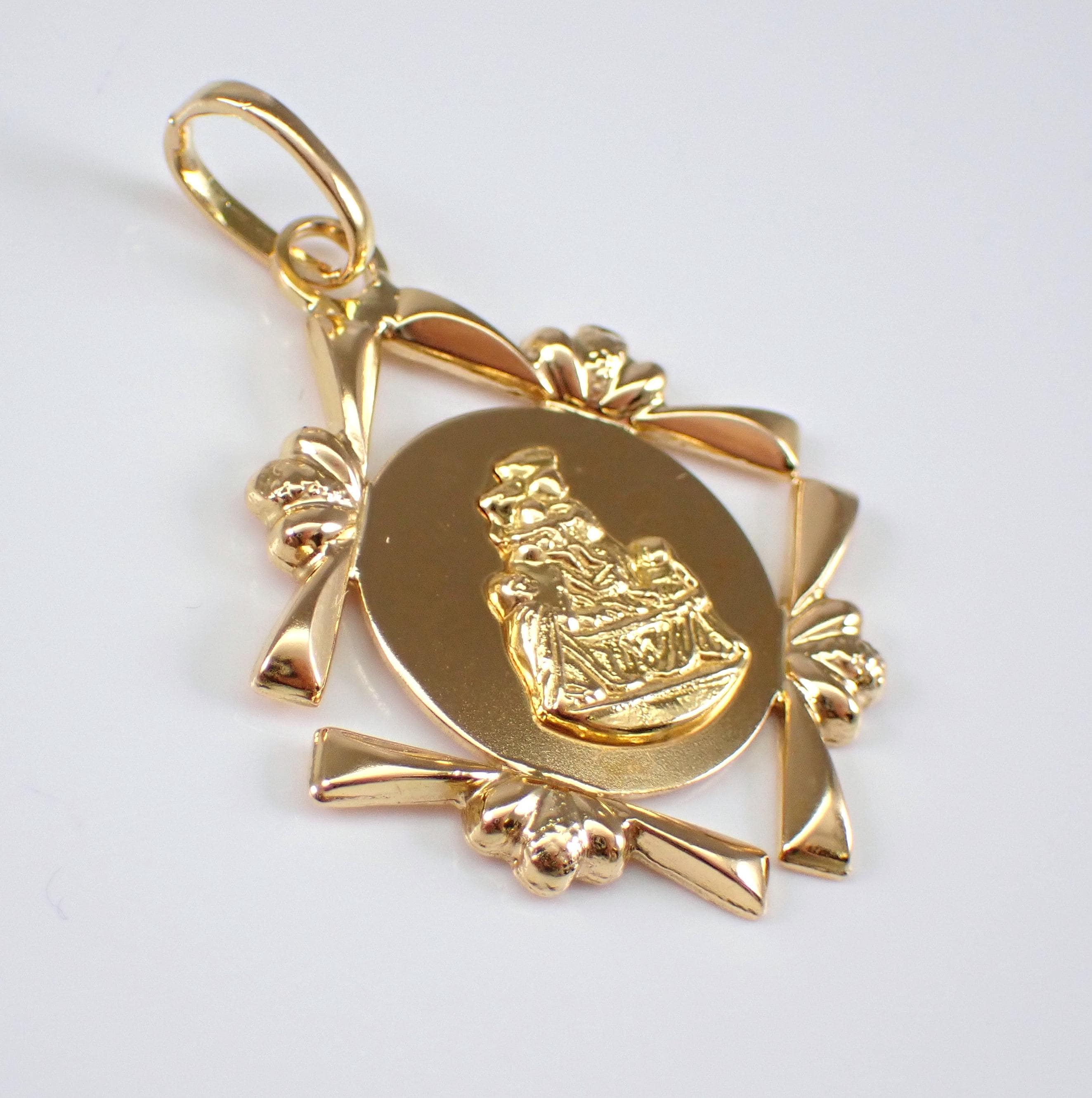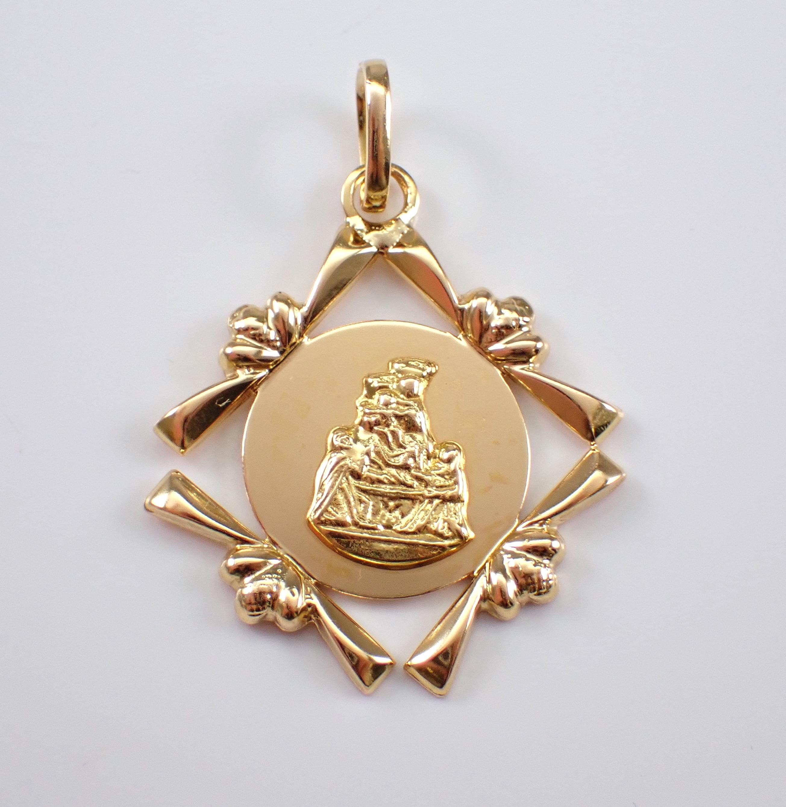 Vintage 18K Yellow Gold Our Lady of Pompeii Religious Medal Charm Pendant. This charm is 18K Yellow Gold and measures 30 X 27 mm without the bail. This charm weighs 4.1 grams. I will ship this pendant promptly in a beautiful gift box.
