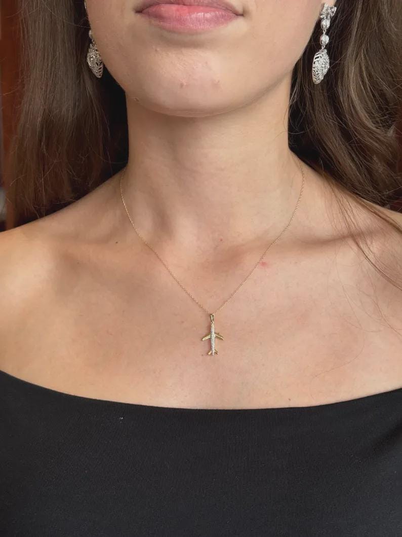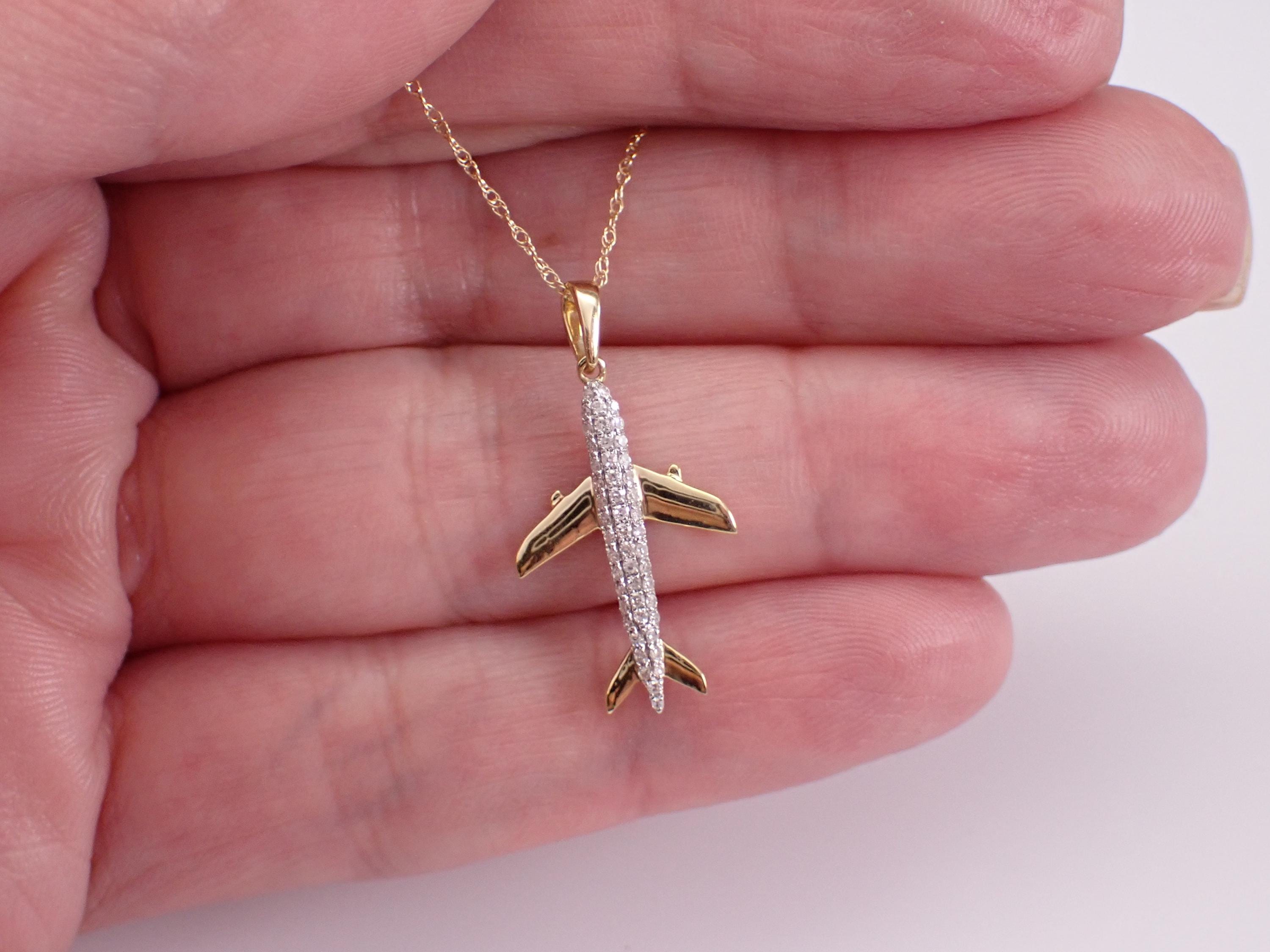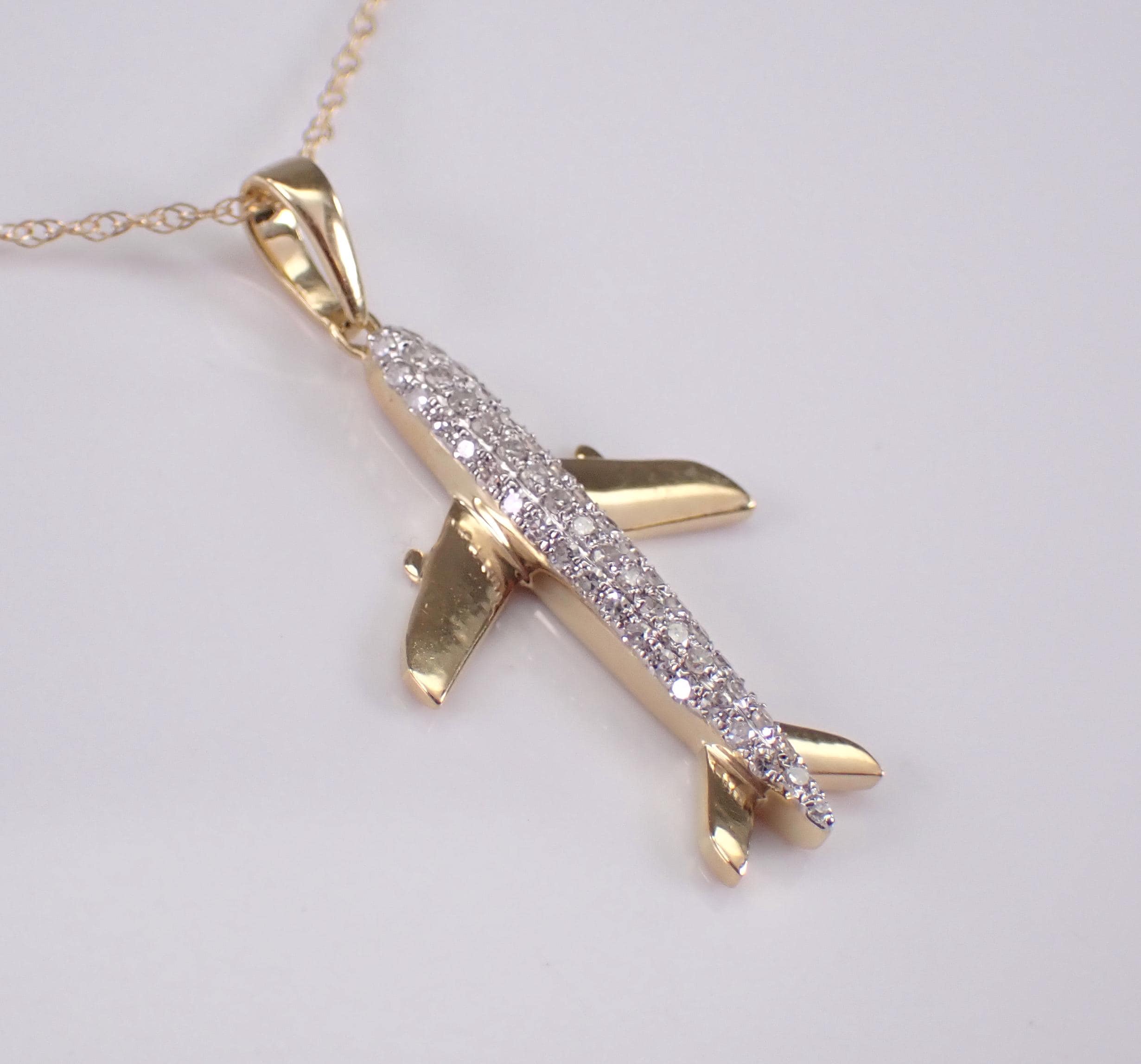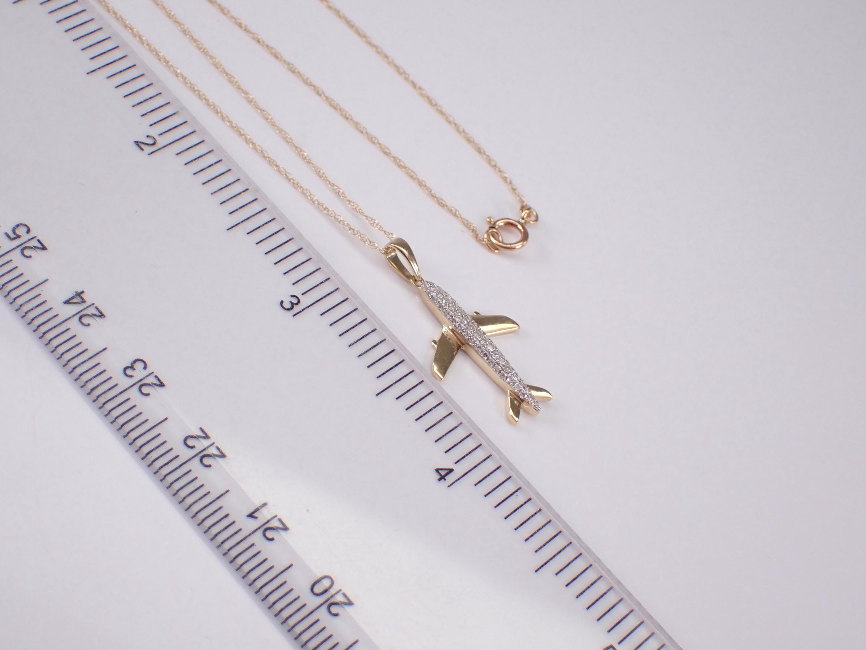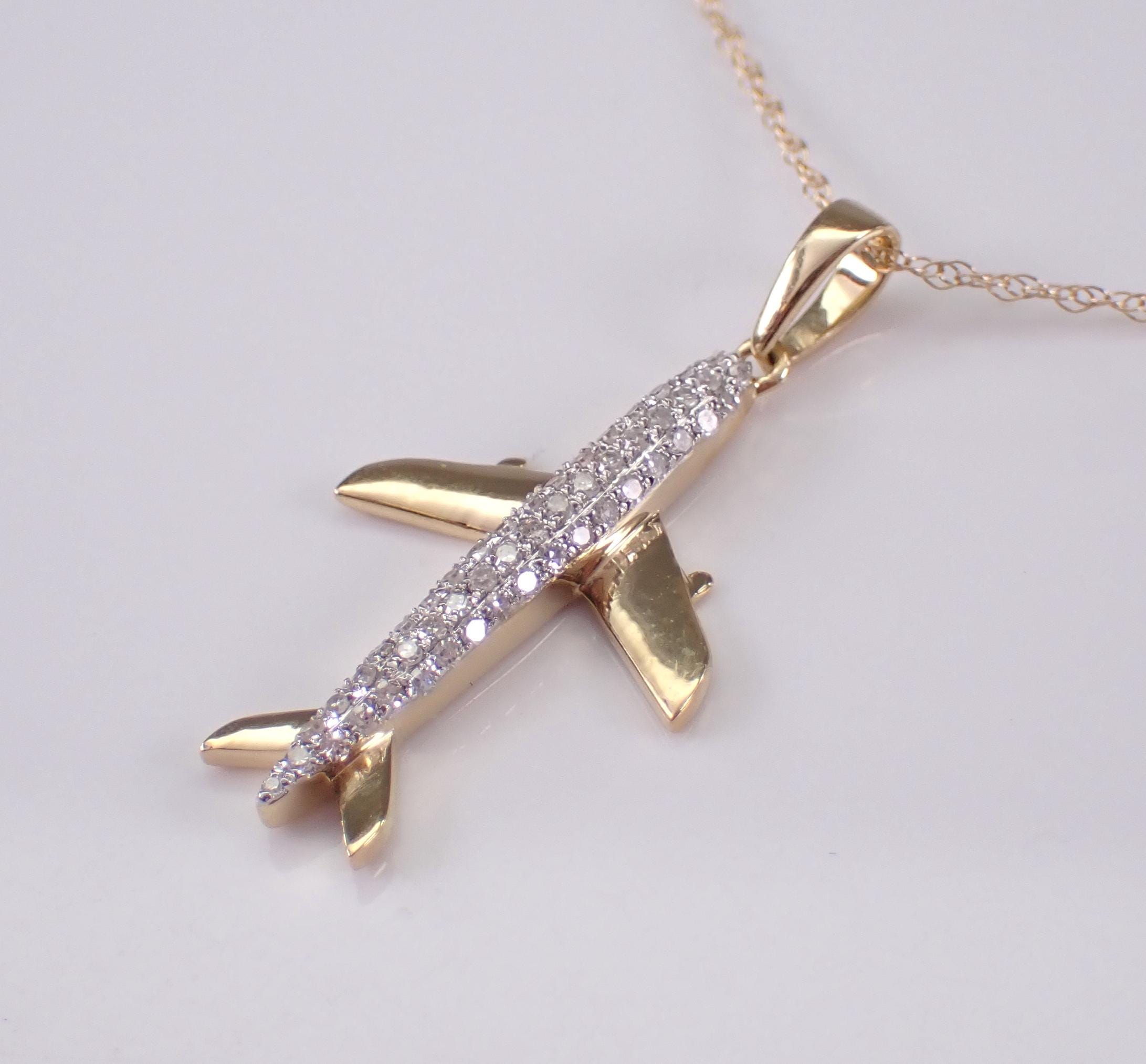 Yellow Gold Diamond Airplane Charm Pendant with Chain. This necklace is set with forty-eight genuine natural round diamonds. These diamonds are H color, SI/I clarity and weigh a total of .20 carat. This pendant is 10KT Yellow Gold and comes with an 18" 10K Yellow Gold chain. Both the pendant and chain weigh a total of 1.5 grams and the pendant alone measures 21 X 13 mm. This necklace will be accompanied by an appraisal written by a GIA Certified Diamond Grader with the retail replacement value of $1,395.00. I will ship this necklace promptly in a beautiful gift box.