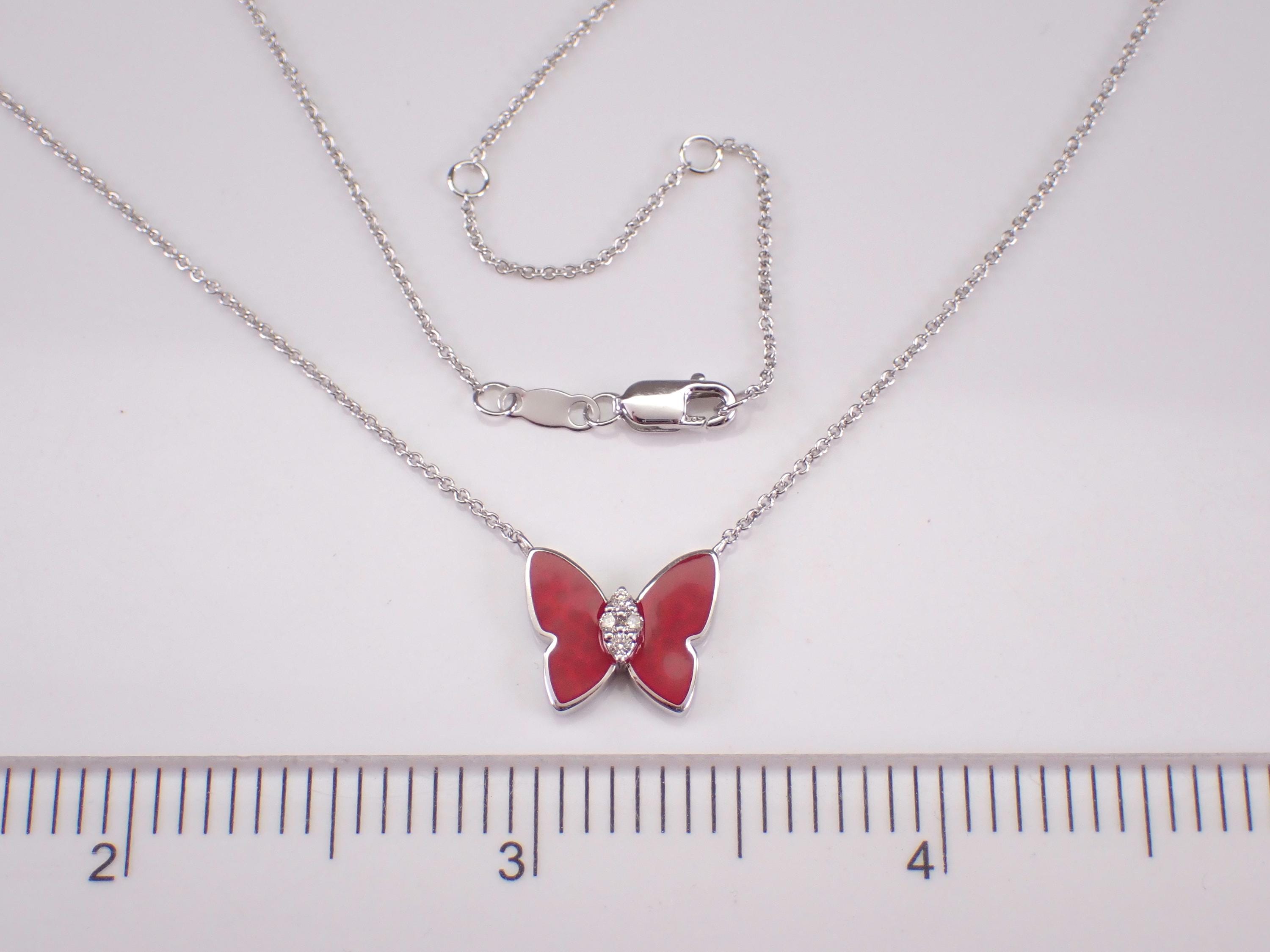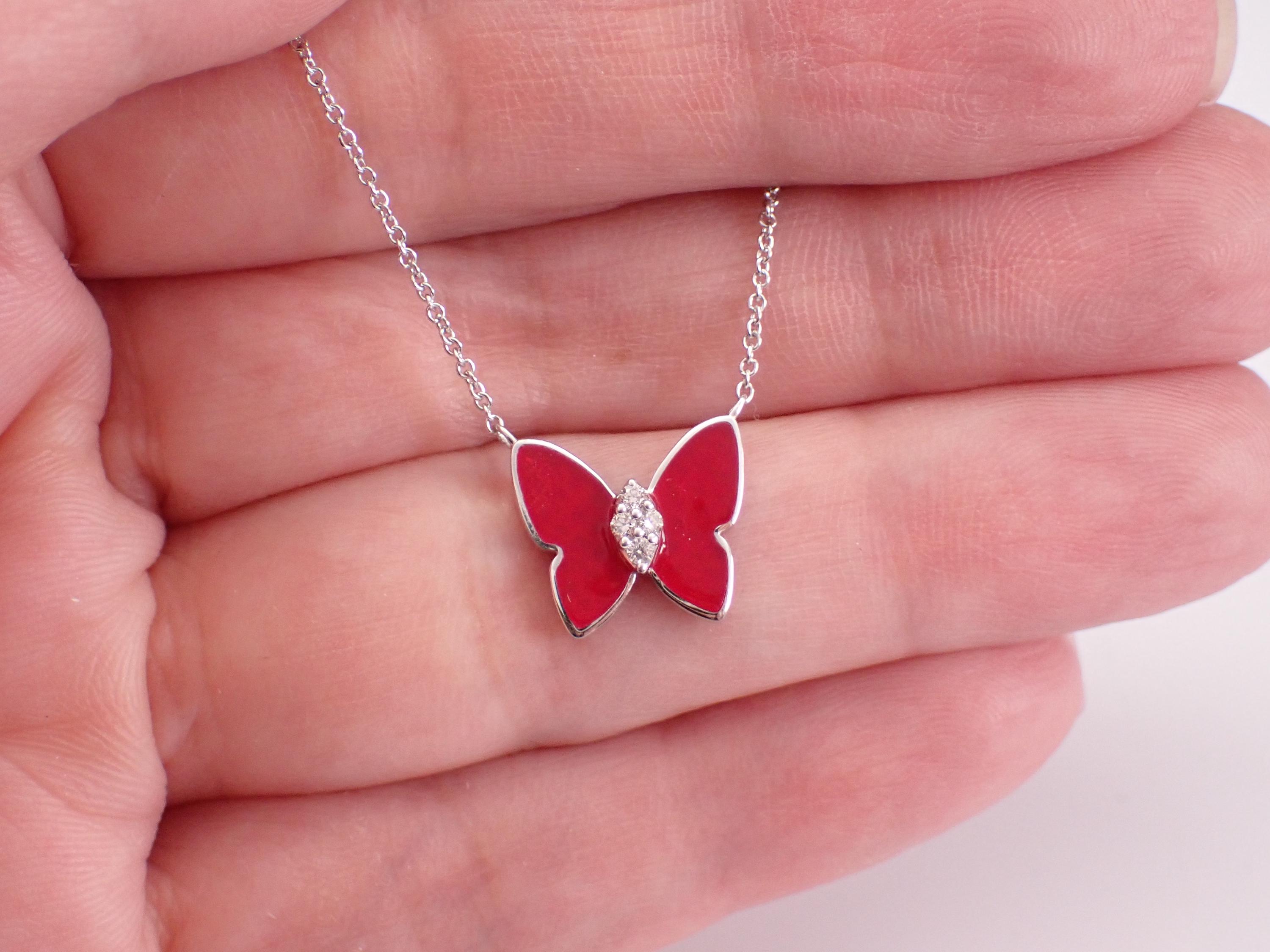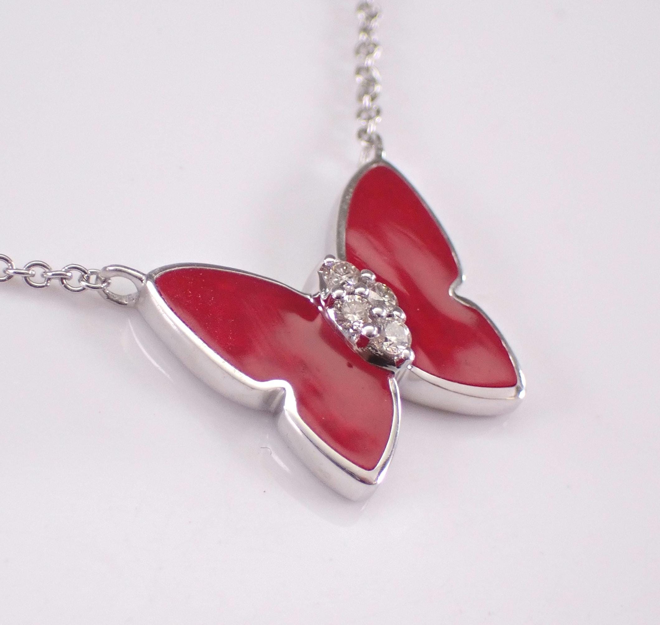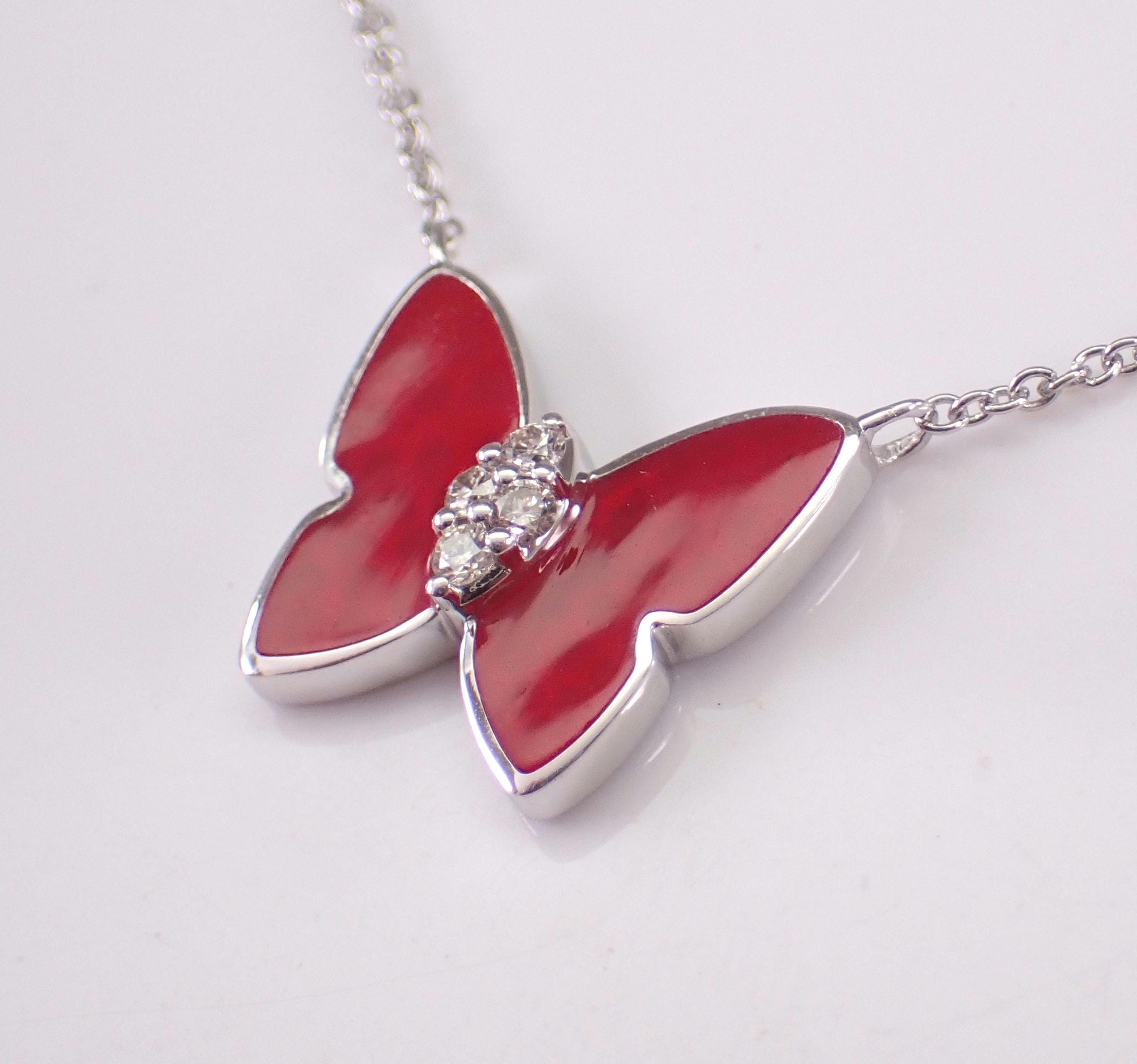 14K White Gold Diamond and Red Enamel Butterfly Necklace Chain.