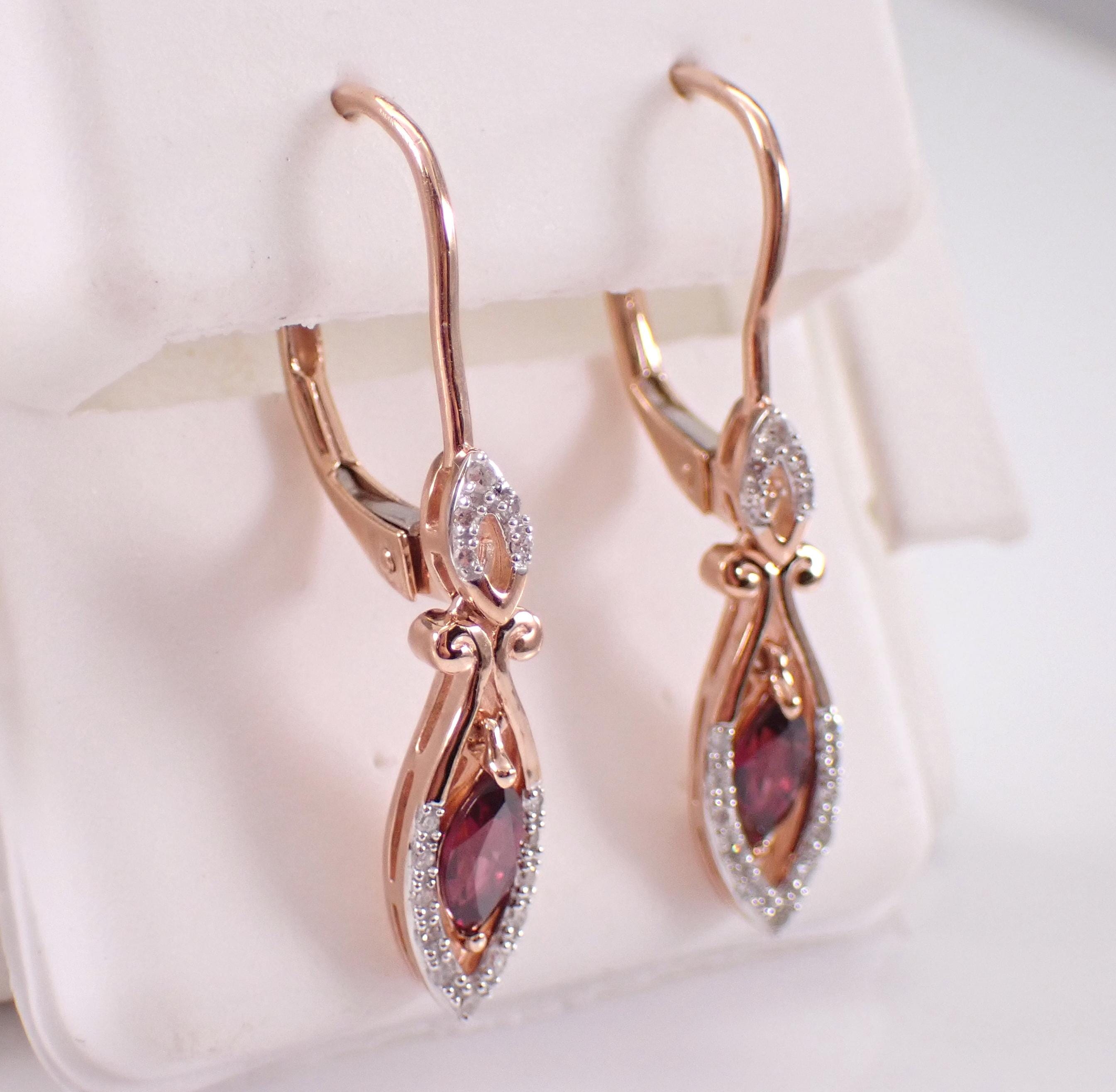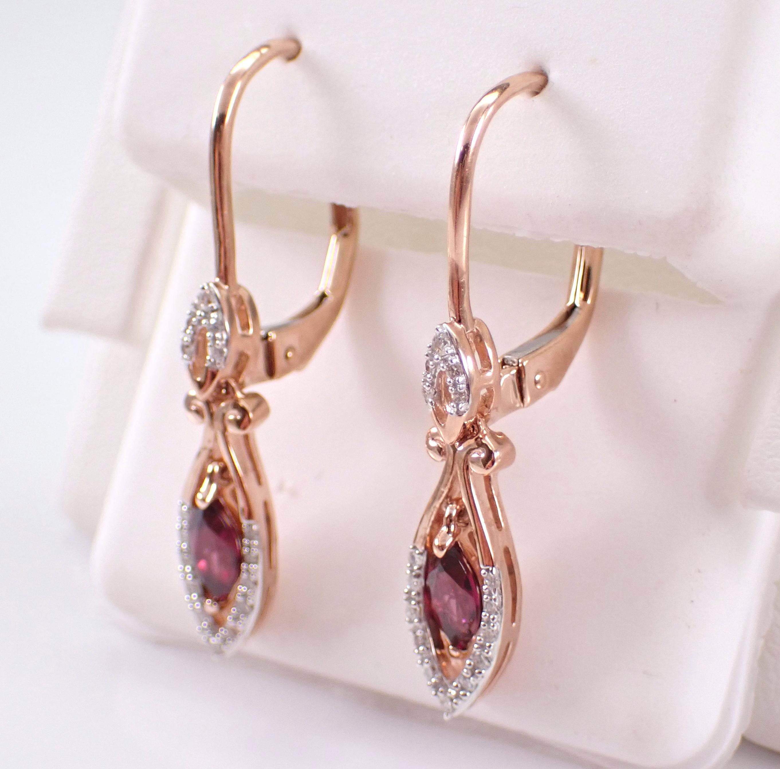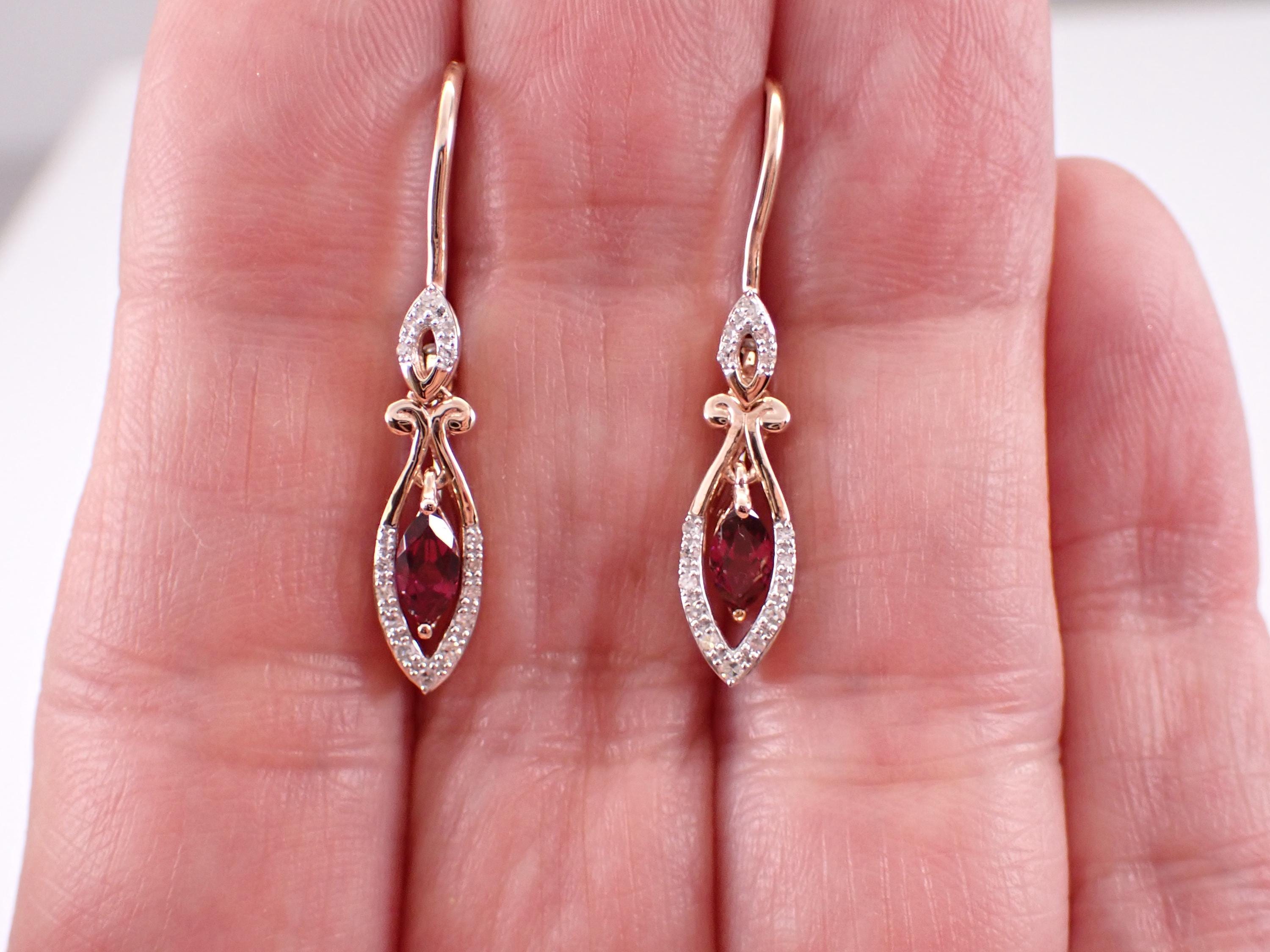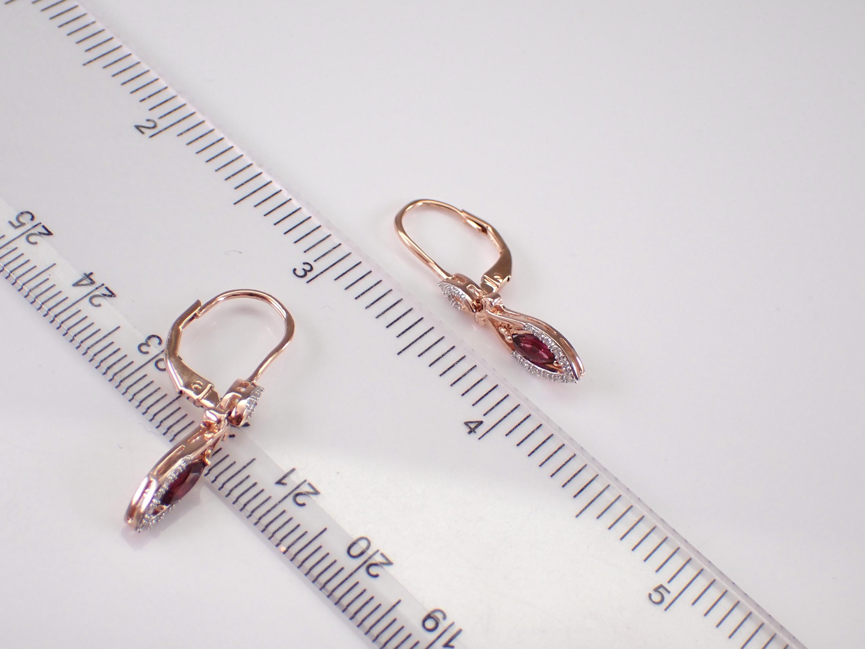 Rose Gold Diamond and Rhodolite Garnet Dangle Earrings. There are two genuine Marquise Rhodolite Garnets and thirty-two natural Round Brilliant Diamonds set in these earrings. The Garnets measure 6 X 4 mm each and amount to a total weight of 3/4 carats. The diamonds in these earrings are H color, SI/I clarity and weigh a total of .12 carat. These earrings are 10KT Rose Gold, measure 30 mm in length and weigh a total of 2.6 grams. These earrings are for pierced ears and have leverback clasps. These earrings will be accompanied by an appraisal written by a GIA Certified Diamond Grader with the retail replacement value of $1,375.00. I will ship these earrings promptly in a gift box.